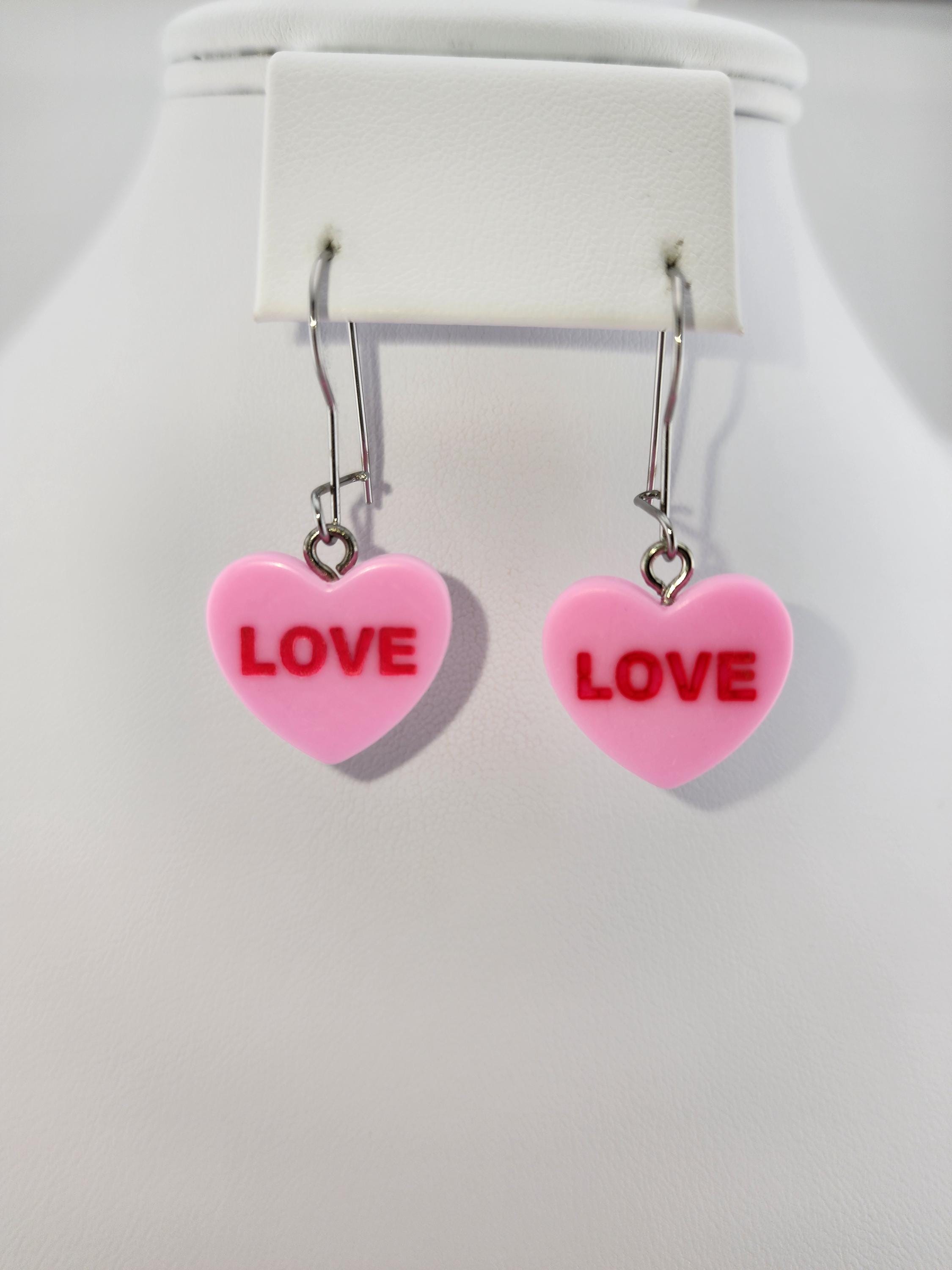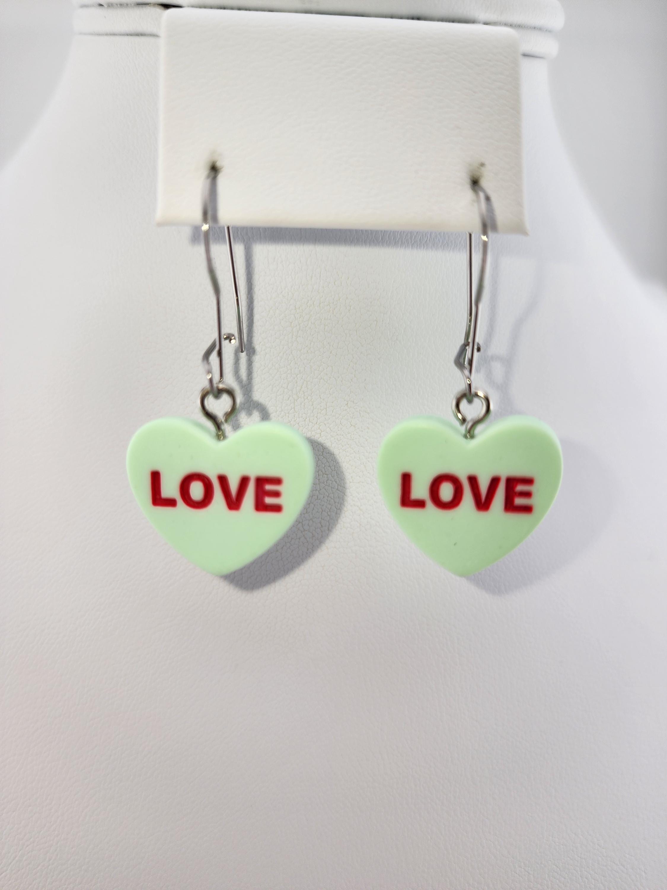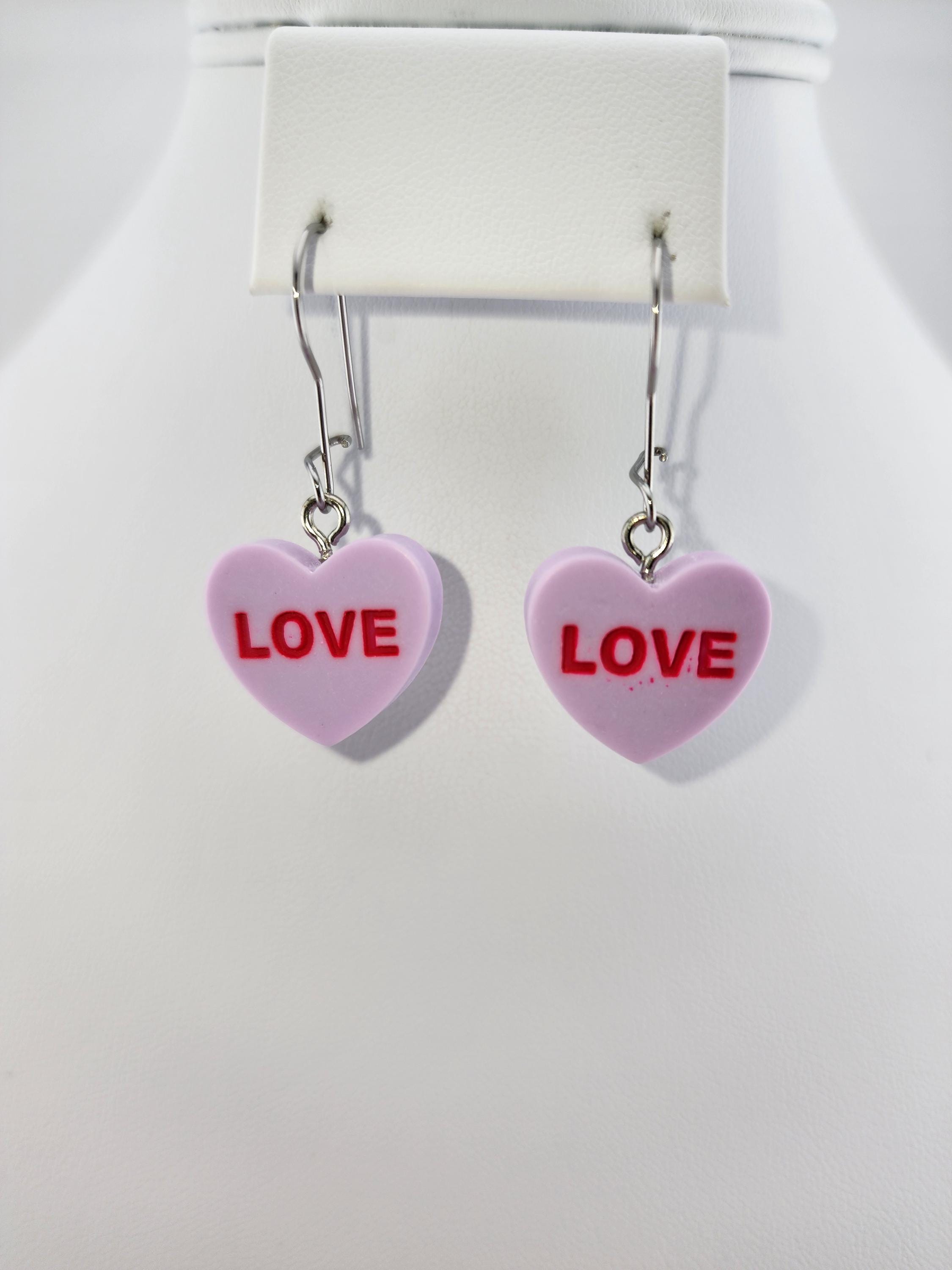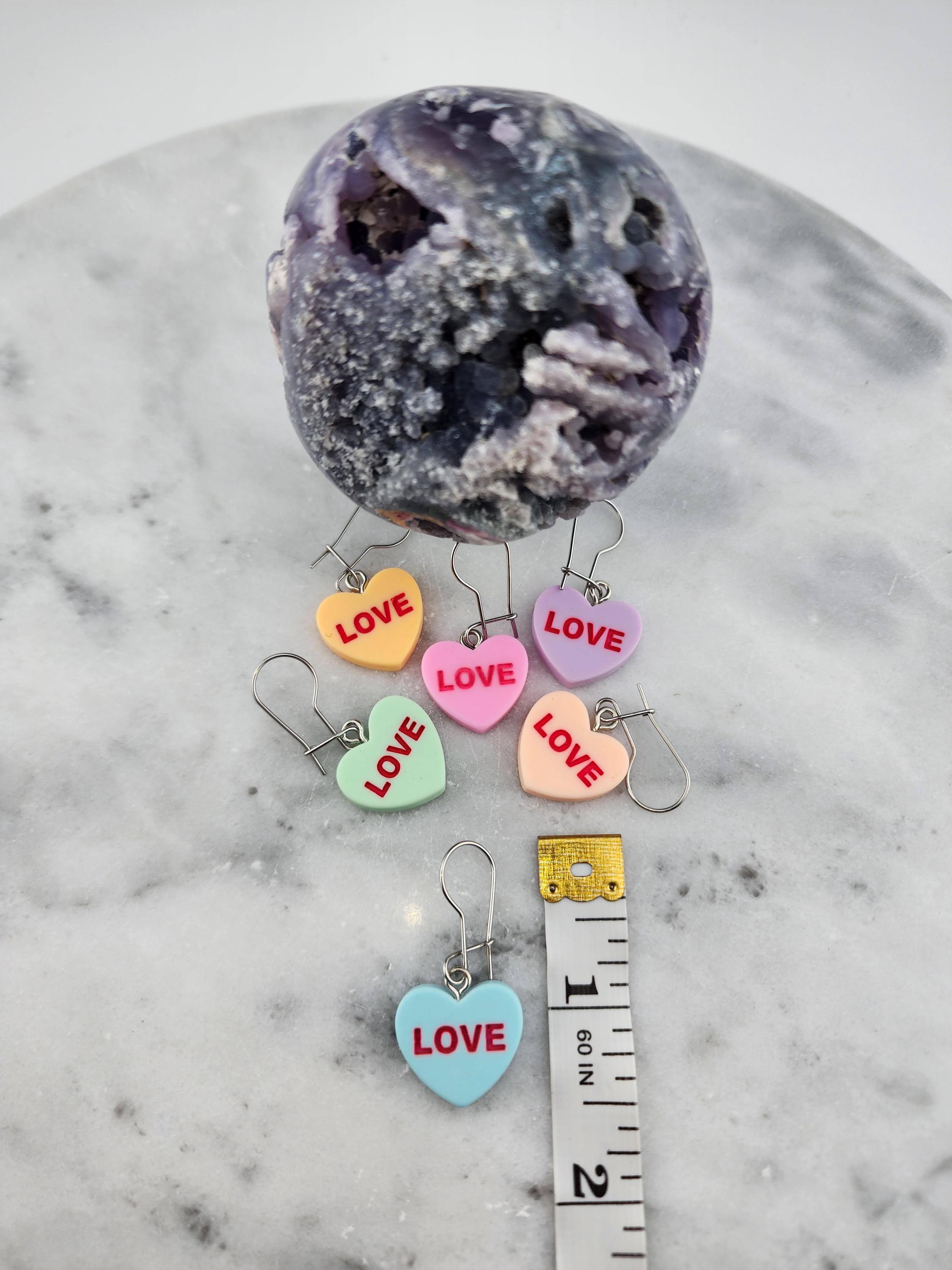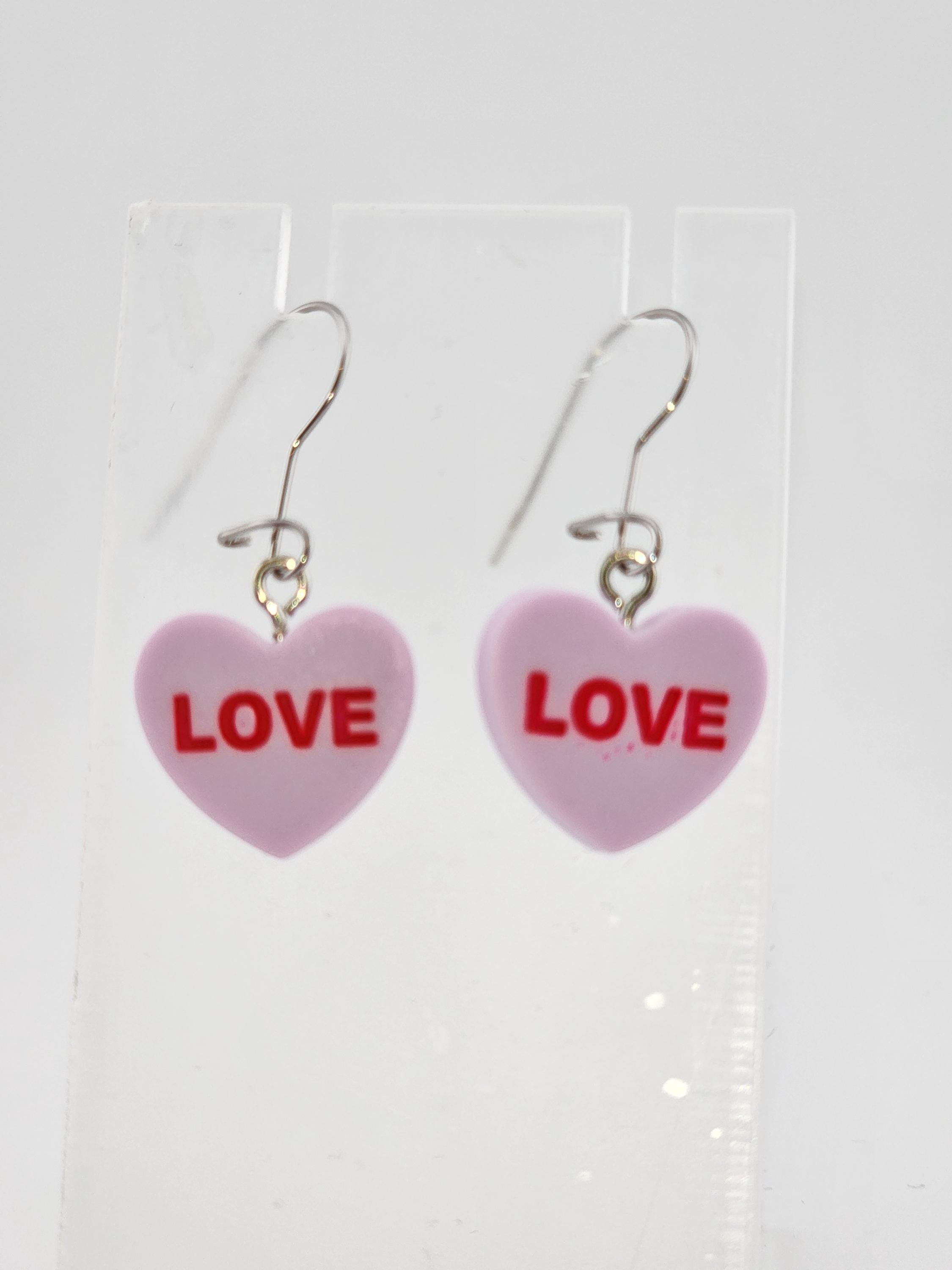 Valentine's Day 'LOVE' Conversation Candy Heart Charms on Silver Earrings
