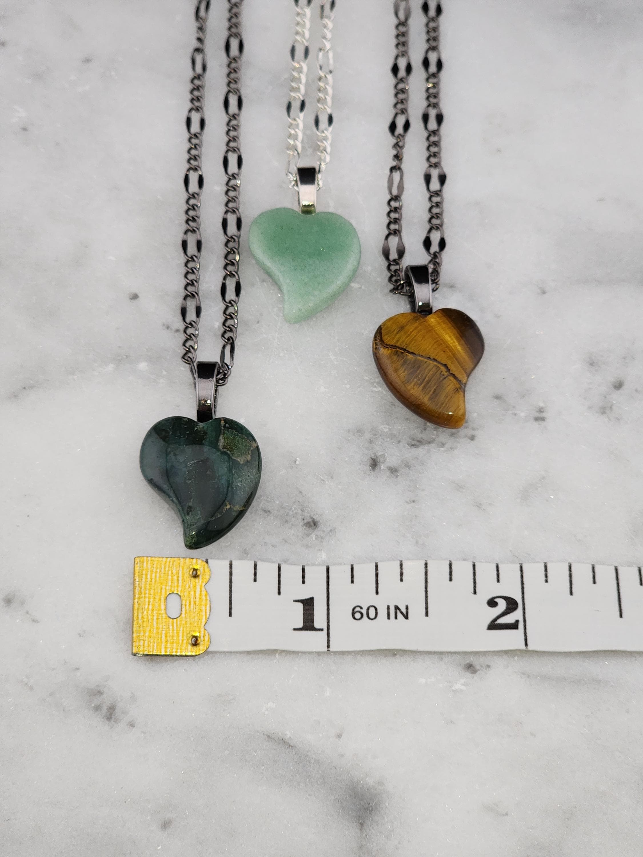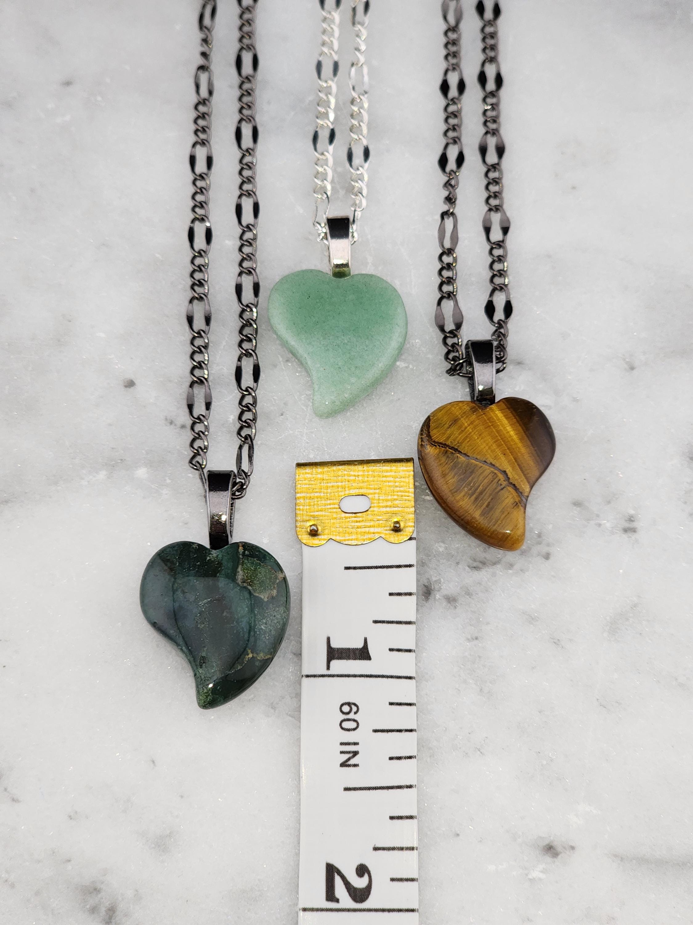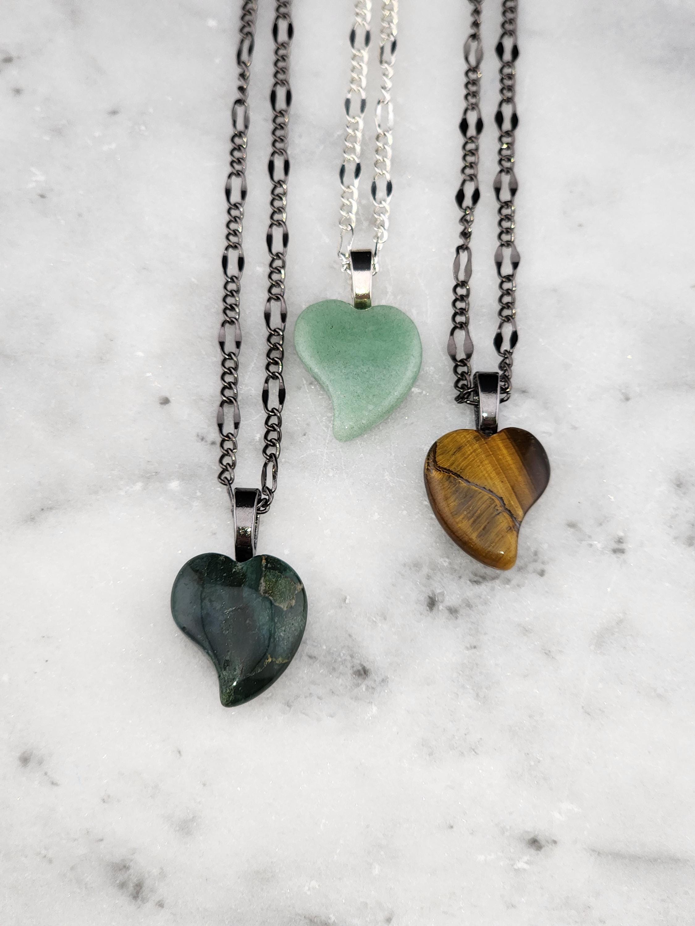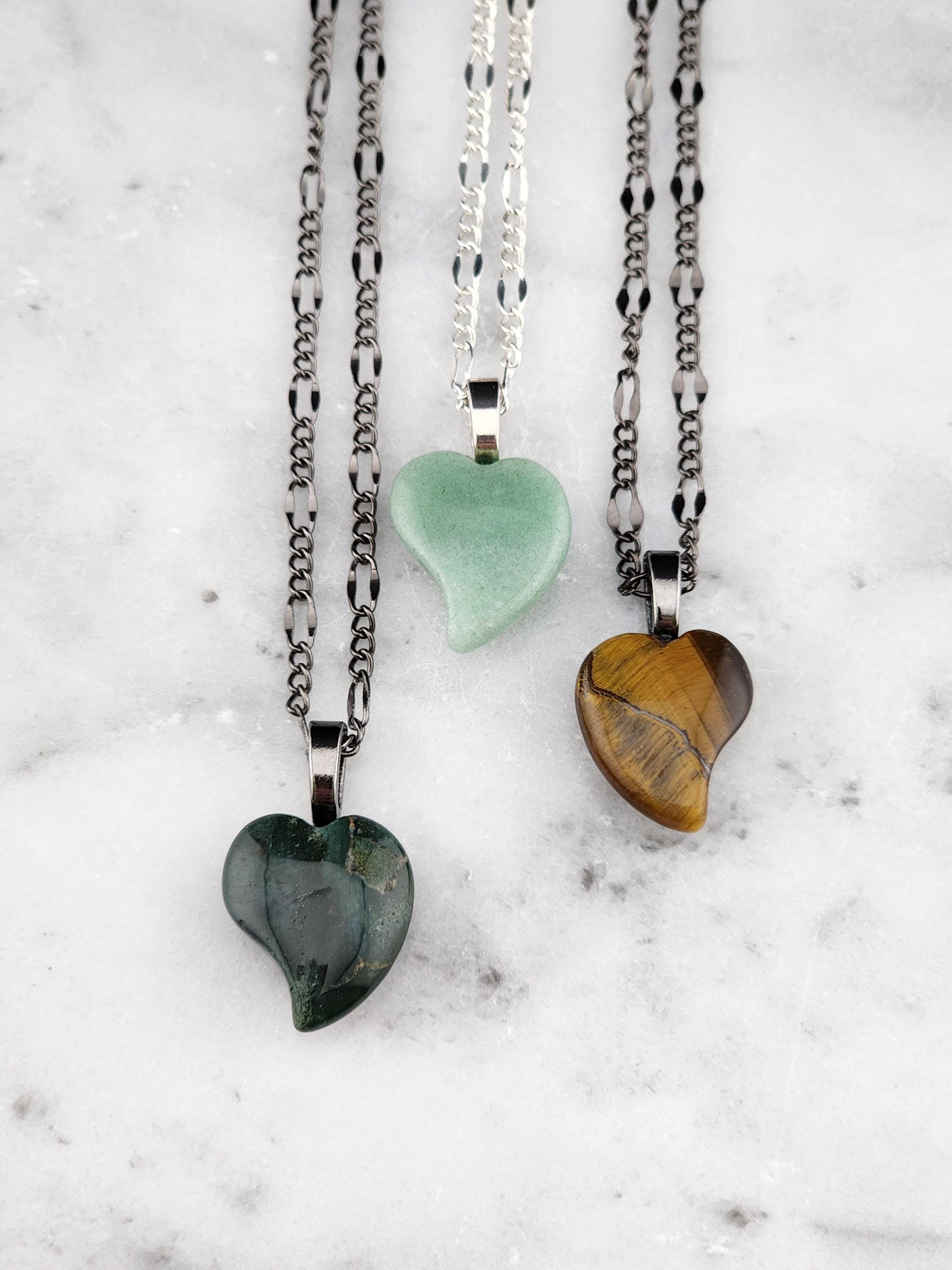 I made these necklaces using stainless steel lip chain in gunmetal gray and silver with extenders making them adjustable up to 22" long. They each have a different heart shaped semi-precious gemstone pendant. YOUR CHOICES ARE: #1- Maw-sit-sit #2- Jadeite #3- Tiger's Eye * Your purchase will arrive in pretty packaging