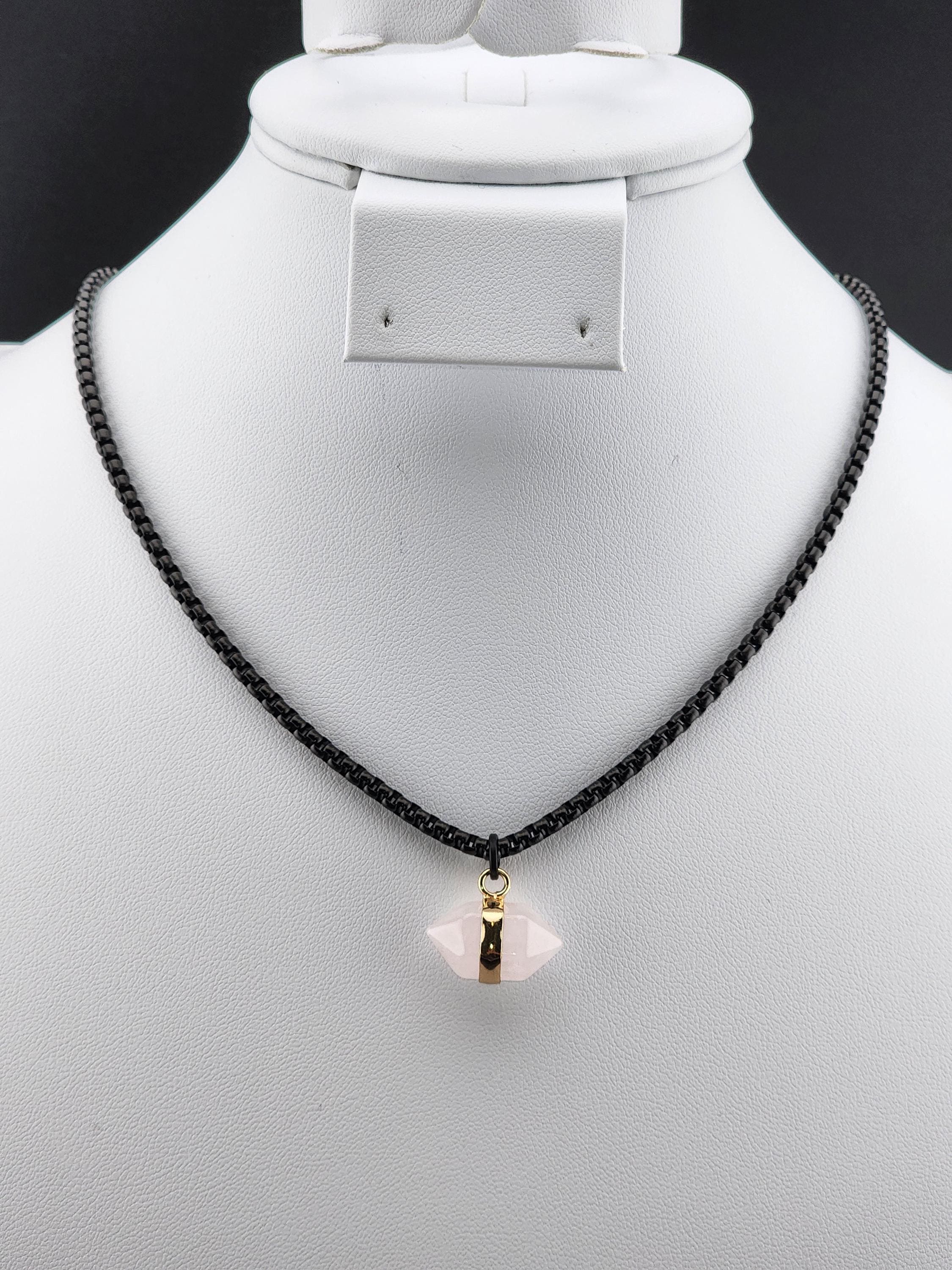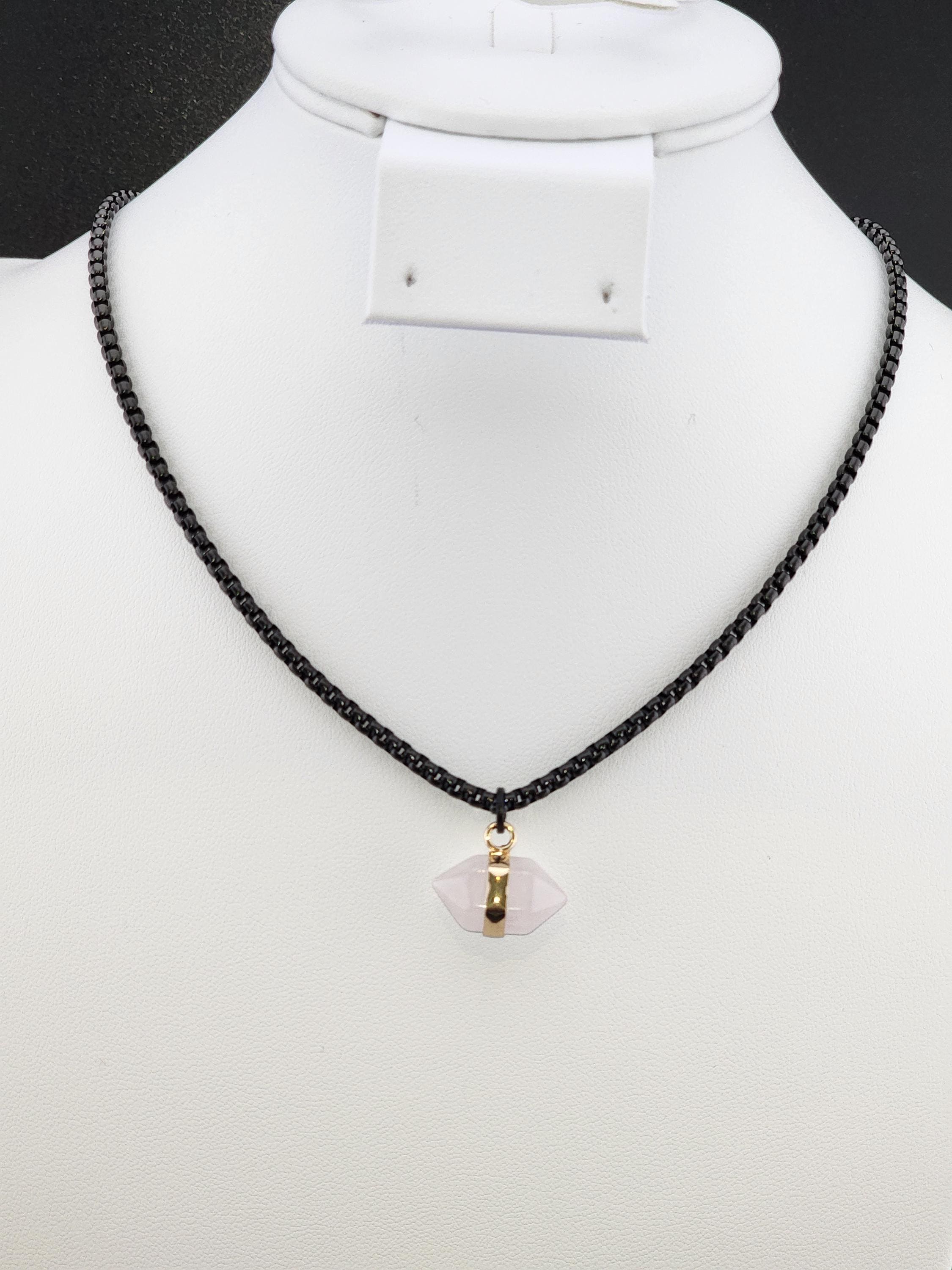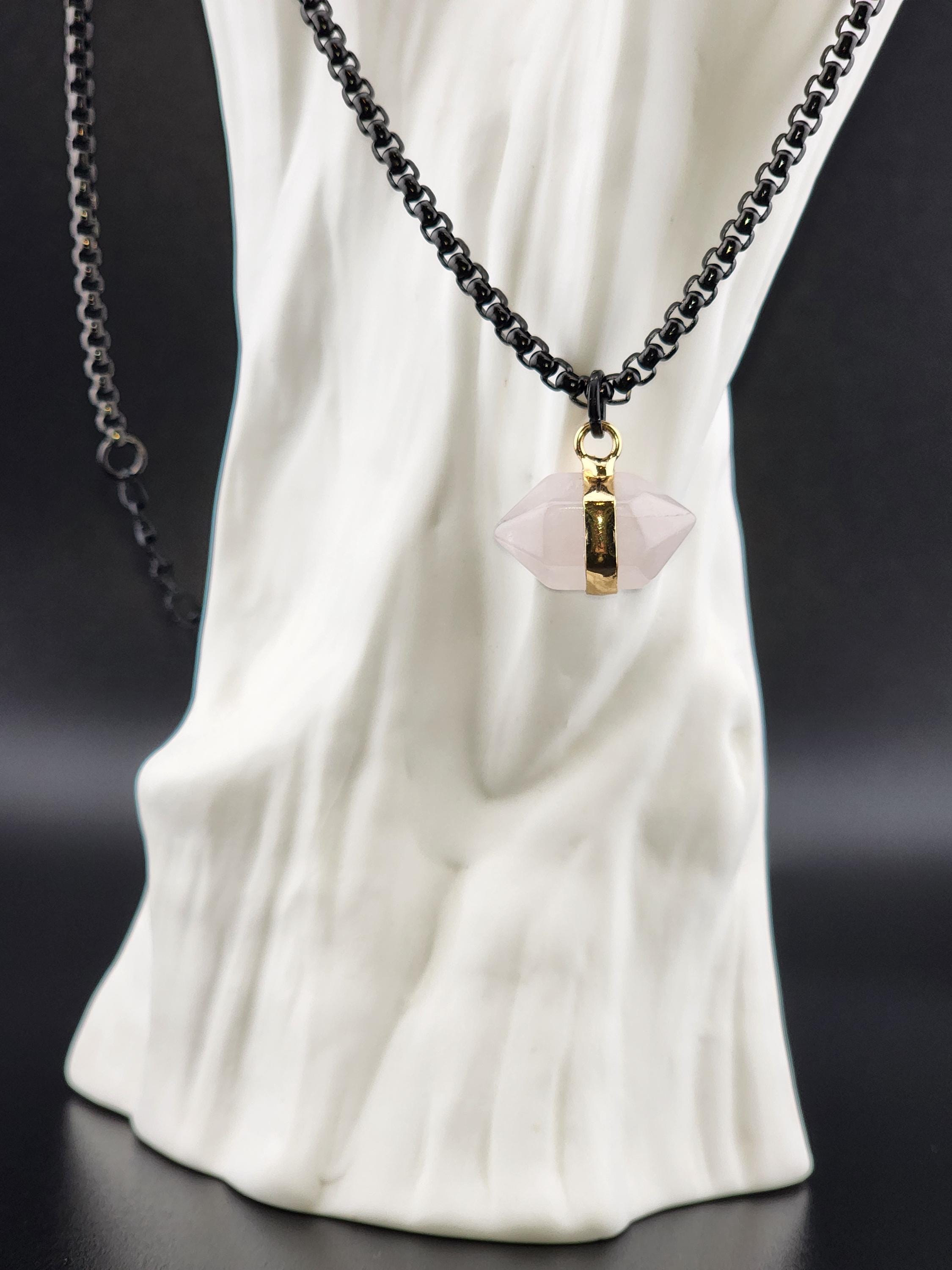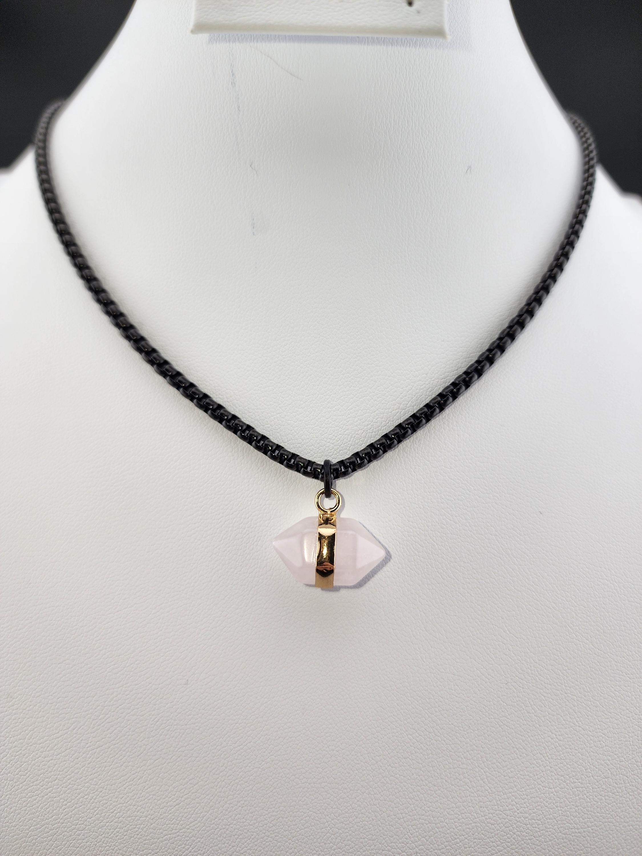 I made this necklace using highly polished black square rolo chain with extenders making it adjustable from 18"-20"-22" in length. I added a gold banded double pointed rose quartz stone pendant. * Your purchase will arrive in pretty packaging. >>>>>>>>>>>>>>>>>>>>>>>>>>>>>>>>>>>>>>>>>>>>>>>>>>>>>>>>>> METAPHYSICAL PROPERTIES OF WEARING ROSE QUARTZ: * Rose quartz is widely considered the "stone of unconditional love," emitting strong vibrations of love, compassion, and emotional healing. * This soothing crystal helps alleviate stress, anxiety, emotional & spiritual wounds. * It is often used in meditation, placed under a pillow to reduce sleep disorders, or carried to promote a calm, loving atmosphere. OR, SO THEY SAY... >>>>>>>>>>>>>>>>>>>>>>>>>>>>>>>>>>>>>>>>>>>>>>>>>>>>>>>>>> PROMOTES: * Emotional Healing & Balance: Known to soothe emotional wounds, foster forgiveness, and release stored anger or tension. It encourages self-compassion and inner peace. * Love and Relationships: Attracts love of all kinds (romantic, familial, platonic) and restores trust and harmony in relationships. * Heart Chakra Activation: Aligns with the heart chakra, encouraging emotional openness and empathy. * Calming Energy: Used for its gentle, soothing energy to reduce stress and anxiety. *Physical Healing Beliefs: Associated with strengthening the heart, aiding circulation, boosting fertility, and supporting the chest area. OR, SO THEY SAY...