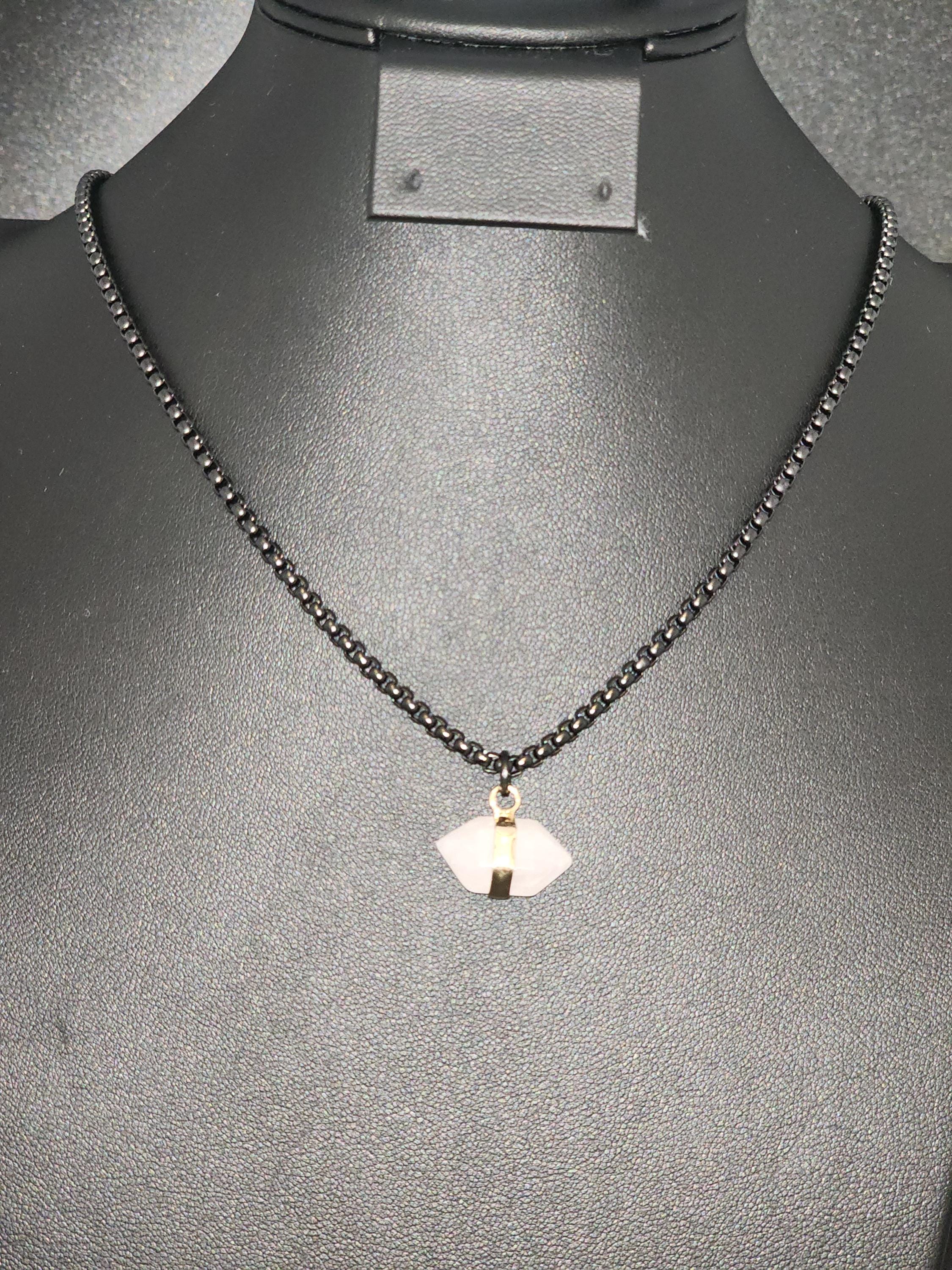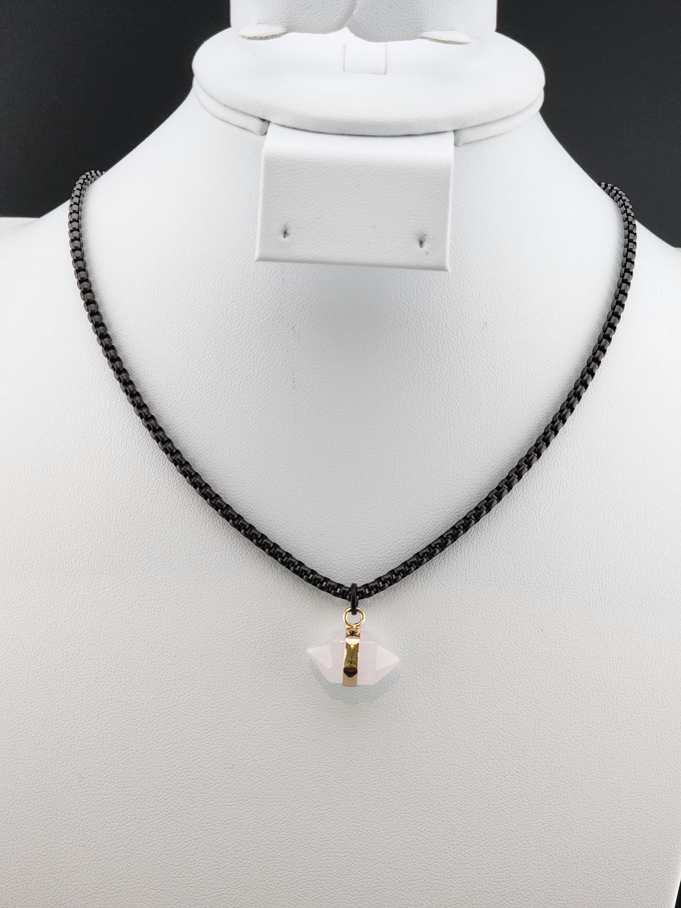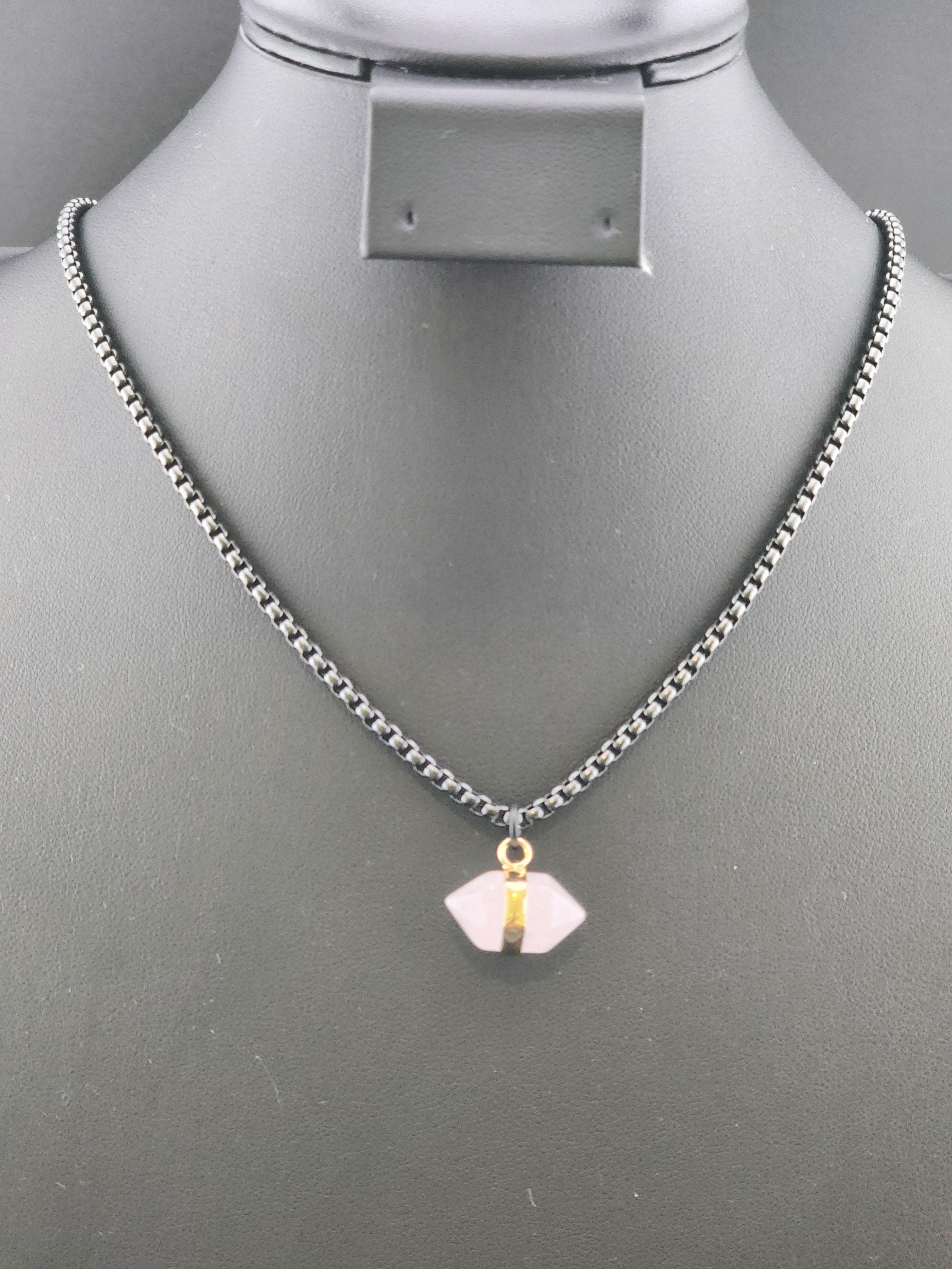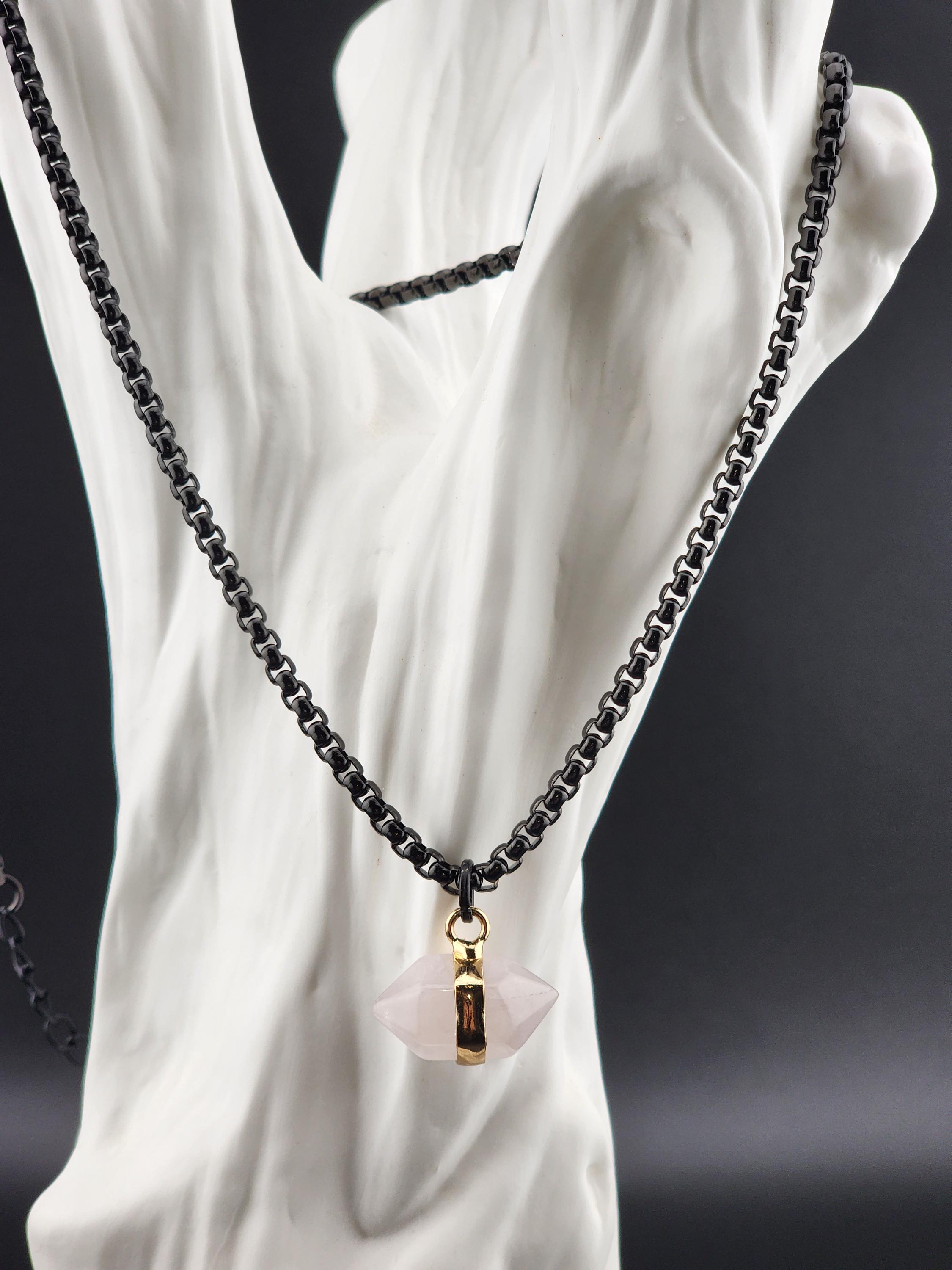 I made this necklace using highly polished black square rolo chain with extenders making it adjustable from 18"-20"-22" in length. I added a gold banded double pointed rose quartz stone pendant. * Your purchase will arrive in pretty packaging. >>>>>>>>>>>>>>>>>>>>>>>>>>>>>>>>>>>>>>>>>>>>>>>>>>>>>>>>>> METAPHYSICAL PROPERTIES OF WEARING ROSE QUARTZ: * Rose quartz is widely considered the "stone of unconditional love," emitting strong vibrations of love, compassion, and emotional healing. * This soothing crystal helps alleviate stress, anxiety, emotional & spiritual wounds. * It is often used in meditation, placed under a pillow to reduce sleep disorders, or carried to promote a calm, loving atmosphere. OR, SO THEY SAY... >>>>>>>>>>>>>>>>>>>>>>>>>>>>>>>>>>>>>>>>>>>>>>>>>>>>>>>>>> PROMOTES: * Emotional Healing & Balance: Known to soothe emotional wounds, foster forgiveness, and release stored anger or tension. It encourages self-compassion and inner peace. * Love and Relationships: Attracts love of all kinds (romantic, familial, platonic) and restores trust and harmony in relationships. * Heart Chakra Activation: Aligns with the heart chakra, encouraging emotional openness and empathy. * Calming Energy: Used for its gentle, soothing energy to reduce stress and anxiety. *Physical Healing Beliefs: Associated with strengthening the heart, aiding circulation, boosting fertility, and supporting the chest area. OR, SO THEY SAY...