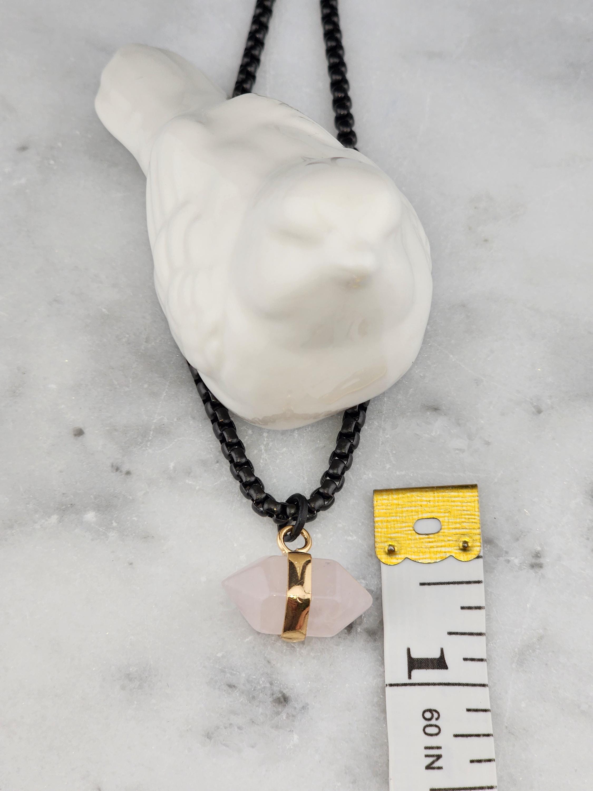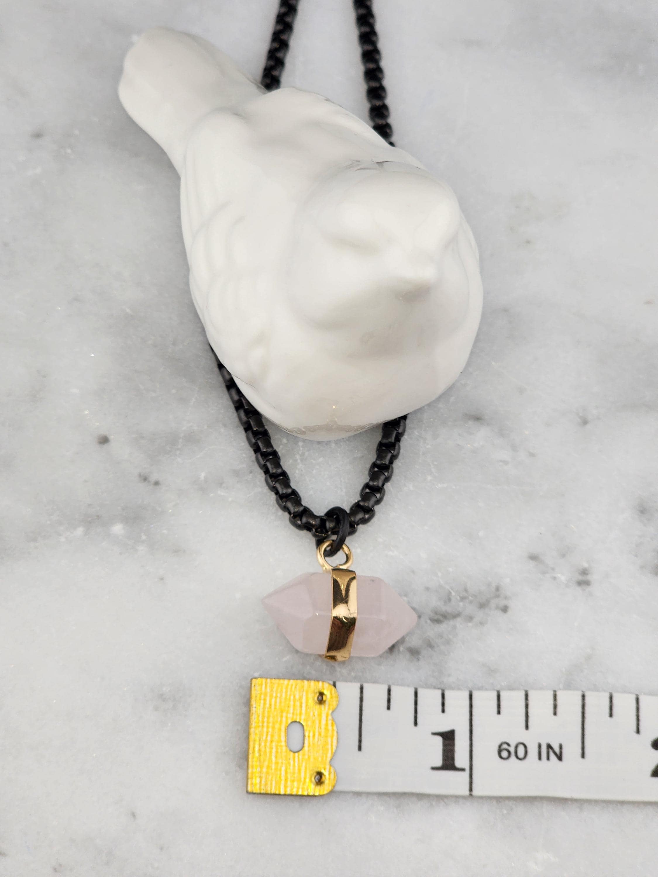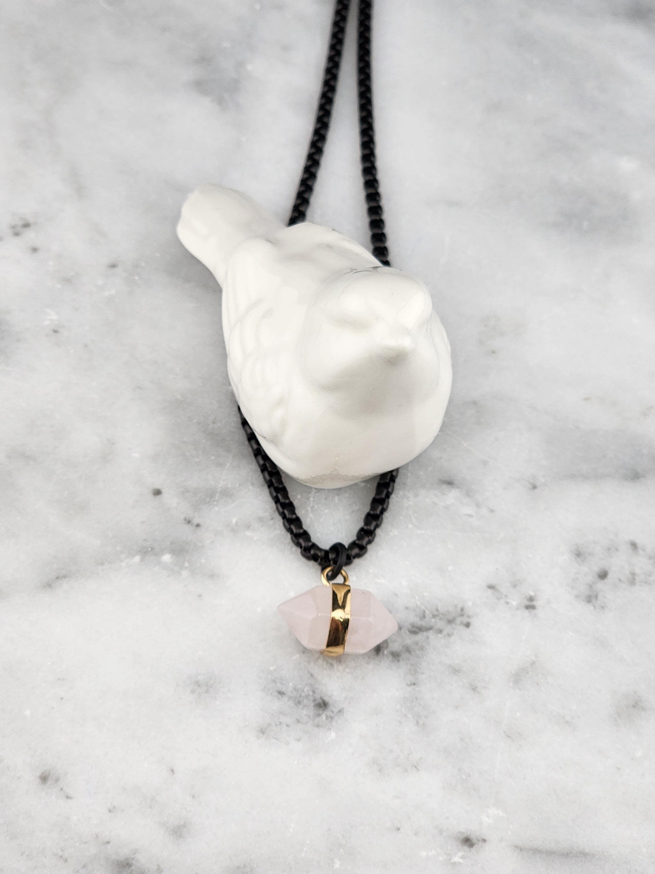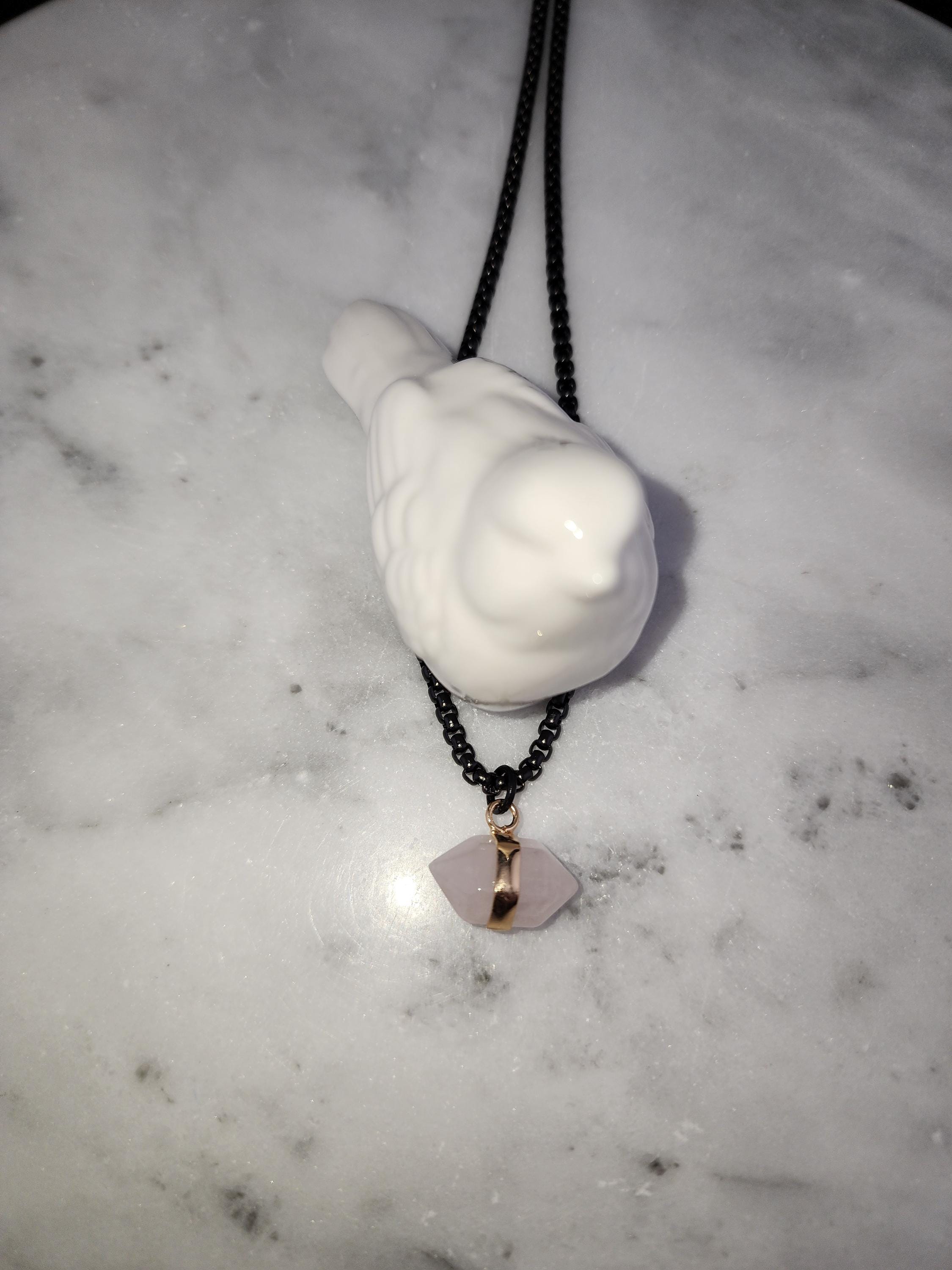 I made this necklace using highly polished black square rolo chain with extenders making it adjustable from 18"-20"-22" in length. I added a gold banded double pointed rose quartz stone pendant. * Your purchase will arrive in pretty packaging. >>>>>>>>>>>>>>>>>>>>>>>>>>>>>>>>>>>>>>>>>>>>>>>>>>>>>>>>>> METAPHYSICAL PROPERTIES OF WEARING ROSE QUARTZ: * Rose quartz is widely considered the "stone of unconditional love," emitting strong vibrations of love, compassion, and emotional healing. * This soothing crystal helps alleviate stress, anxiety, emotional & spiritual wounds. * It is often used in meditation, placed under a pillow to reduce sleep disorders, or carried to promote a calm, loving atmosphere. OR, SO THEY SAY... >>>>>>>>>>>>>>>>>>>>>>>>>>>>>>>>>>>>>>>>>>>>>>>>>>>>>>>>>> PROMOTES: * Emotional Healing & Balance: Known to soothe emotional wounds, foster forgiveness, and release stored anger or tension. It encourages self-compassion and inner peace. * Love and Relationships: Attracts love of all kinds (romantic, familial, platonic) and restores trust and harmony in relationships. * Heart Chakra Activation: Aligns with the heart chakra, encouraging emotional openness and empathy. * Calming Energy: Used for its gentle, soothing energy to reduce stress and anxiety. *Physical Healing Beliefs: Associated with strengthening the heart, aiding circulation, boosting fertility, and supporting the chest area. OR, SO THEY SAY...
