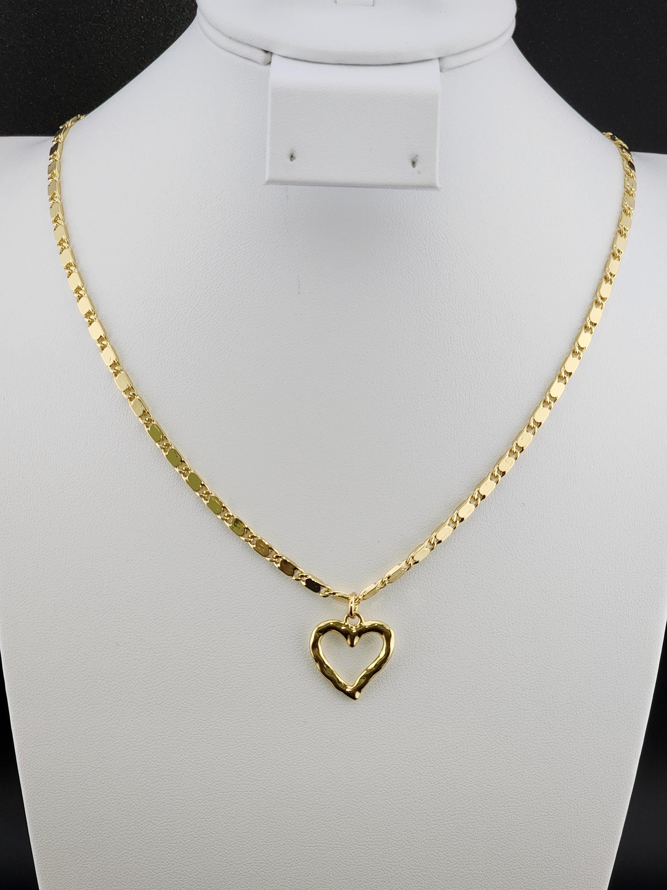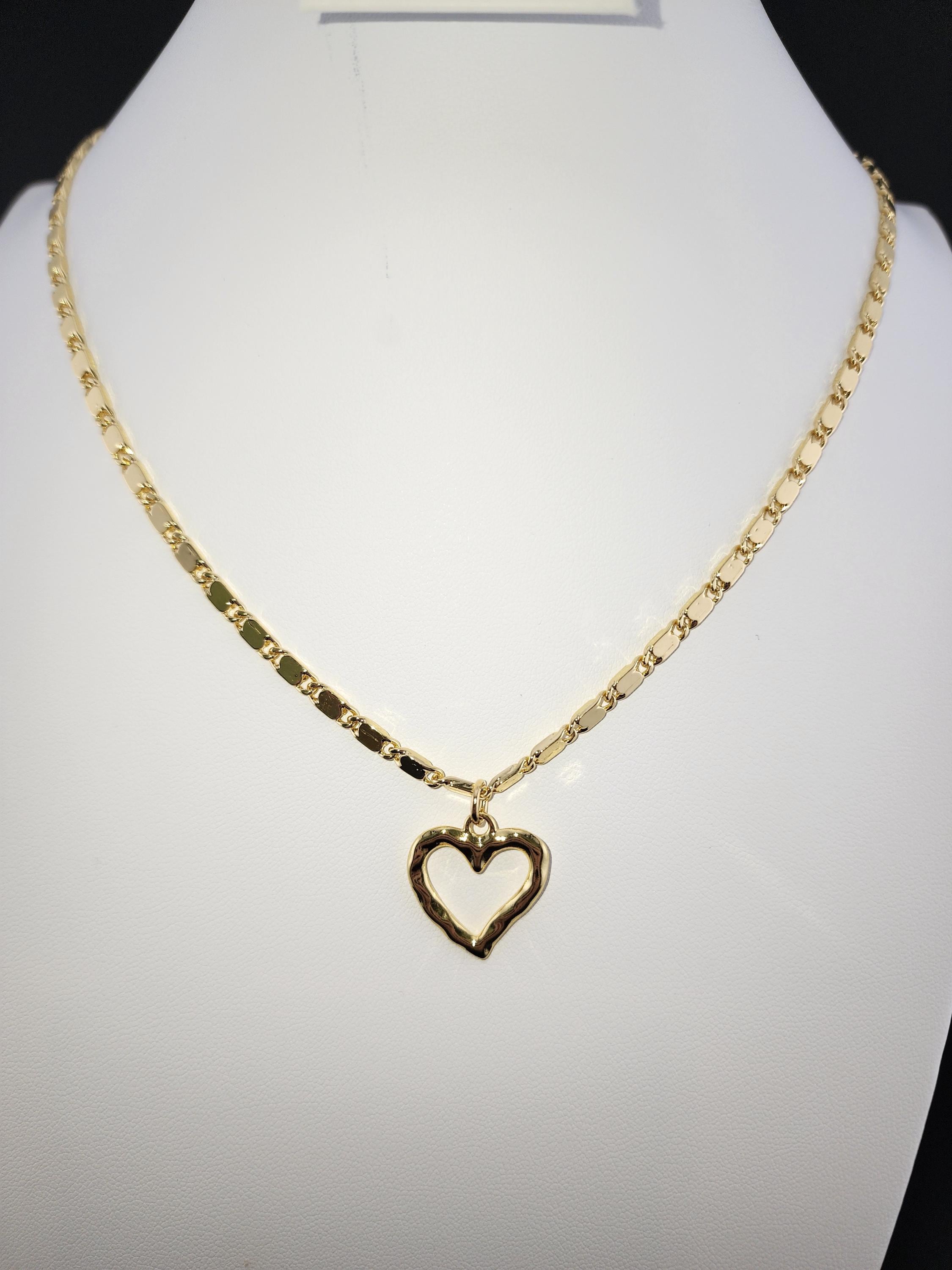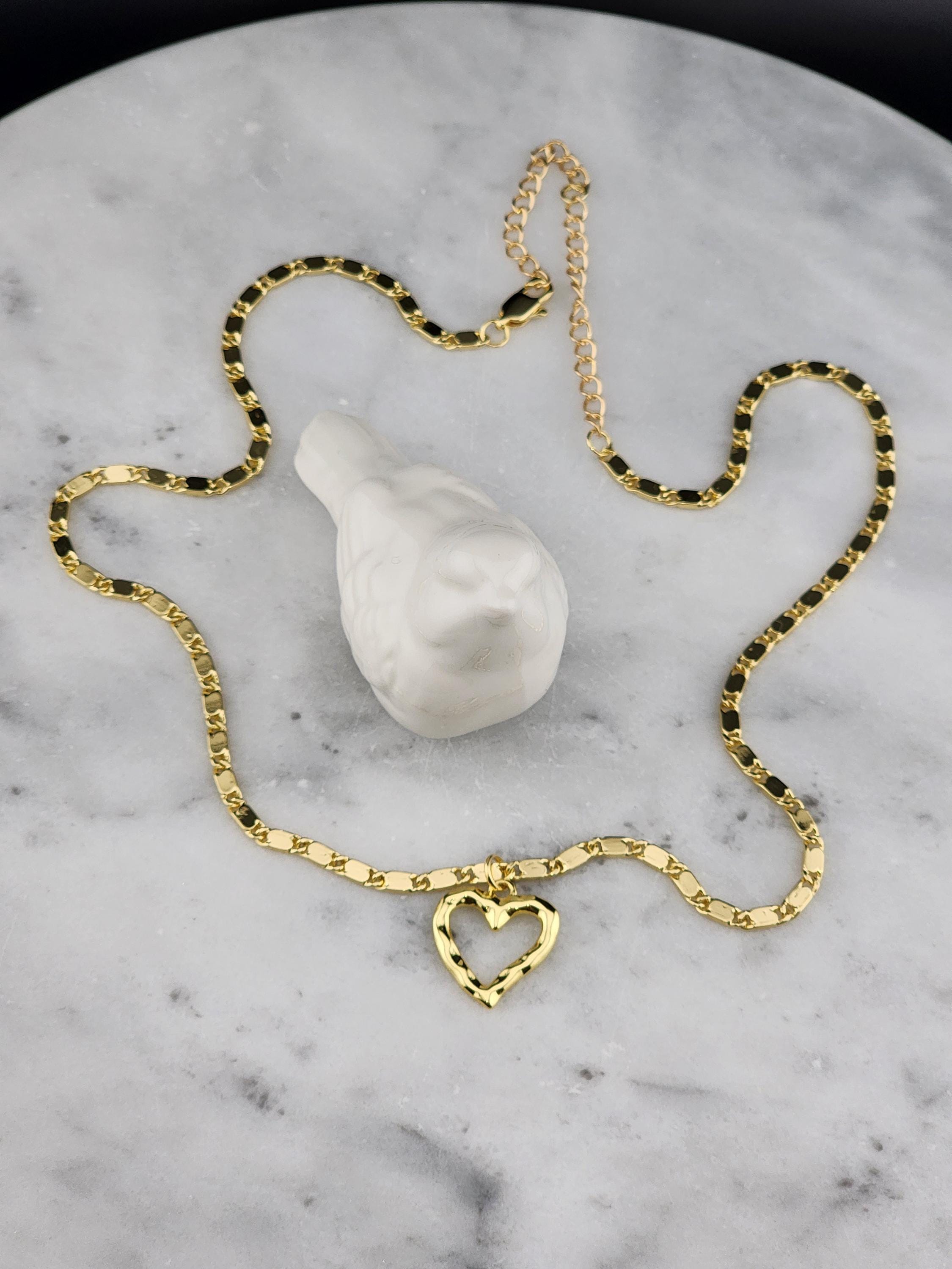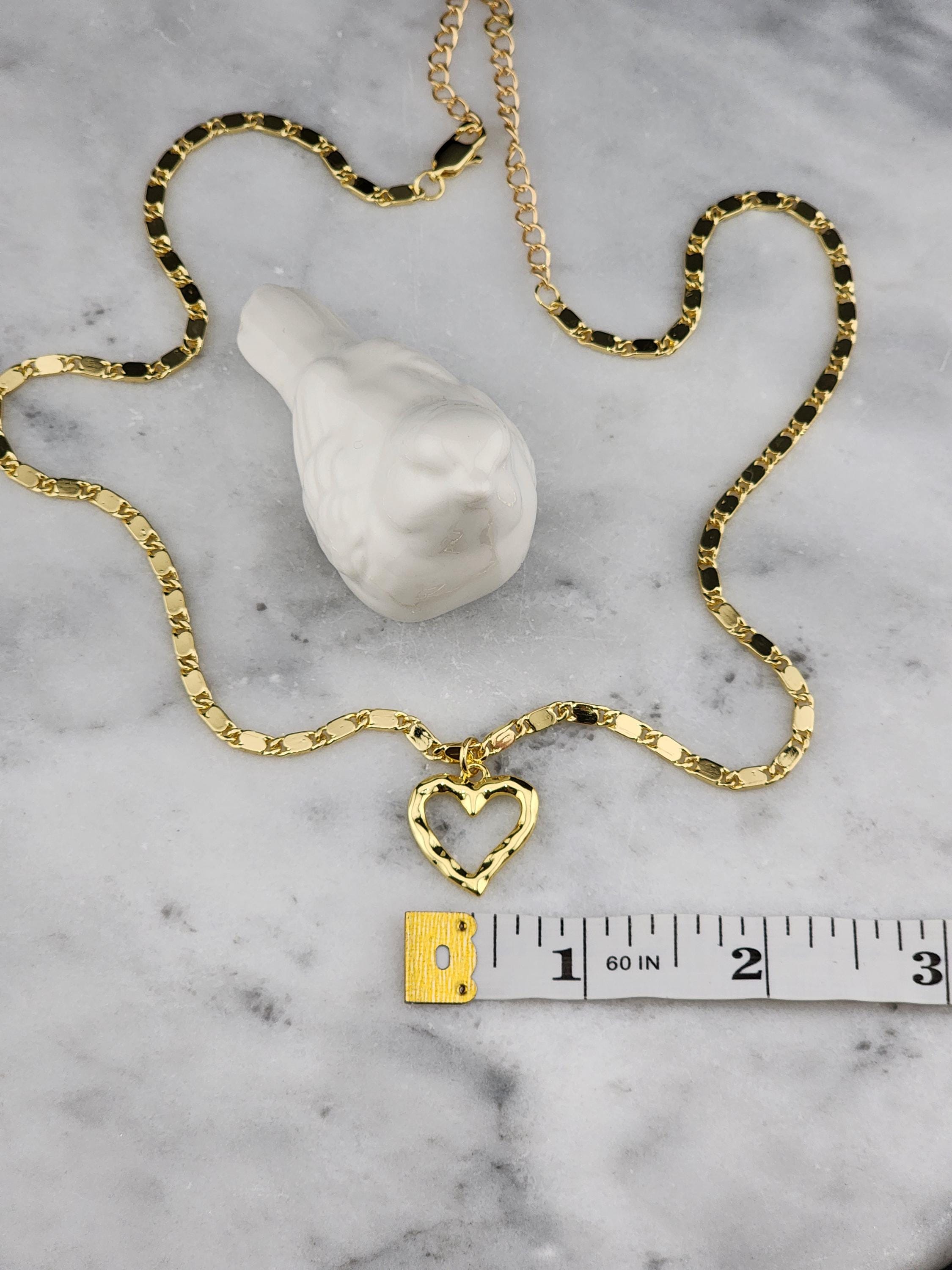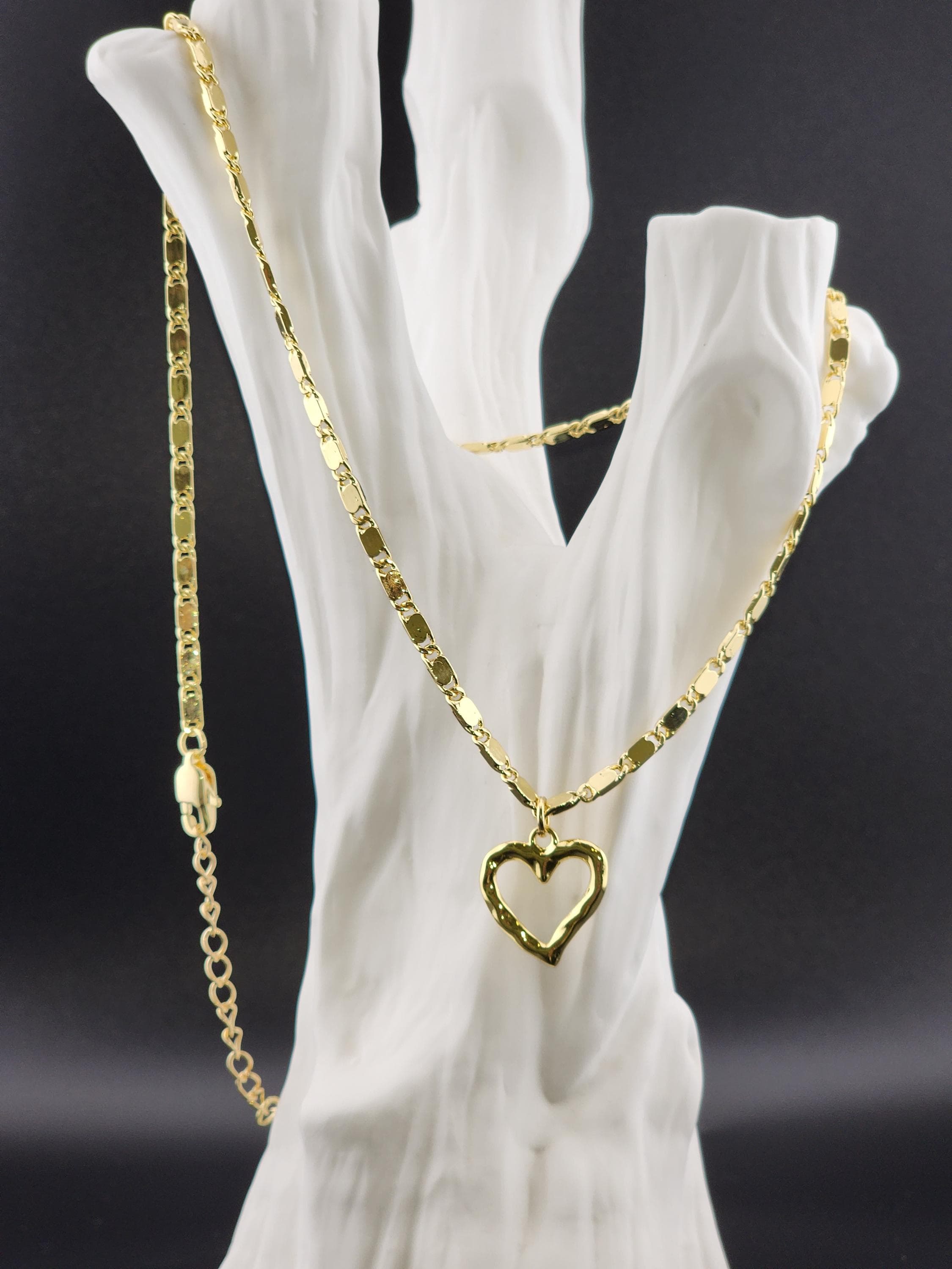I made this necklace using tarnish resistant 16k gold plated flat link chain. It has a 16k gold plated clasp and 18k gold plated connecting rings. There are extenders making it adjustable anywhere from 19"-23" in length. I added a wavy gold heart pendant with an 18k gold plated connecting ring. * Purchase will arrive in pretty packaging * Chain Size Details: the size of jewelry making chains is about 10mm long, 3.5mm wide and 1mm thick. * Pendant Size Details. about 17-20 x 16-18 x 2-4 mm, hole: 3 mm
