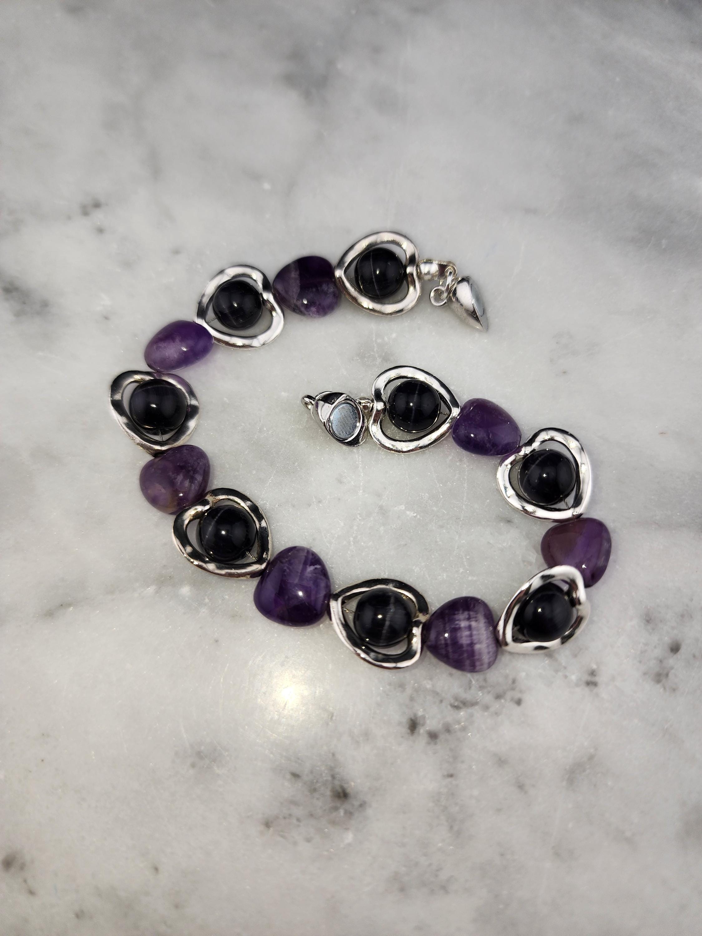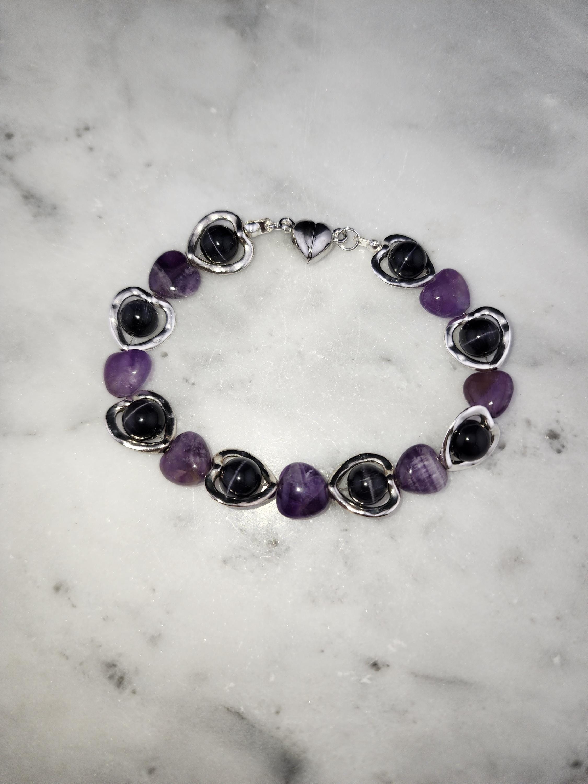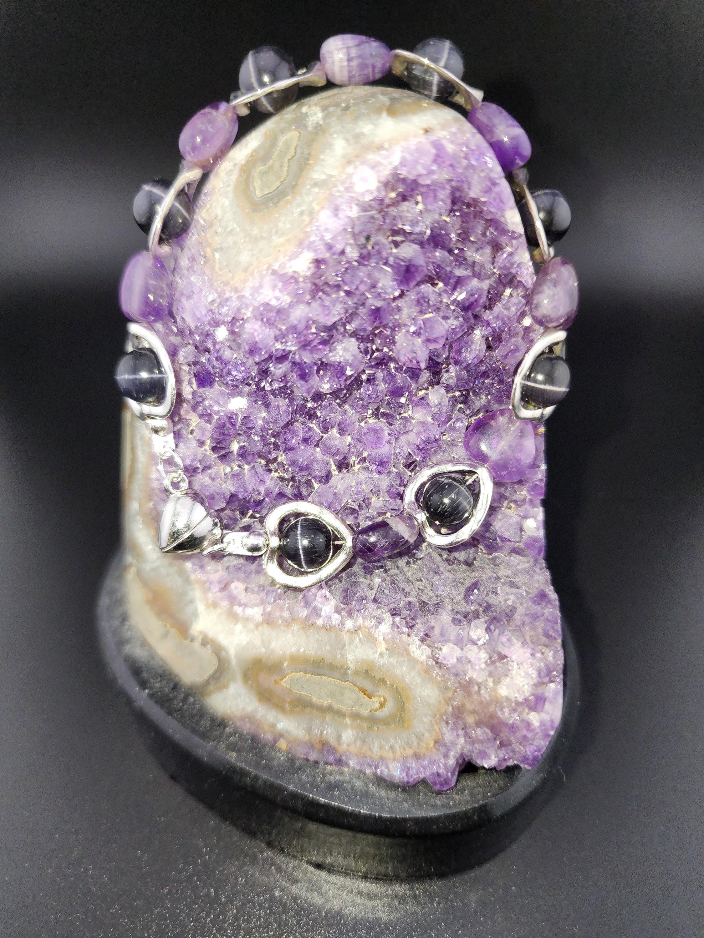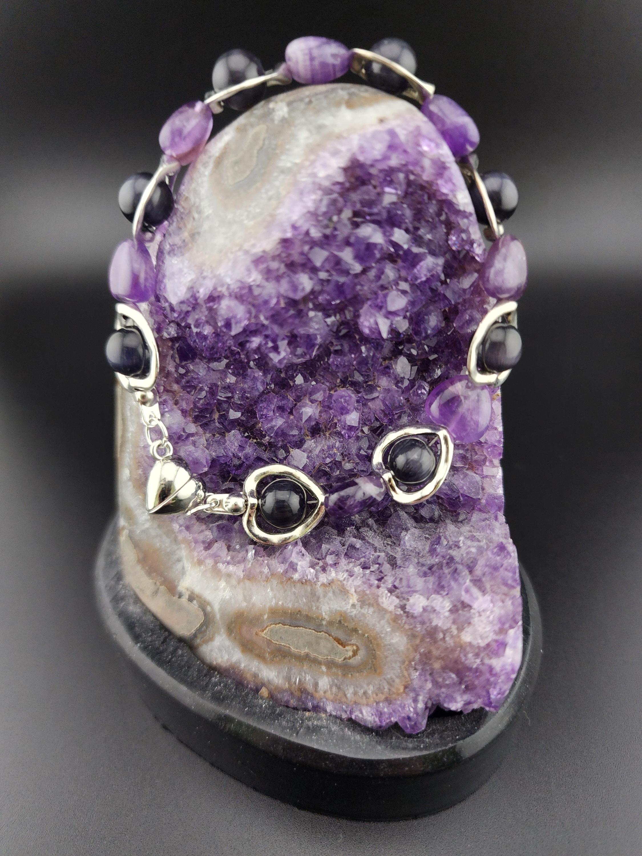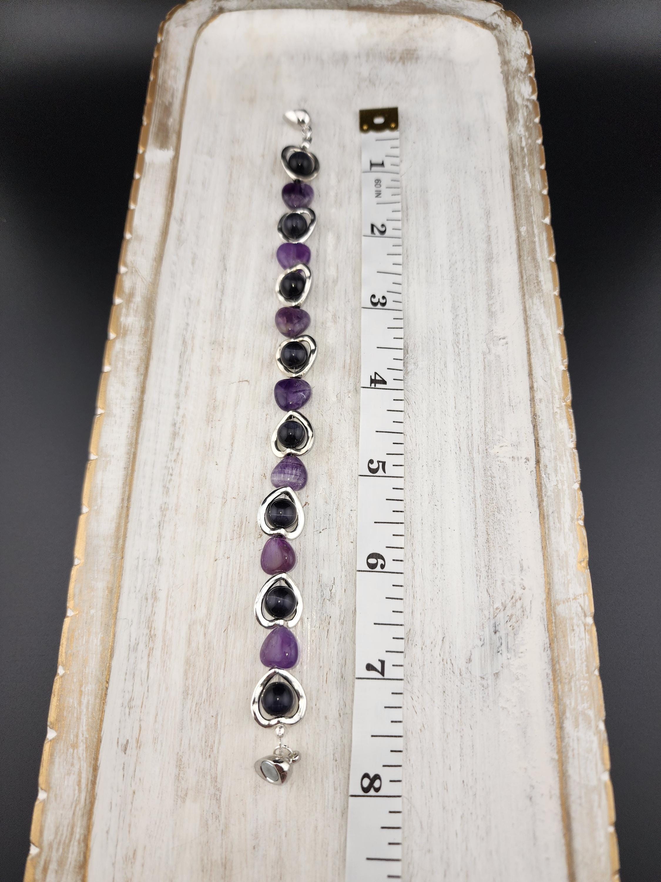 I made this bracelet by using hollow silver hearts with purple cat eye beads in the center and alternating Amethyst stone hearts. There is a silver magnetic heart clasp with sterling silver plated connecting rings. Perfect for a Valentine gift or an Aquarian birthday gift. * Your purchase will arrive in pretty packaging * AMETHYST is the birthstone of February - Aquarius >>>>>>>>>>>>>>>>>>>>>>>>>>>>>>>>>>>>>>>>>>>>>>>>>>>>>>>>>> * Amethyst is a premier spiritual and healing stone known for promoting deep calm, emotional balance, and heightened intuition. * This purple quartz variety enhances meditation, shields against negativity, and aids in overcoming addictions by promoting clarity and wisdom. It is widely used to facilitate inner peace and spiritual growth. * Amethyst is frequently used in meditation, worn as jewelry for constant protection, or placed in spaces to create a serene environment. OR, SO THEY SAY... >>>>>>>>>>>>>>>>>>>>>>>>>>>>>>>>>>>>>>>>>>>>>>>>>>>>>>>>>> * Spiritual Awakening & Protection: Known as a "stone of spirituality," it is believed to activate higher consciousness, enhance intuition, and facilitate angelic communication. It acts as a protective shield against negative energy, stress, and, historically, against guilt and fear. Calm and Balance: Amethyst is renowned for its soothing energy, helping to alleviate anxiety, reduce emotional highs and lows, and promote a peaceful, meditative state. * Mental Clarity & Focus: It is believed to improve cognitive abilities, helping individuals make sound decisions, increase focus, and overcome,mental confusion. OR, SO THEY SAY...