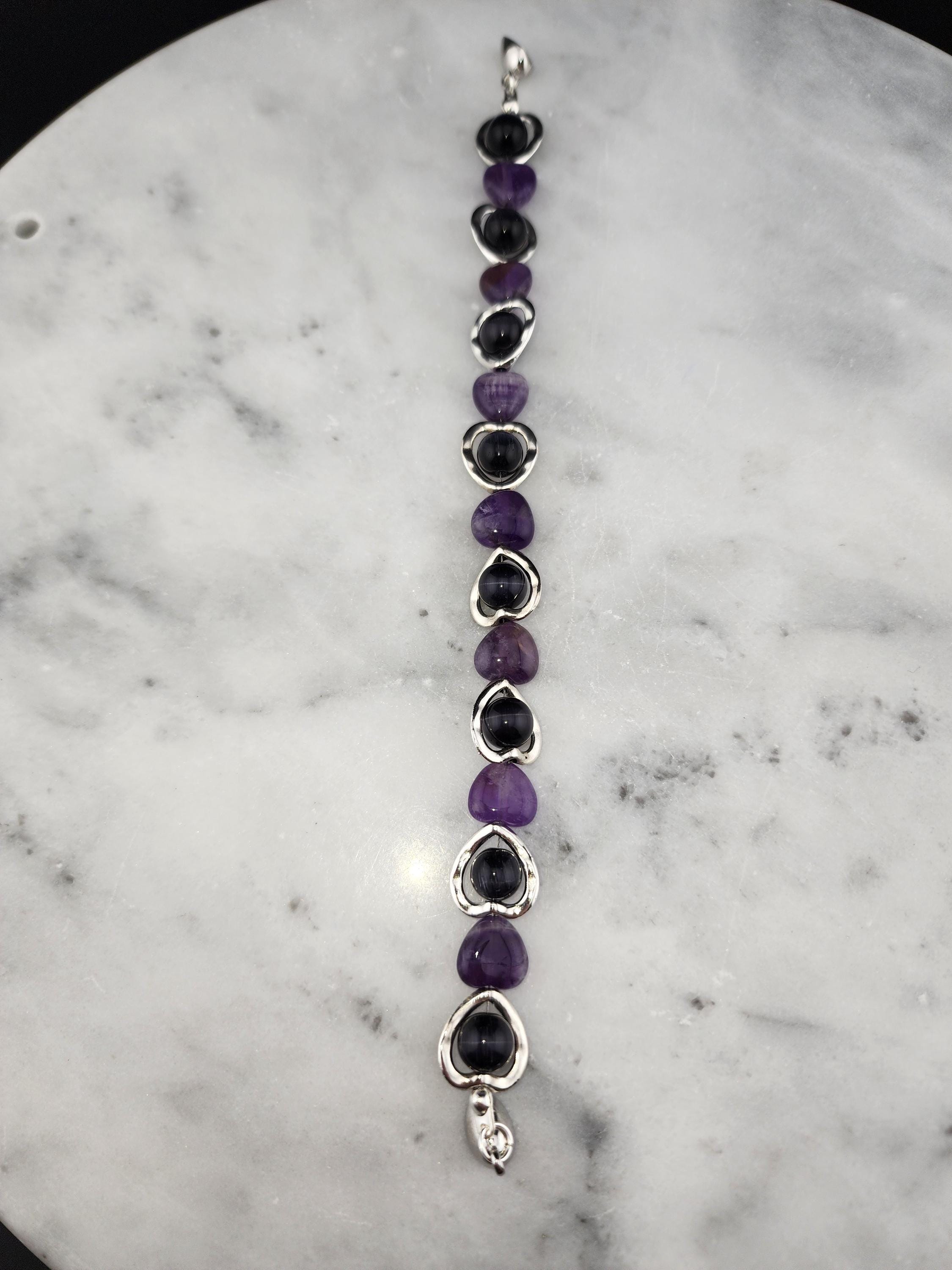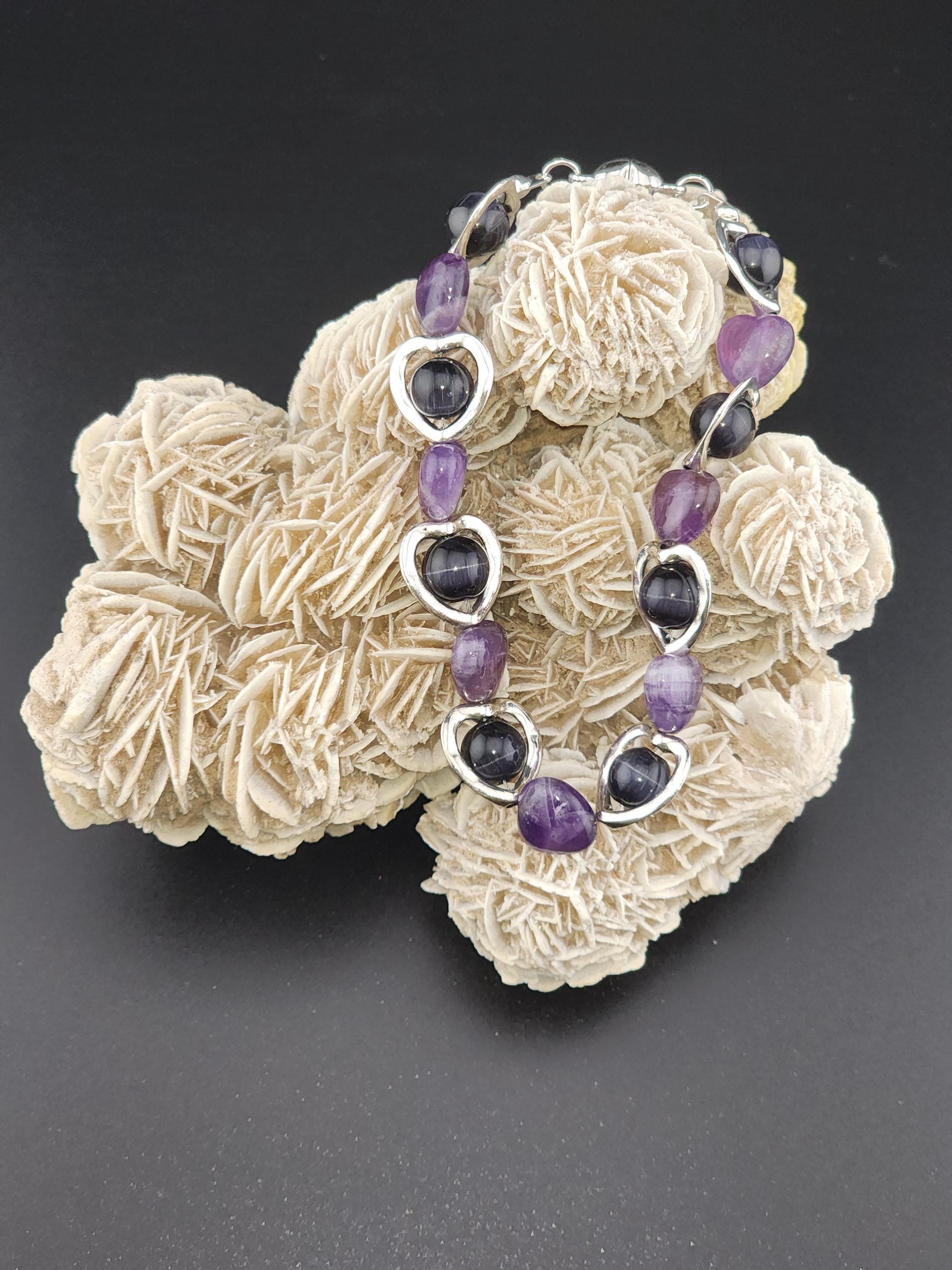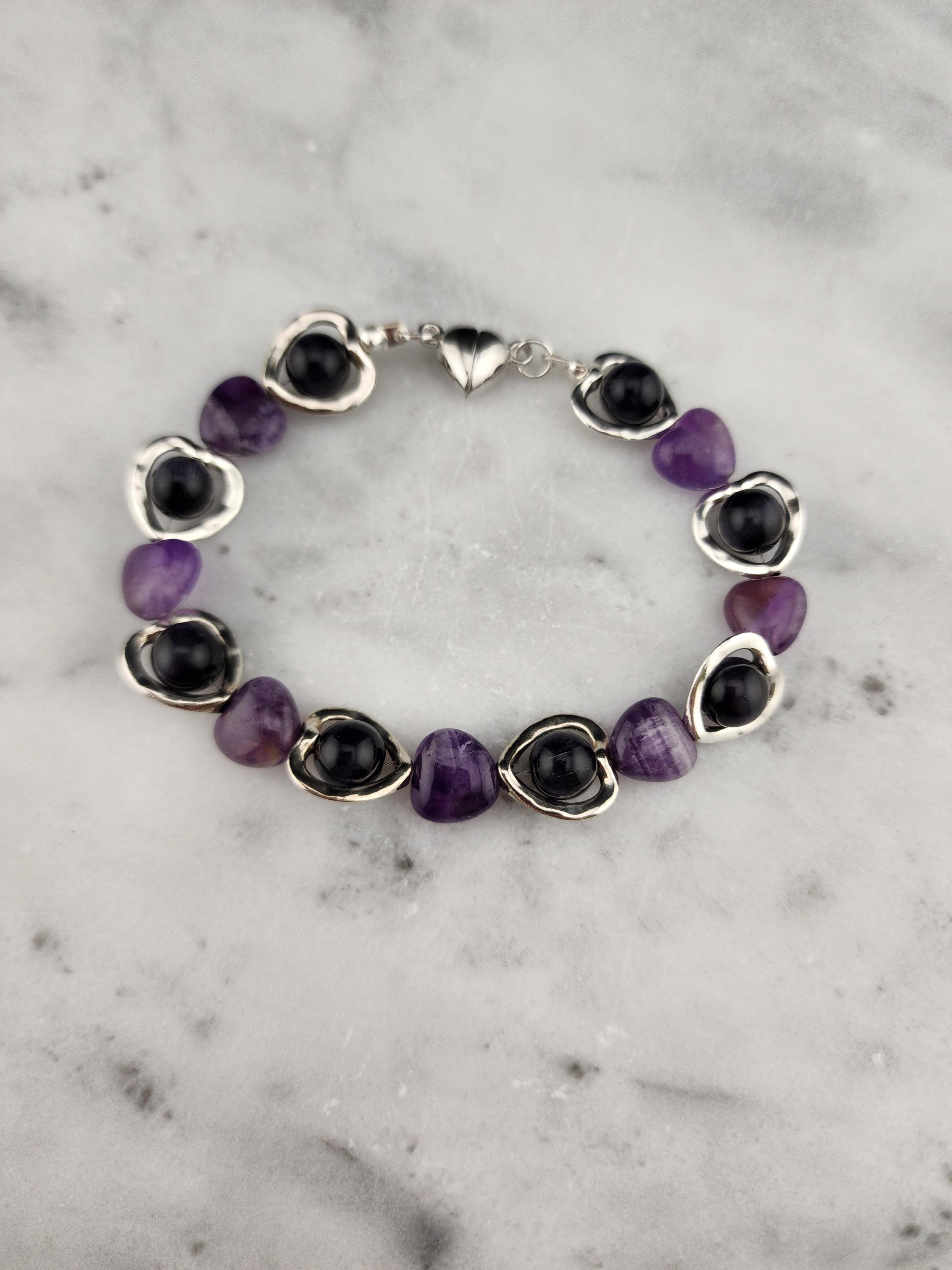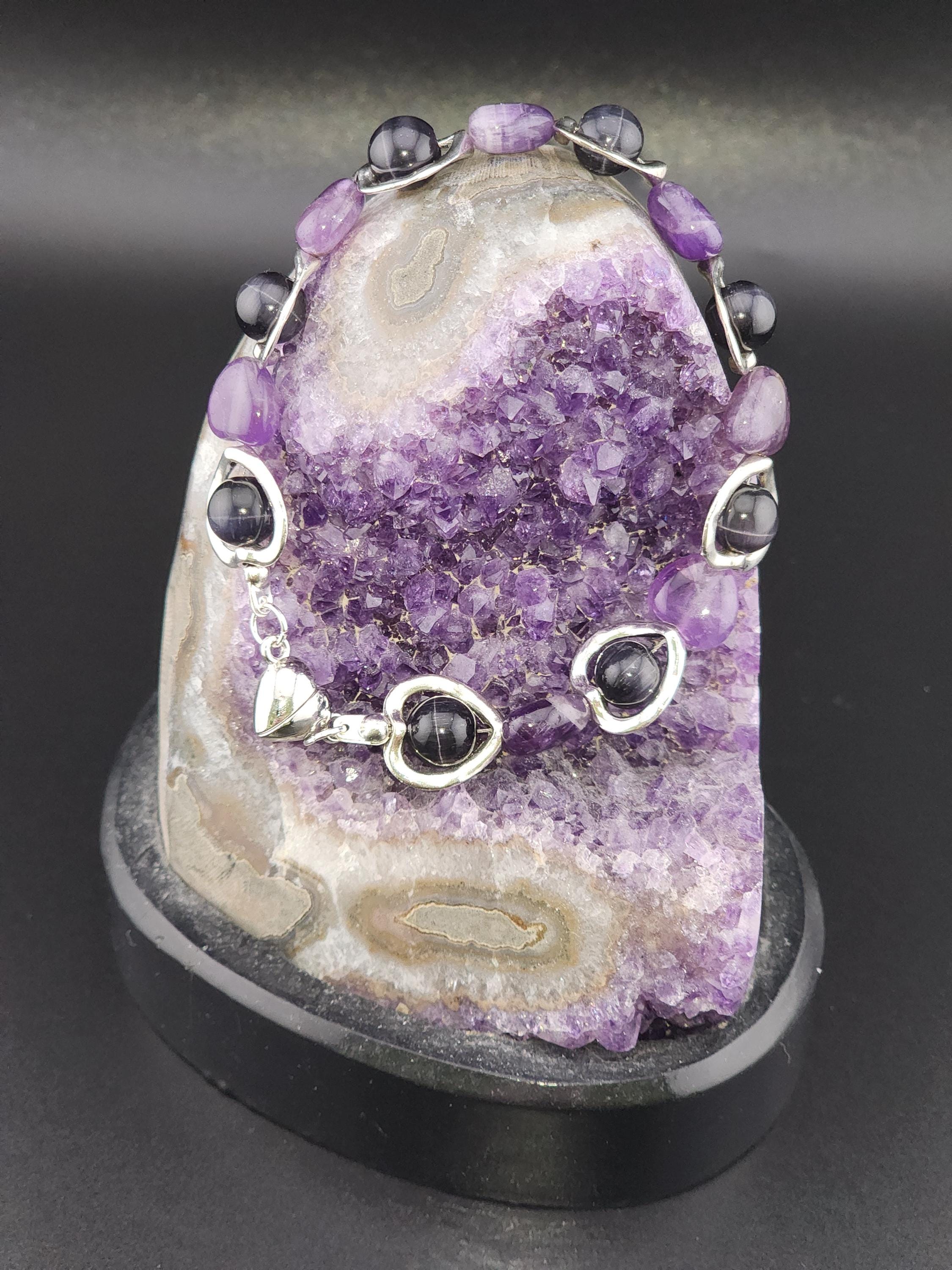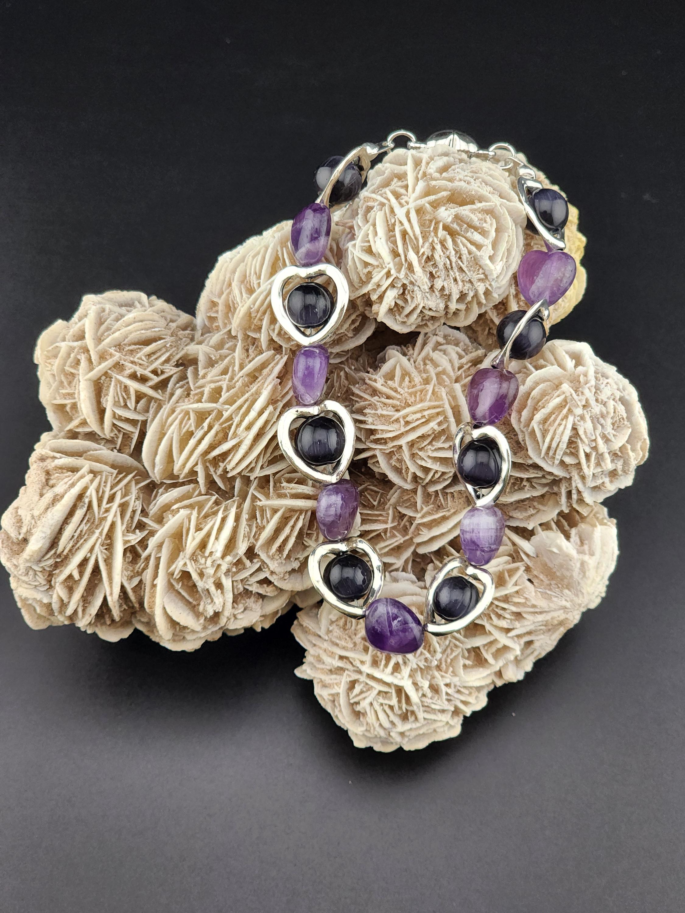 I made this bracelet by using hollow silver hearts with purple cat eye beads in the center and alternating Amethyst stone hearts. There is a silver magnetic heart clasp with sterling silver plated connecting rings. Perfect for a Valentine gift or an Aquarian birthday gift. * Your purchase will arrive in pretty packaging * AMETHYST is the birthstone of February - Aquarius >>>>>>>>>>>>>>>>>>>>>>>>>>>>>>>>>>>>>>>>>>>>>>>>>>>>>>>>>> * Amethyst is a premier spiritual and healing stone known for promoting deep calm, emotional balance, and heightened intuition. * This purple quartz variety enhances meditation, shields against negativity, and aids in overcoming addictions by promoting clarity and wisdom. It is widely used to facilitate inner peace and spiritual growth. * Amethyst is frequently used in meditation, worn as jewelry for constant protection, or placed in spaces to create a serene environment. OR, SO THEY SAY... >>>>>>>>>>>>>>>>>>>>>>>>>>>>>>>>>>>>>>>>>>>>>>>>>>>>>>>>>> * Spiritual Awakening & Protection: Known as a "stone of spirituality," it is believed to activate higher consciousness, enhance intuition, and facilitate angelic communication. It acts as a protective shield against negative energy, stress, and, historically, against guilt and fear. Calm and Balance: Amethyst is renowned for its soothing energy, helping to alleviate anxiety, reduce emotional highs and lows, and promote a peaceful, meditative state. * Mental Clarity & Focus: It is believed to improve cognitive abilities, helping individuals make sound decisions, increase focus, and overcome,mental confusion. OR, SO THEY SAY...