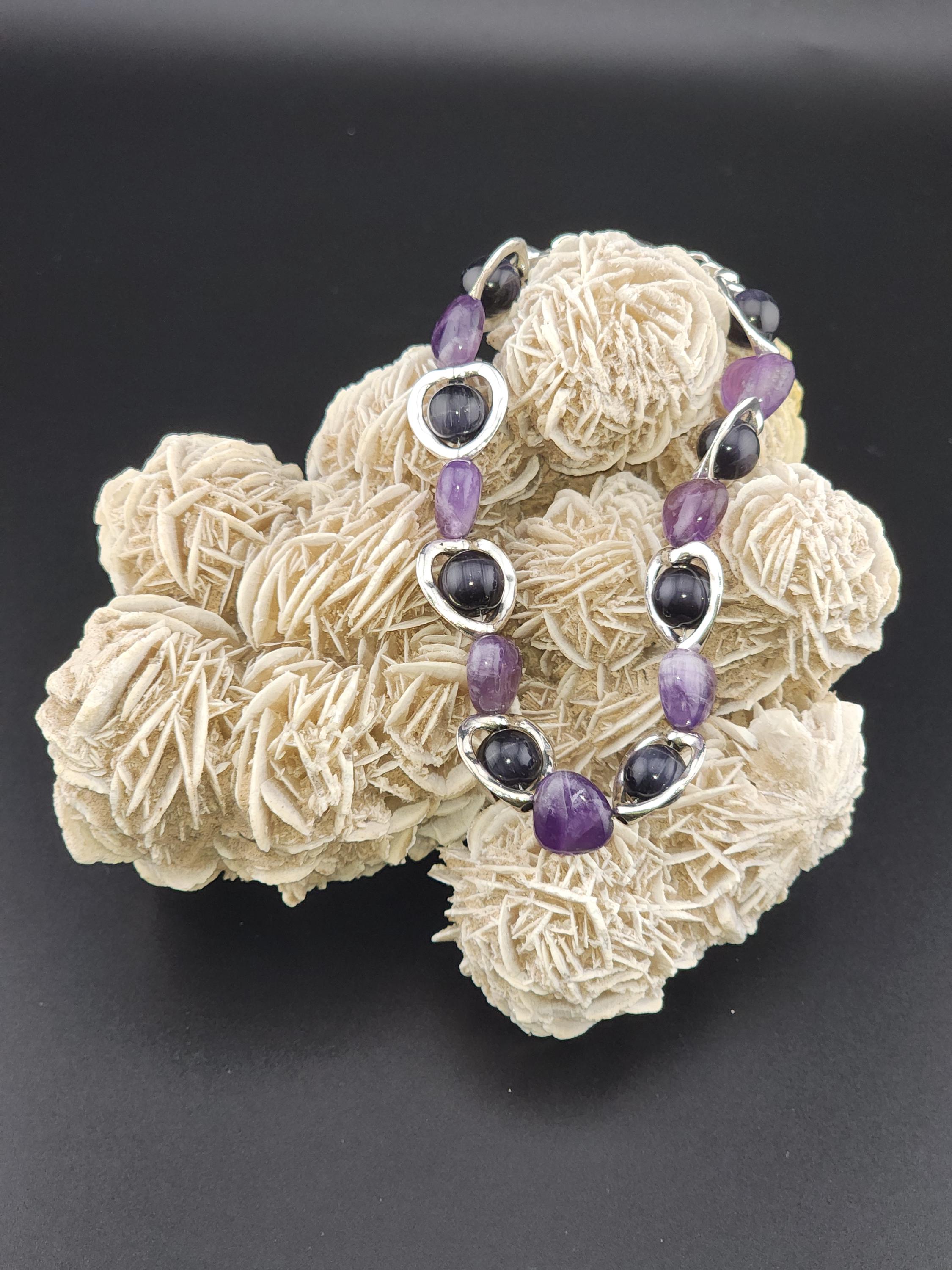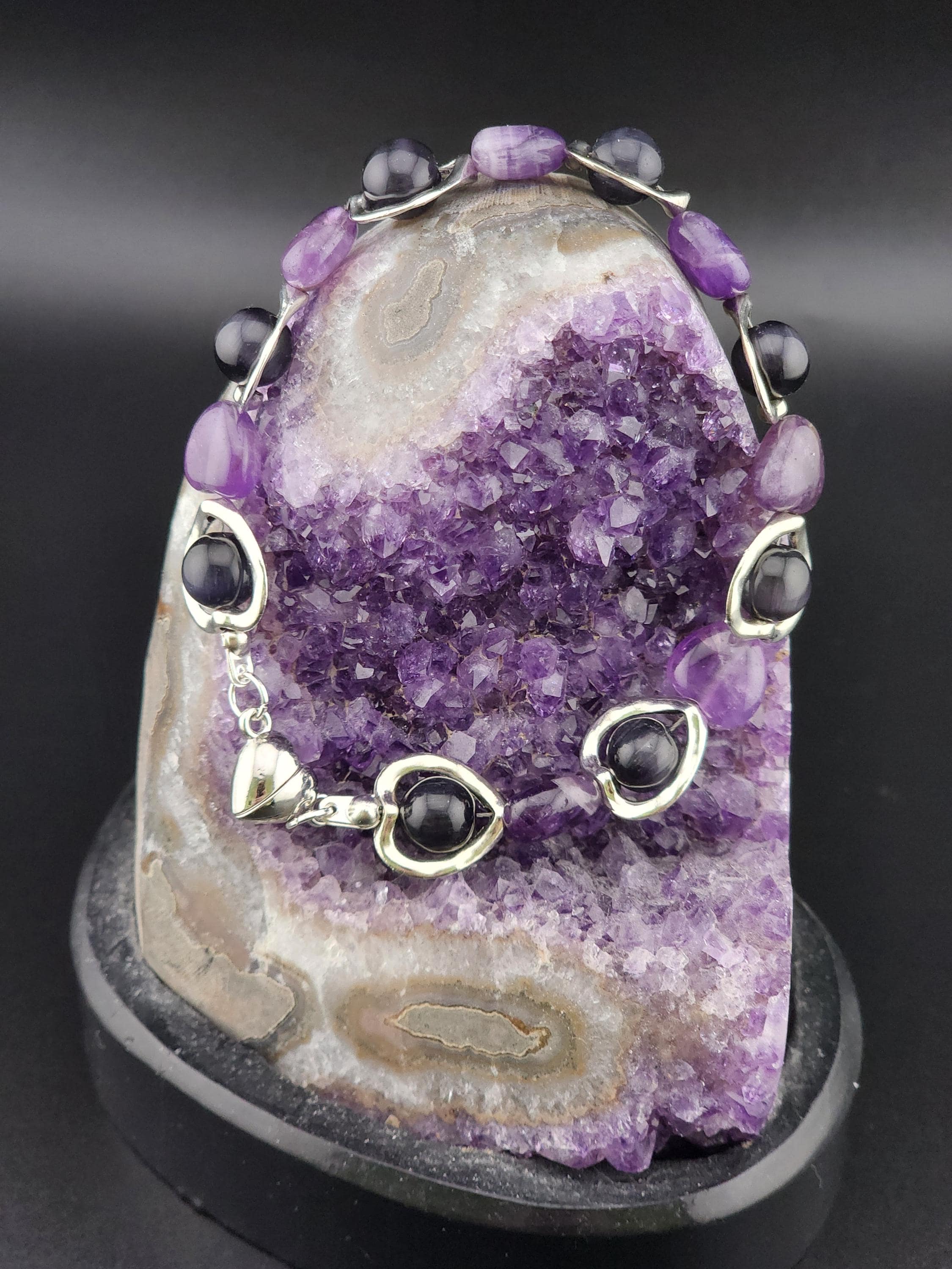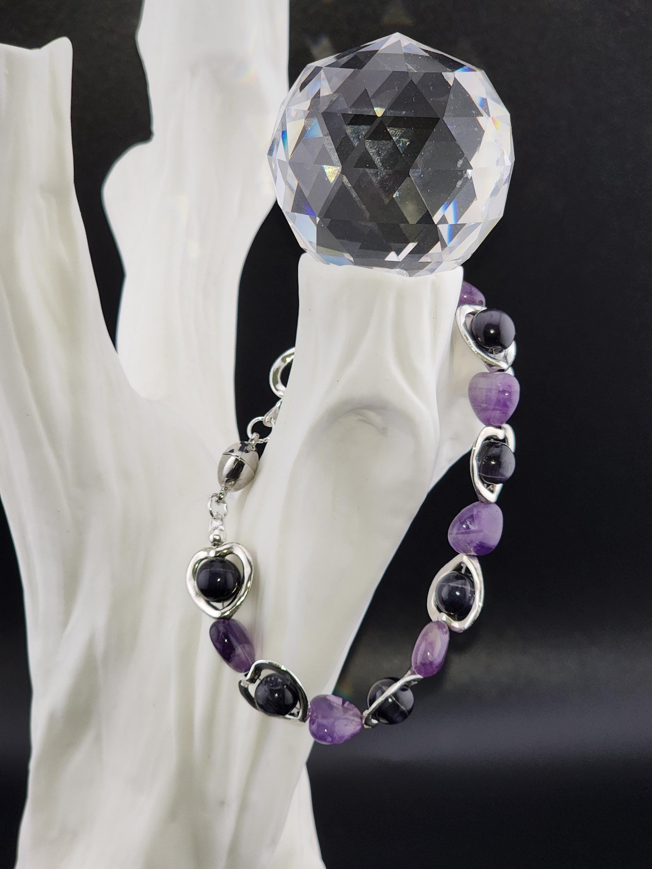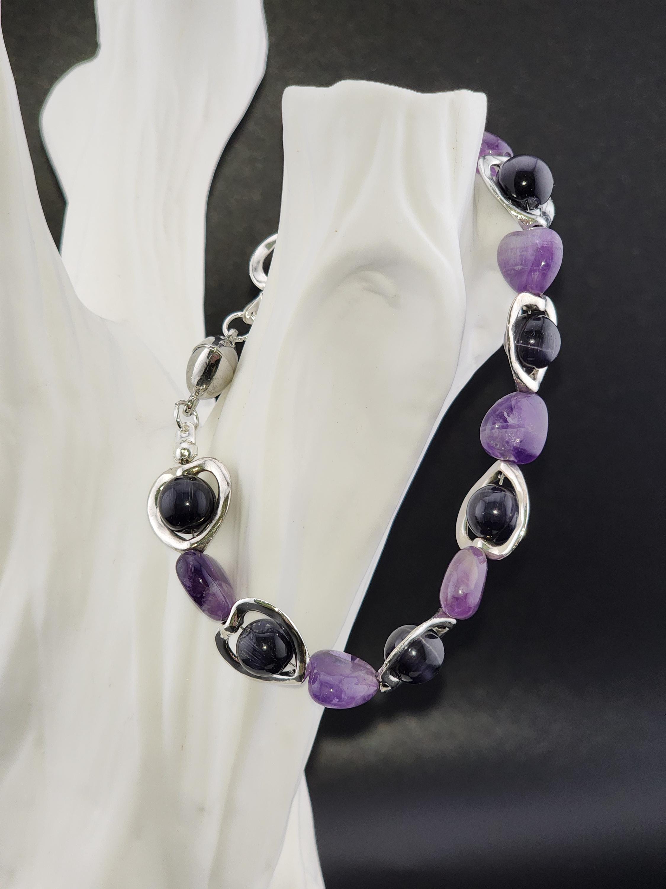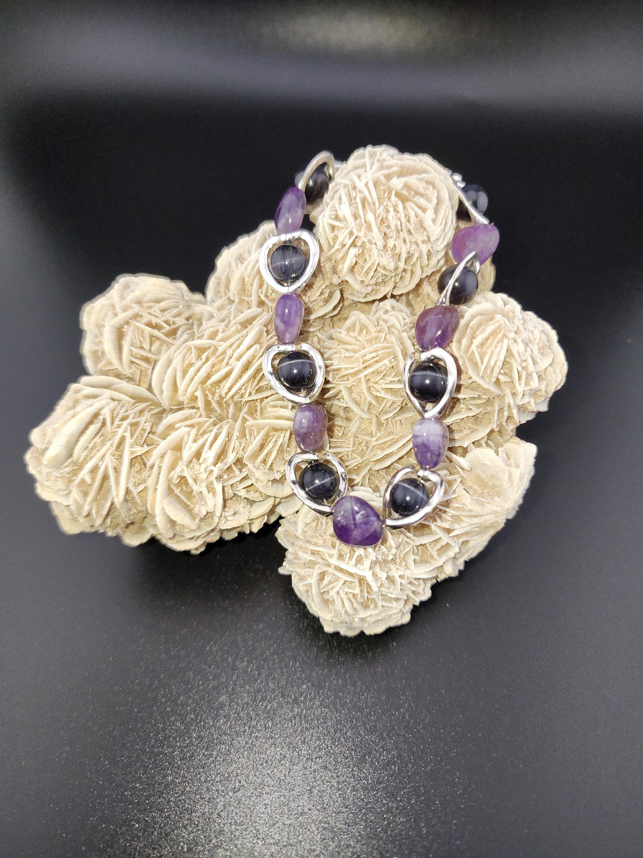 I made this bracelet by using hollow silver hearts with purple cat eye beads in the center and alternating Amethyst stone hearts. There is a silver magnetic heart clasp with sterling silver plated connecting rings. Perfect for a Valentine gift or an Aquarian birthday gift. * Your purchase will arrive in pretty packaging * AMETHYST is the birthstone of February - Aquarius >>>>>>>>>>>>>>>>>>>>>>>>>>>>>>>>>>>>>>>>>>>>>>>>>>>>>>>>>> * Amethyst is a premier spiritual and healing stone known for promoting deep calm, emotional balance, and heightened intuition. * This purple quartz variety enhances meditation, shields against negativity, and aids in overcoming addictions by promoting clarity and wisdom. It is widely used to facilitate inner peace and spiritual growth. * Amethyst is frequently used in meditation, worn as jewelry for constant protection, or placed in spaces to create a serene environment. OR, SO THEY SAY... >>>>>>>>>>>>>>>>>>>>>>>>>>>>>>>>>>>>>>>>>>>>>>>>>>>>>>>>>> * Spiritual Awakening & Protection: Known as a "stone of spirituality," it is believed to activate higher consciousness, enhance intuition, and facilitate angelic communication. It acts as a protective shield against negative energy, stress, and, historically, against guilt and fear. Calm and Balance: Amethyst is renowned for its soothing energy, helping to alleviate anxiety, reduce emotional highs and lows, and promote a peaceful, meditative state. * Mental Clarity & Focus: It is believed to improve cognitive abilities, helping individuals make sound decisions, increase focus, and overcome,mental confusion. OR, SO THEY SAY...