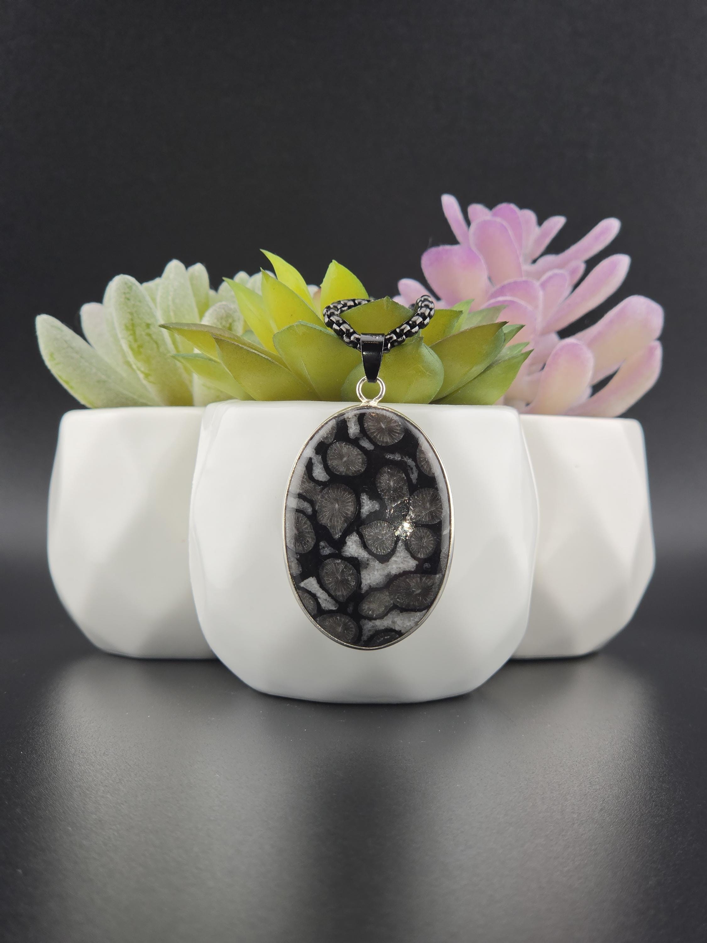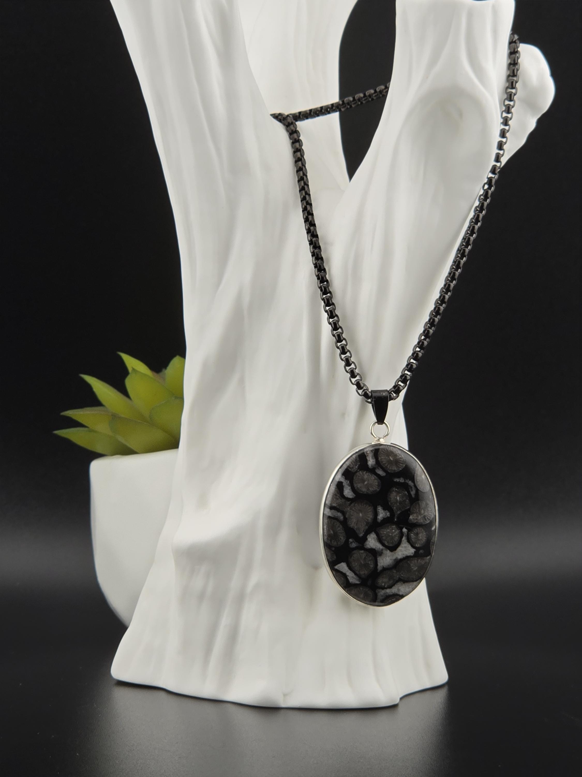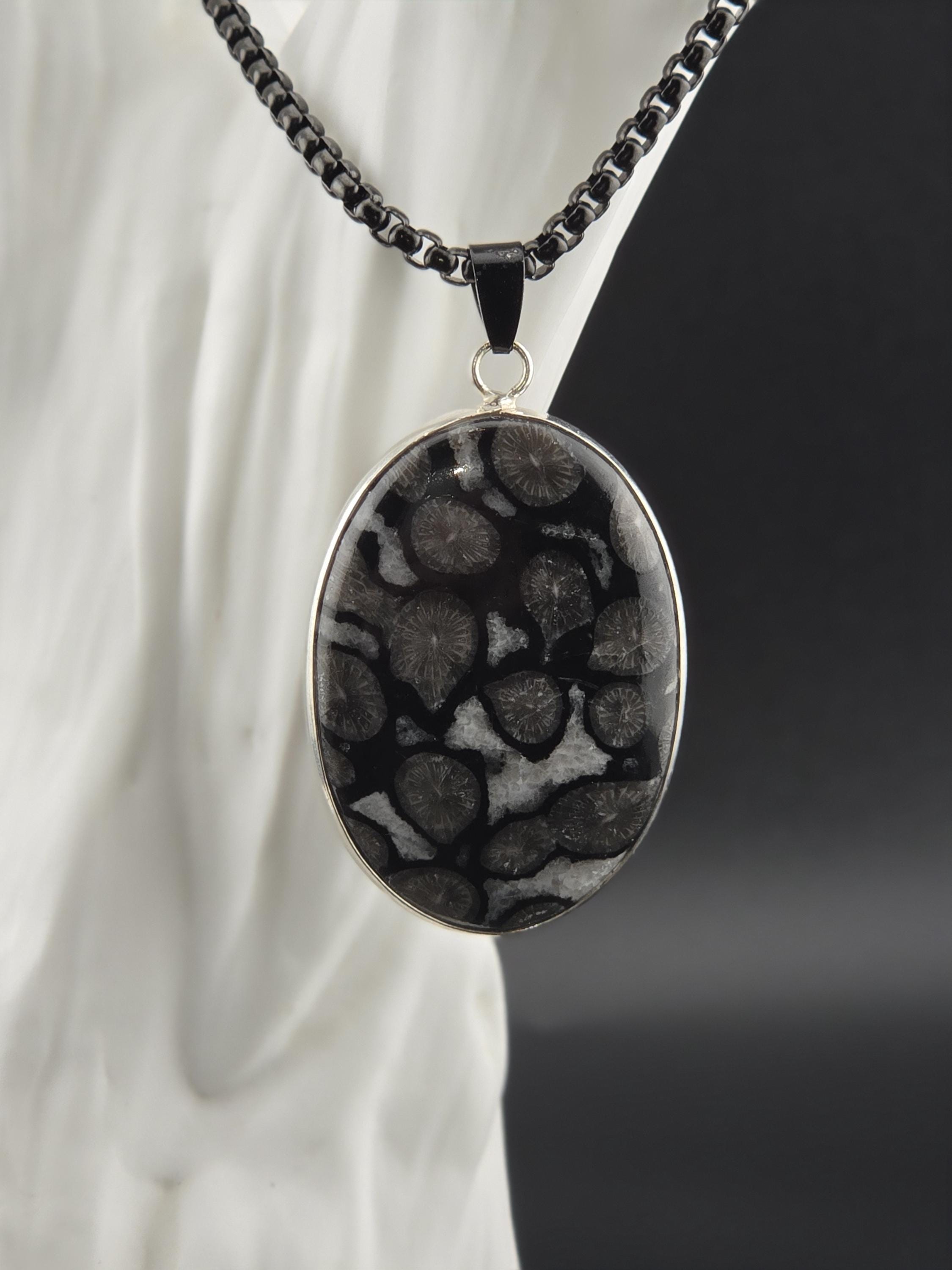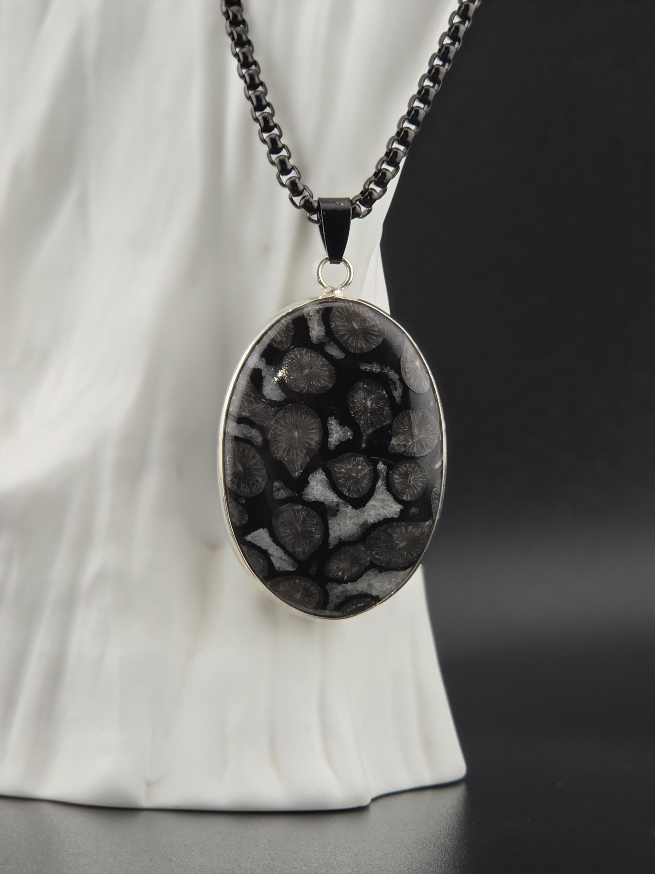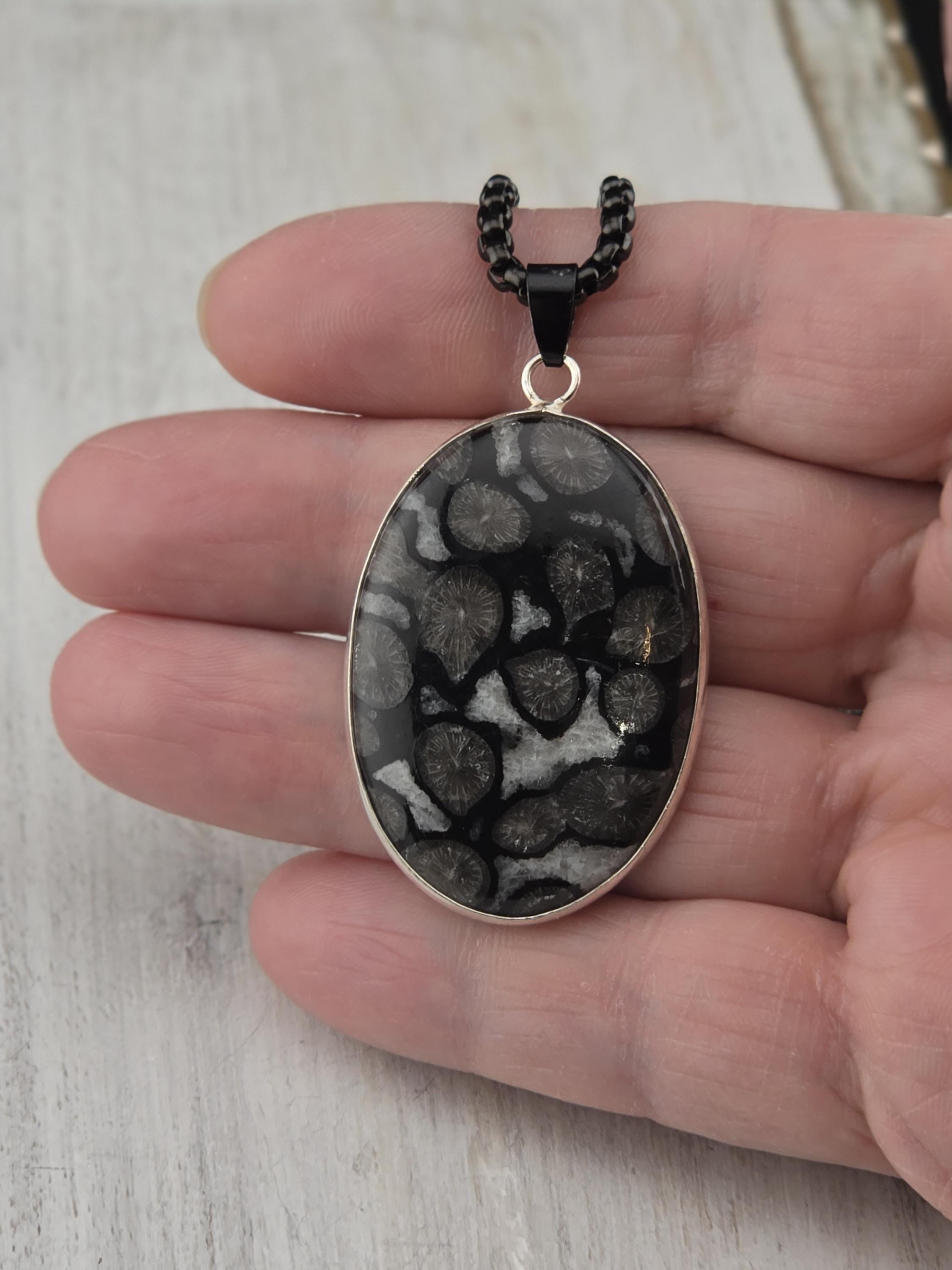 I made this necklace using highly polished black square rolo chain that has extenders making it adjustable from 20" to 22" in length. I added a handcrafted oval shape black fossil coral that is set in 925 sterling silver. This is an exceptional piece of black fossil coral. * Your purchase will arrive in pretty packaging >>>>>>>>>>>>>>>>>>>>>>>>>>>>>>>>>>>>>>>>>>>>>>>>>>>> Fossil Coral is a grounding and stabilizing stone formed from ancient coral that has undergone a natural process of fossilization, where organic material is replaced by agate over millions of years. This unique stone carries the wisdom of the ancient seas, offering strength, resilience, and protection. It is deeply connected to Earth’s energies, fostering stability, emotional balance, and spiritual growth. Fossil Coral is also associated with ancestral healing and past-life exploration, making it a powerful tool for transformation and self-discovery. OR, SO THEY SAY...