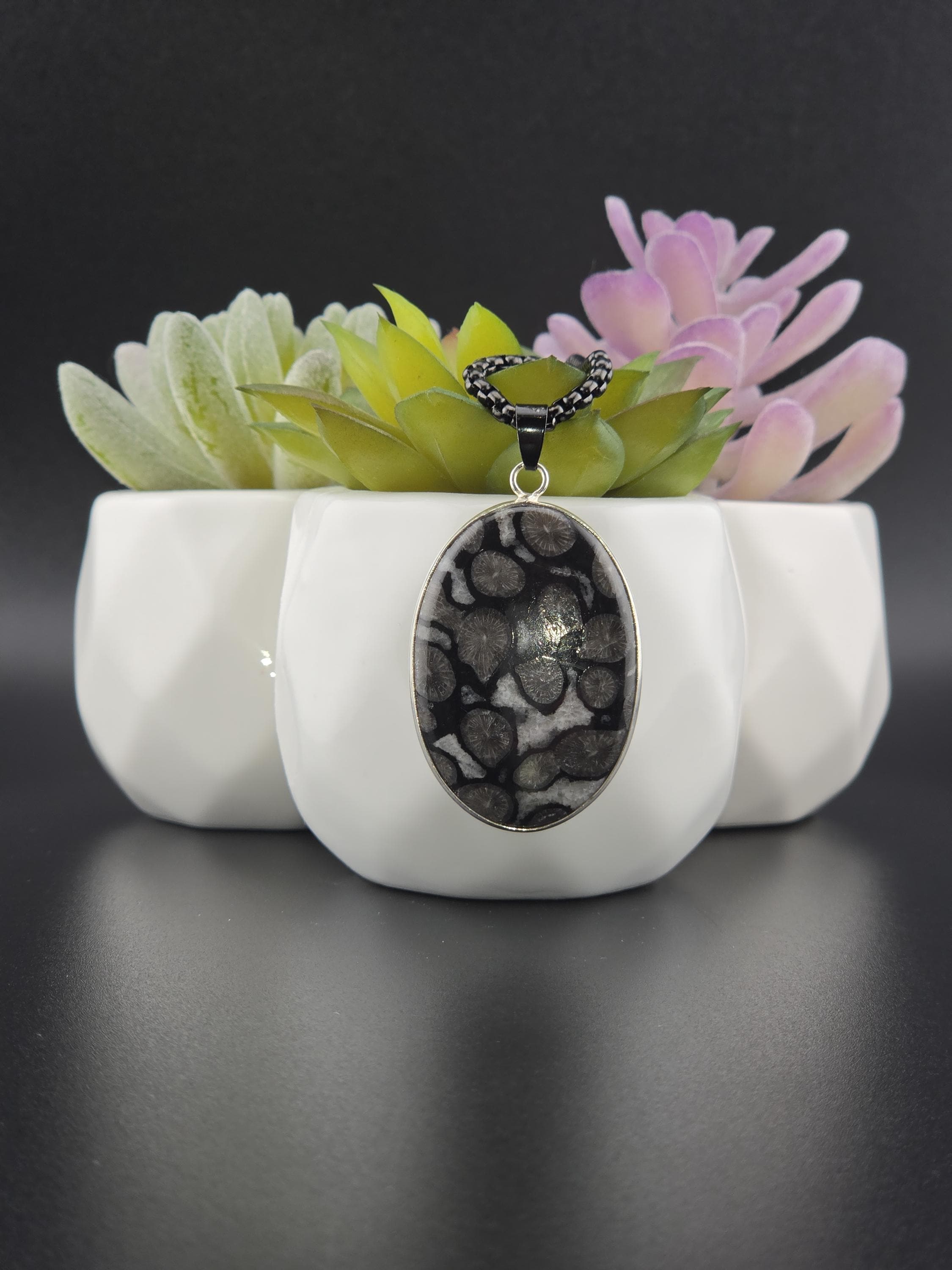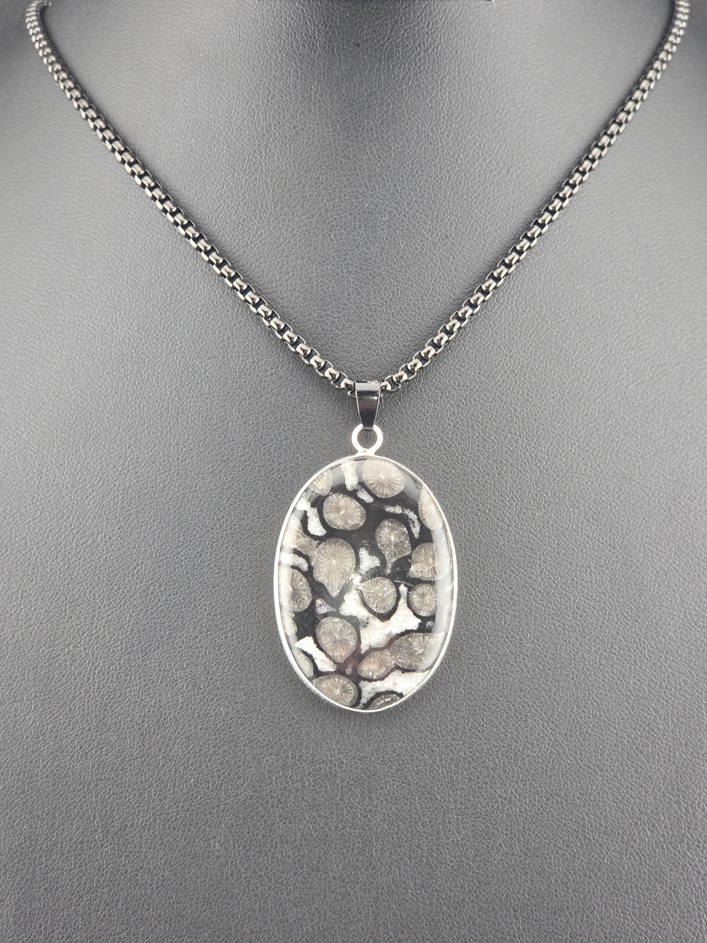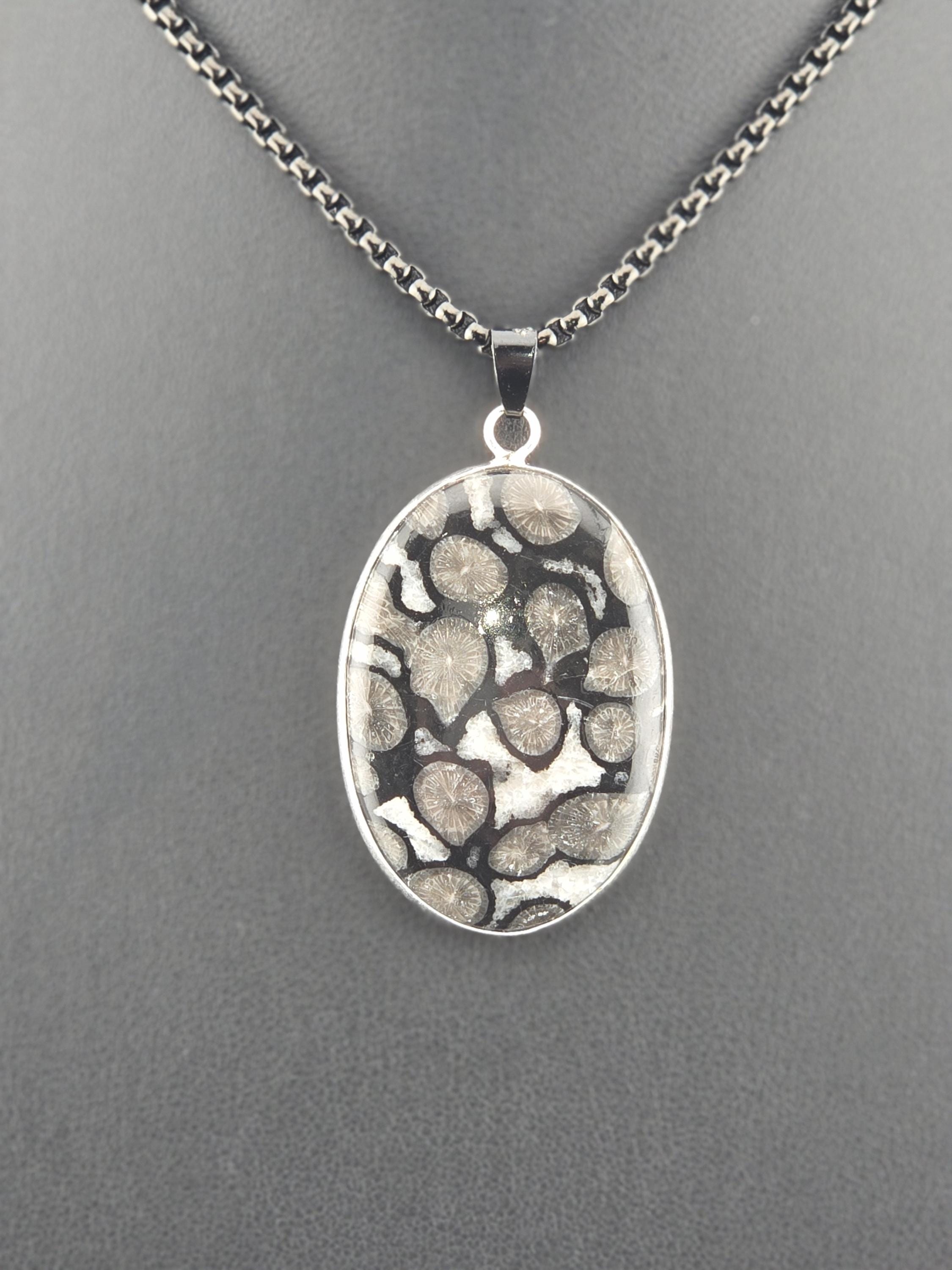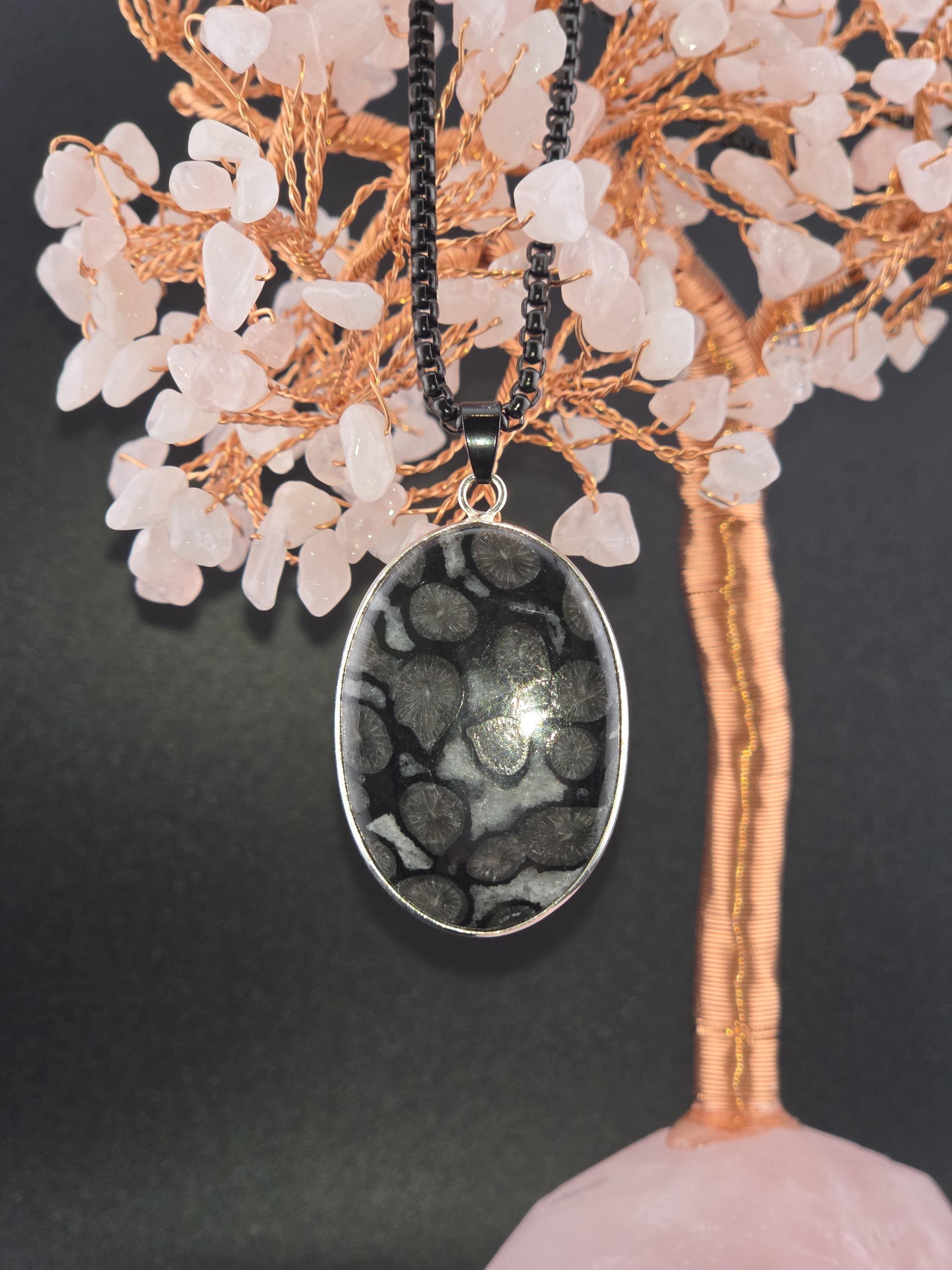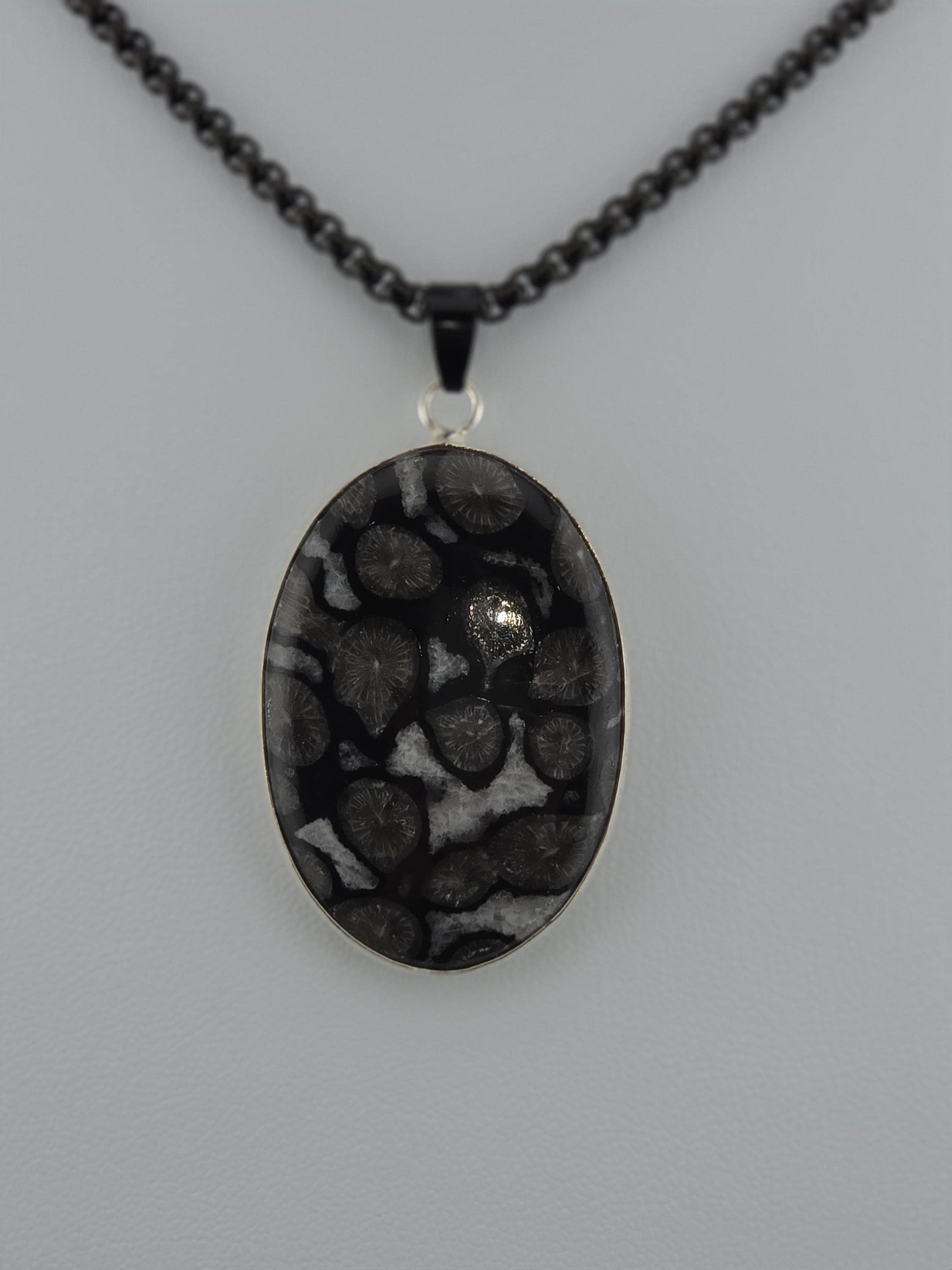 I made this necklace using highly polished black square rolo chain that has extenders making it adjustable from 20" to 22" in length. I added a handcrafted oval shape black fossil coral that is set in 925 sterling silver. This is an exceptional piece of black fossil coral. * Your purchase will arrive in pretty packaging >>>>>>>>>>>>>>>>>>>>>>>>>>>>>>>>>>>>>>>>>>>>>>>>>>>> Fossil Coral is a grounding and stabilizing stone formed from ancient coral that has undergone a natural process of fossilization, where organic material is replaced by agate over millions of years. This unique stone carries the wisdom of the ancient seas, offering strength, resilience, and protection. It is deeply connected to Earth’s energies, fostering stability, emotional balance, and spiritual growth. Fossil Coral is also associated with ancestral healing and past-life exploration, making it a powerful tool for transformation and self-discovery. OR, SO THEY SAY...