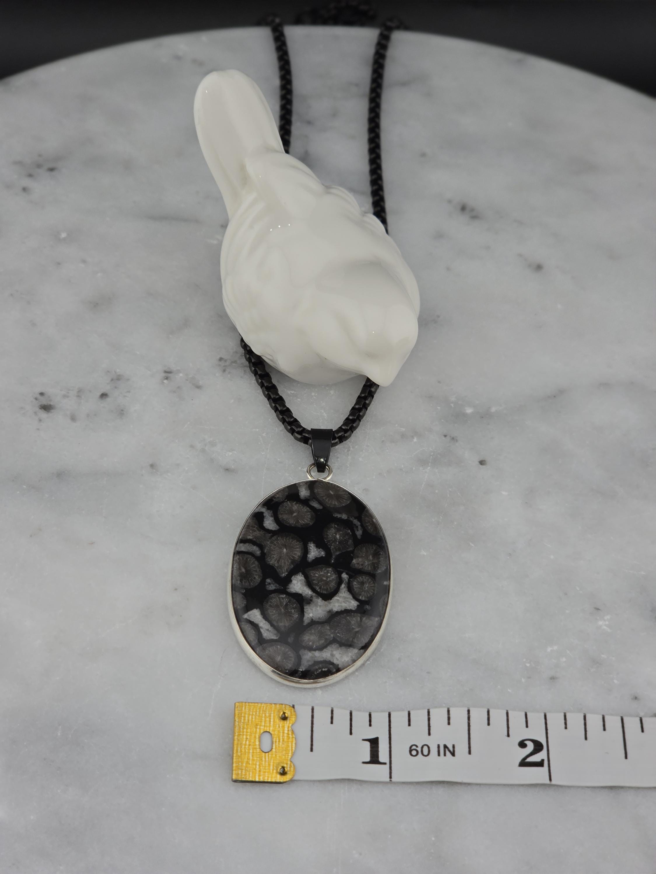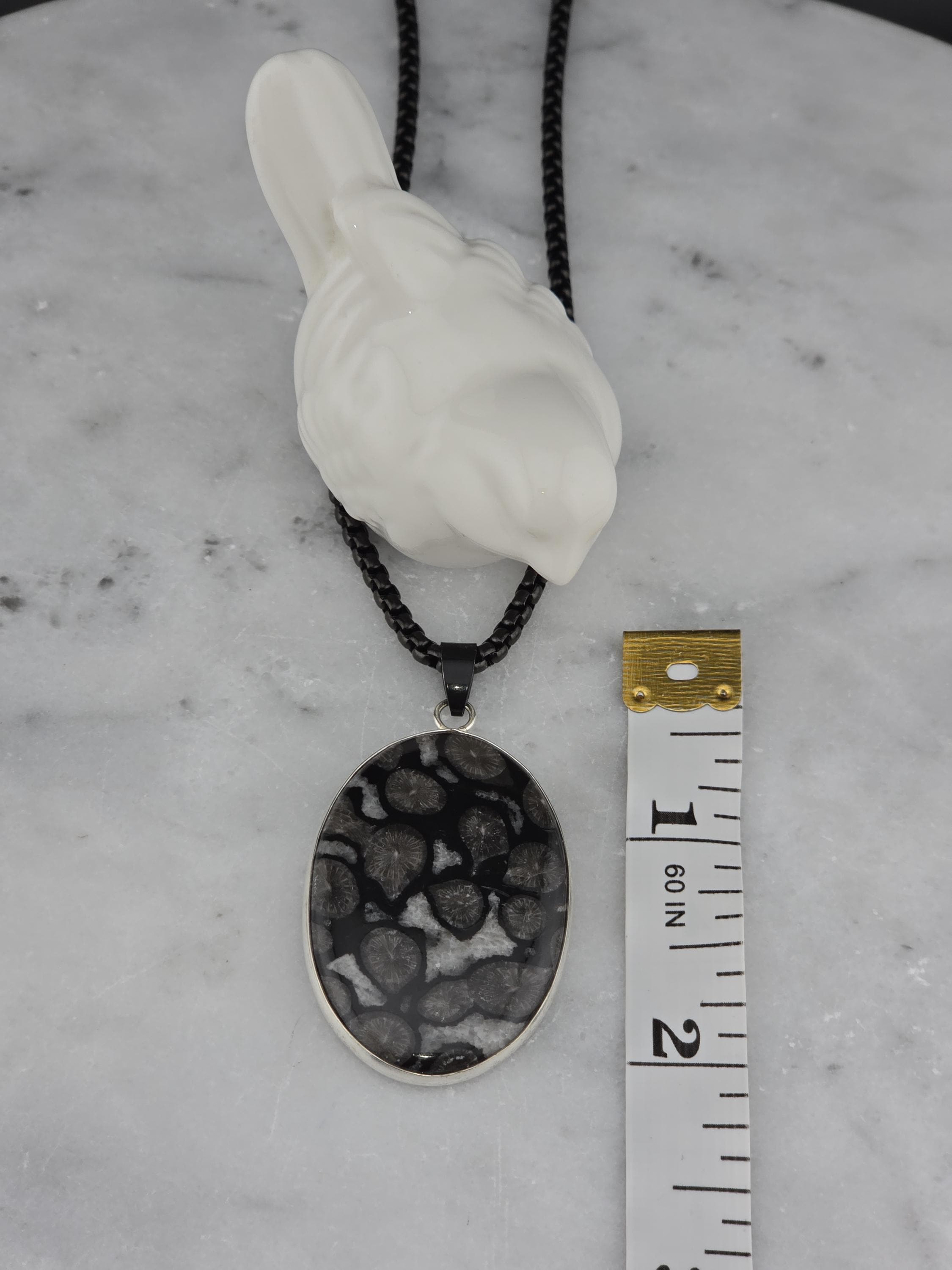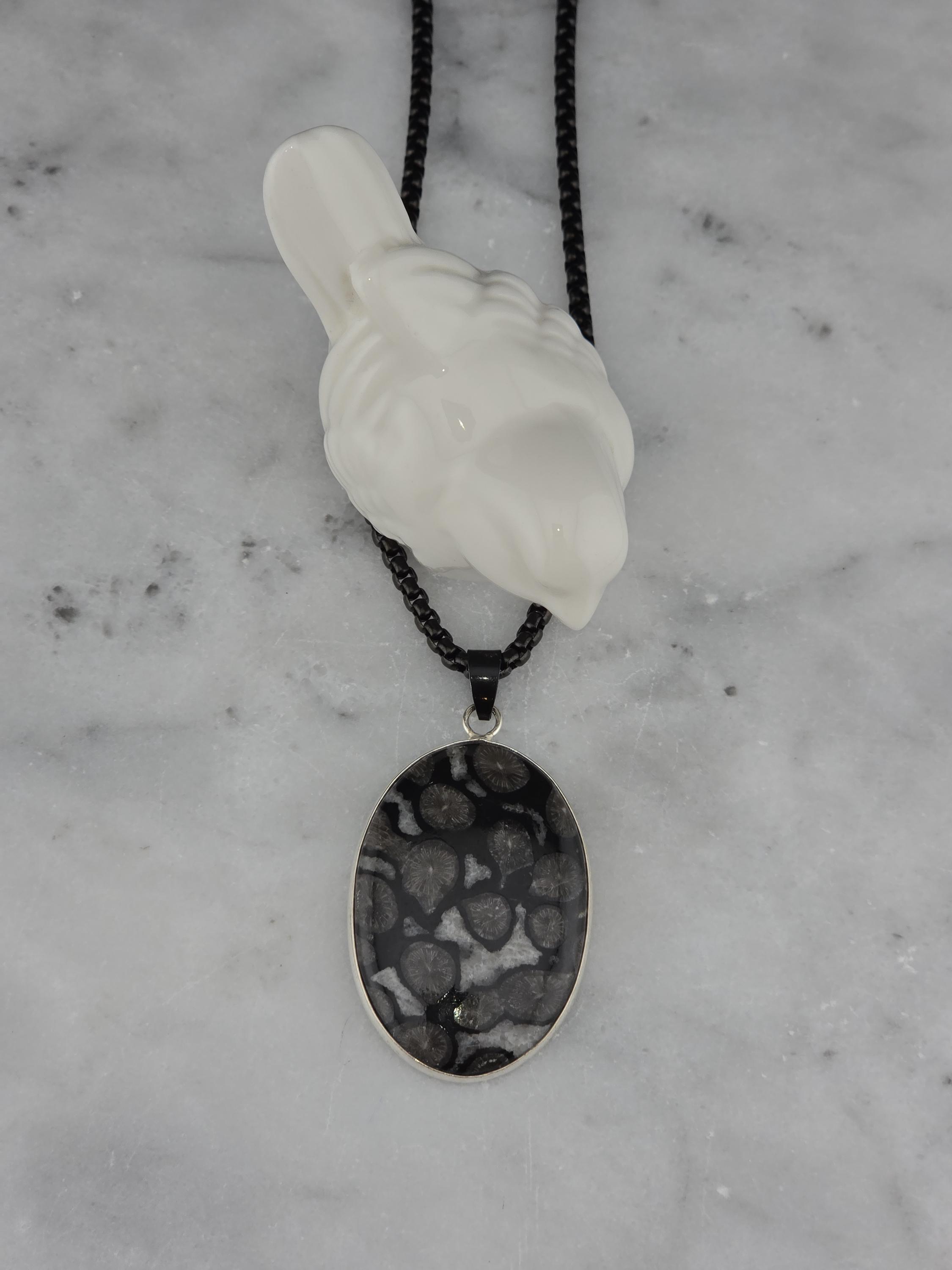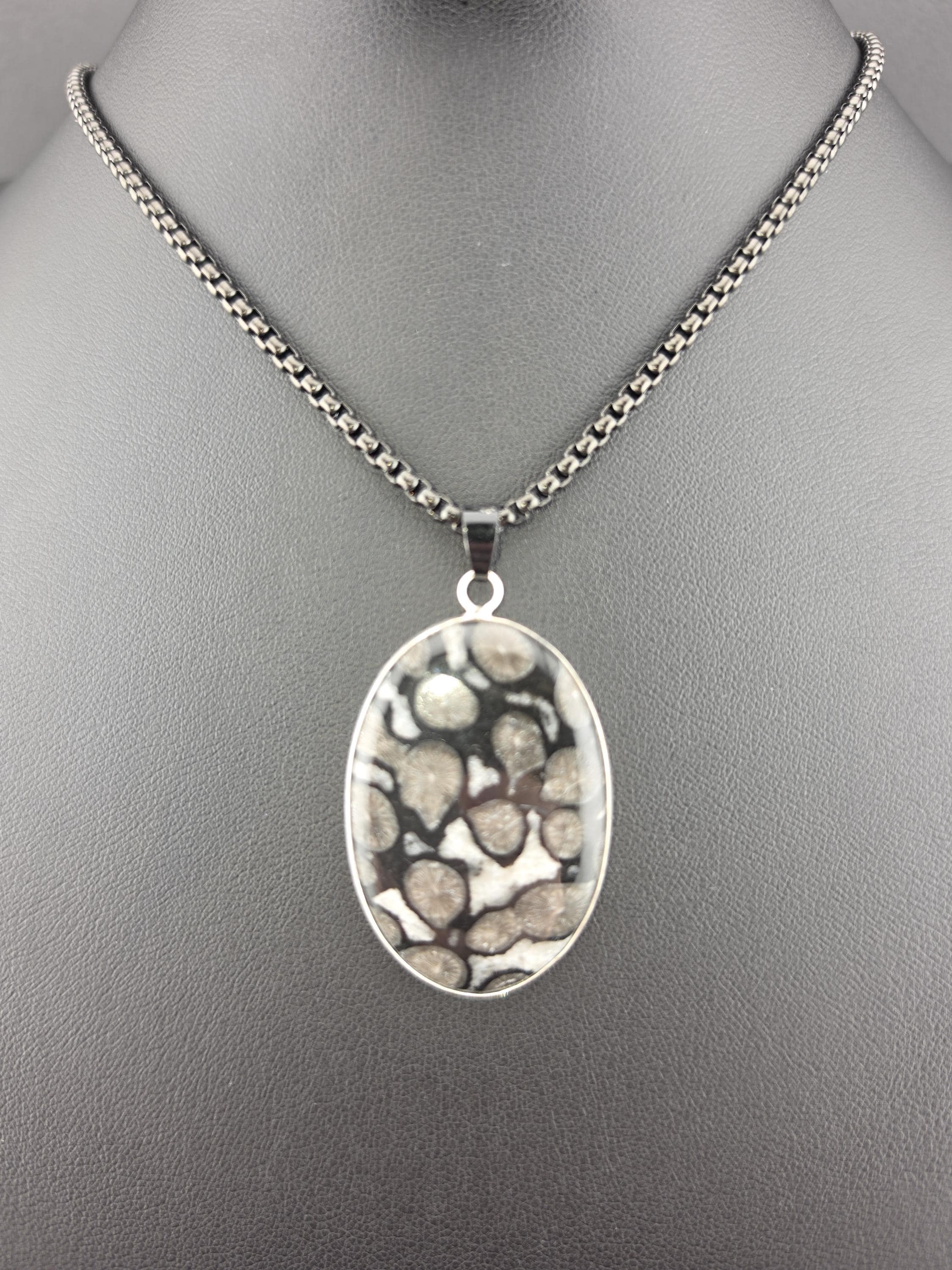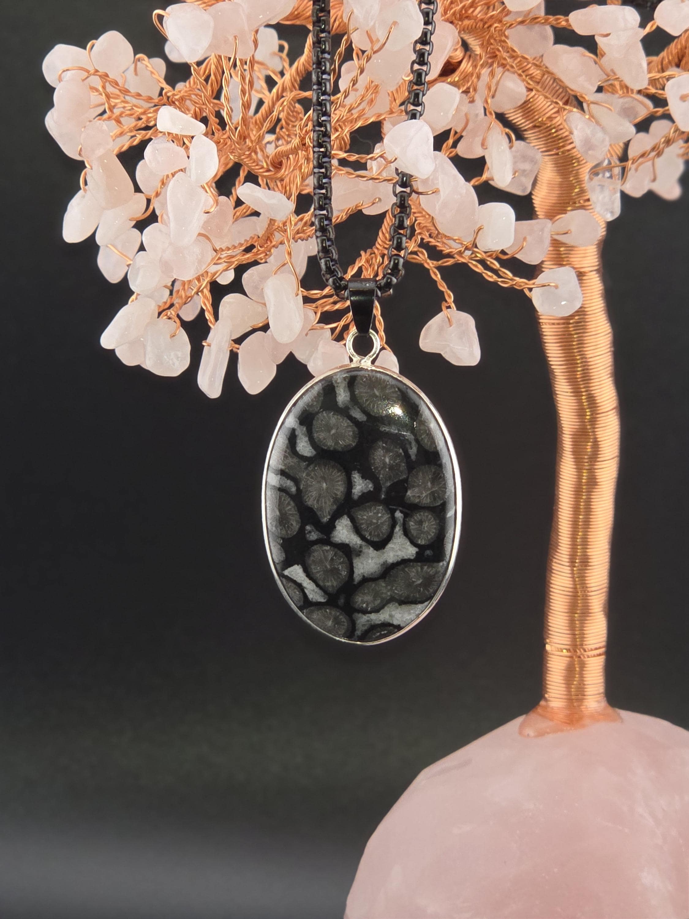 I made this necklace using highly polished black square rolo chain that has extenders making it adjustable from 20" to 22" in length. I added a handcrafted oval shape black fossil coral that is set in 925 sterling silver. This is an exceptional piece of black fossil coral. * Your purchase will arrive in pretty packaging >>>>>>>>>>>>>>>>>>>>>>>>>>>>>>>>>>>>>>>>>>>>>>>>>>>> Fossil Coral is a grounding and stabilizing stone formed from ancient coral that has undergone a natural process of fossilization, where organic material is replaced by agate over millions of years. This unique stone carries the wisdom of the ancient seas, offering strength, resilience, and protection. It is deeply connected to Earth’s energies, fostering stability, emotional balance, and spiritual growth. Fossil Coral is also associated with ancestral healing and past-life exploration, making it a powerful tool for transformation and self-discovery. OR, SO THEY SAY...