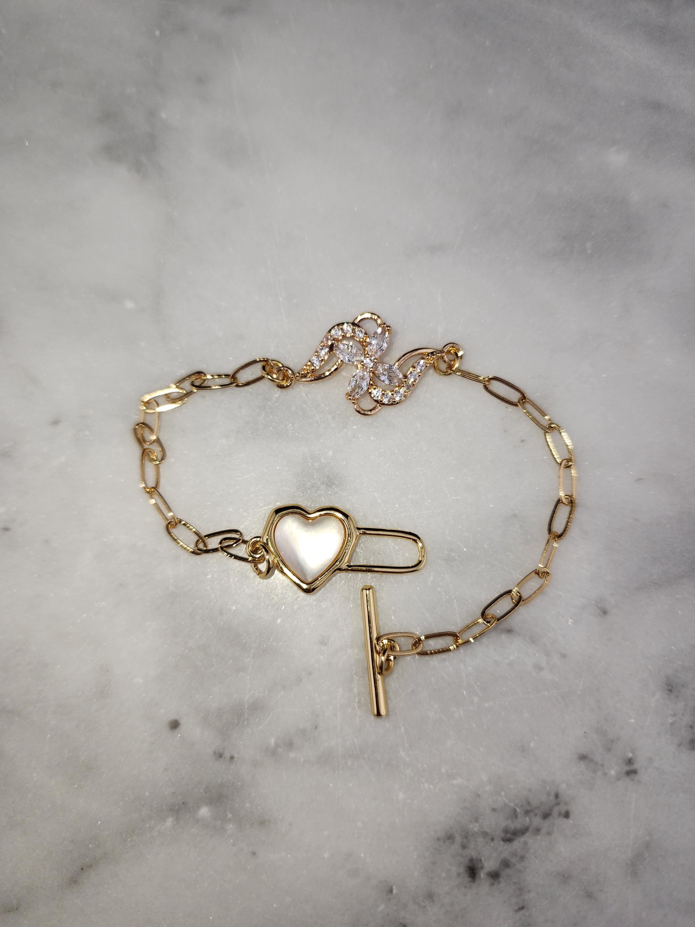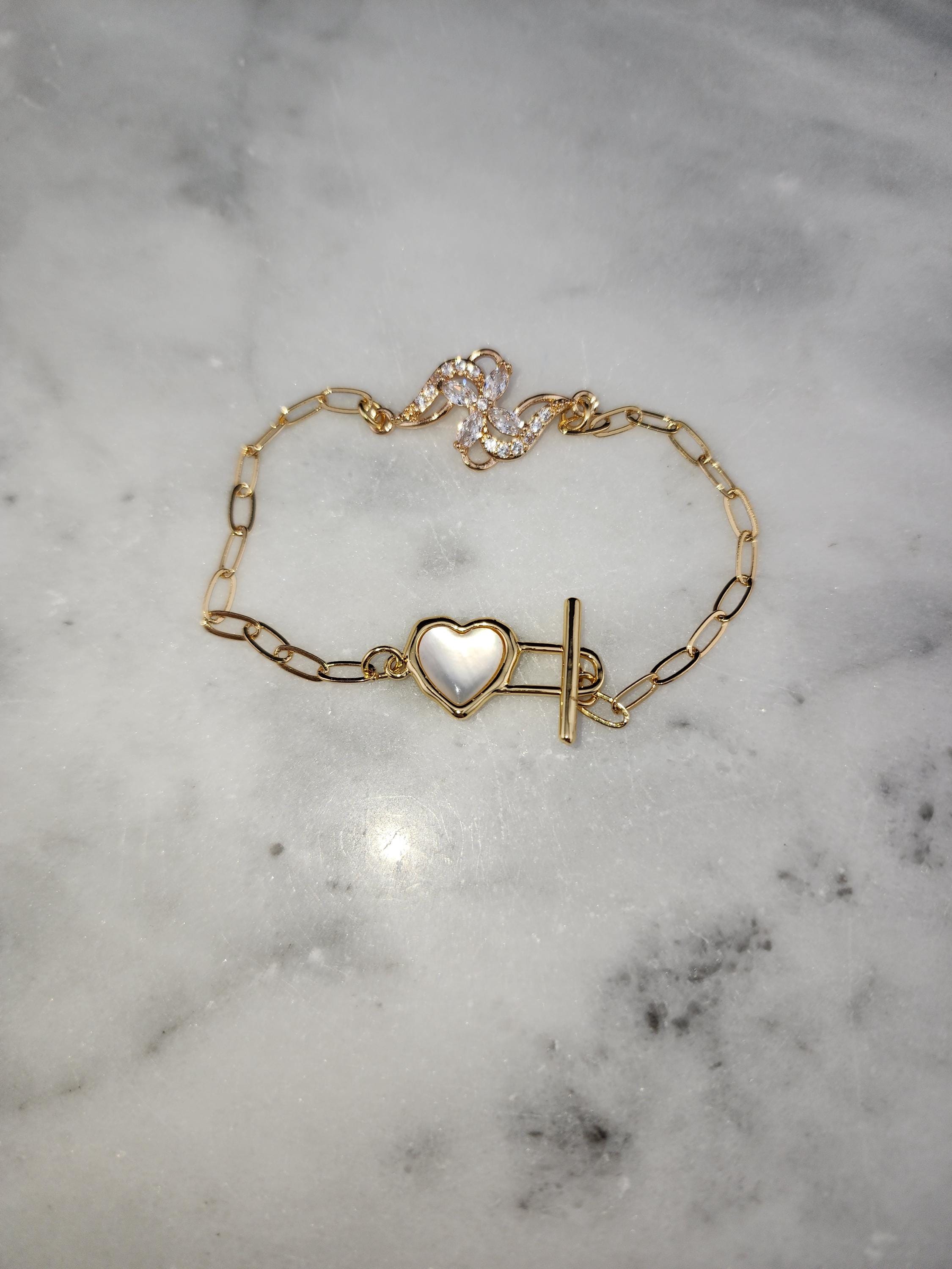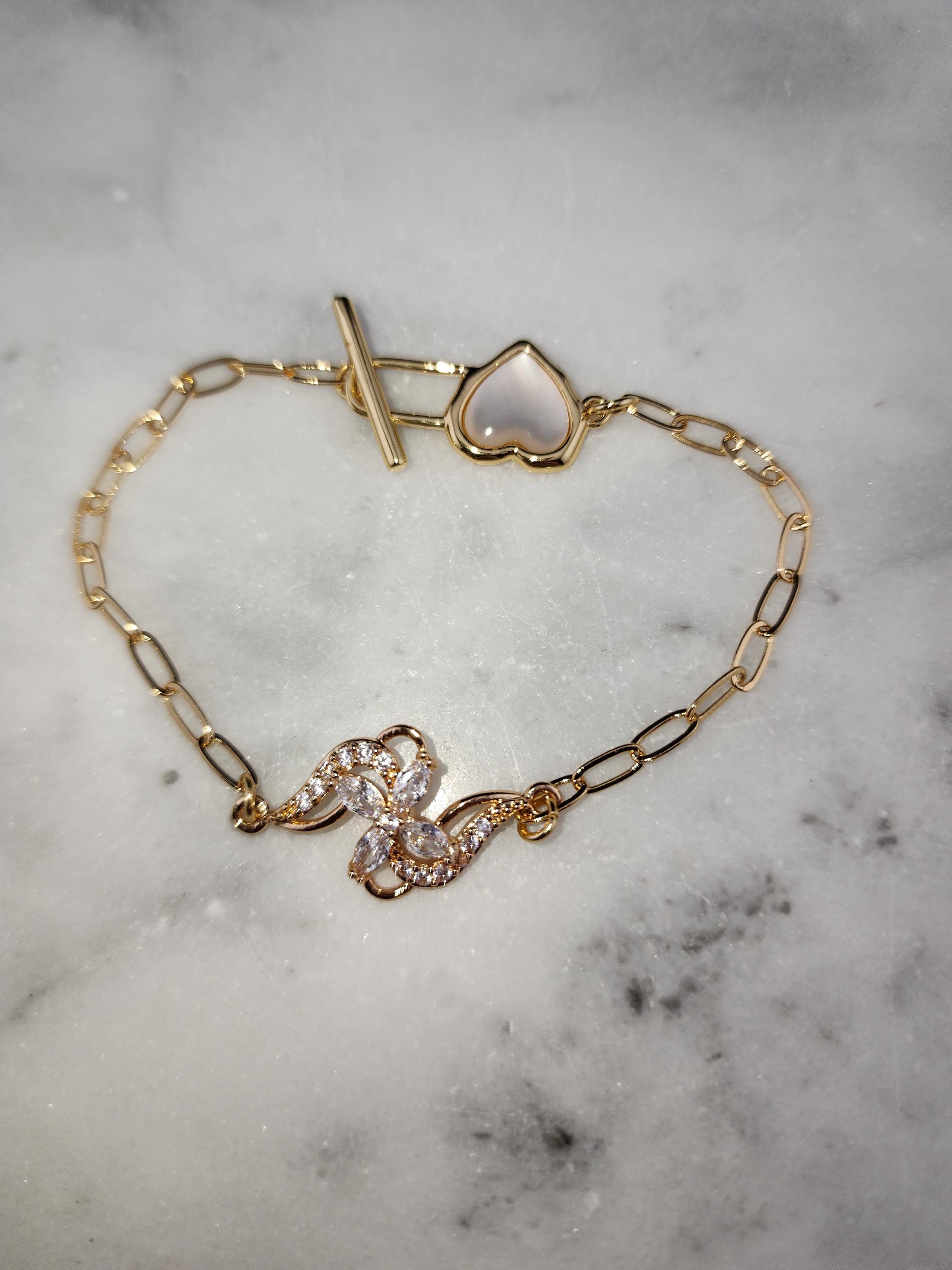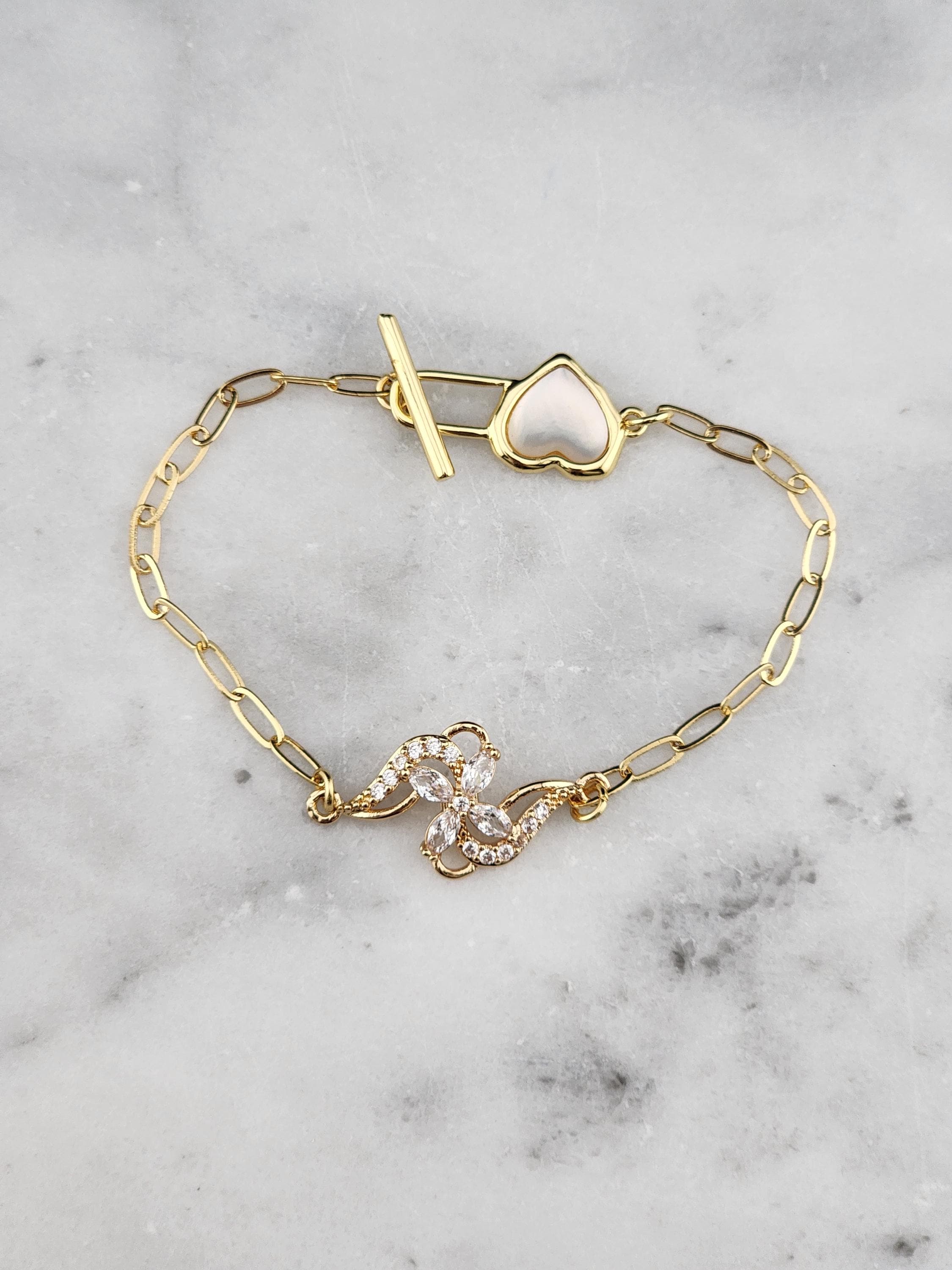 I made this bracelet using tarnish resistant 18k gold plated brass embossed gold chain that has a gold brass flower connector with cubic zirconia crystal petals. It has a gold heart toggle clasp filled with iridescent shell resin and 18k gold plated connecting rings. (Message me with the length you prefer) * Your purchase will arrive in pretty packaging