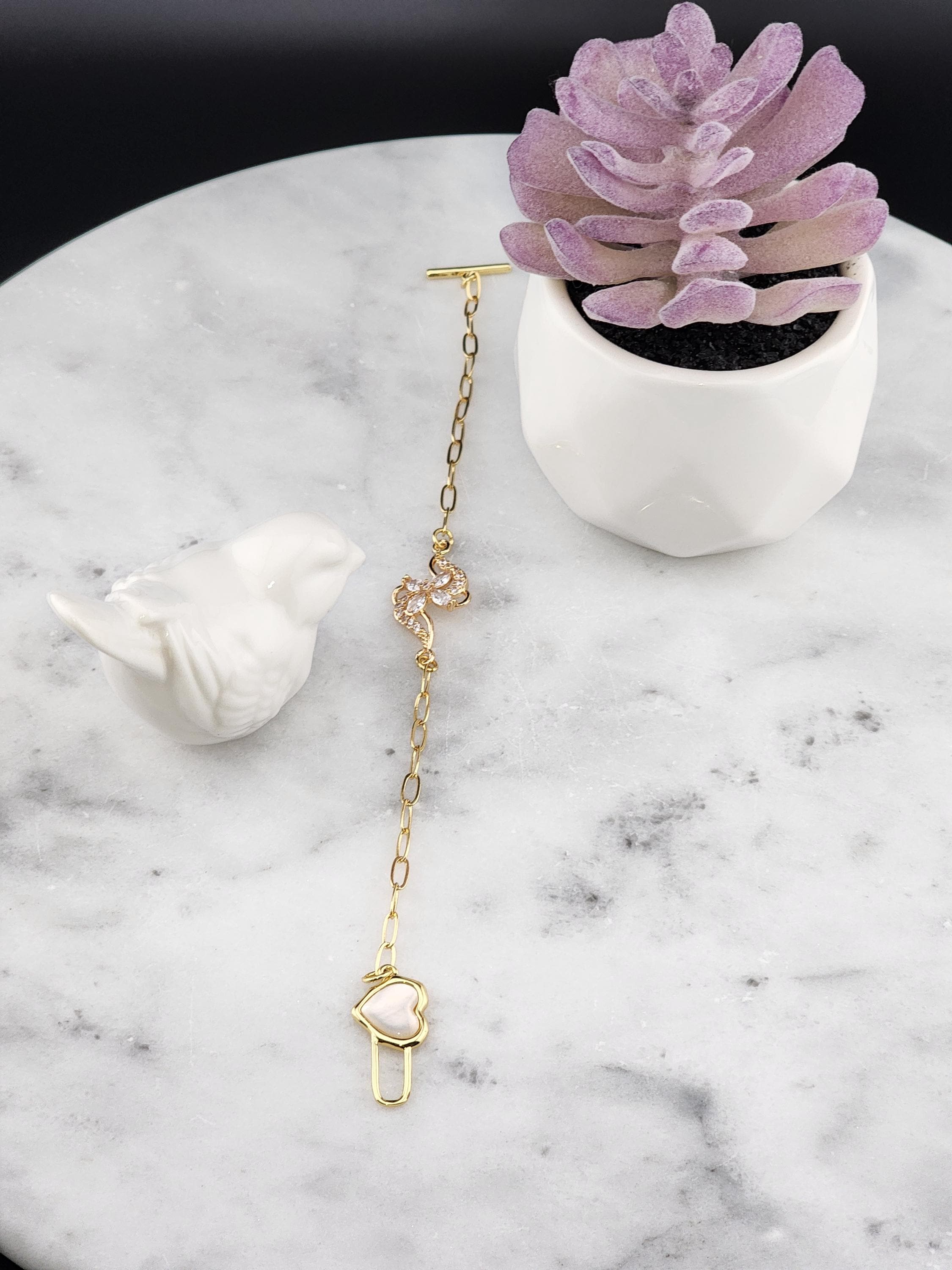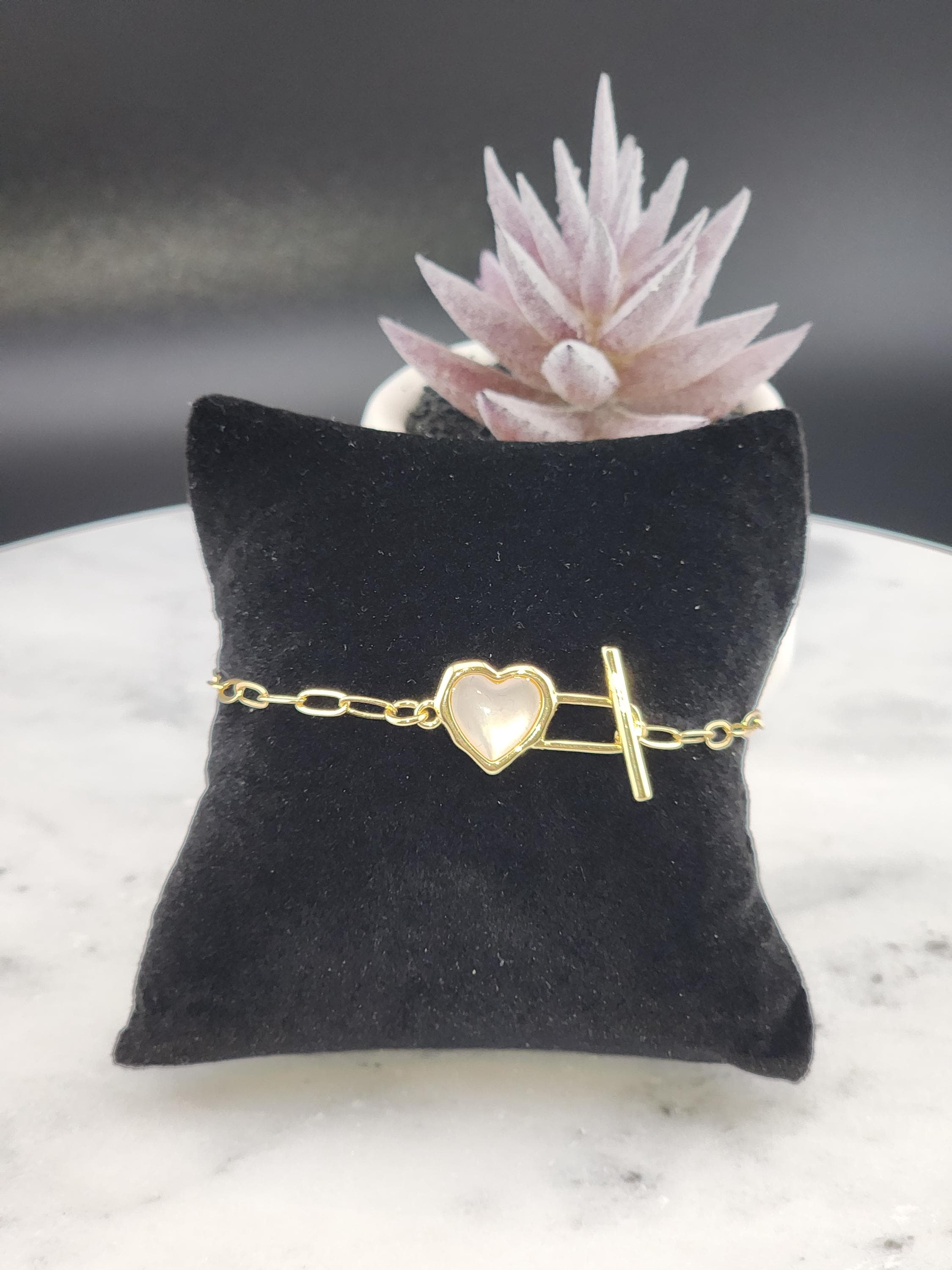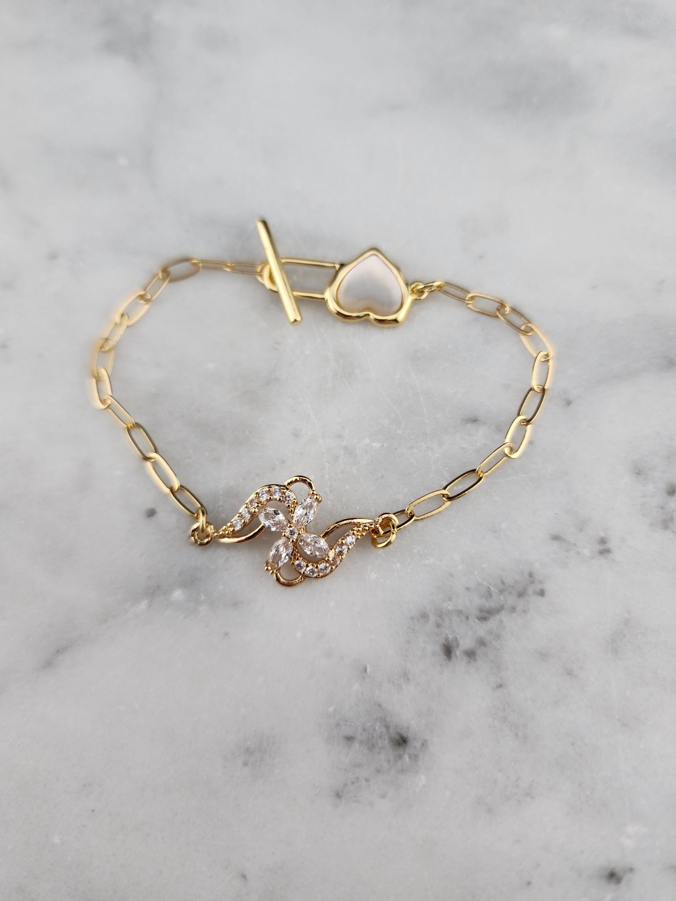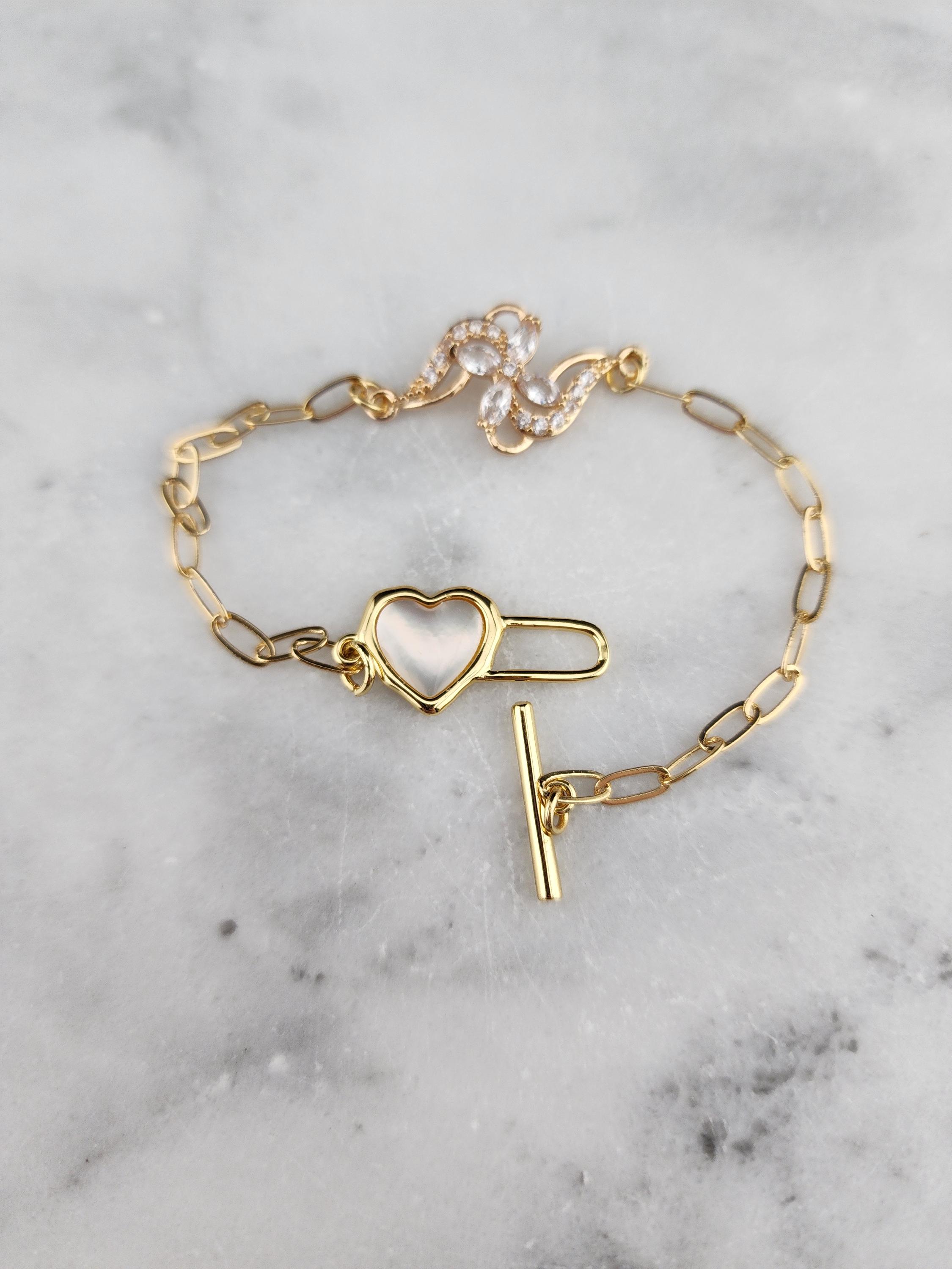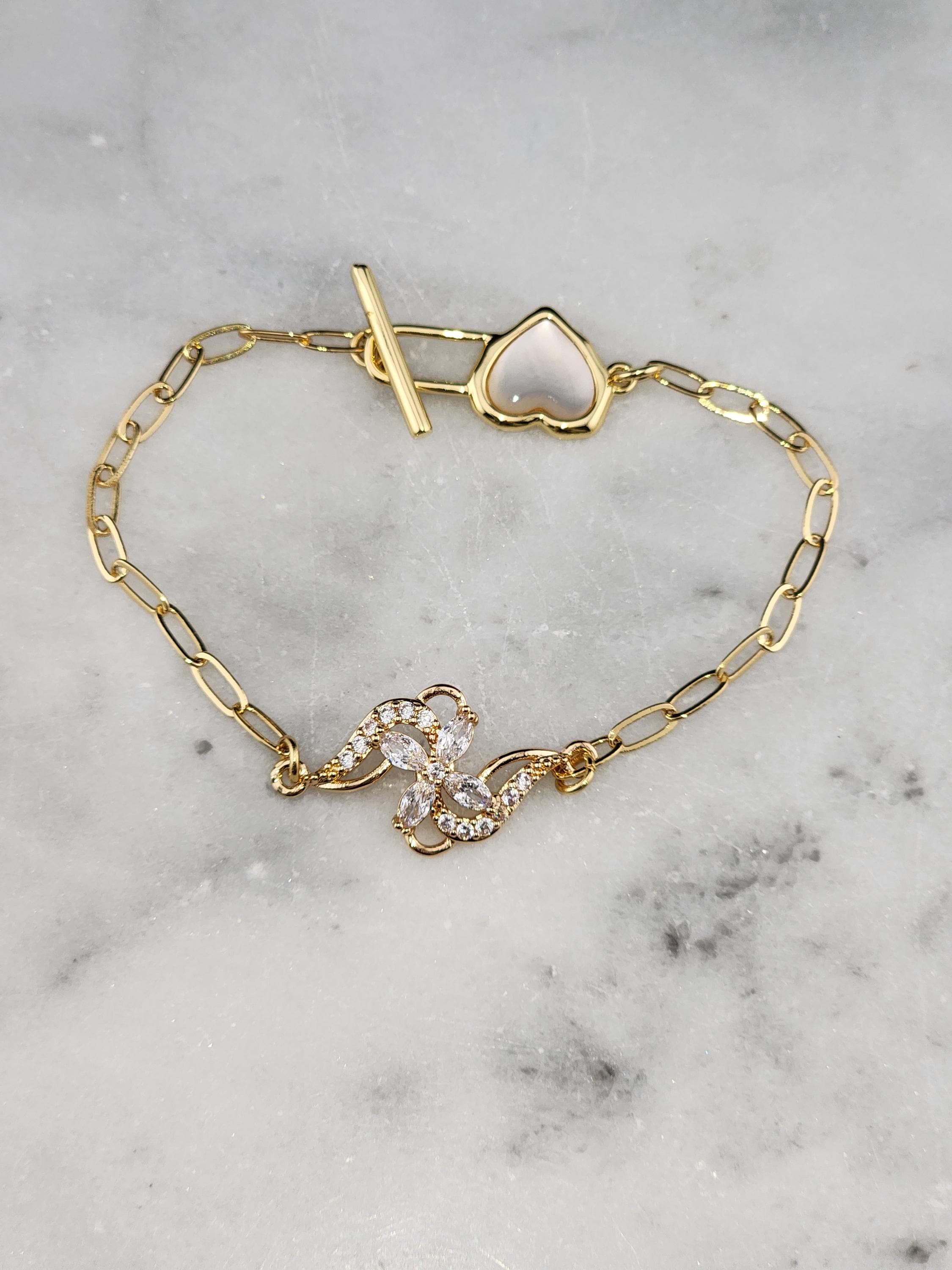 I made this bracelet using tarnish resistant 18k gold plated brass embossed gold chain that has a gold brass flower connector with cubic zirconia crystal petals. It has a gold heart toggle clasp filled with iridescent shell resin and 18k gold plated connecting rings. (Message me with the length you prefer) * Your purchase will arrive in pretty packaging