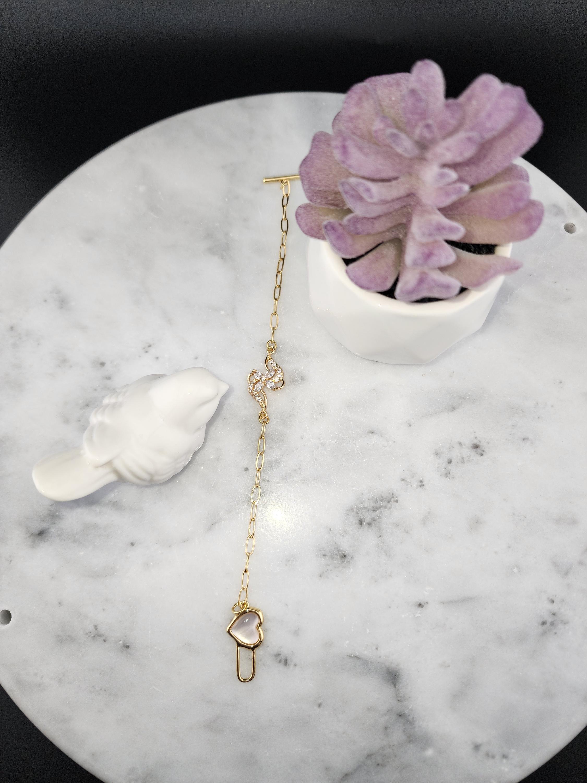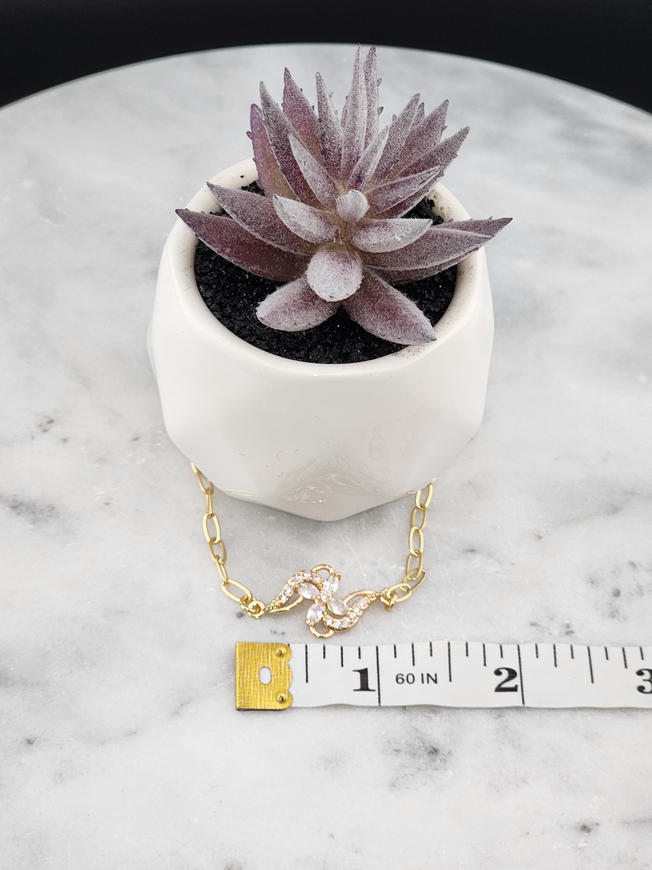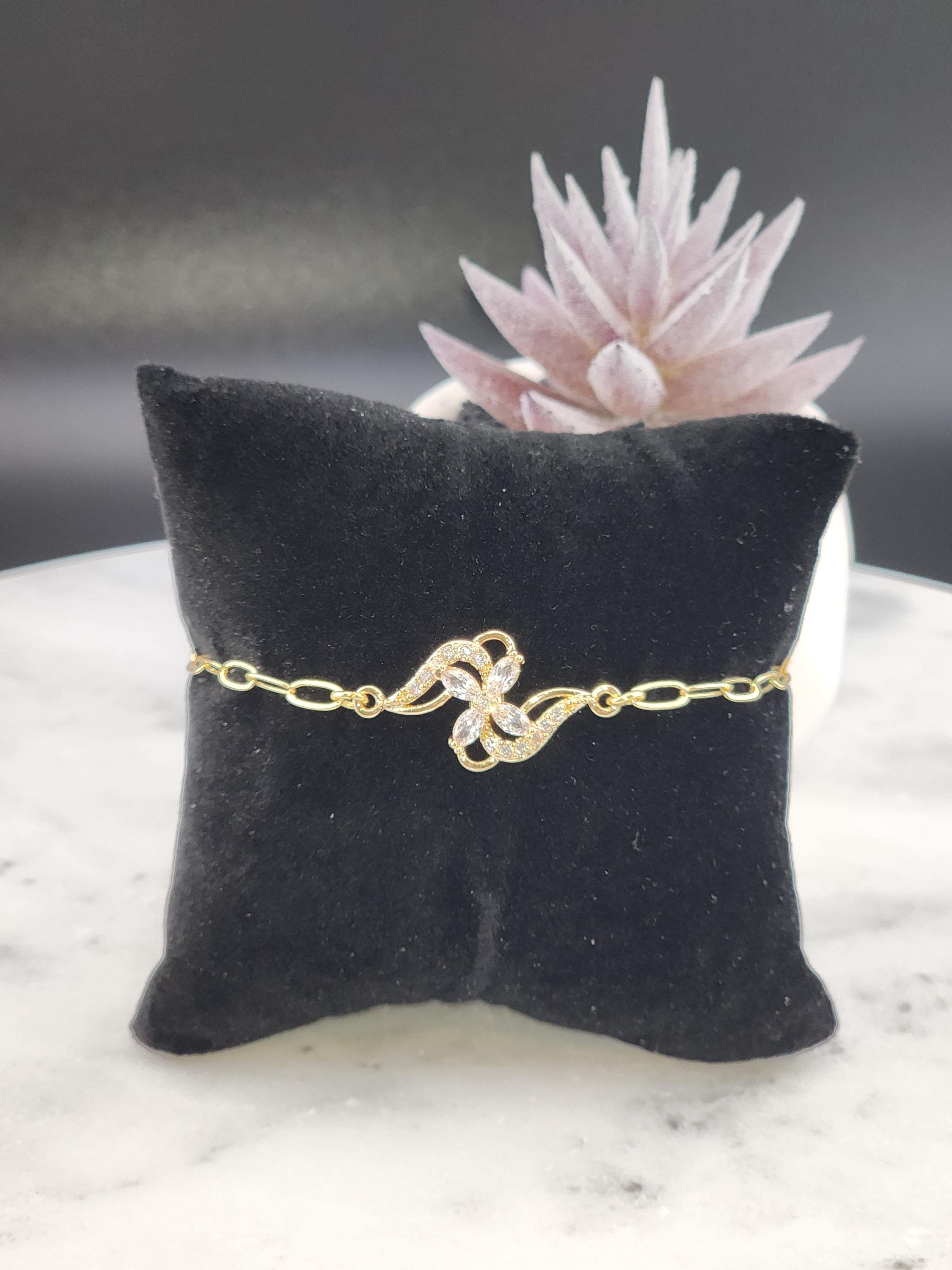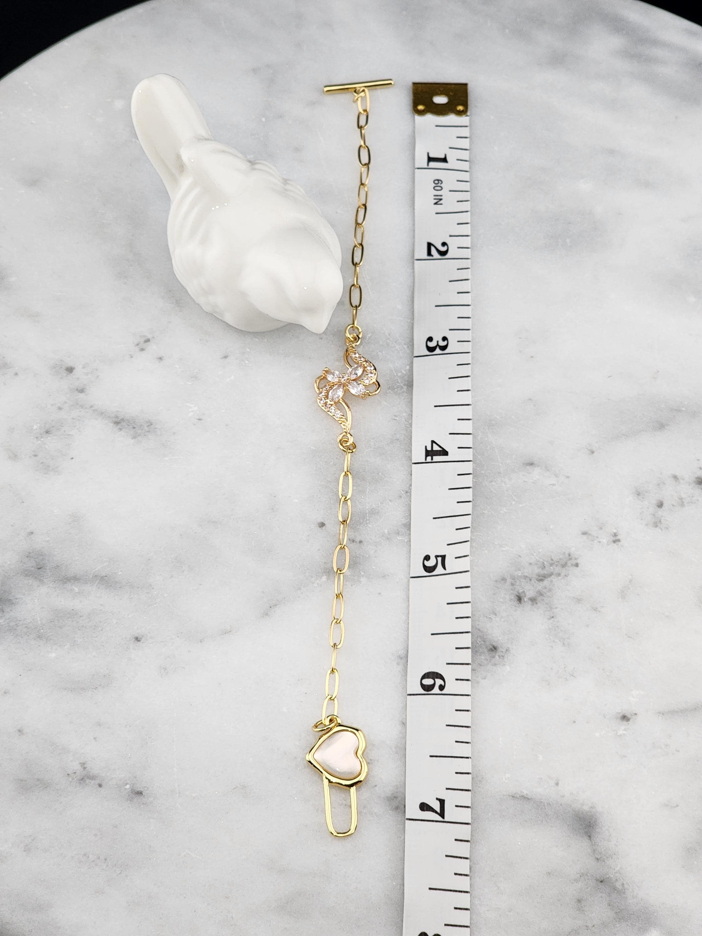 I made this bracelet using tarnish resistant 18k gold plated brass embossed gold chain that has a gold brass flower connector with cubic zirconia crystal petals. It has a gold heart toggle clasp filled with iridescent shell resin and 18k gold plated connecting rings. (Message me with the length you prefer) * Your purchase will arrive in pretty packaging