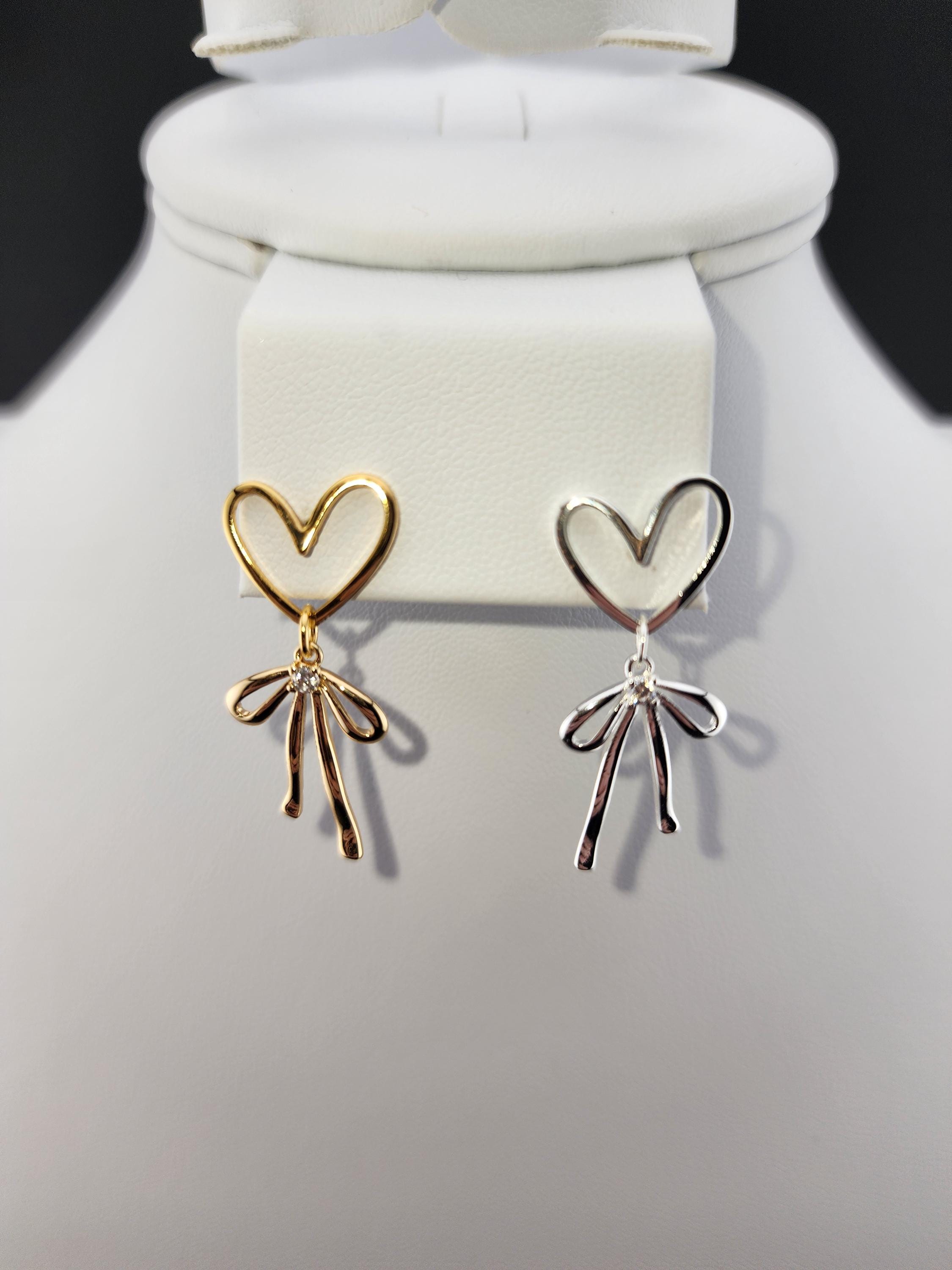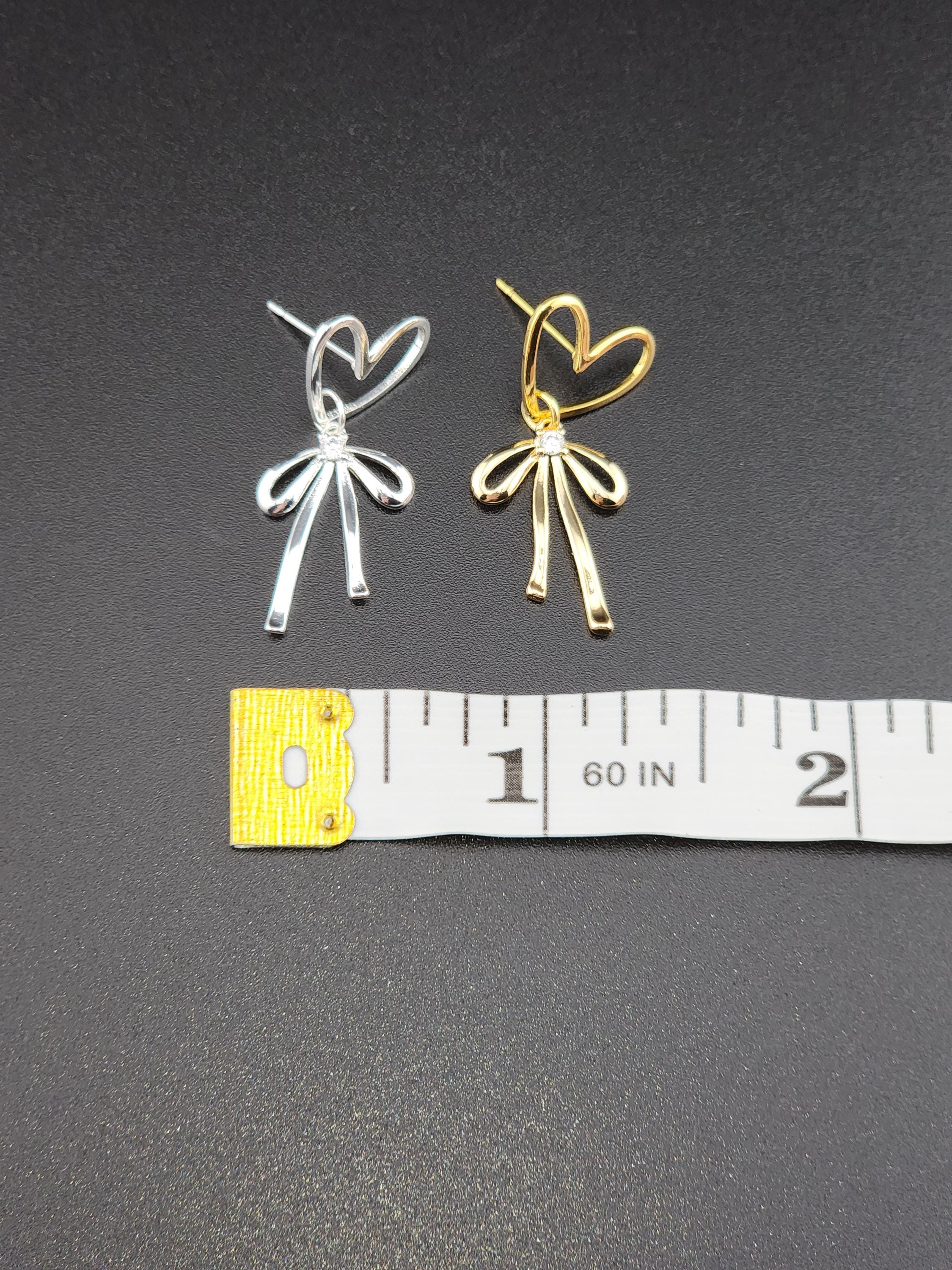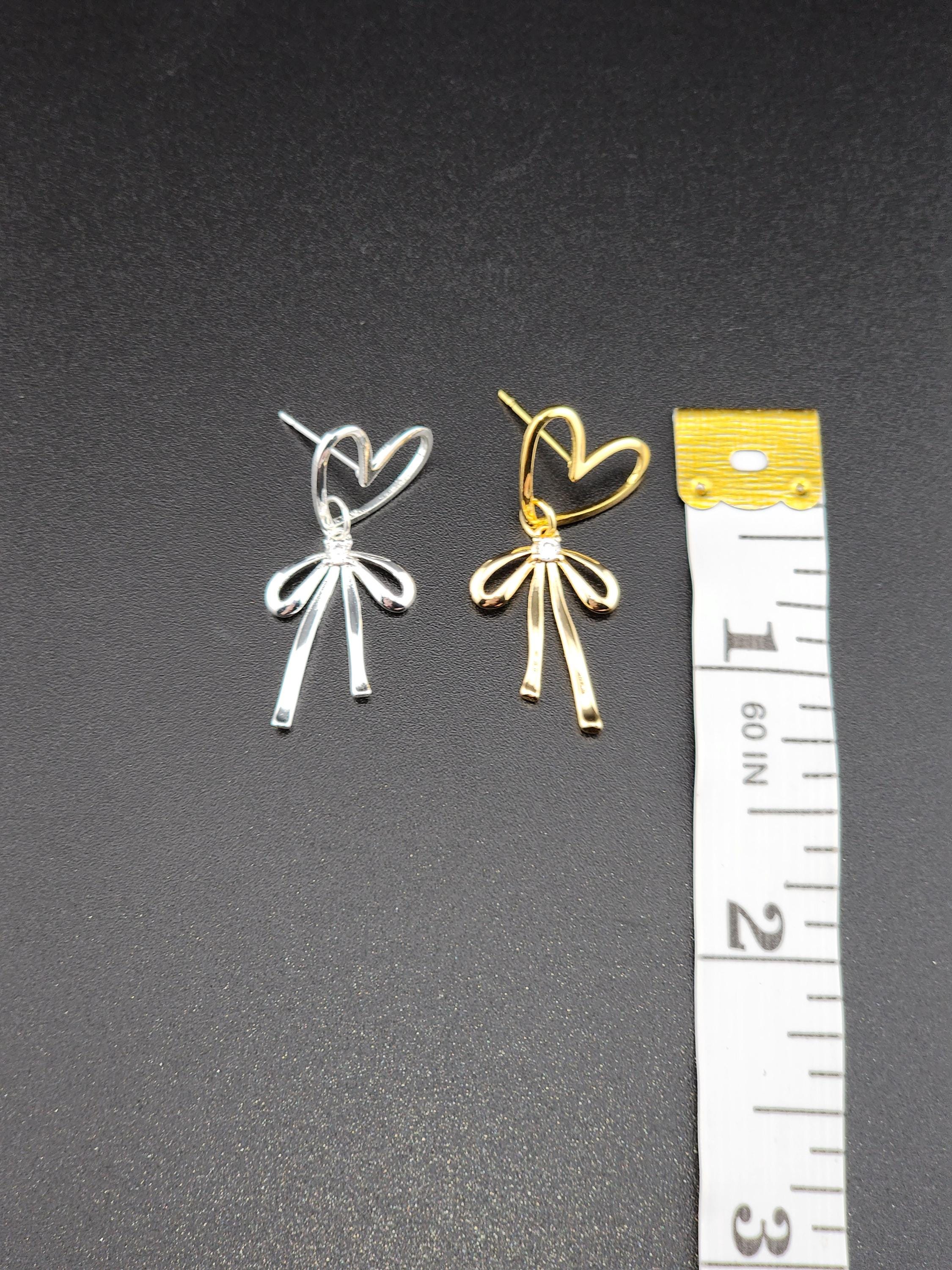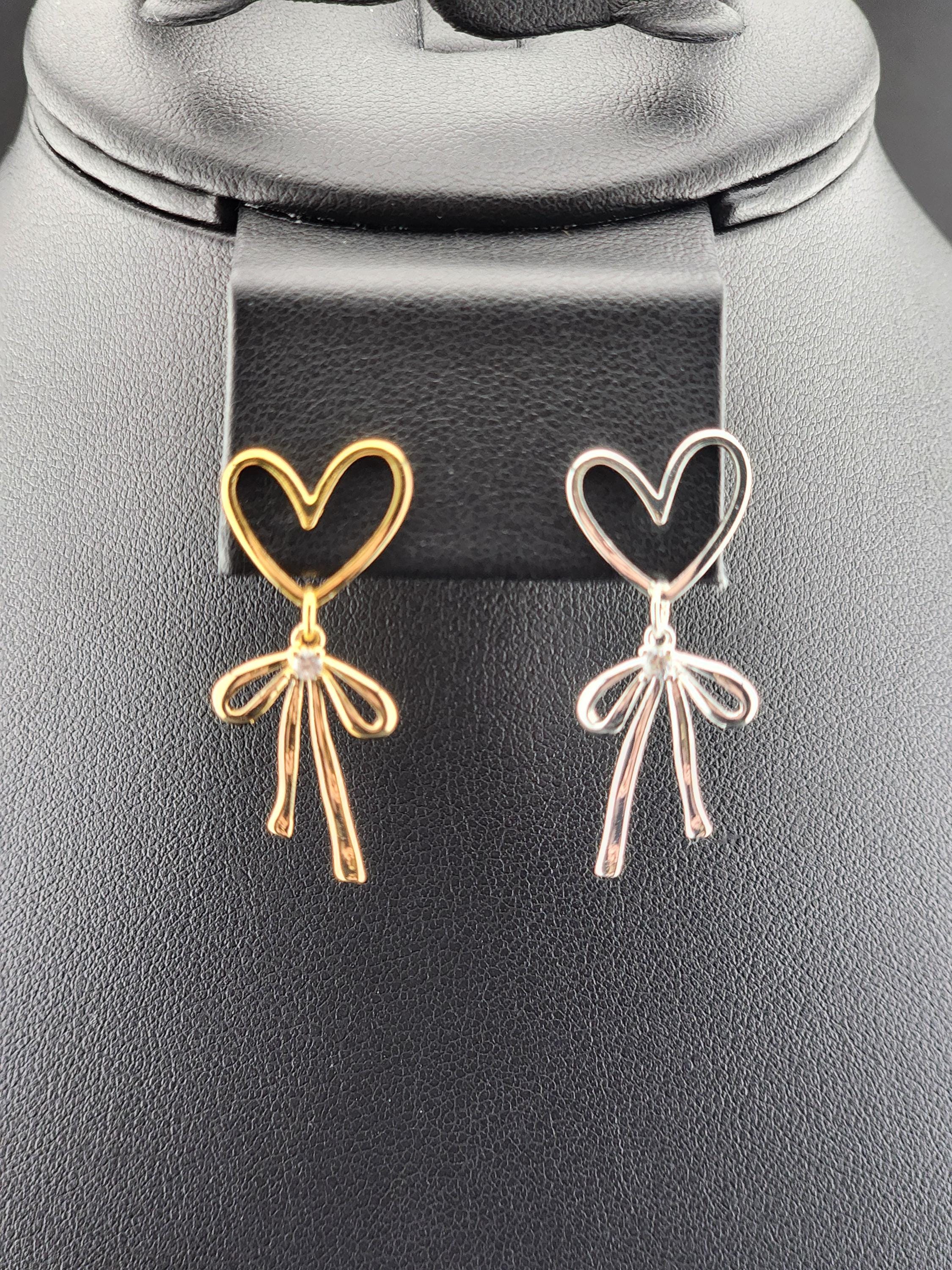 #1- 24k gold plated brass hollow heart stud earrings with 18k gold plated brass bow charms that have a small cubic zirconia crystal in the knot of each. They hang from 18k gold plated connecting rings. #2- Sterling silver plated brass hollow heart stud earrings with platinum plated brass bow charms that have a small cubic zirconia crystal in the knot of each. They hang from sterling silver plated connecting rings. * Your purchase will arrive in pretty packaging.