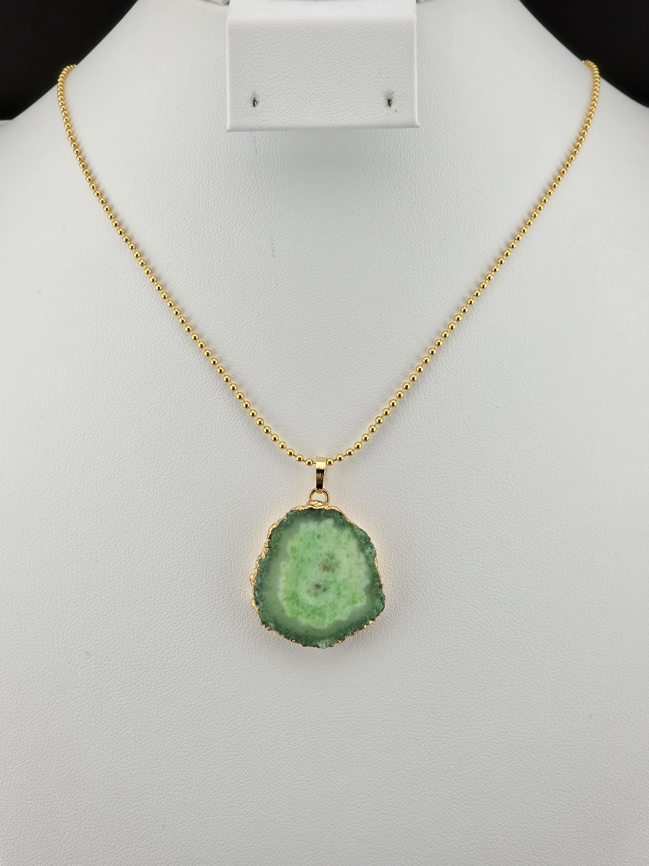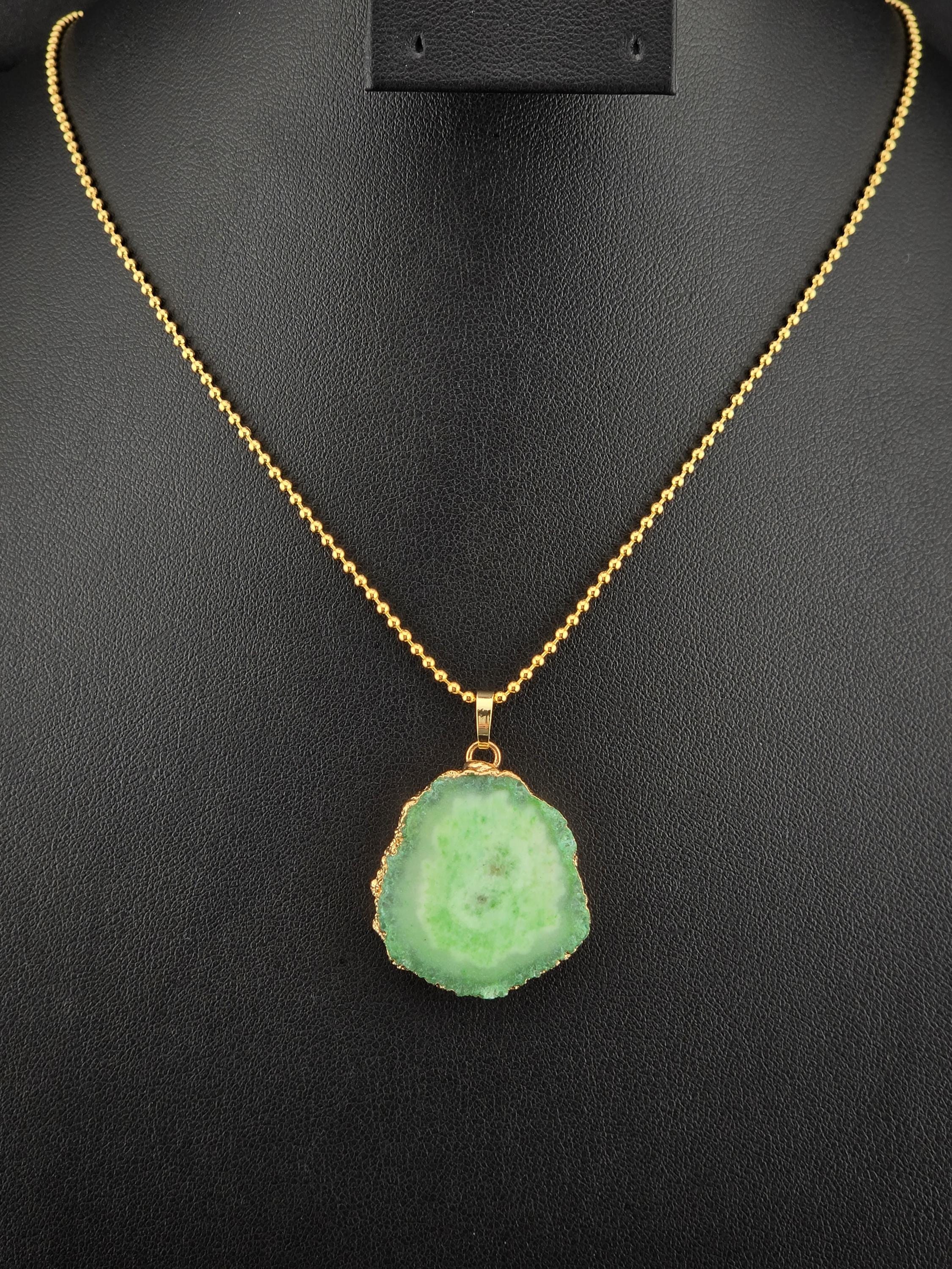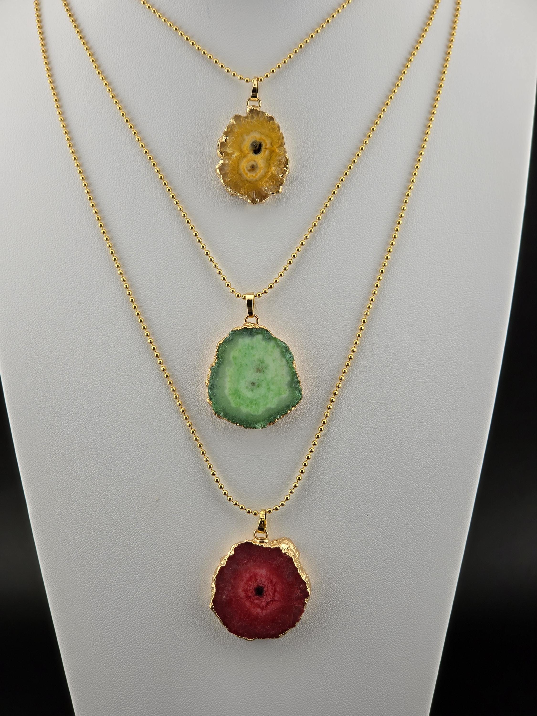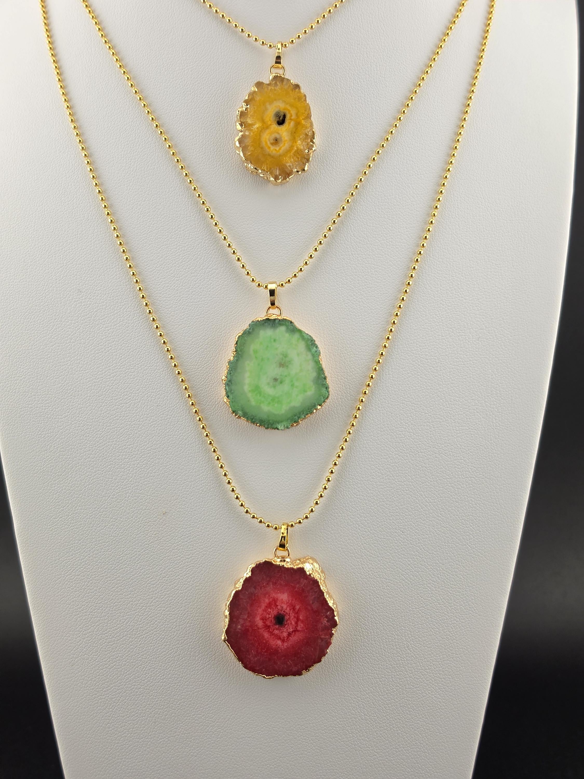 I made these 2 necklaces using tarnish resistant 18k gold plated brass dot chain with 18k gold plated connecting rings. They have extenders making them adjustable from 19 1/2" to 22" in length. The pendants are organically shape quartz slices wrapped in gold leaf and hang from a 18k gold plated bail. YOUR CHOICES OF PENDANT ARE: #1- Yellow #2- Green #3- Rose Red * Your purchase will arrive in pretty packaging