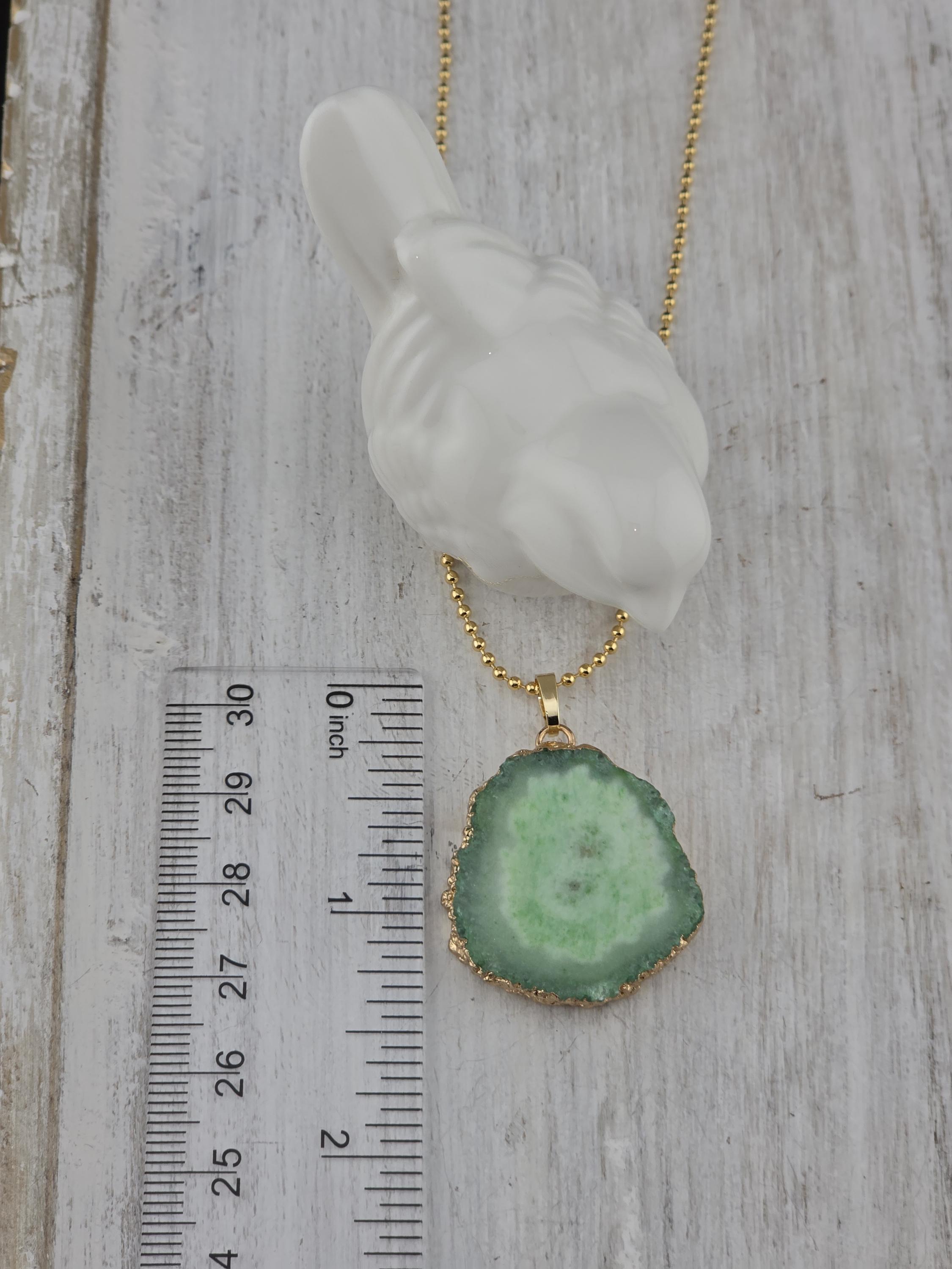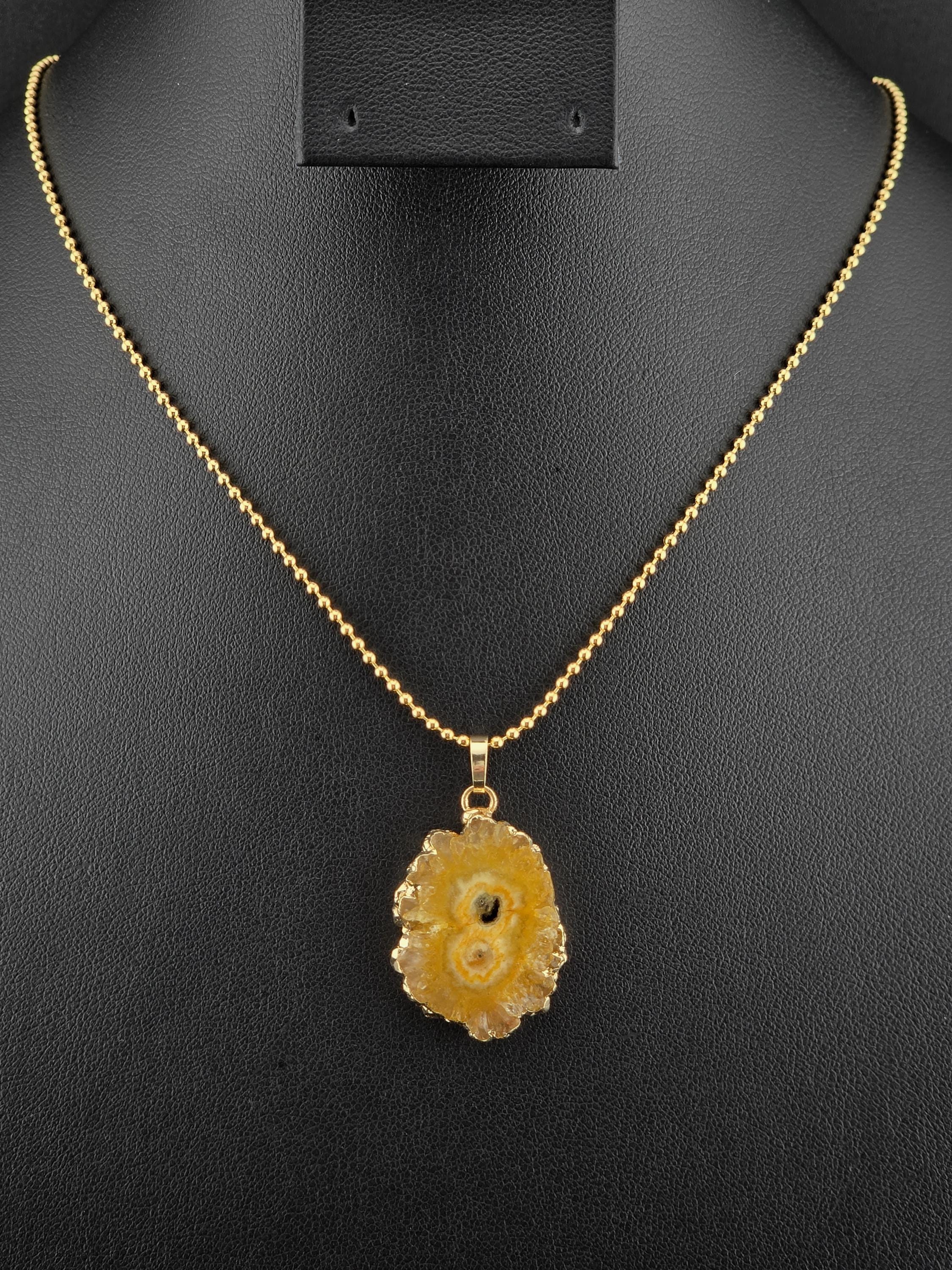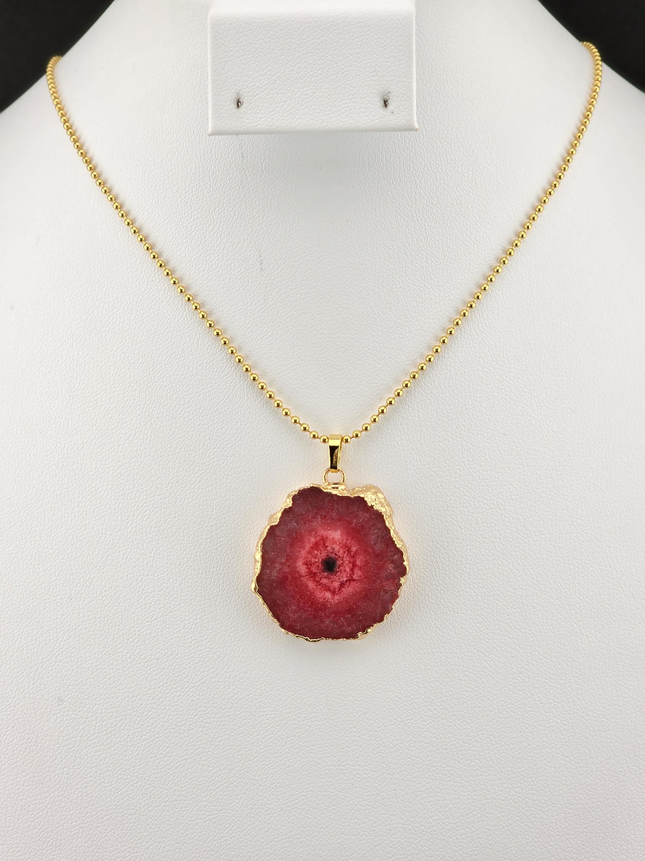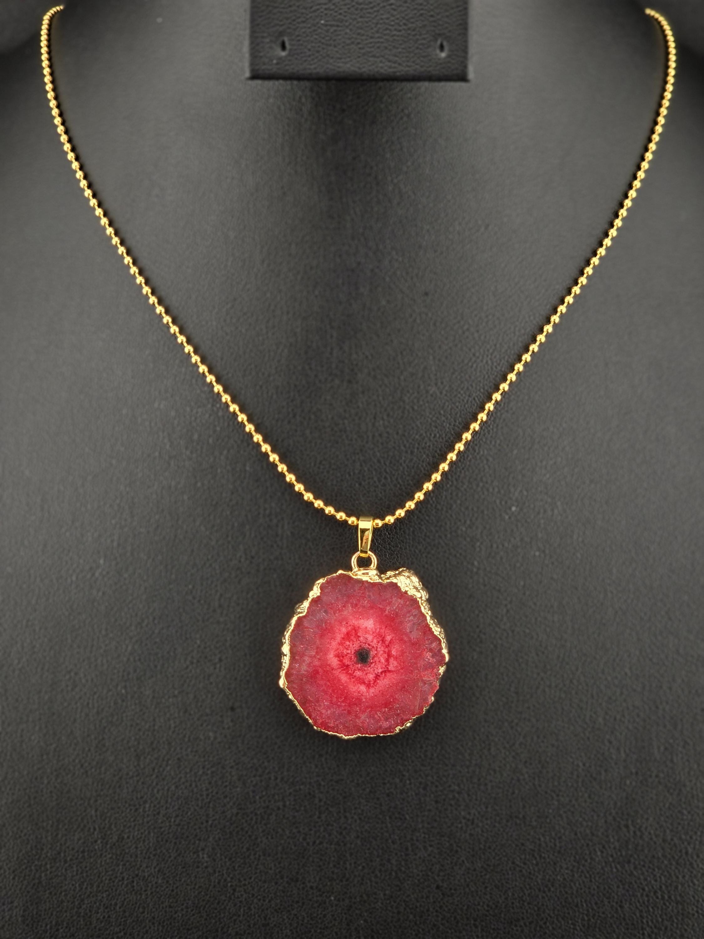 I made these 2 necklaces using tarnish resistant 18k gold plated brass dot chain with 18k gold plated connecting rings. They have extenders making them adjustable from 19 1/2" to 22" in length. The pendants are organically shape quartz slices wrapped in gold leaf and hang from a 18k gold plated bail. YOUR CHOICES OF PENDANT ARE: #1- Yellow #2- Green #3- Rose Red * Your purchase will arrive in pretty packaging