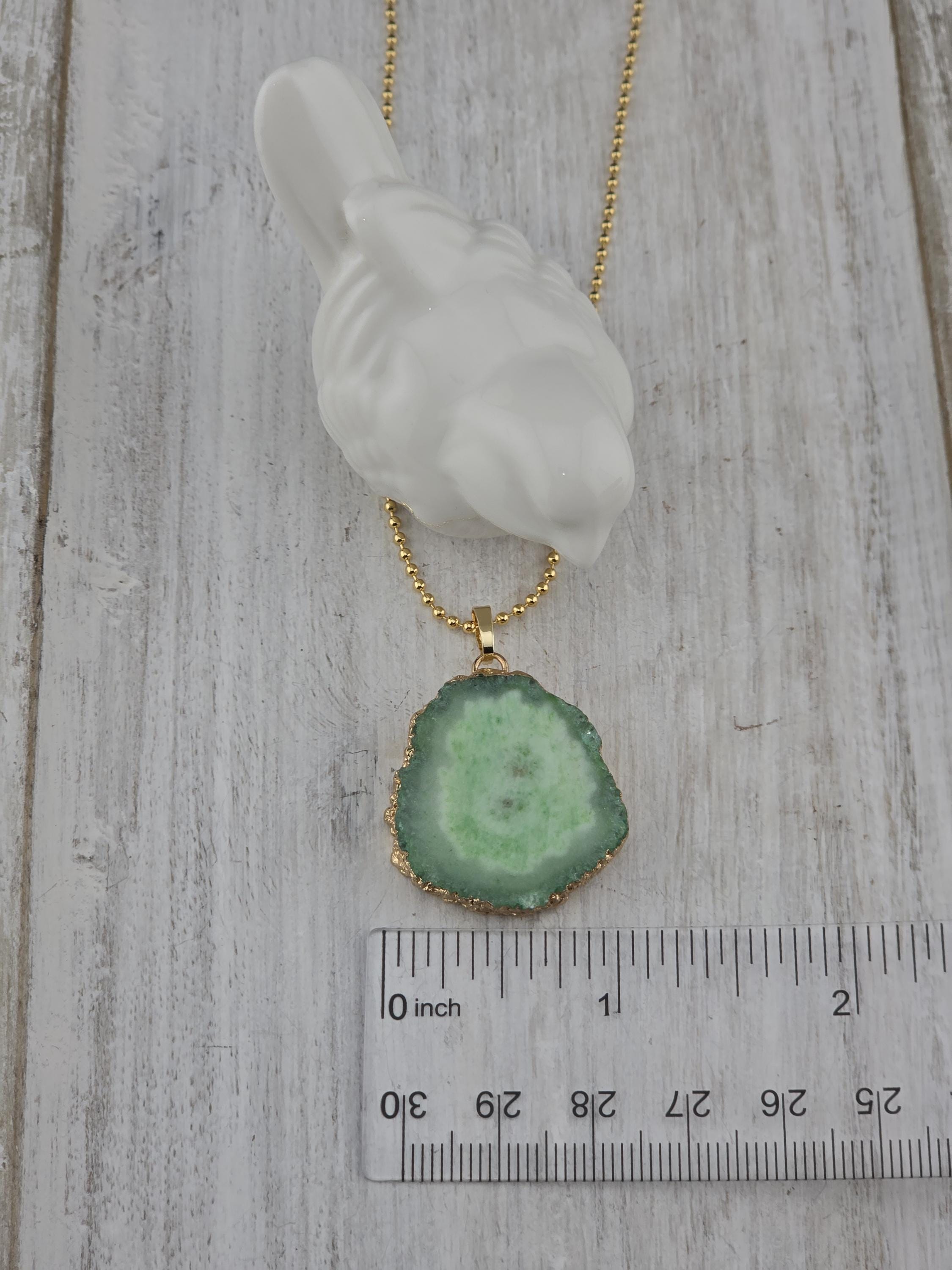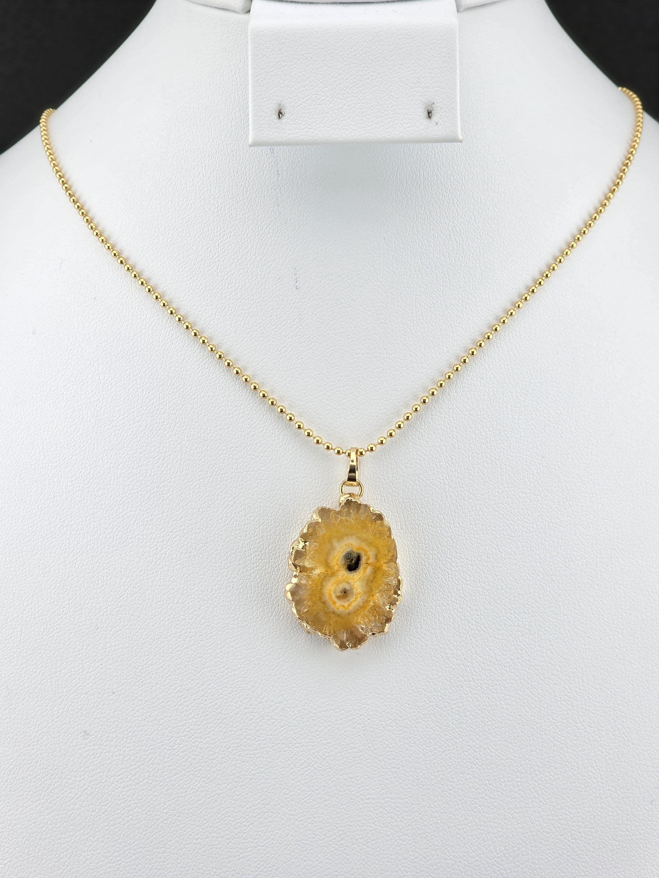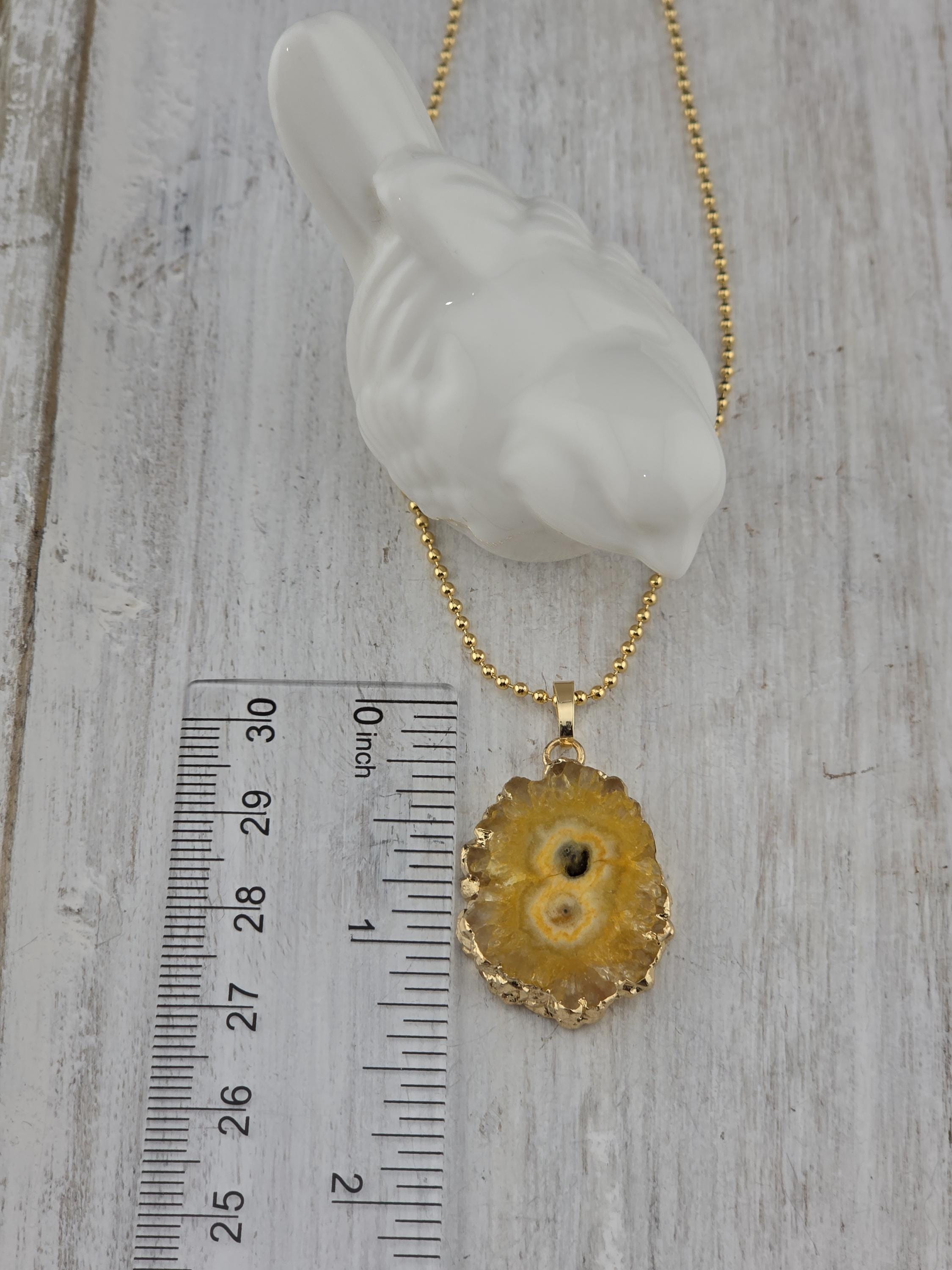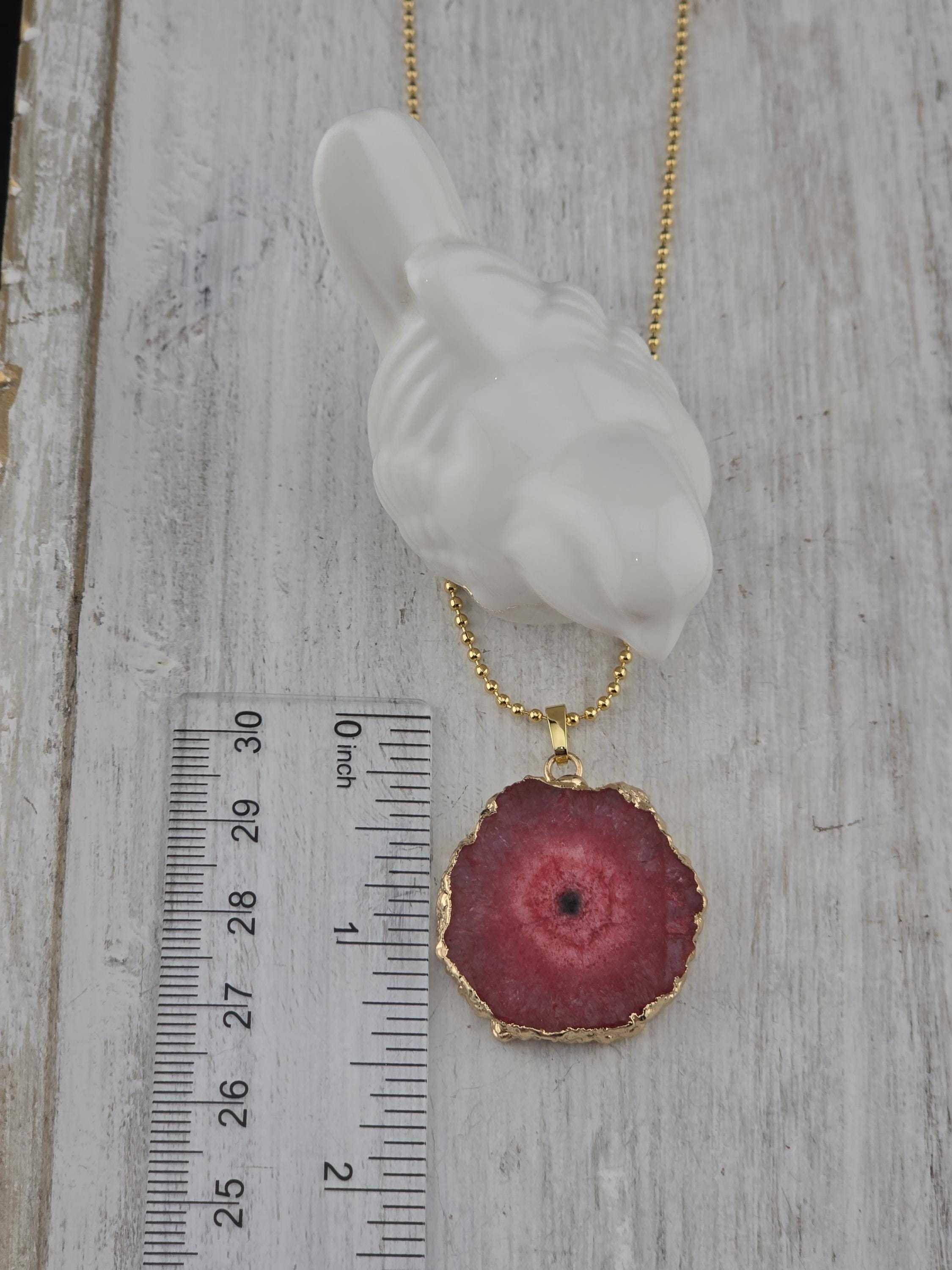 I made these 2 necklaces using tarnish resistant 18k gold plated brass dot chain with 18k gold plated connecting rings. They have extenders making them adjustable from 19 1/2" to 22" in length. The pendants are organically shape quartz slices wrapped in gold leaf and hang from a 18k gold plated bail. YOUR CHOICES OF PENDANT ARE: #1- Yellow #2- Green #3- Rose Red * Your purchase will arrive in pretty packaging