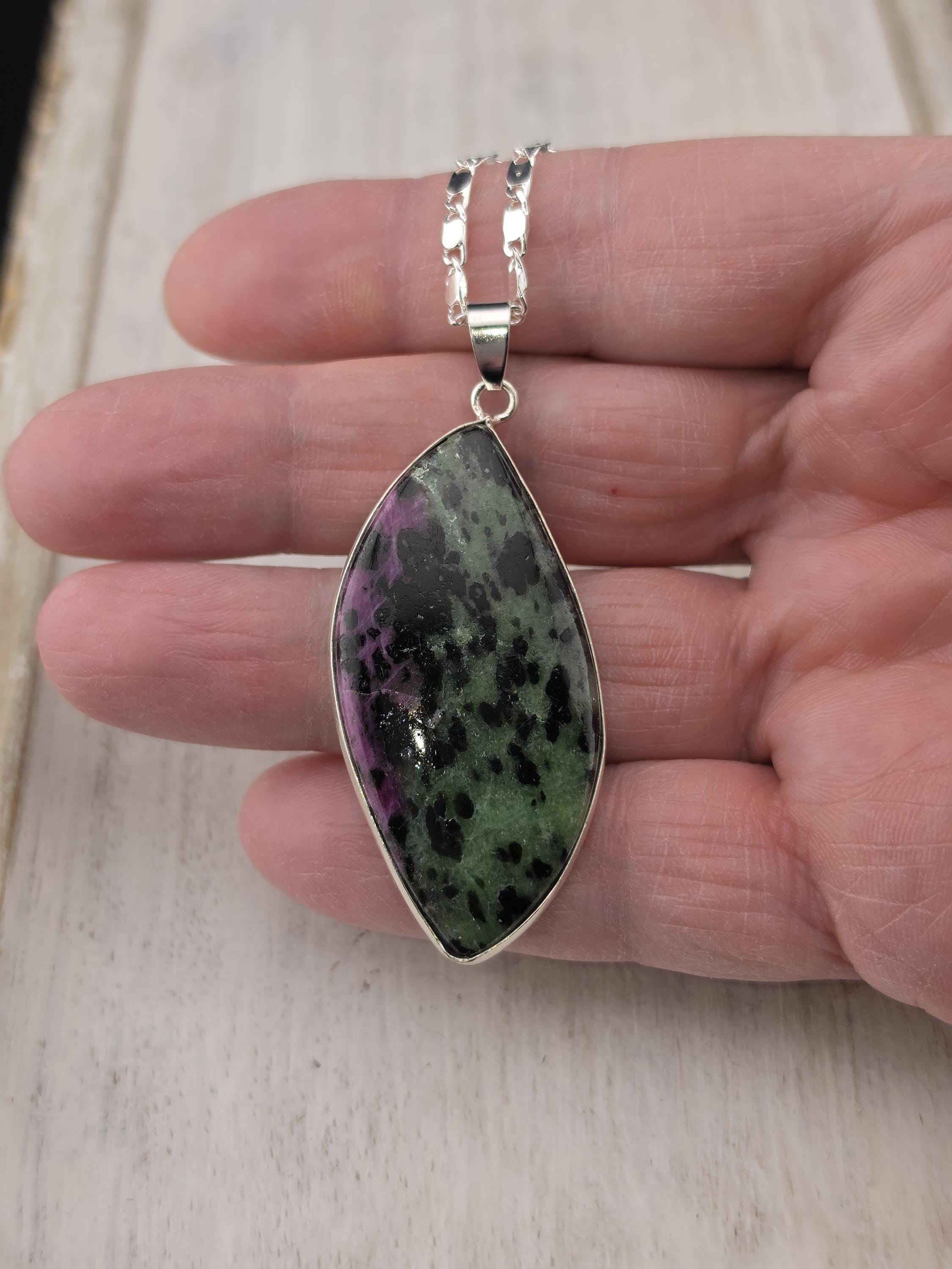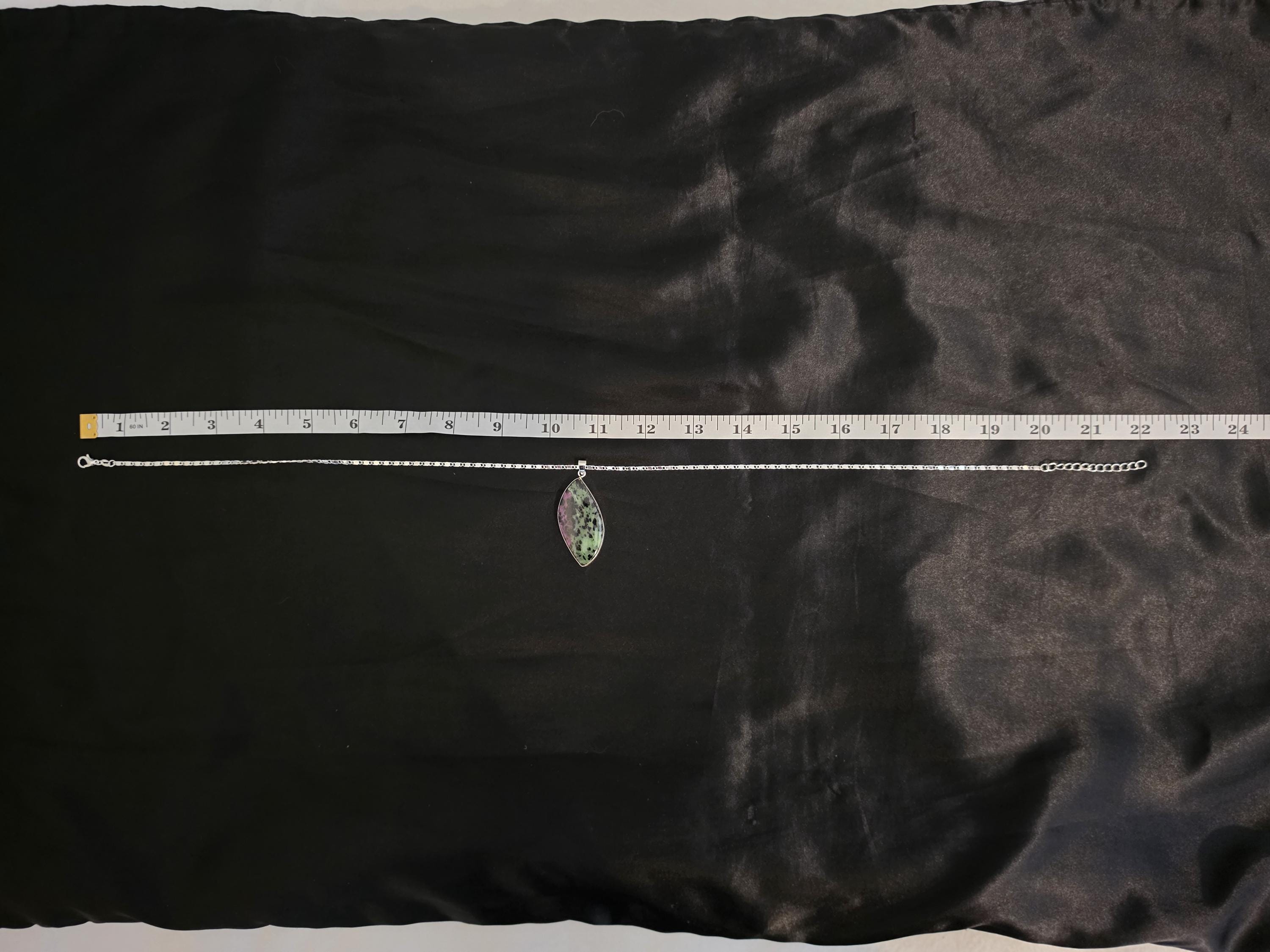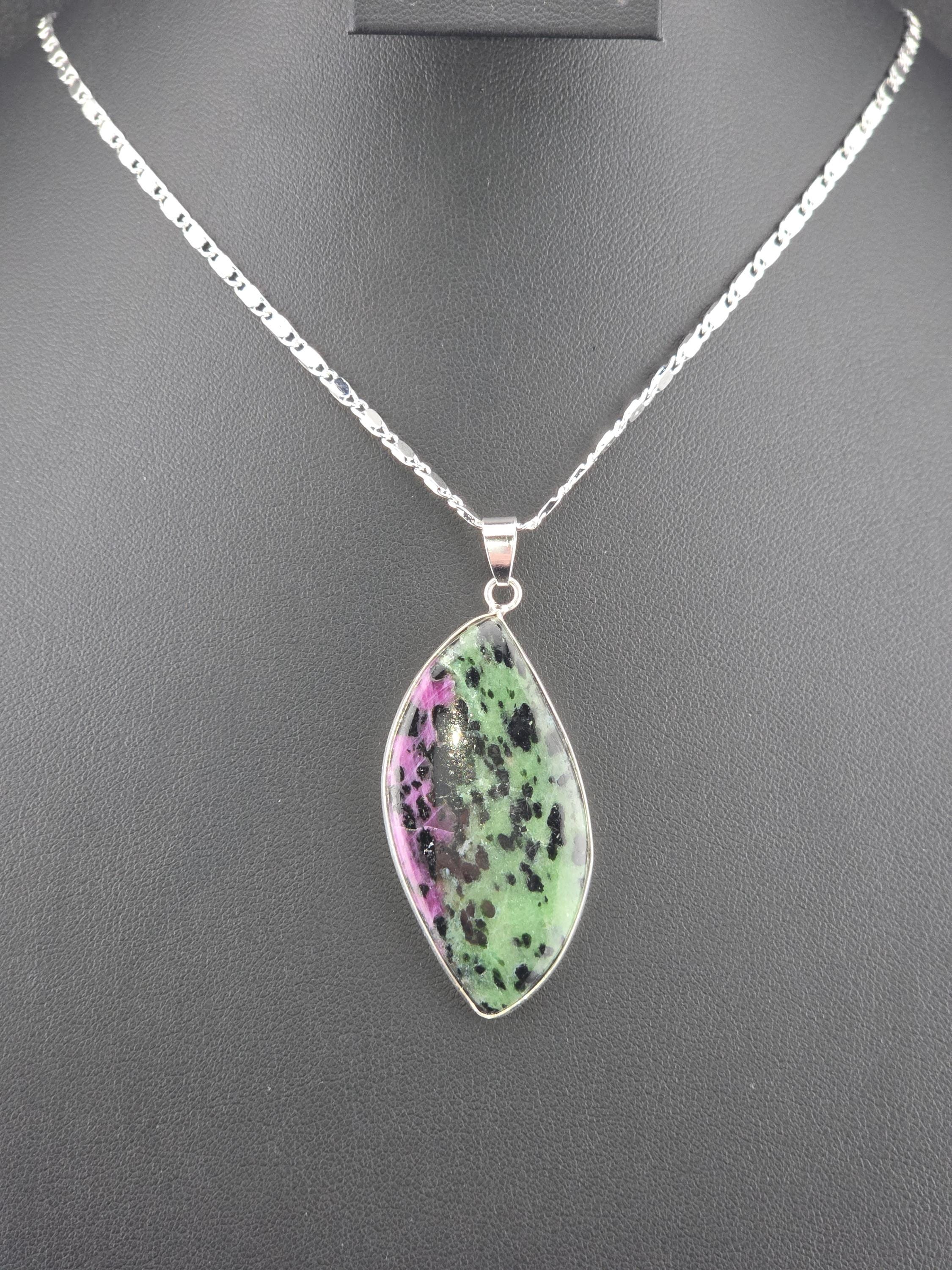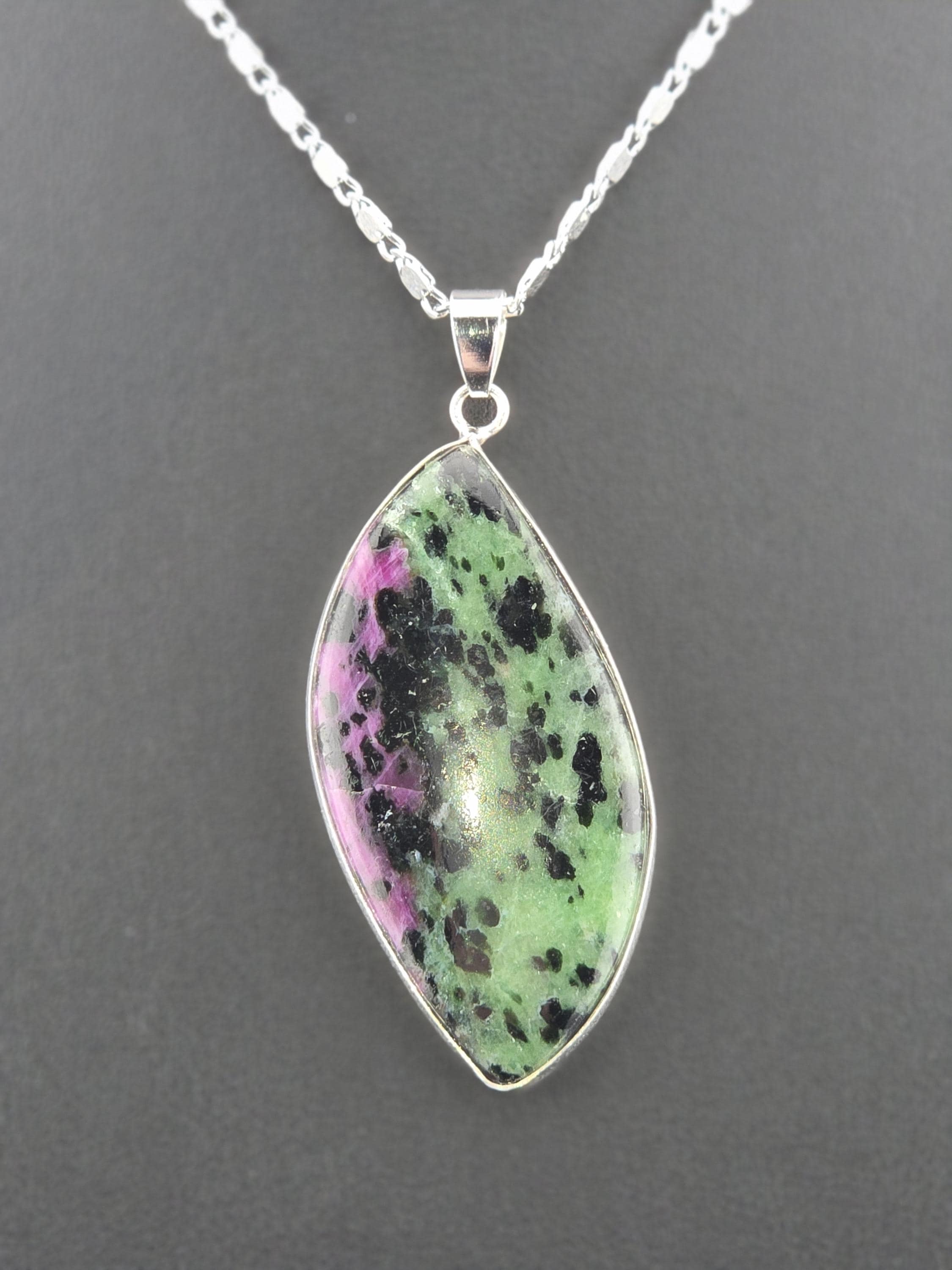 I made these necklaces using bright & shiny 925 sterling silver plated flat link chain that have extenders making them adjustable from 20" to 22" in length. There are 3 natural gemstone pendants set in 925 sterling silver to choose from. YOUR CHOICES ARE: #1- Rosetta Rosarita - Oval shape #2- Ruby Zoisite - Wavy shape #3- Leopard skin jasper - Oval shape * Your purchase will arrive in pretty packaging