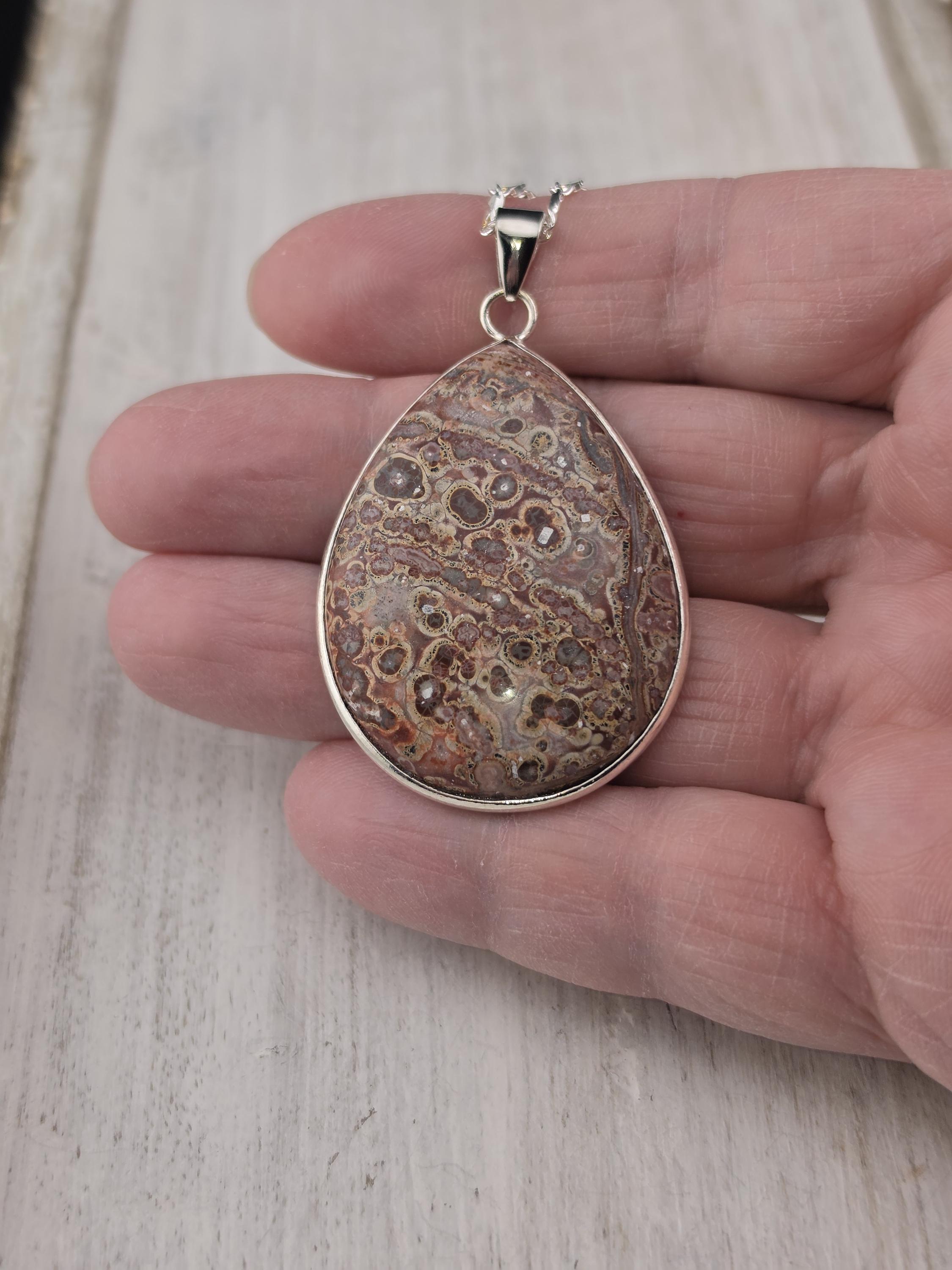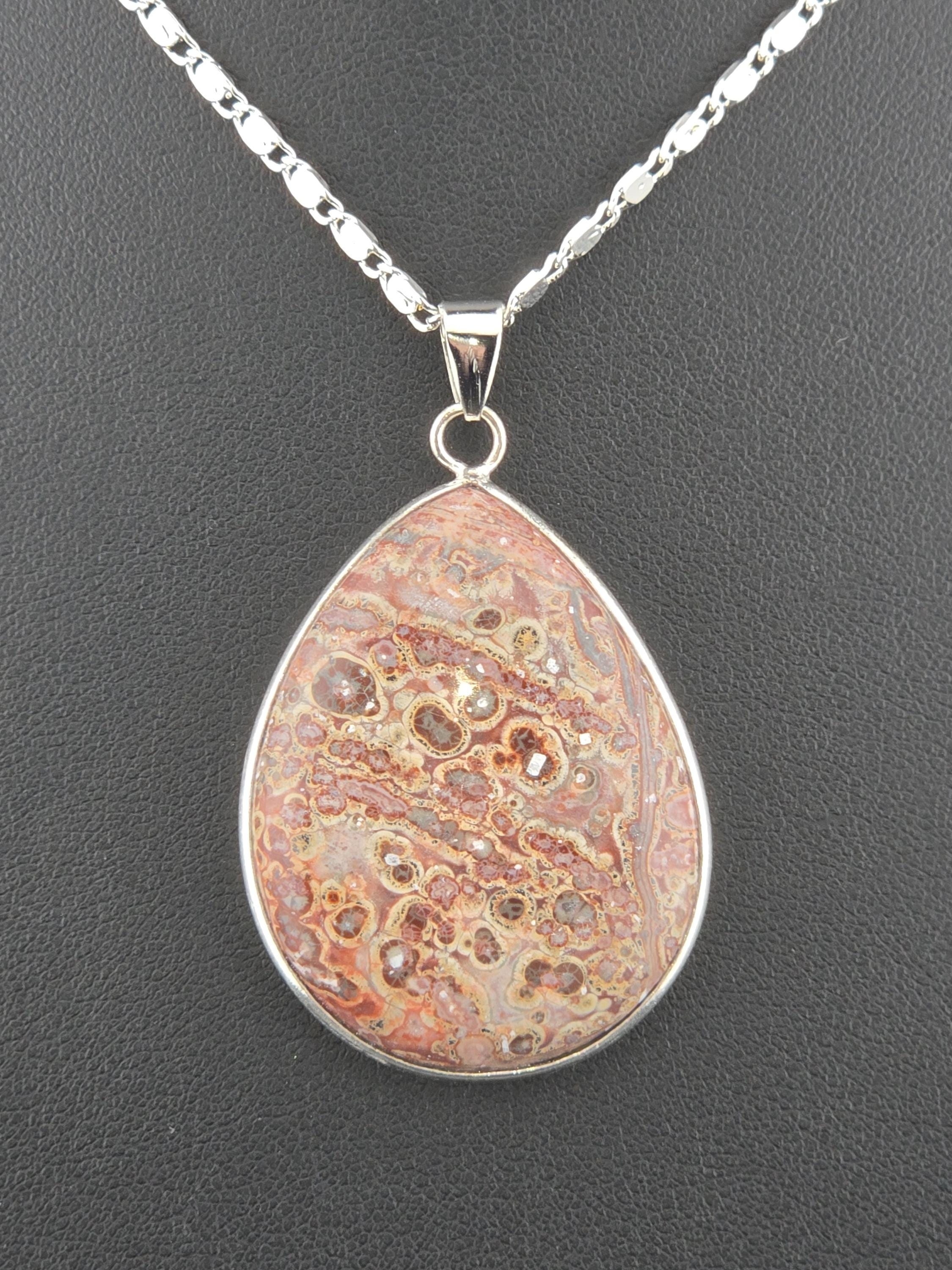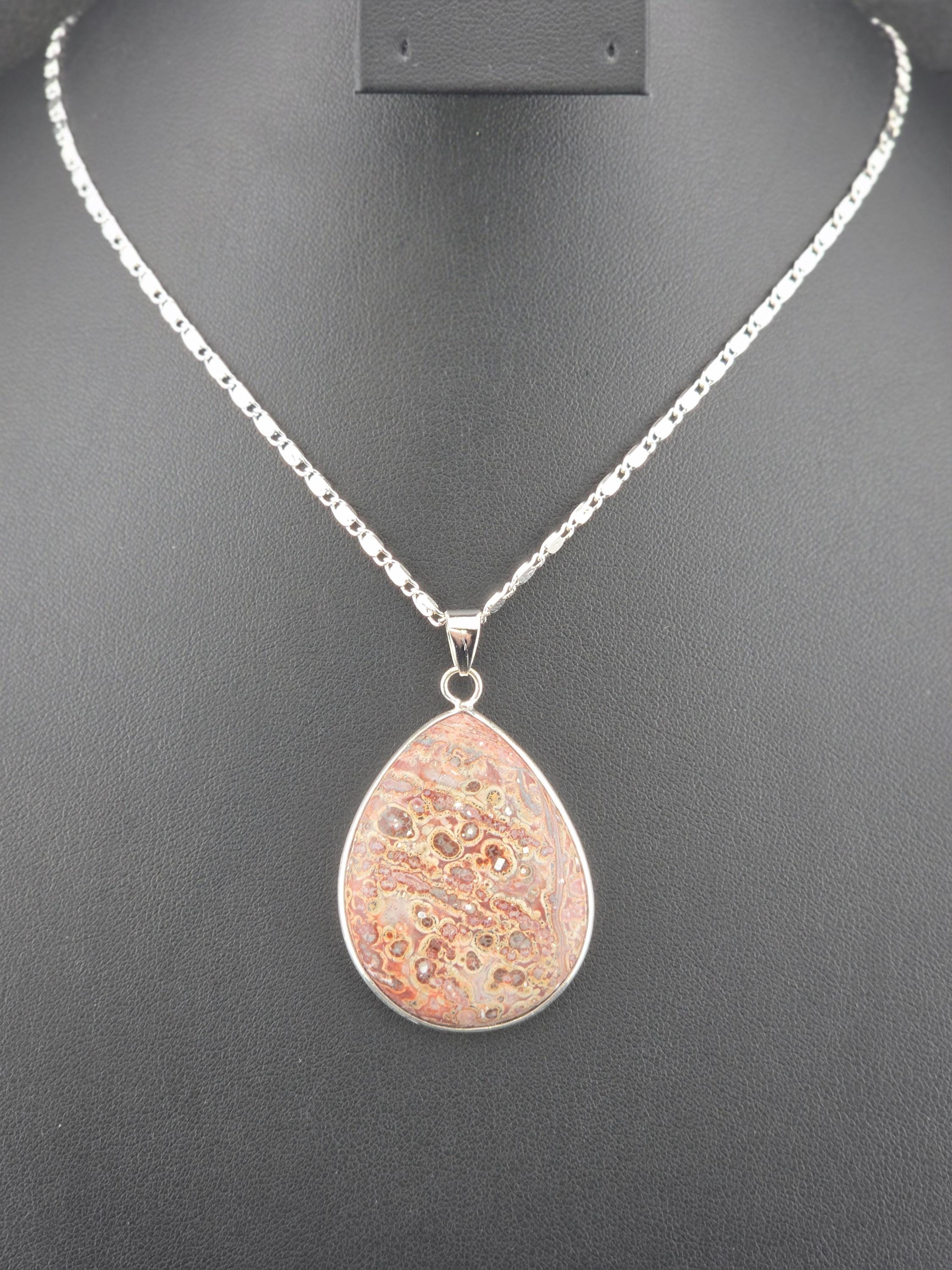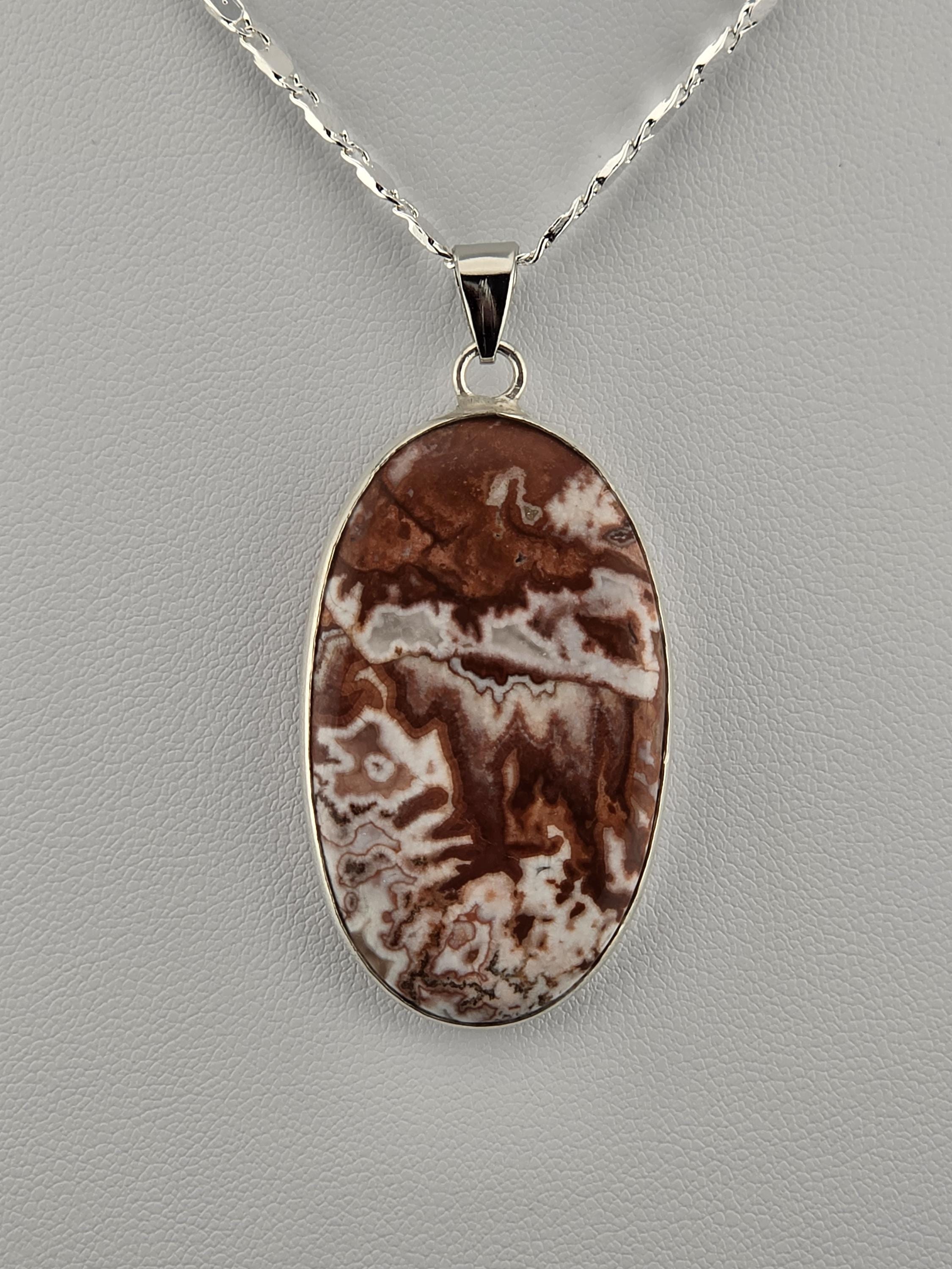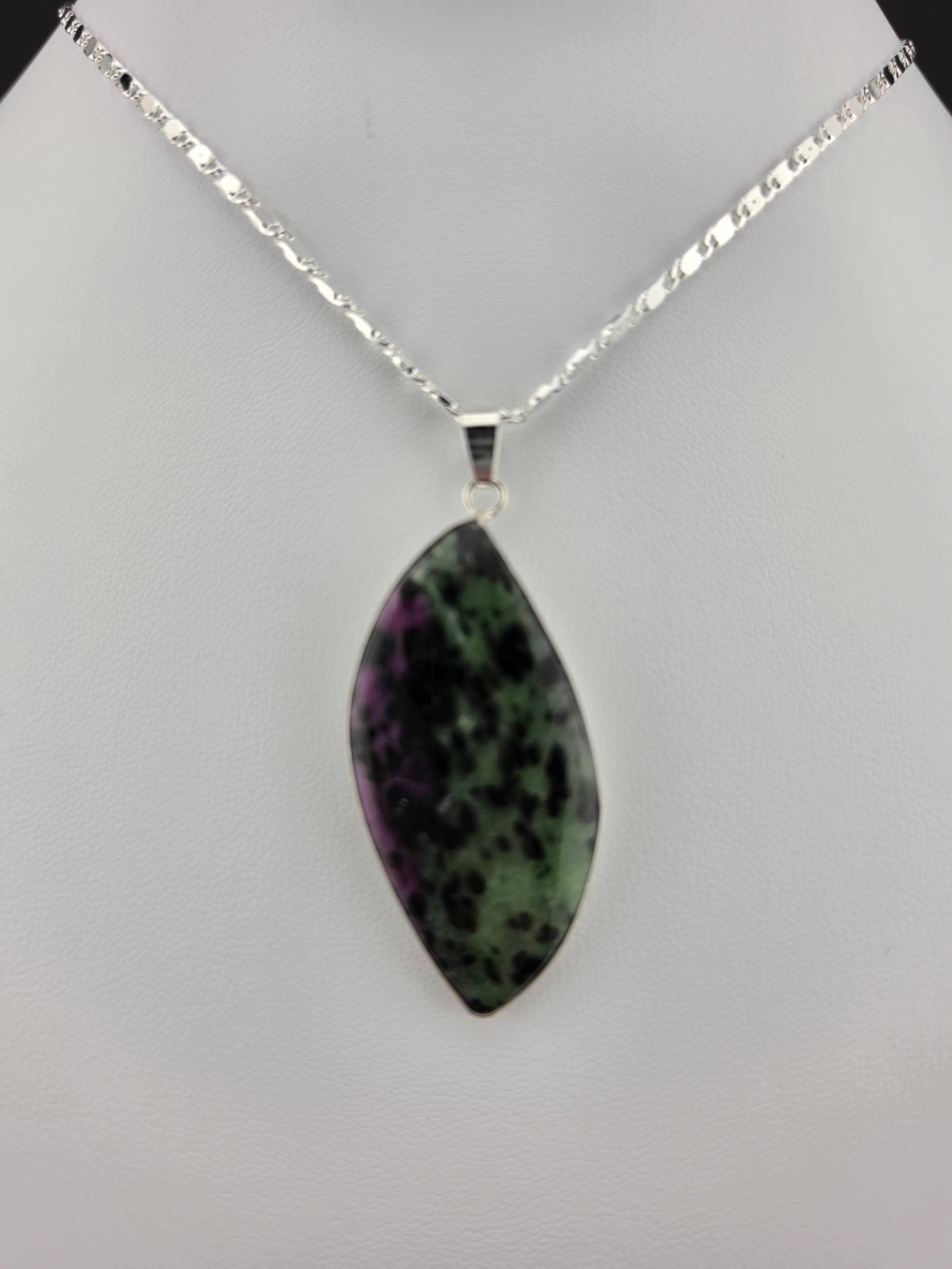 I made these necklaces using bright & shiny 925 sterling silver plated flat link chain that have extenders making them adjustable from 20" to 22" in length. There are 3 natural gemstone pendants set in 925 sterling silver to choose from. YOUR CHOICES ARE: #1- Rosetta Rosarita - Oval shape #2- Ruby Zoisite - Wavy shape #3- Leopard skin jasper - Oval shape * Your purchase will arrive in pretty packaging