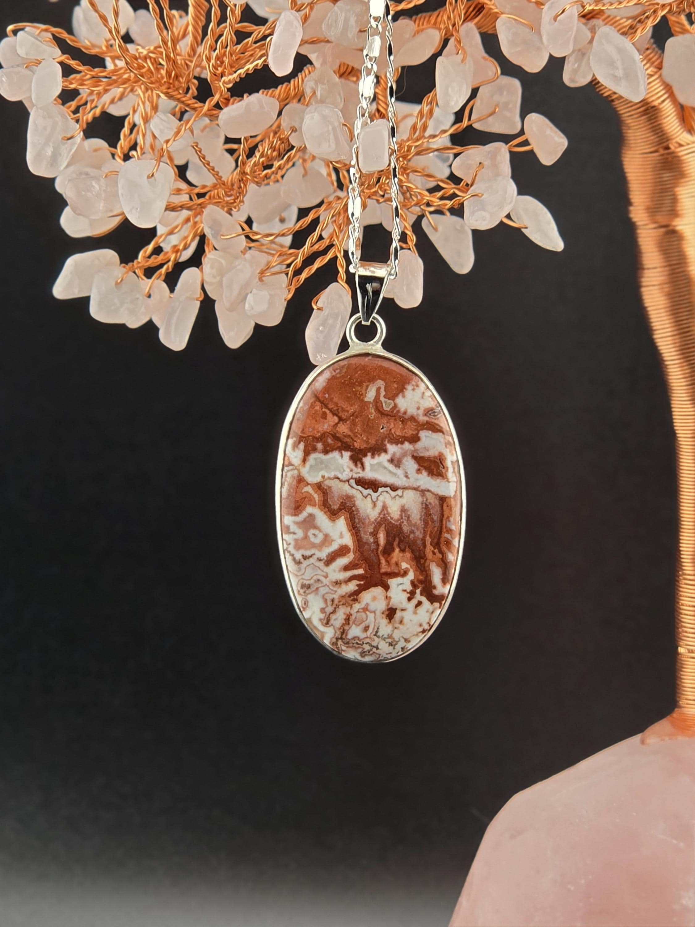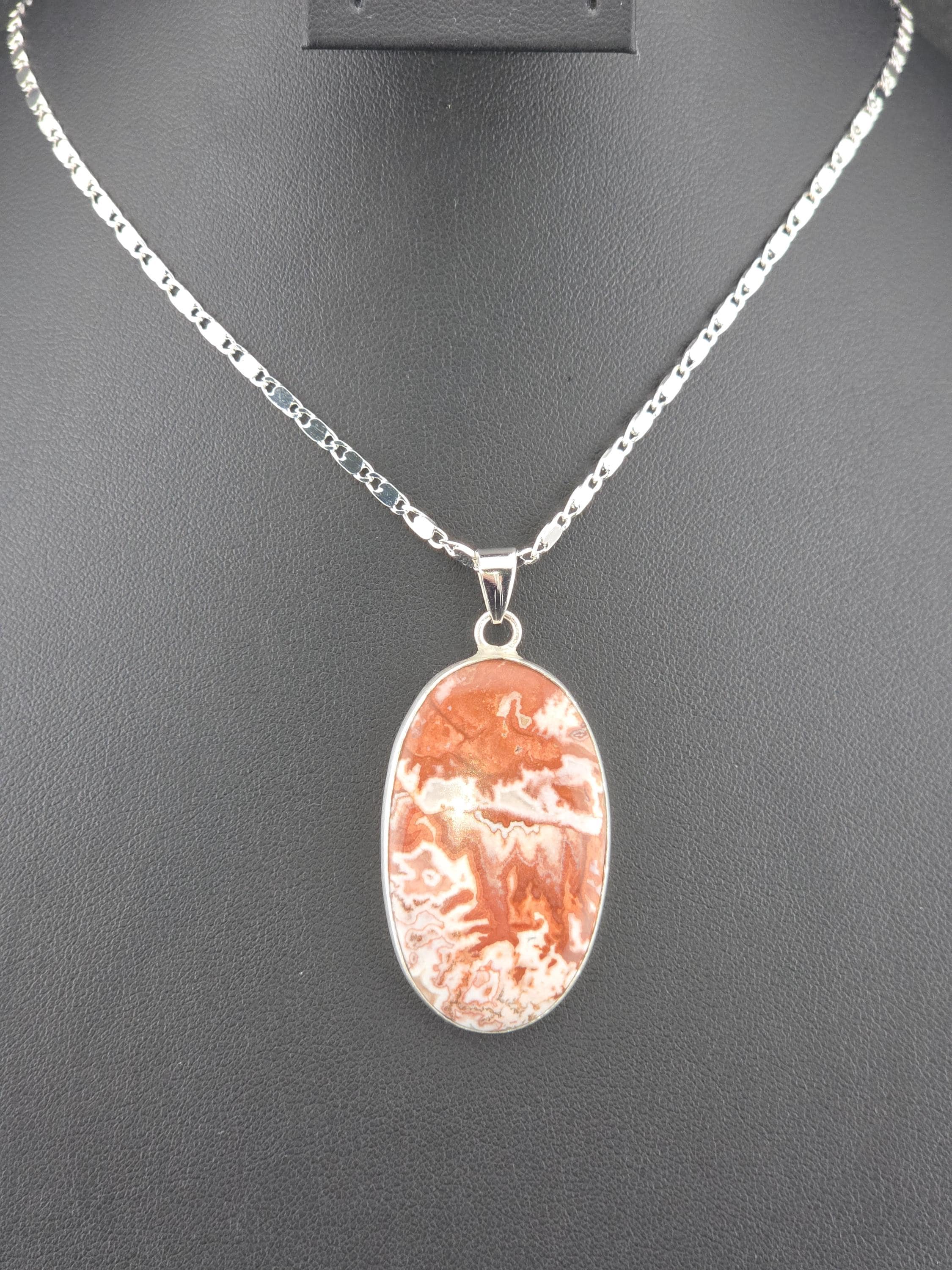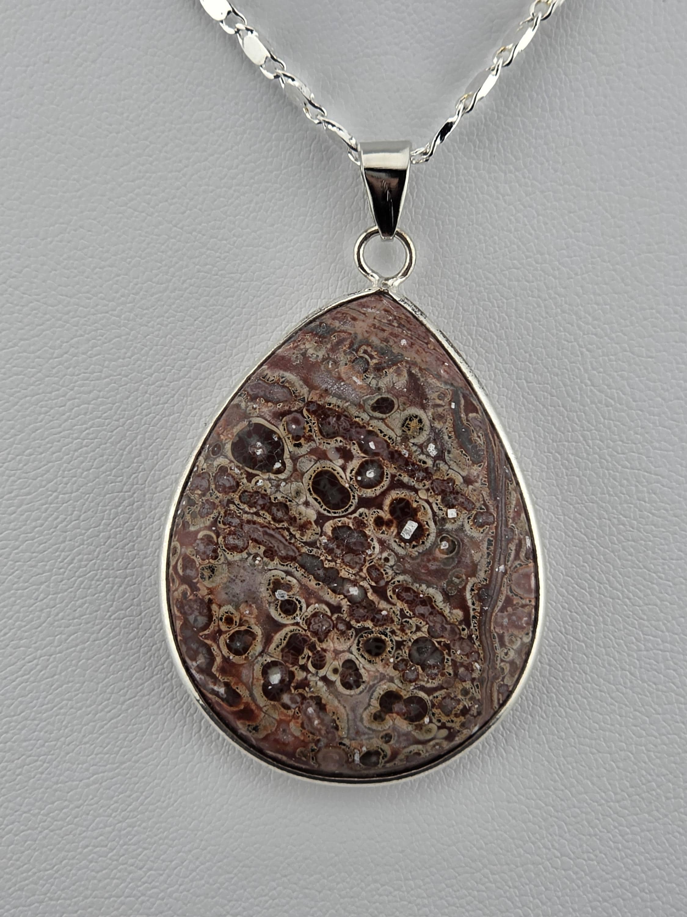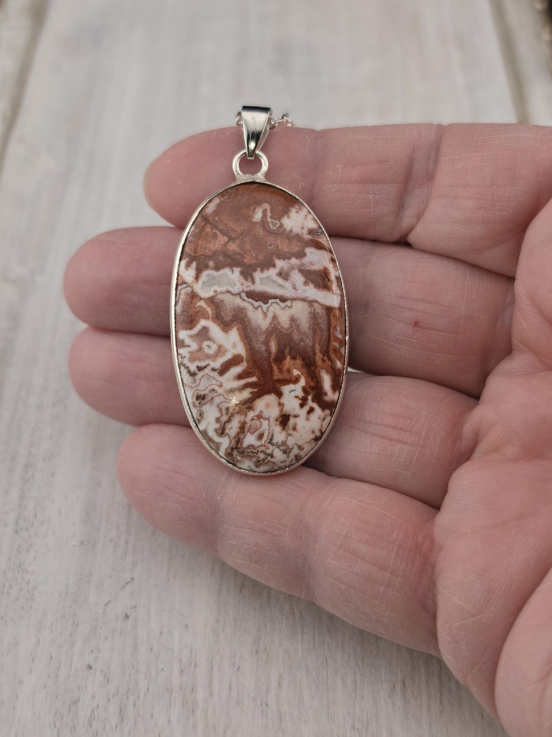 I made these necklaces using bright & shiny 925 sterling silver plated flat link chain that have extenders making them adjustable from 20" to 22" in length. There are 3 natural gemstone pendants set in 925 sterling silver to choose from. YOUR CHOICES ARE: #1- Rosetta Rosarita - Oval shape #2- Ruby Zoisite - Wavy shape #3- Leopard skin jasper - Oval shape * Your purchase will arrive in pretty packaging