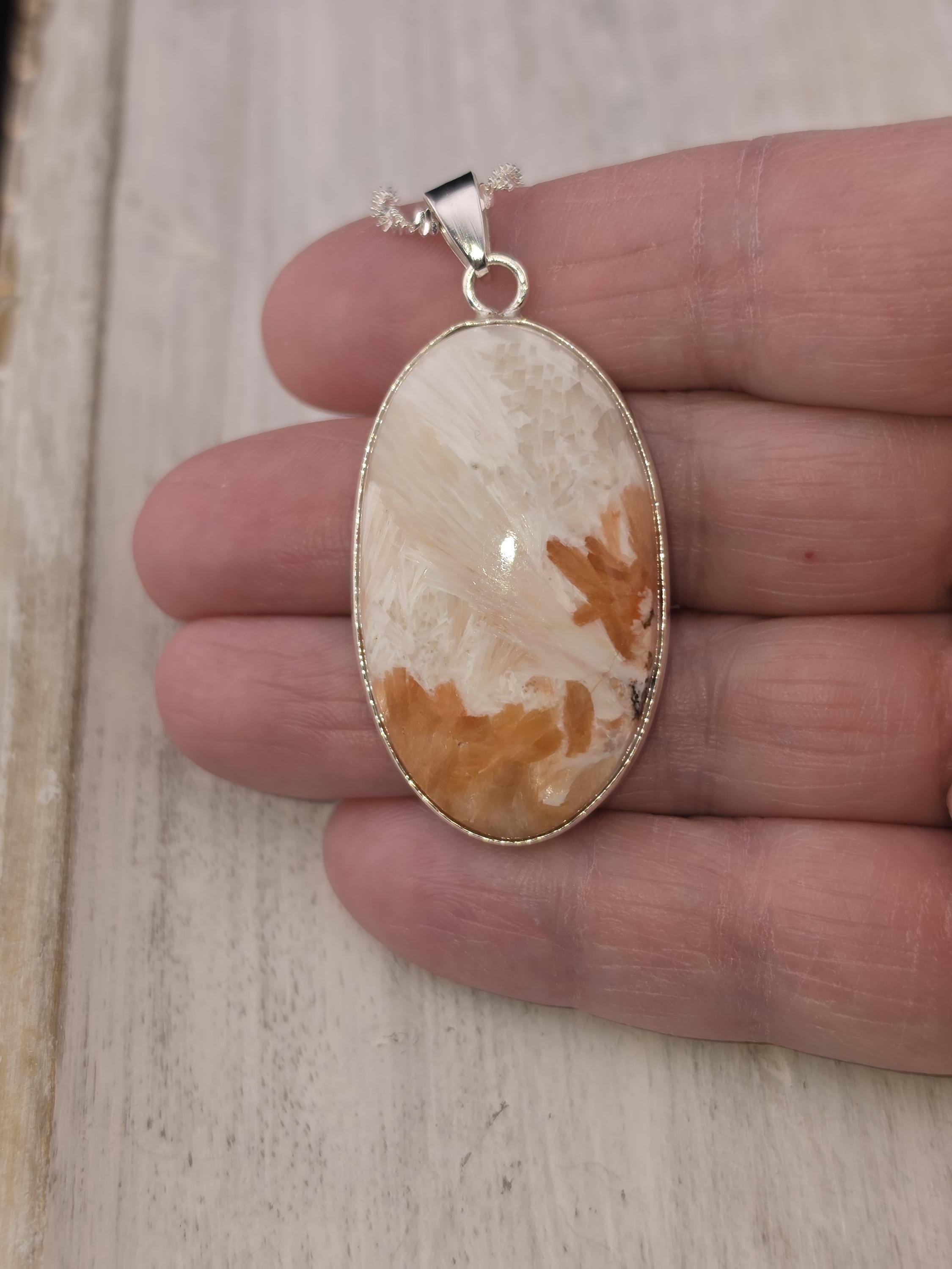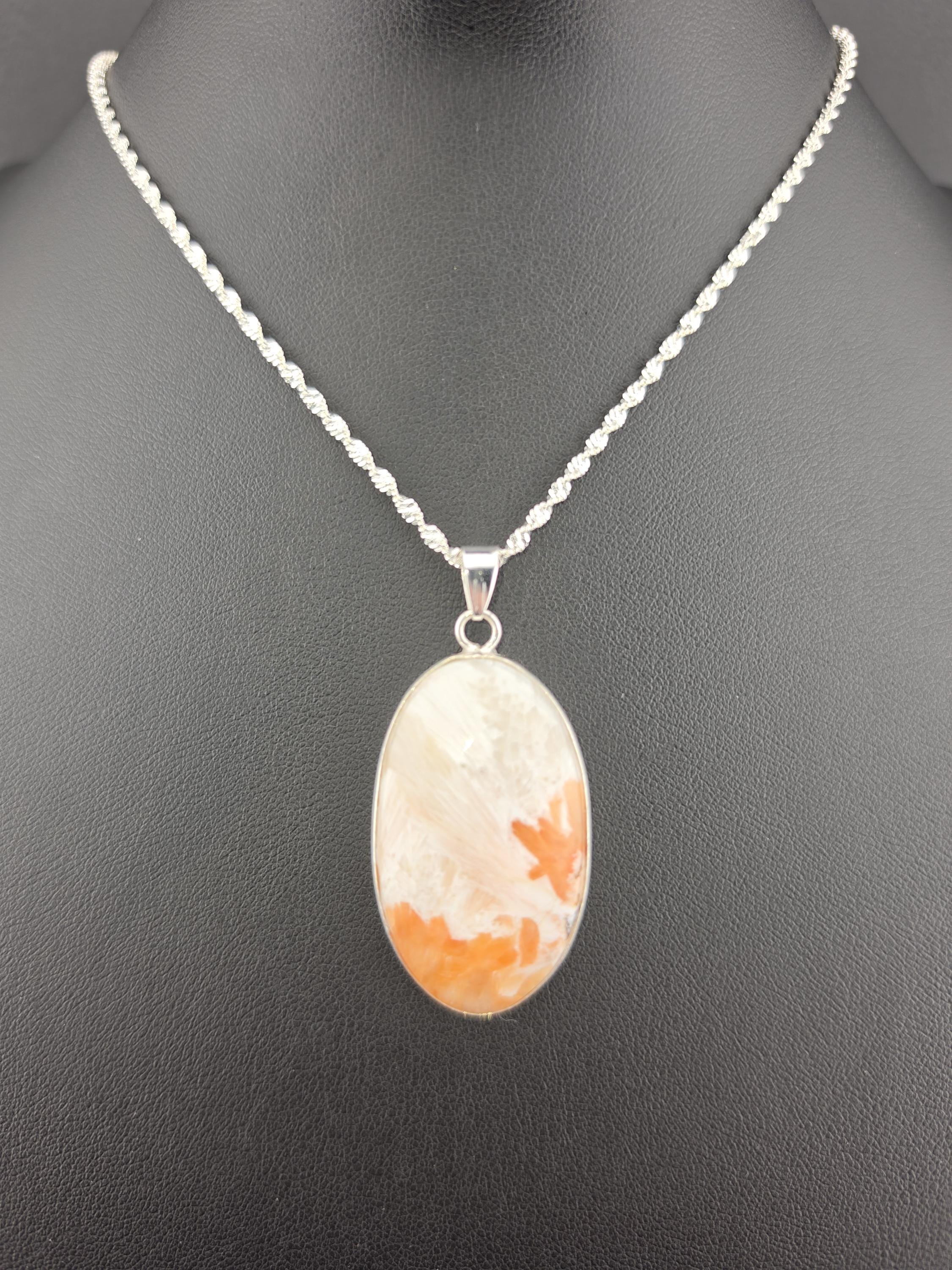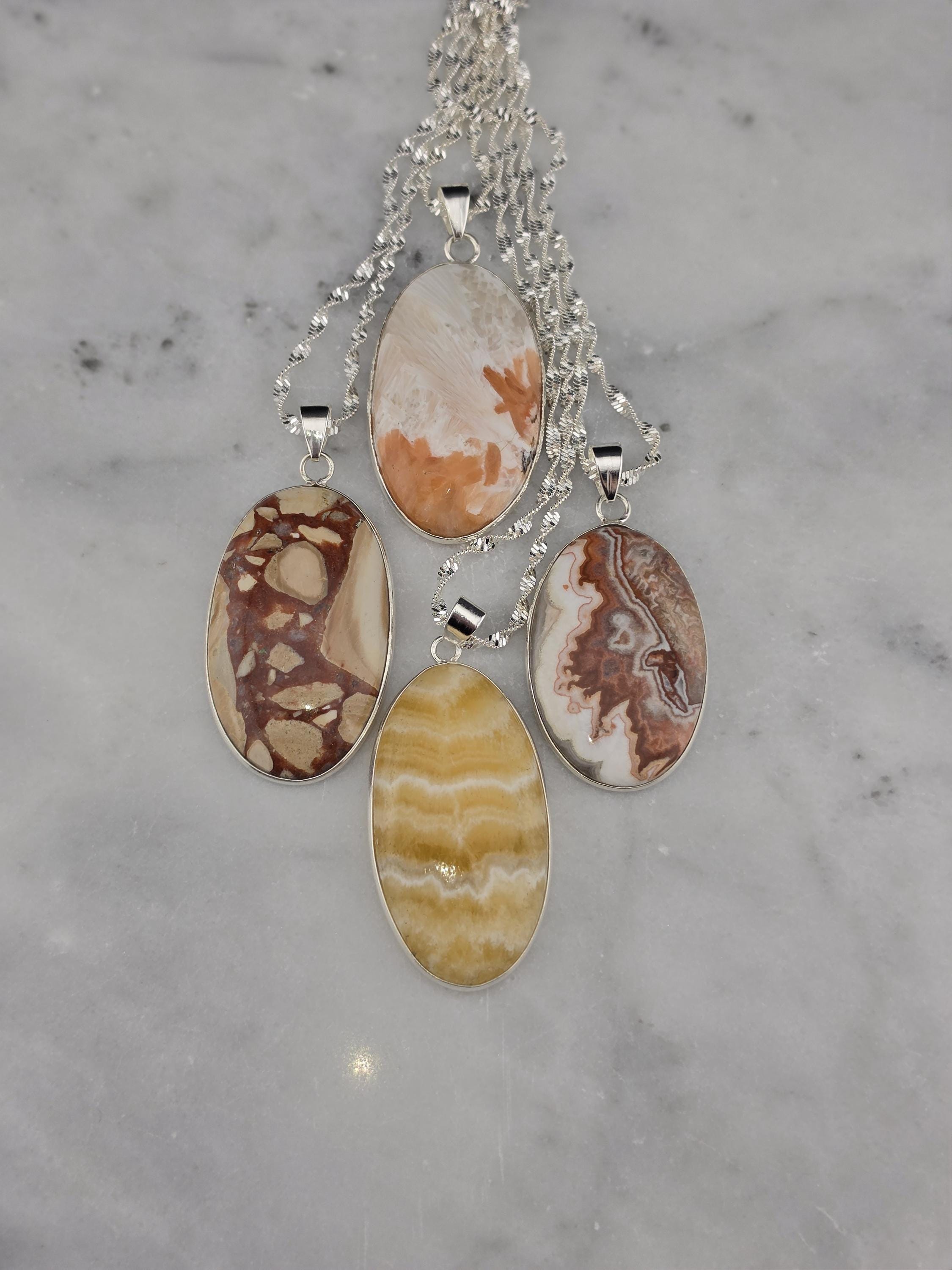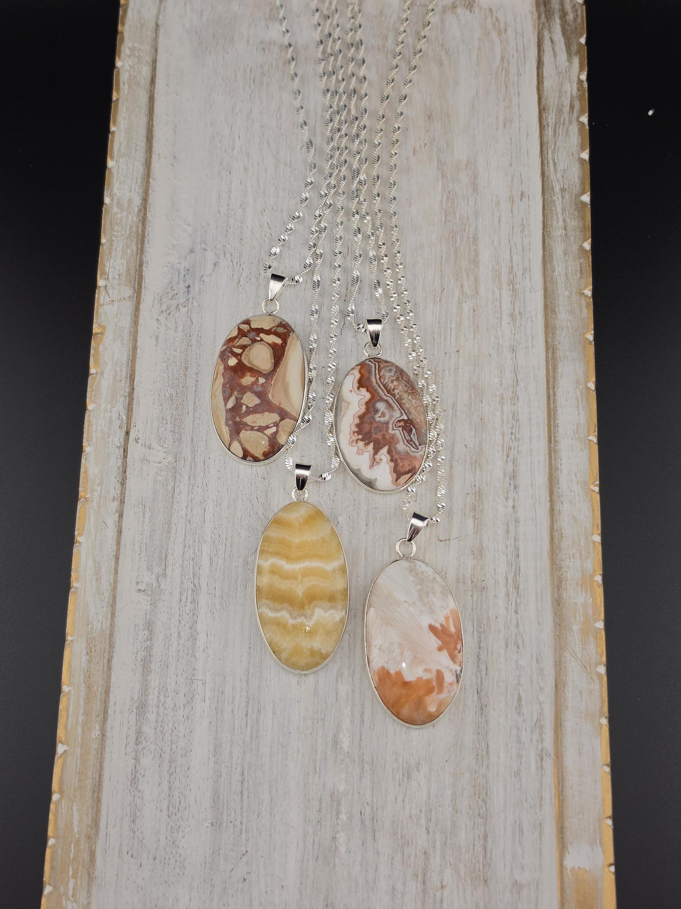 I made these necklaces using bright shiny twisted 925 sterling silver plated chain that have extenders making them adjustable from 20" to 22" in length. I added handcrafted oval gemstone pendants set in 925 sterling silver. YOUR CHOICES ARE: #1- Orange Scolecite #2-Mookaite Jasper #3-AAA Rosarito #4-Yellow Lace Agate * Your purchase will arrive in pretty packaging