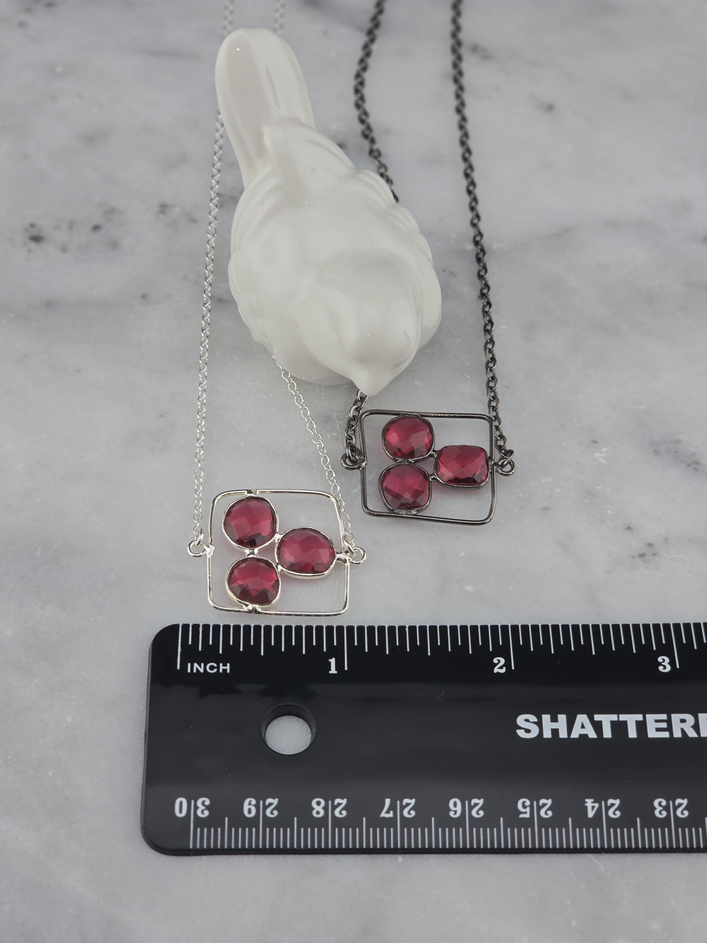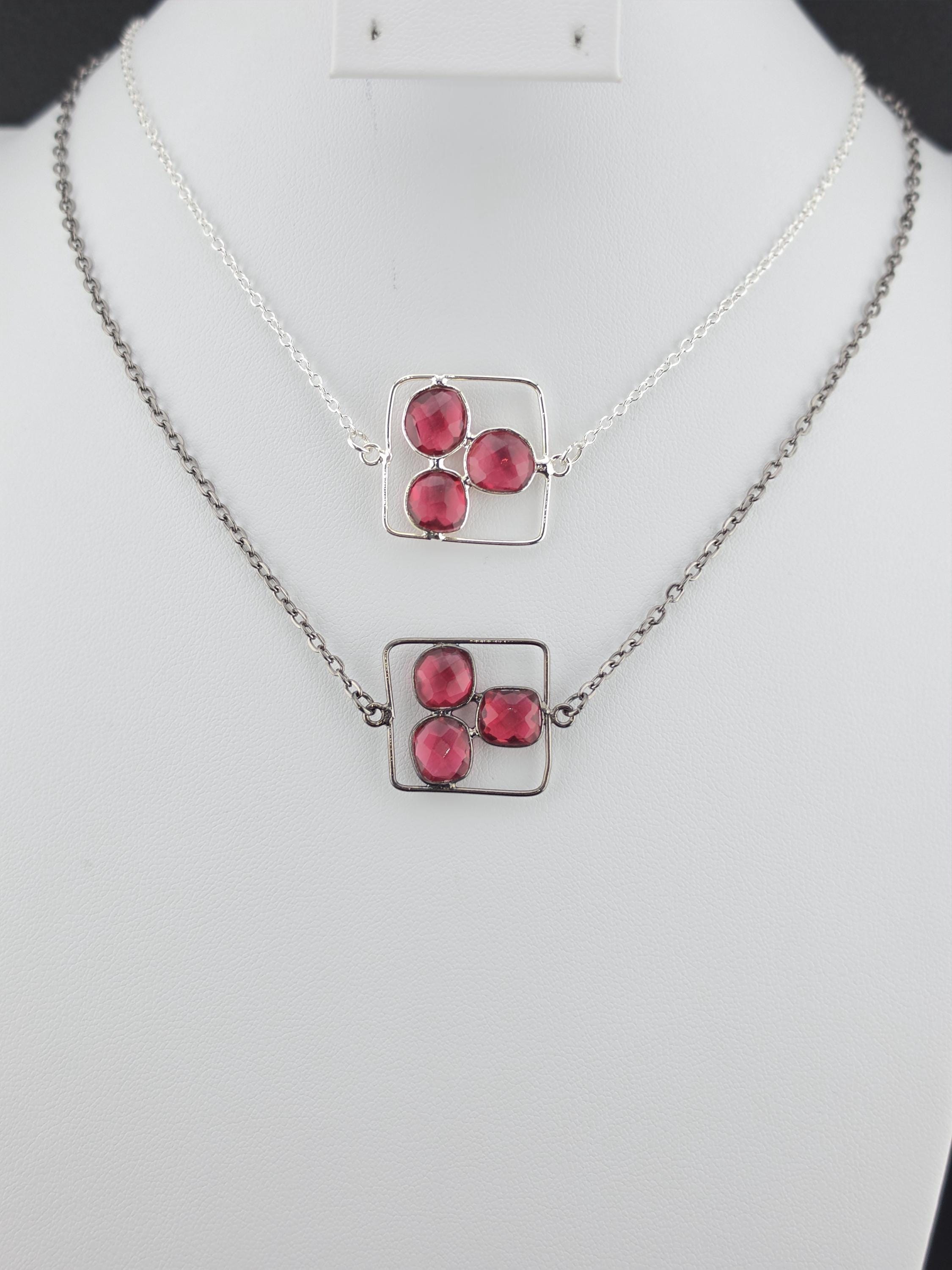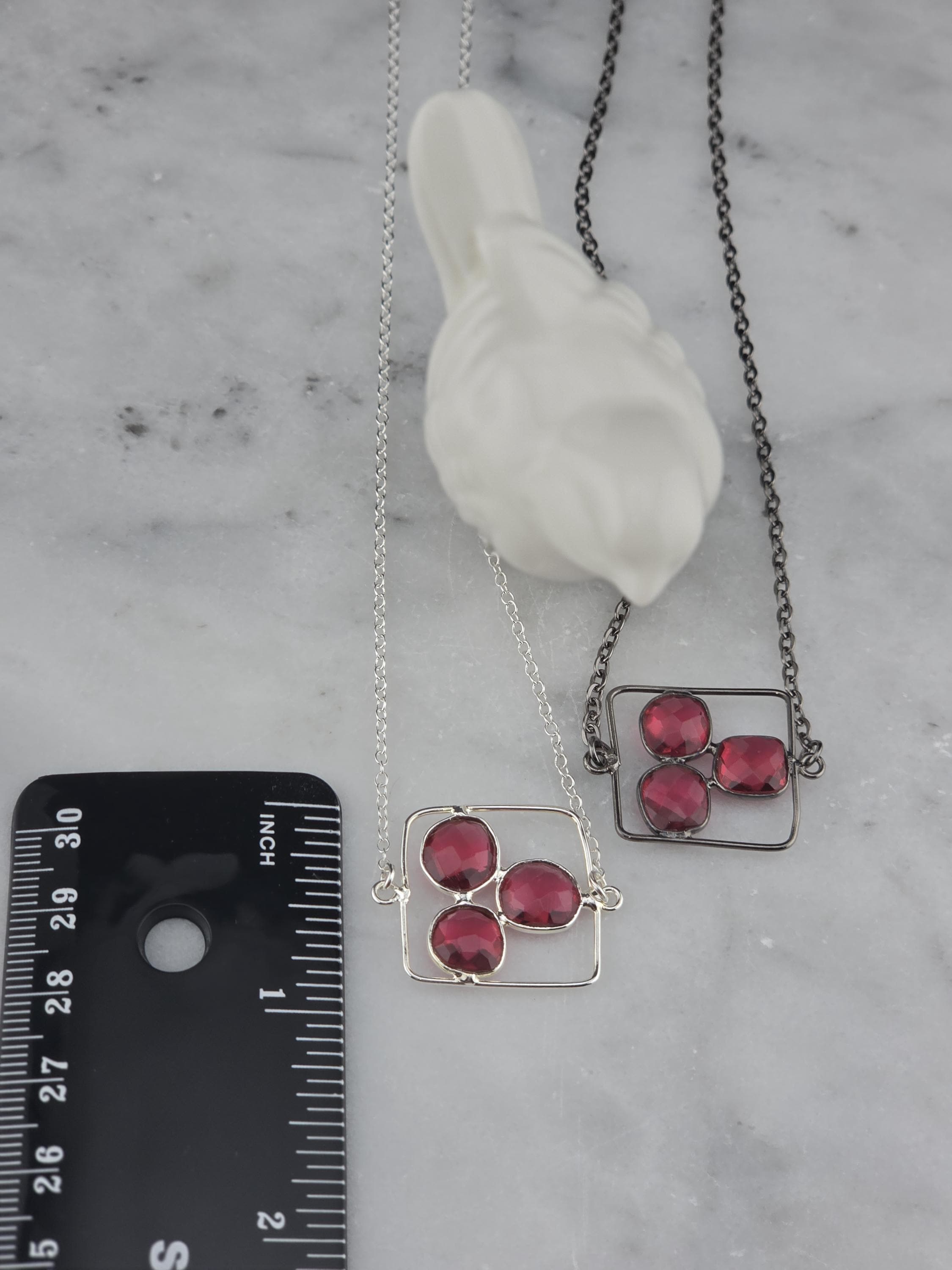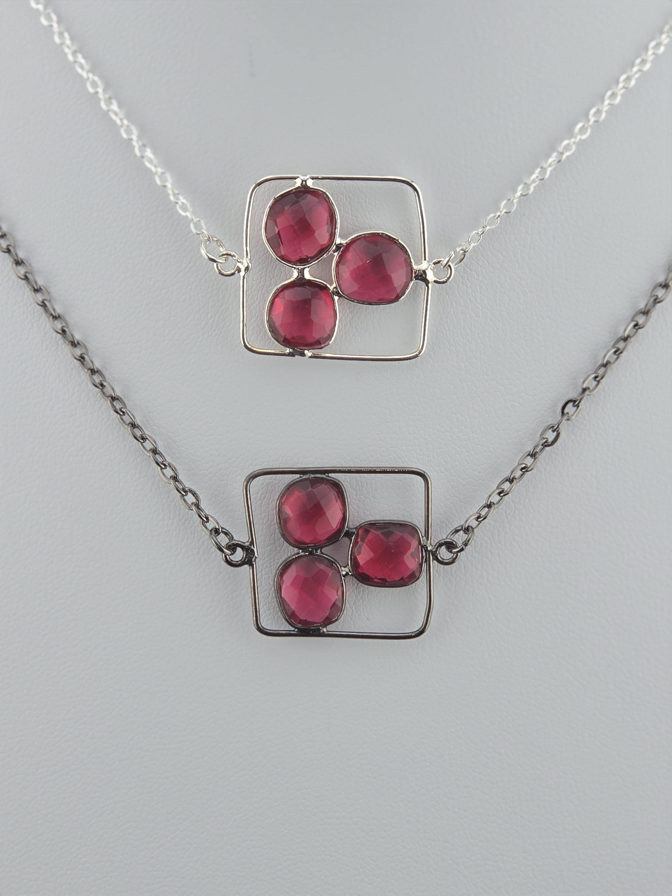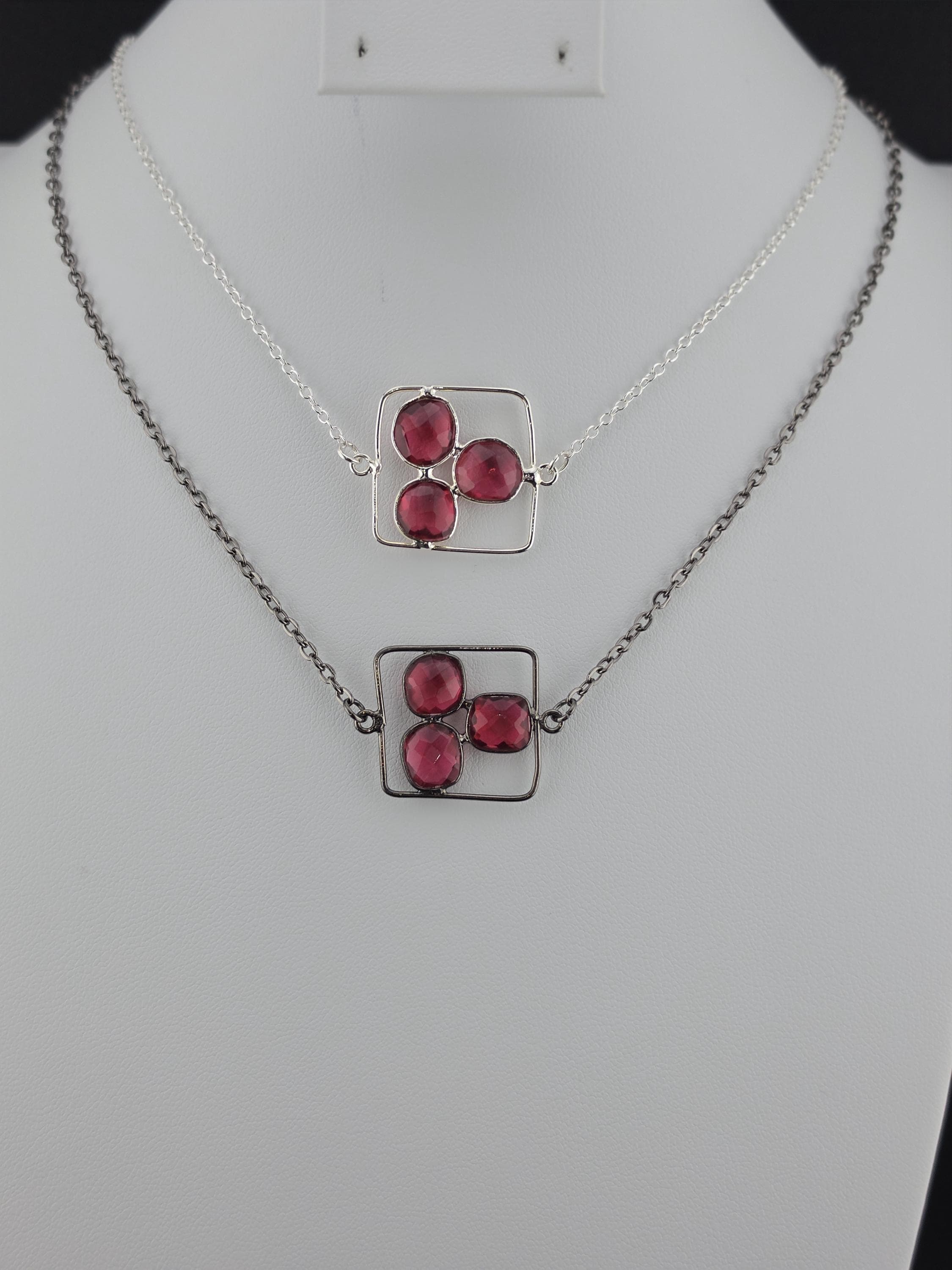 These necklaces were made using delicate black or 925 sterling silver chain that have extenders making them adjustable from 17" to 19" to 21" in length. The handcrafted pendants are hollow square in shape with 3 oval faceted pink tourmaline gemstones in each. They are plated with black rhodium or 925 sterling silver. * Your purchase will arrive in pretty packaging