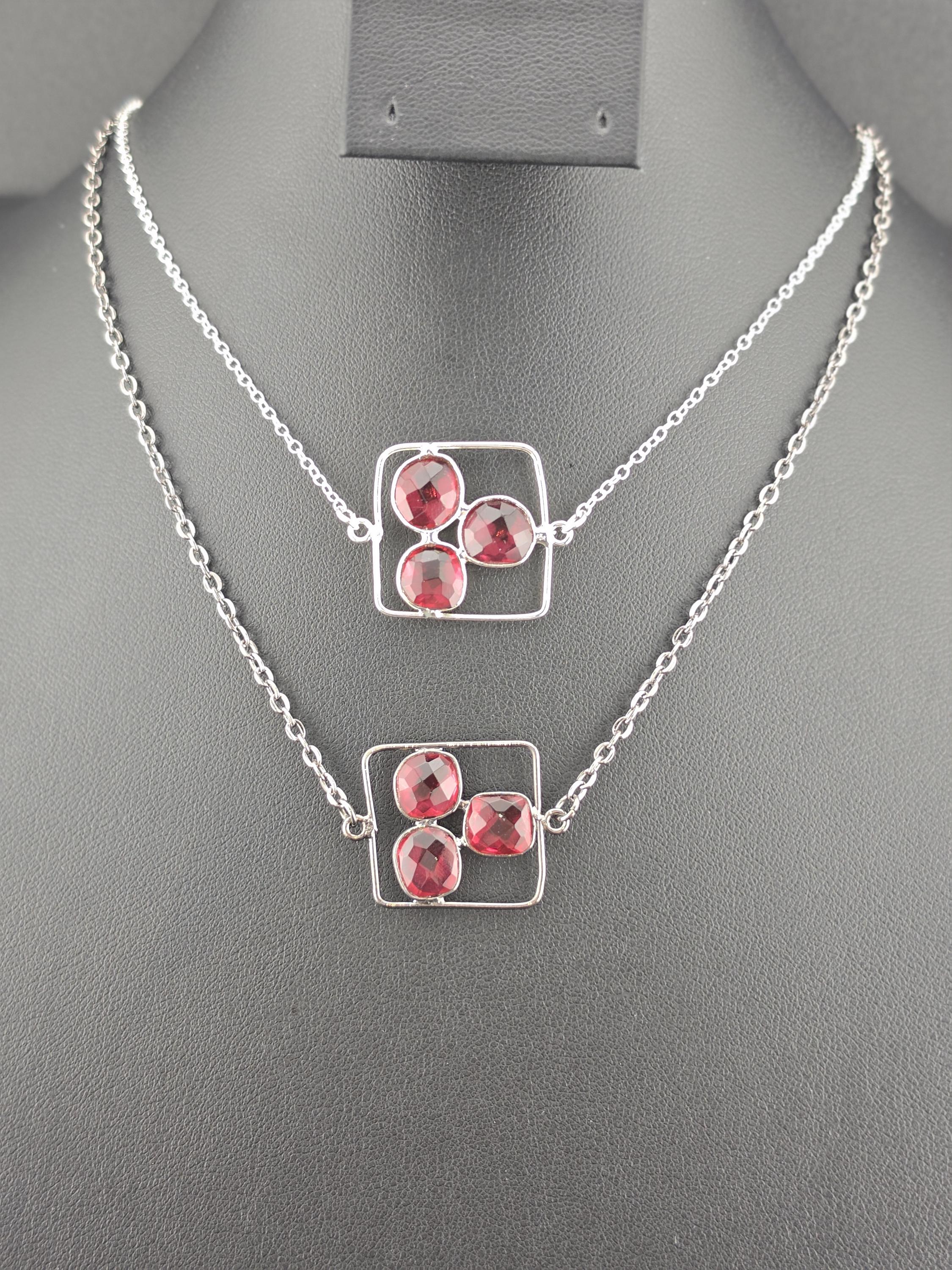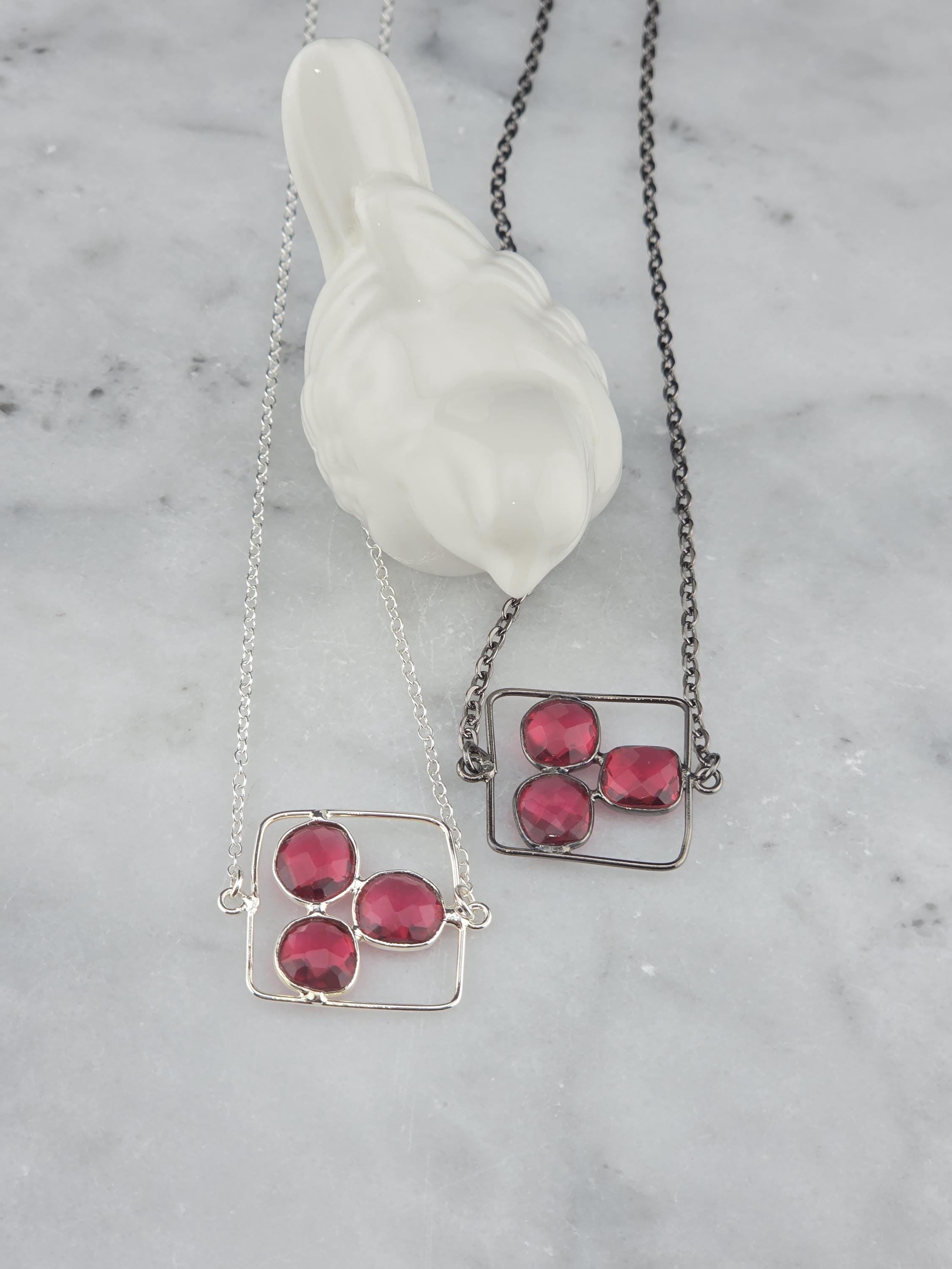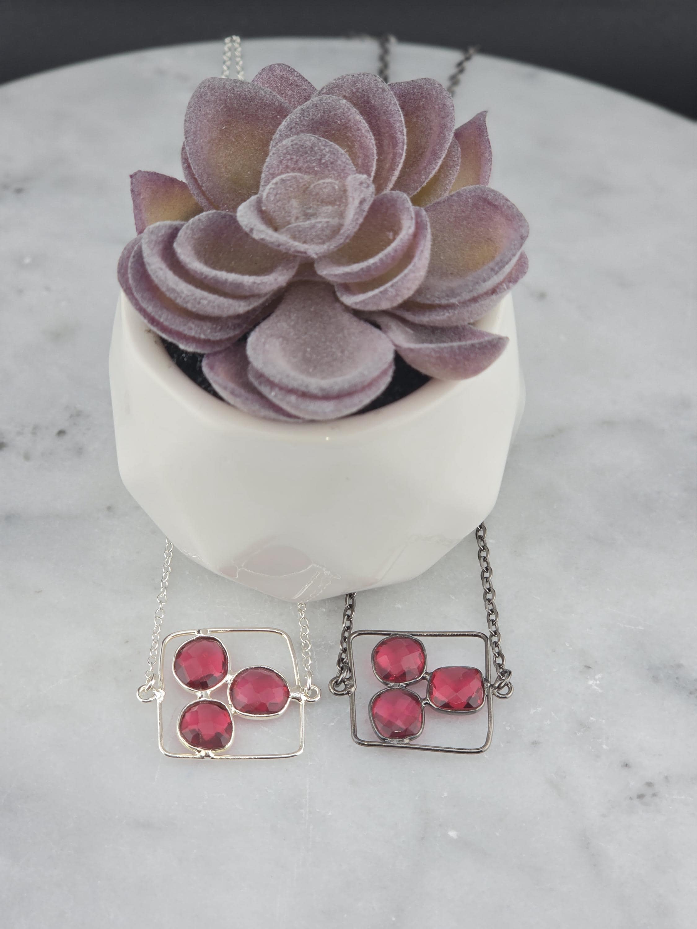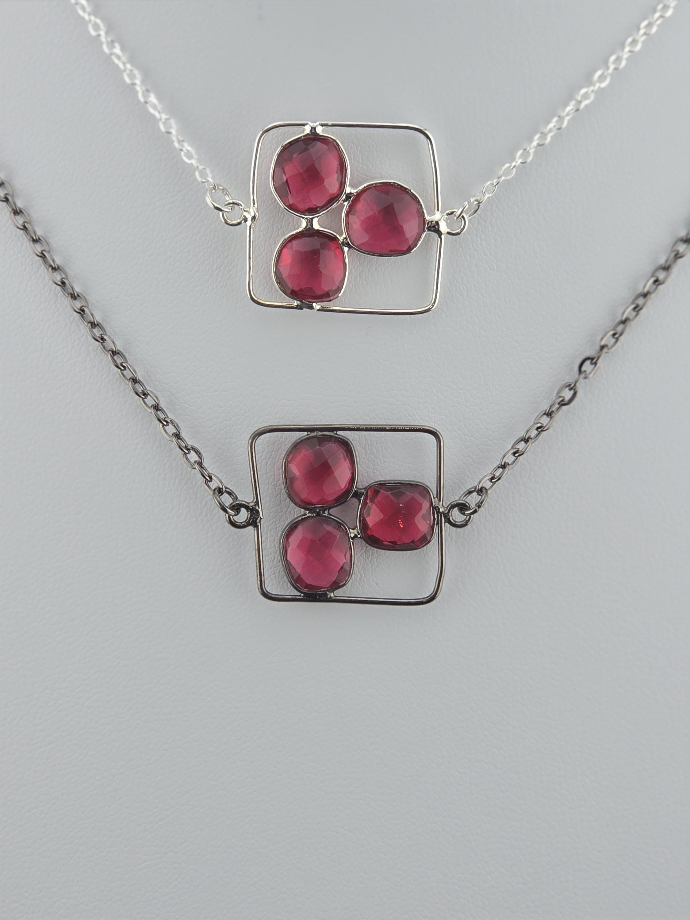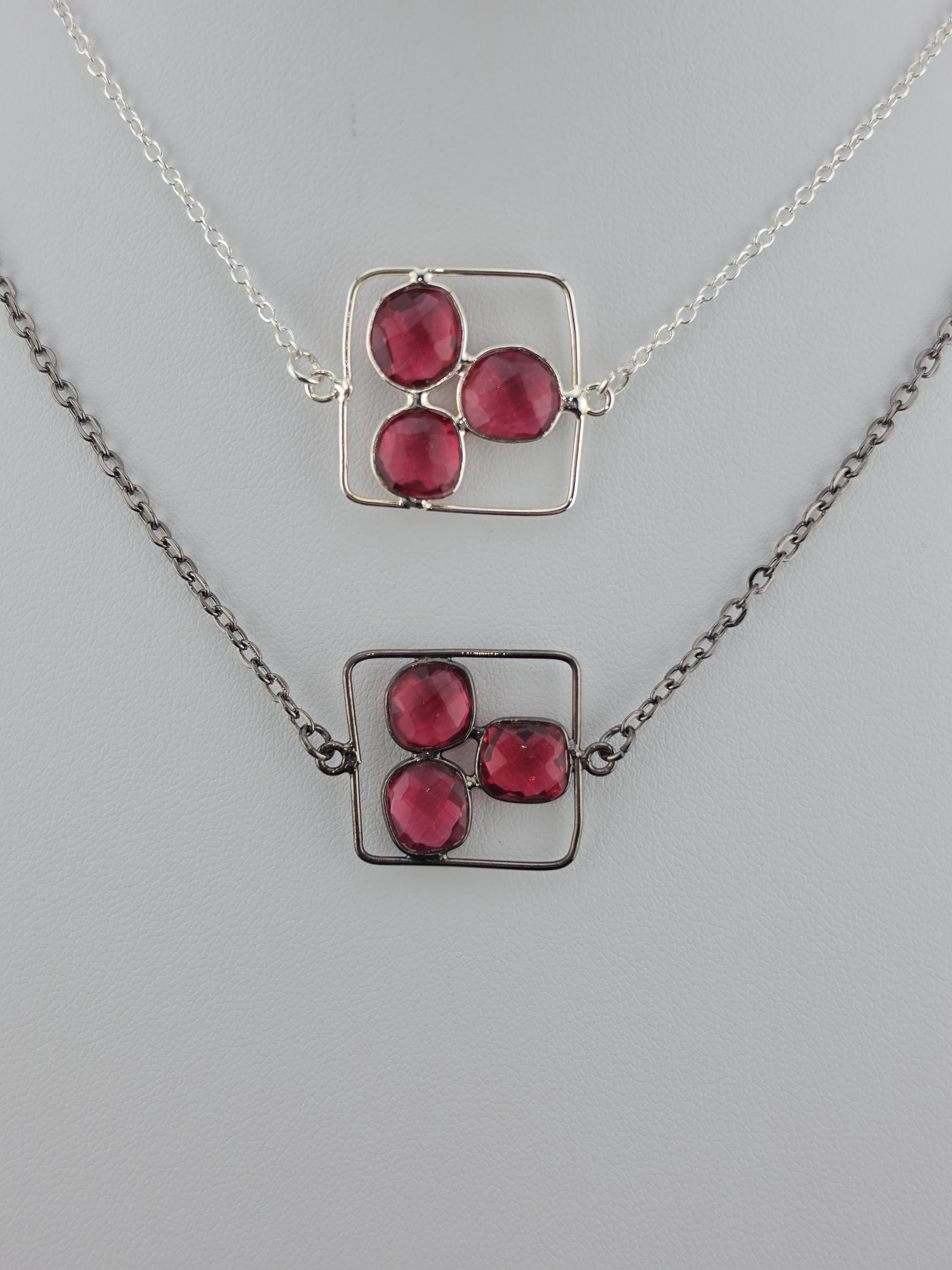 These necklaces were made using delicate black or 925 sterling silver chain that have extenders making them adjustable from 17" to 19" to 21" in length. The handcrafted pendants are hollow square in shape with 3 oval faceted pink tourmaline gemstones in each. They are plated with black rhodium or 925 sterling silver. * Your purchase will arrive in pretty packaging