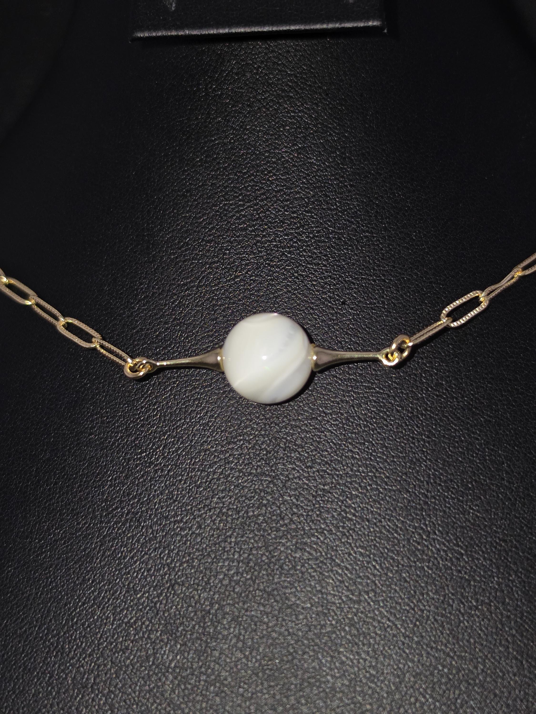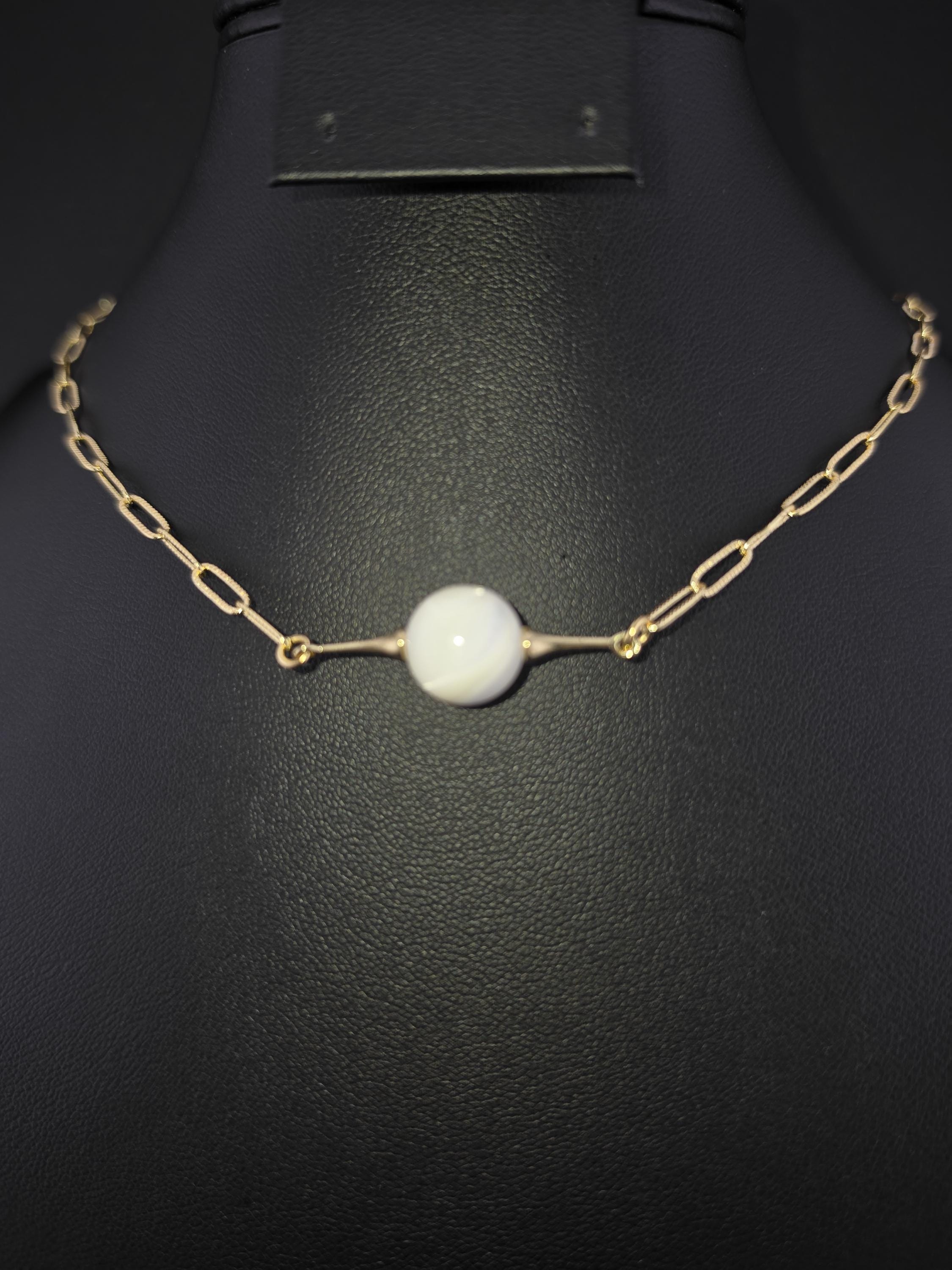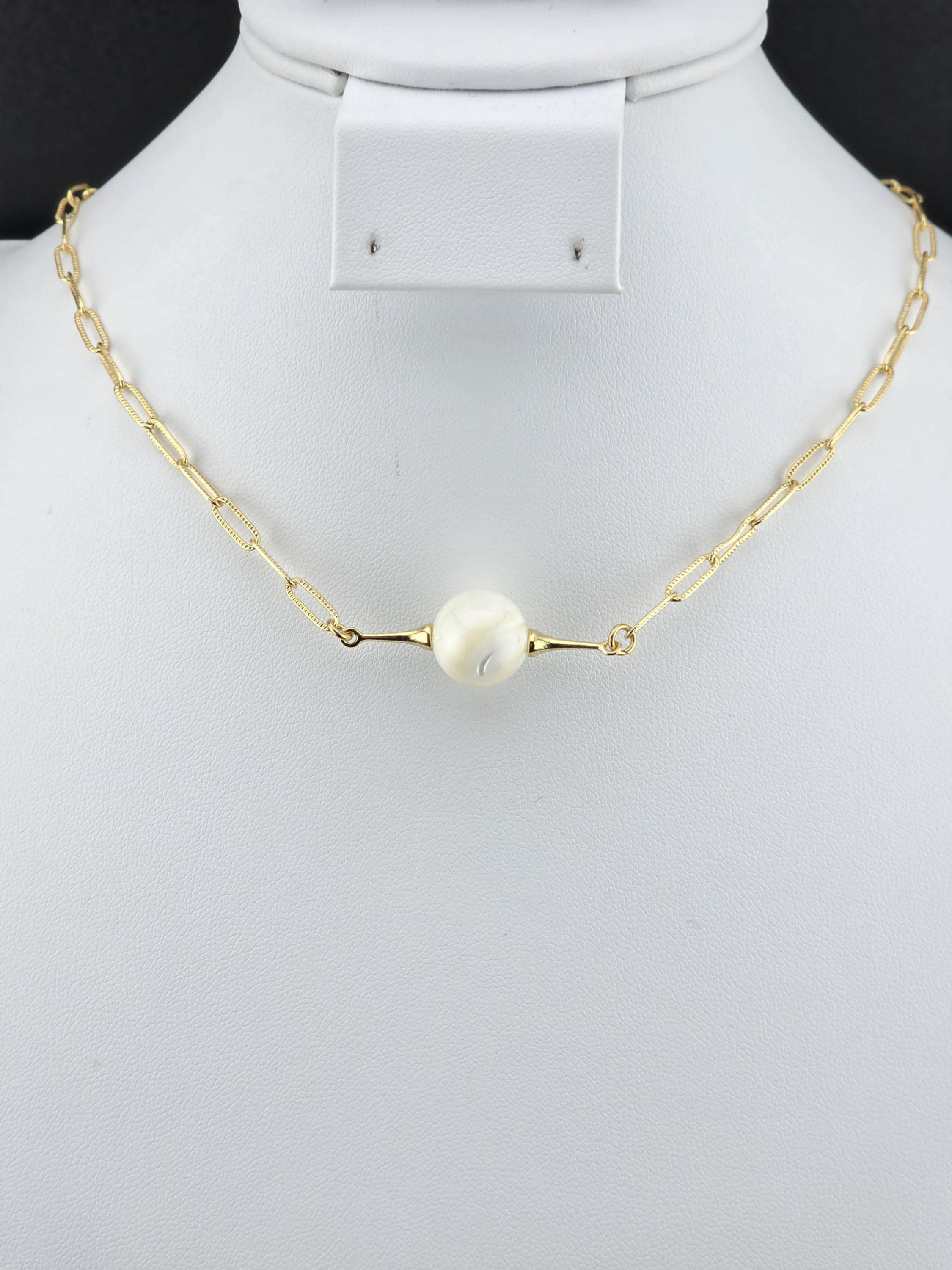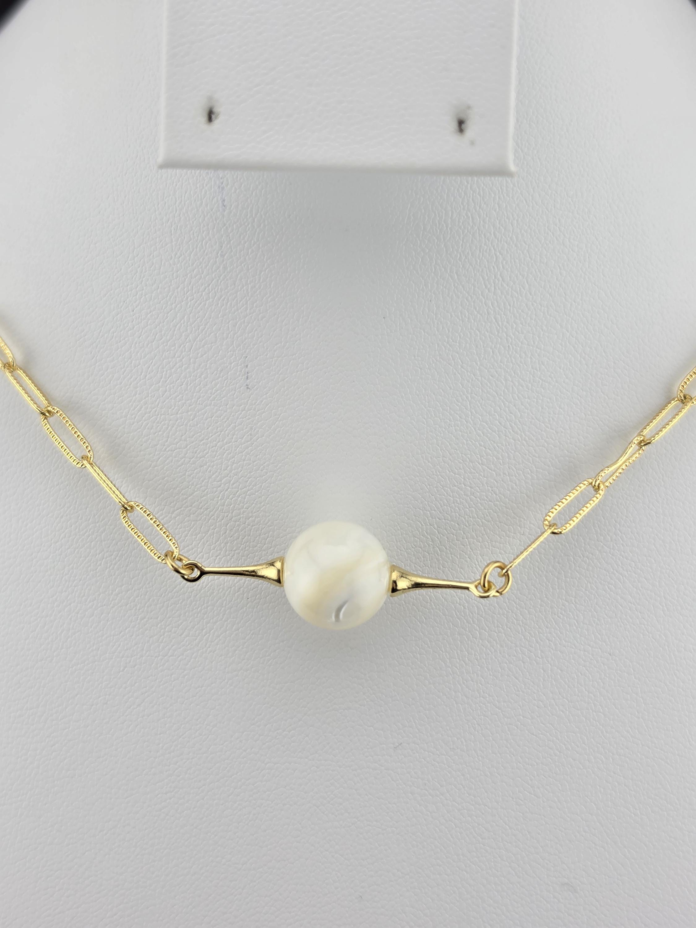 This necklace was made using bright shiny 18k gold plated embossed chain with 18k gold plated connecting rings and a 16k gold plated clasp. It also has an extender making it adjustable from 16" to 18" in length. The choker features a 12mm round natural white Mother of Pearl shell. Timeless elegance. * Your purchase will arrive in pretty packaging TO KEEP PEARLS LUSTROUS: - Apply cosmetics and perfume before putting them on. - Clean them gently with mild soap and warm water, avoiding ultrasonic cleaners and harsh chemicals. CLEANING AND MAINTENANCE: - Wipe After Wear: Gently wipe pearls with a soft, dry or damp cloth to remove oils, sweat, or perfumes. - Occasional Cleaning: Use mild soap (like Ivory) and warm water to clean them, then dry thoroughly. WHAT TO AVOID: - Never use ultrasonic cleaners, steamers, detergents, baking soda, ammonia, or abrasive pads.