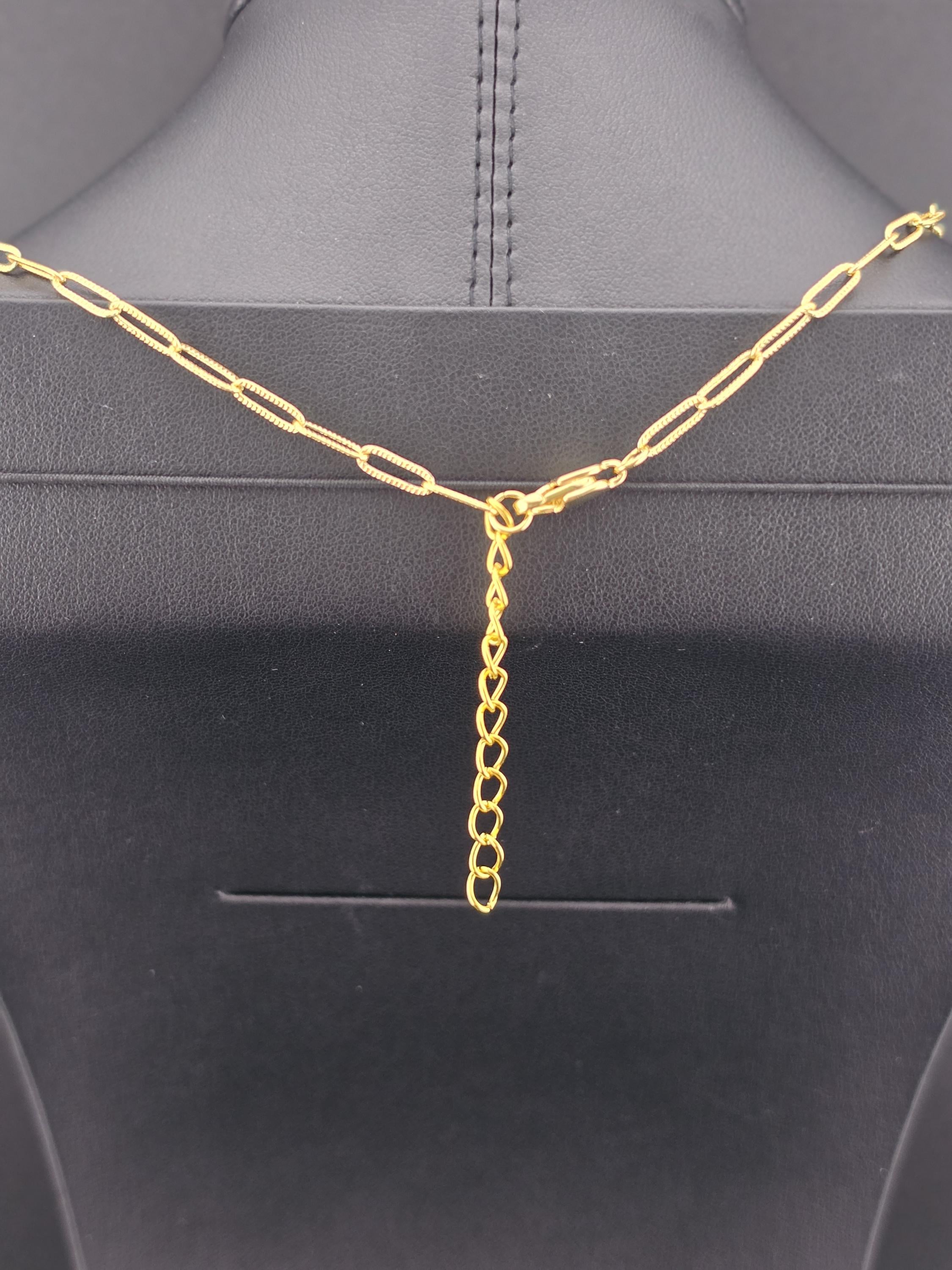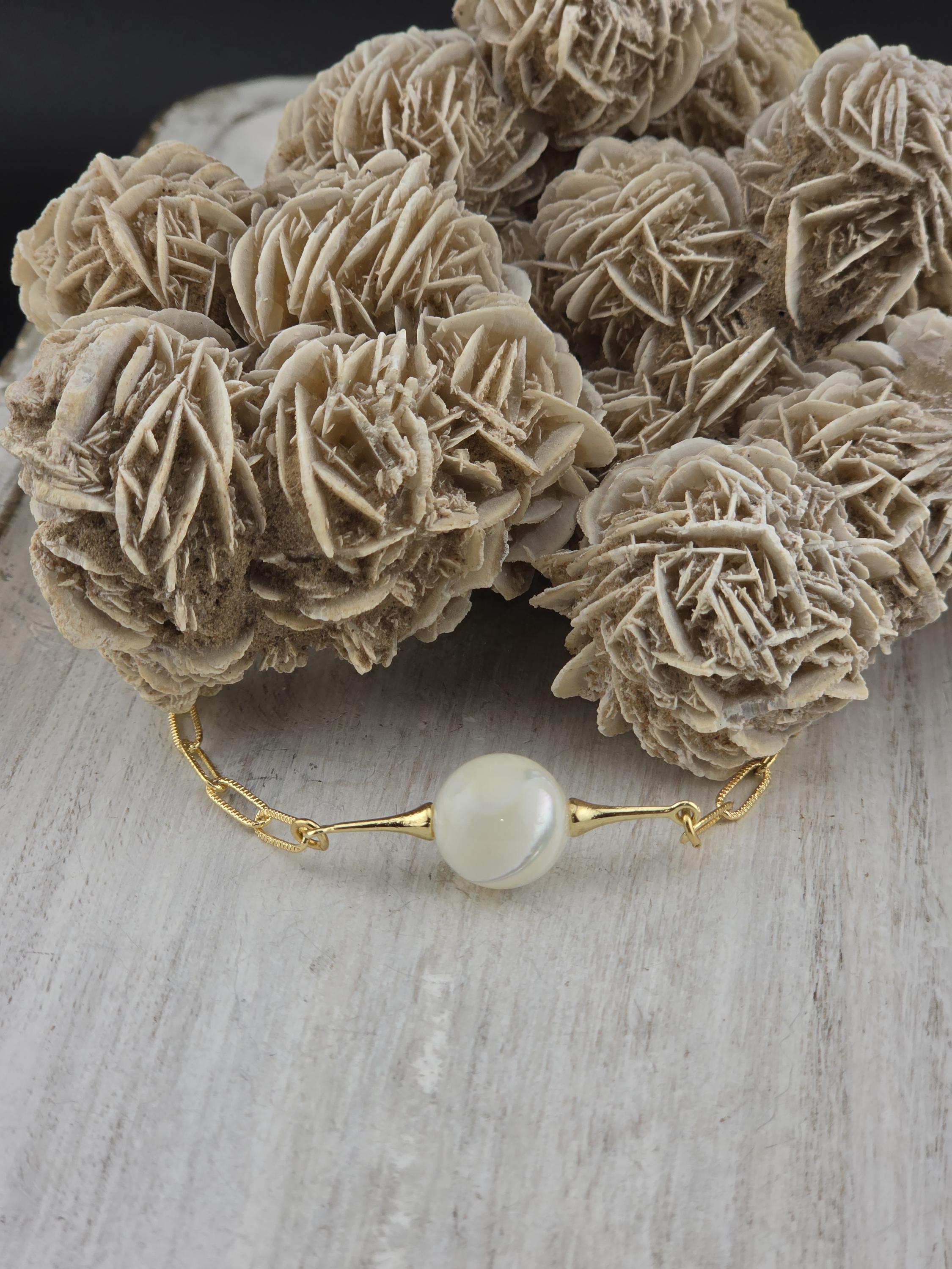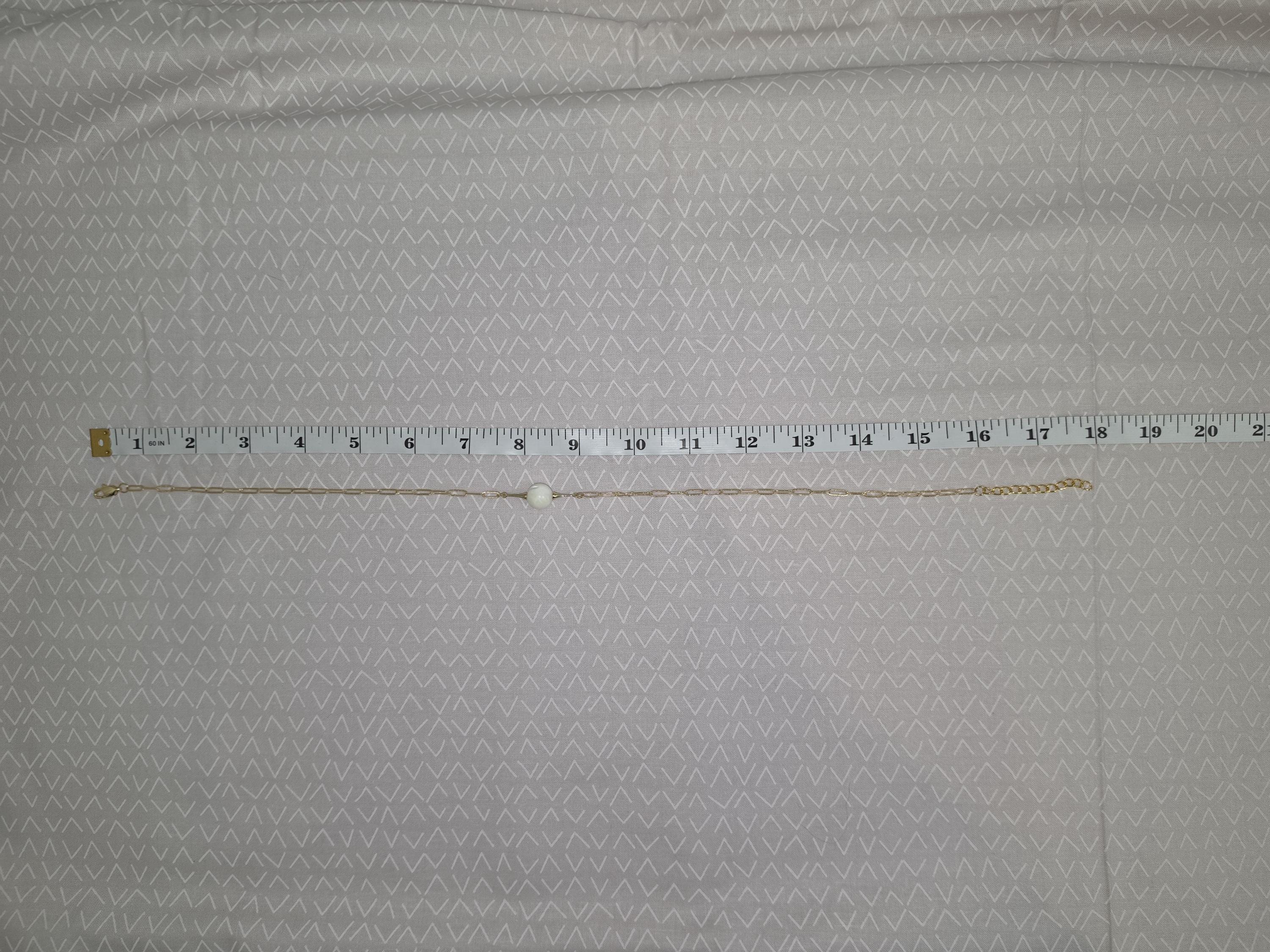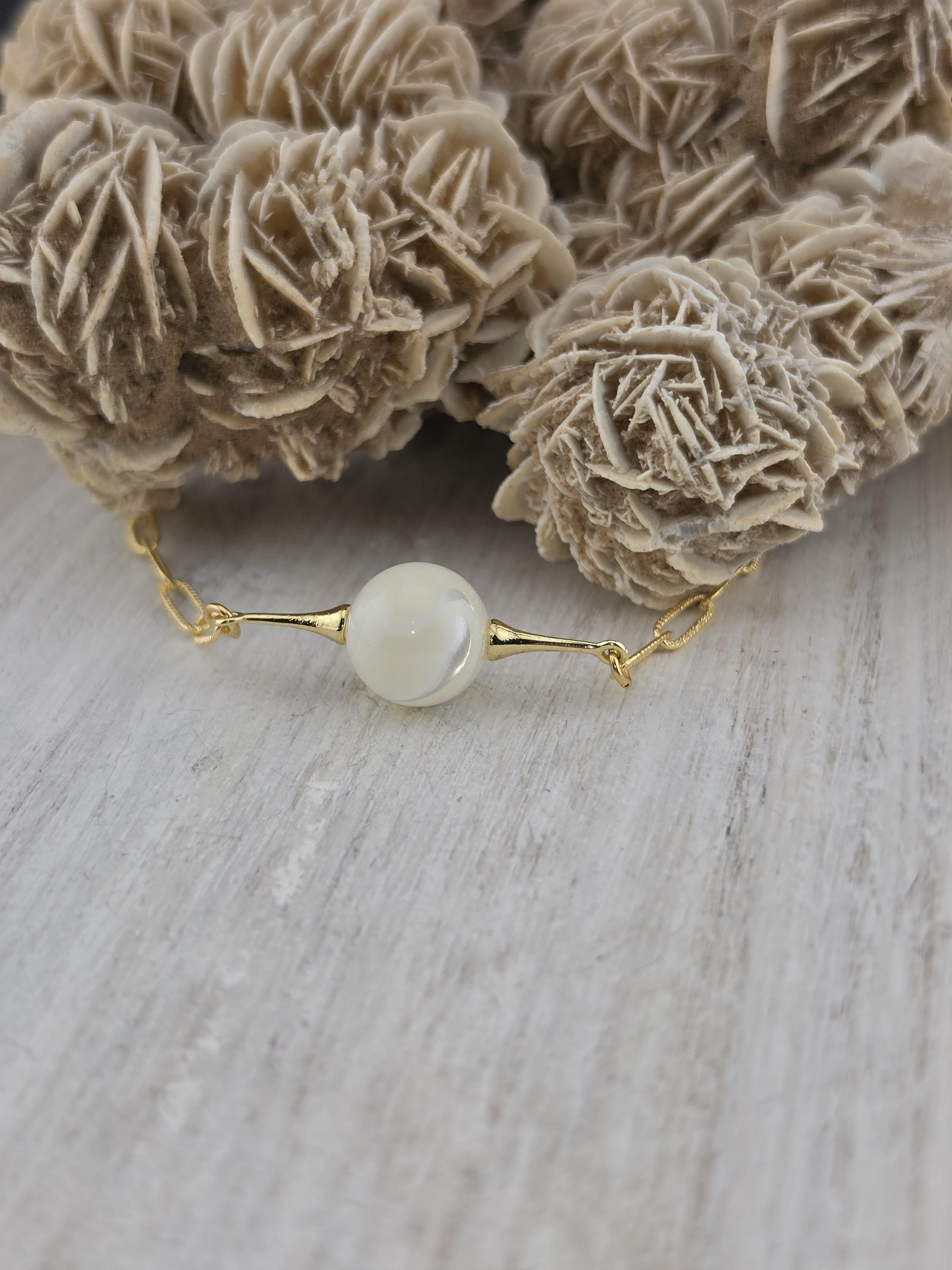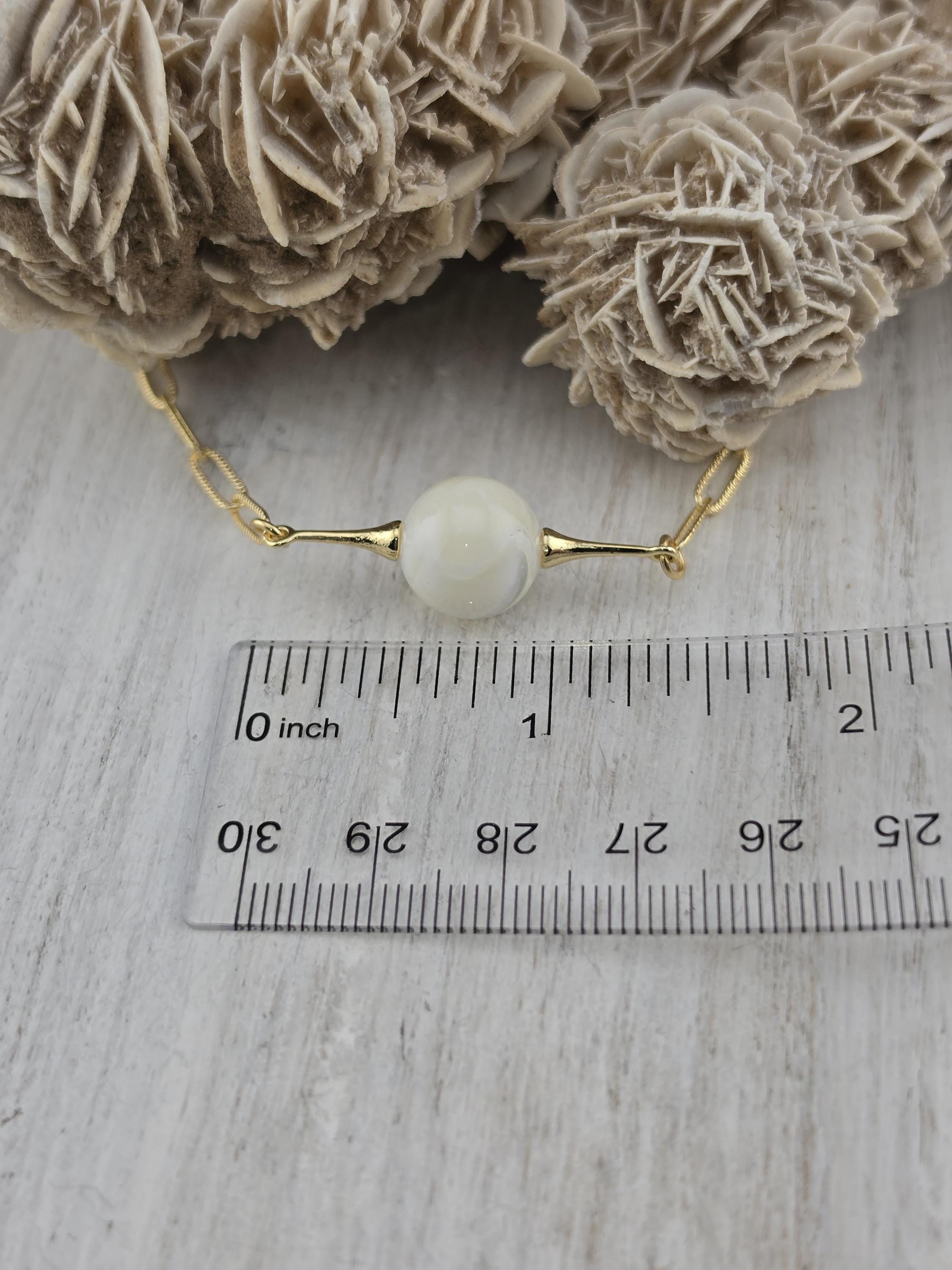 This necklace was made using bright shiny 18k gold plated embossed chain with 18k gold plated connecting rings and a 16k gold plated clasp. It also has an extender making it adjustable from 16" to 18" in length. The choker features a 12mm round natural white Mother of Pearl shell. Timeless elegance. * Your purchase will arrive in pretty packaging TO KEEP PEARLS LUSTROUS: - Apply cosmetics and perfume before putting them on. - Clean them gently with mild soap and warm water, avoiding ultrasonic cleaners and harsh chemicals. CLEANING AND MAINTENANCE: - Wipe After Wear: Gently wipe pearls with a soft, dry or damp cloth to remove oils, sweat, or perfumes. - Occasional Cleaning: Use mild soap (like Ivory) and warm water to clean them, then dry thoroughly. WHAT TO AVOID: - Never use ultrasonic cleaners, steamers, detergents, baking soda, ammonia, or abrasive pads.