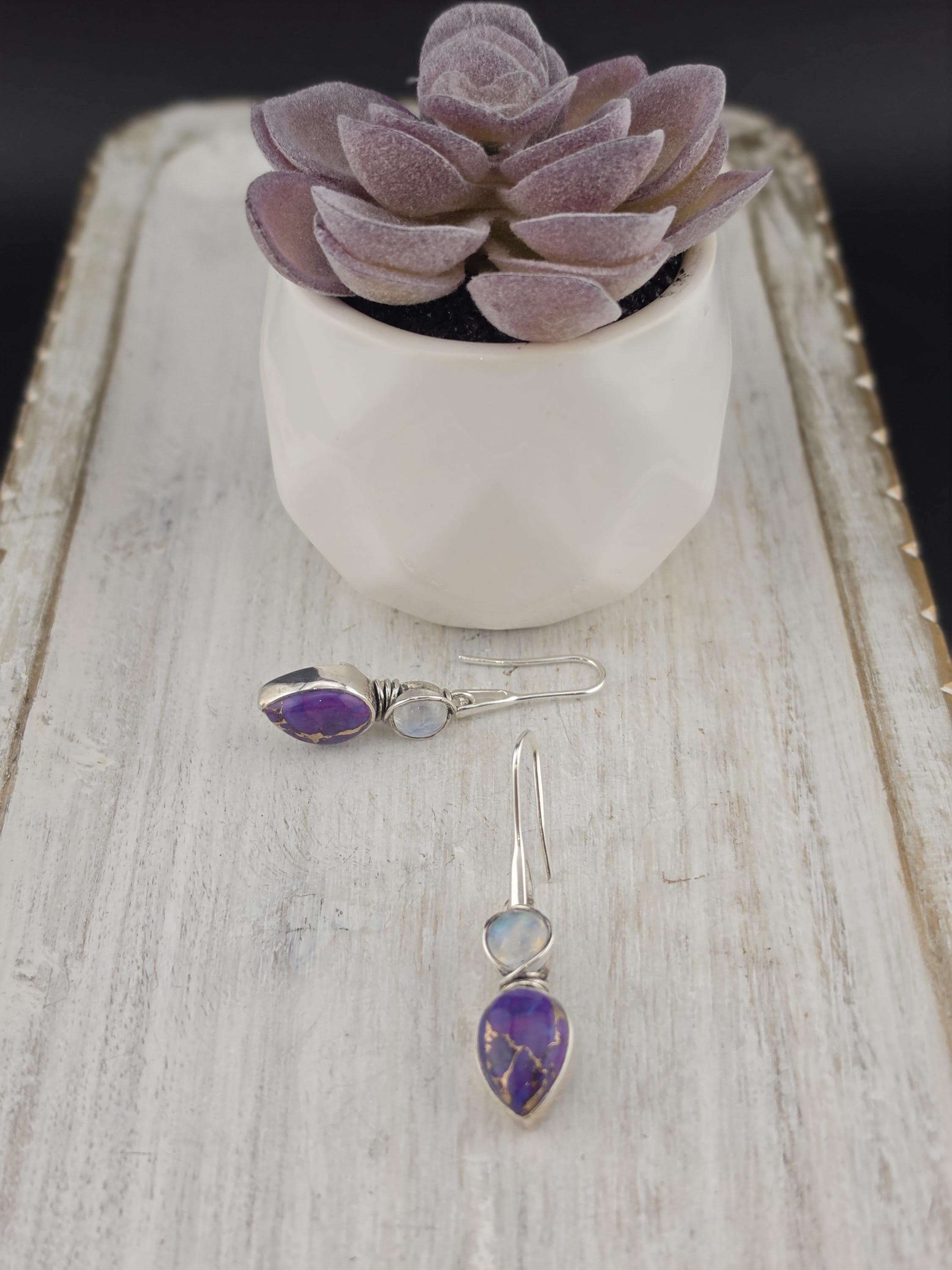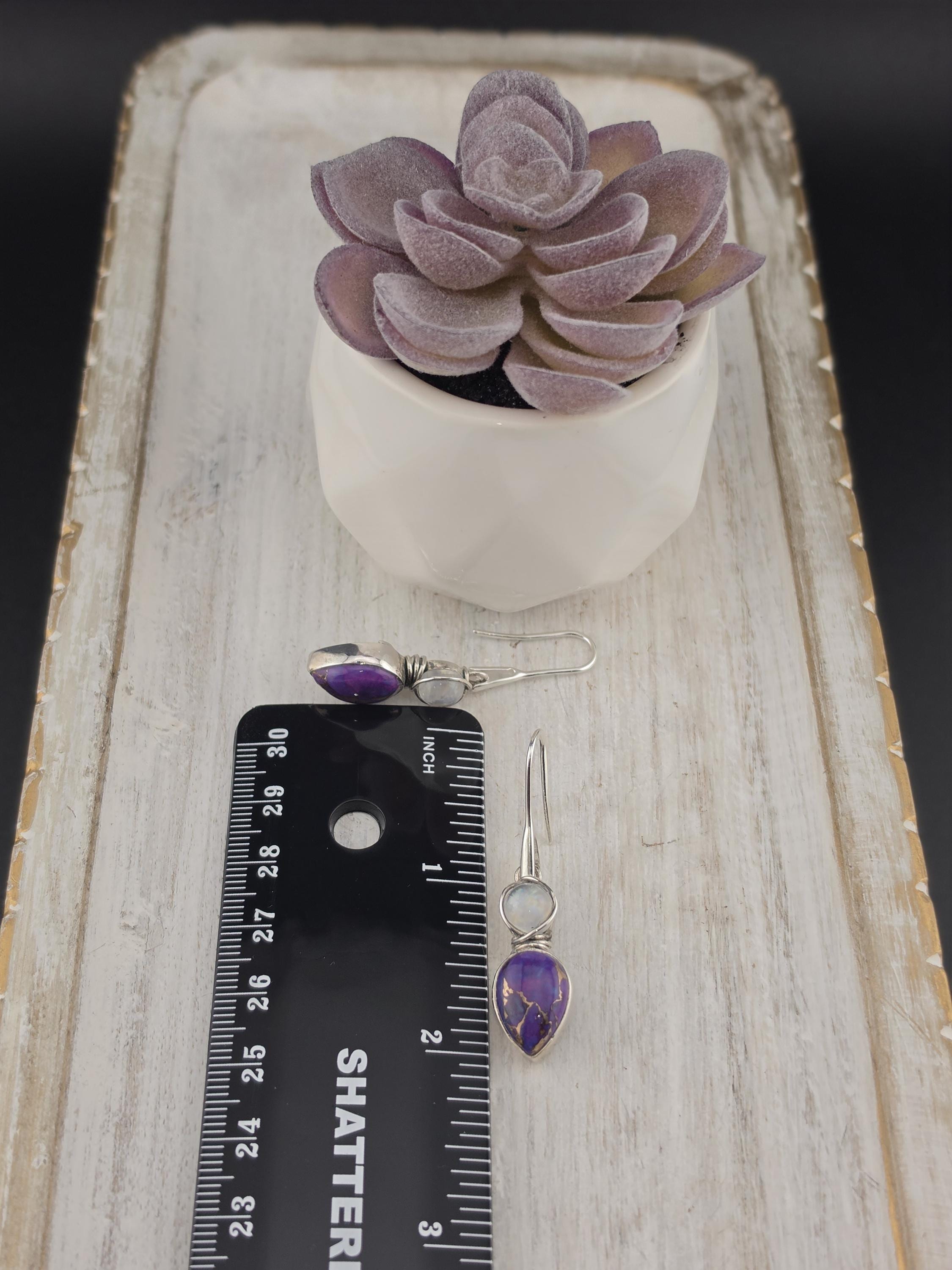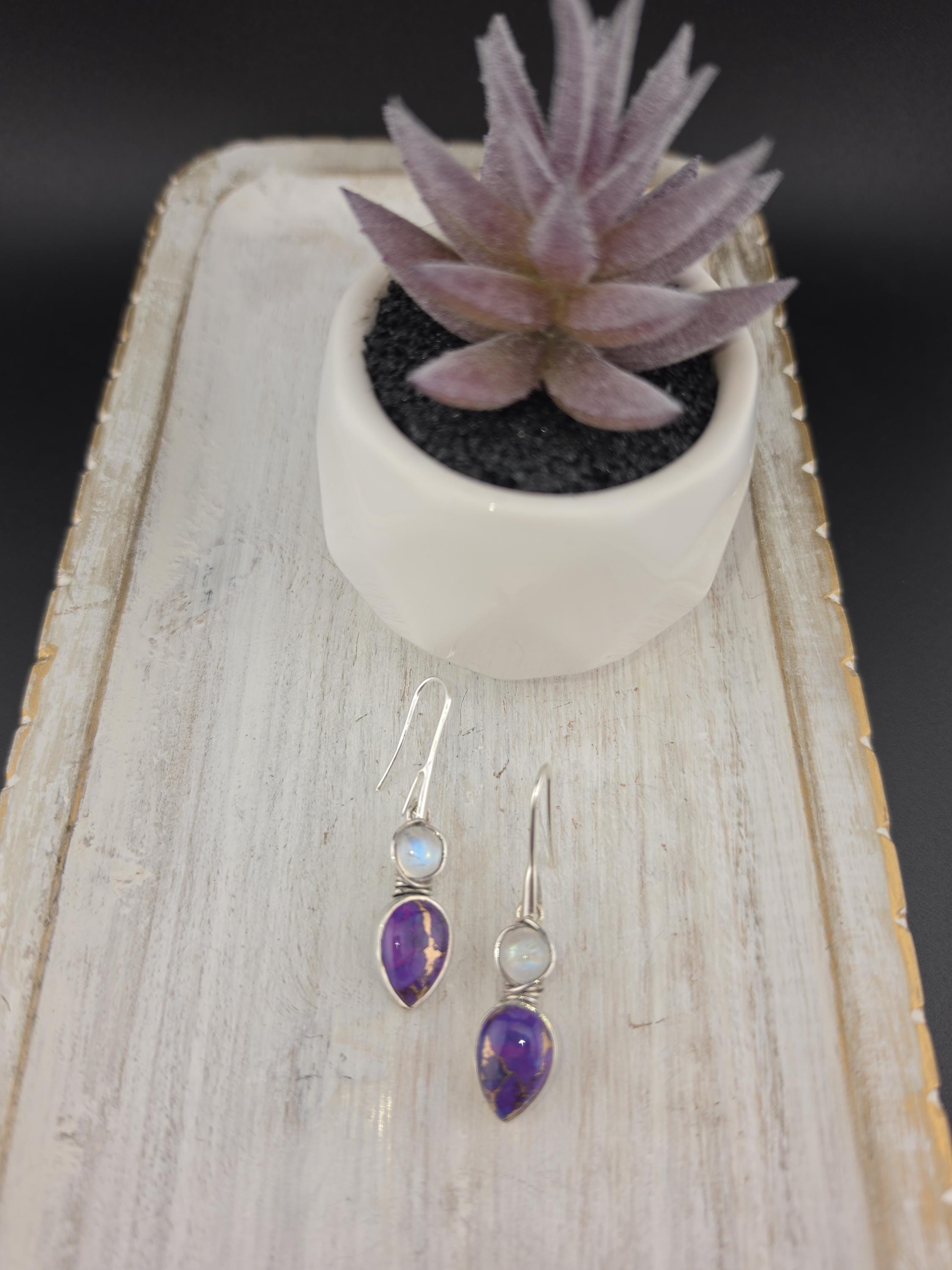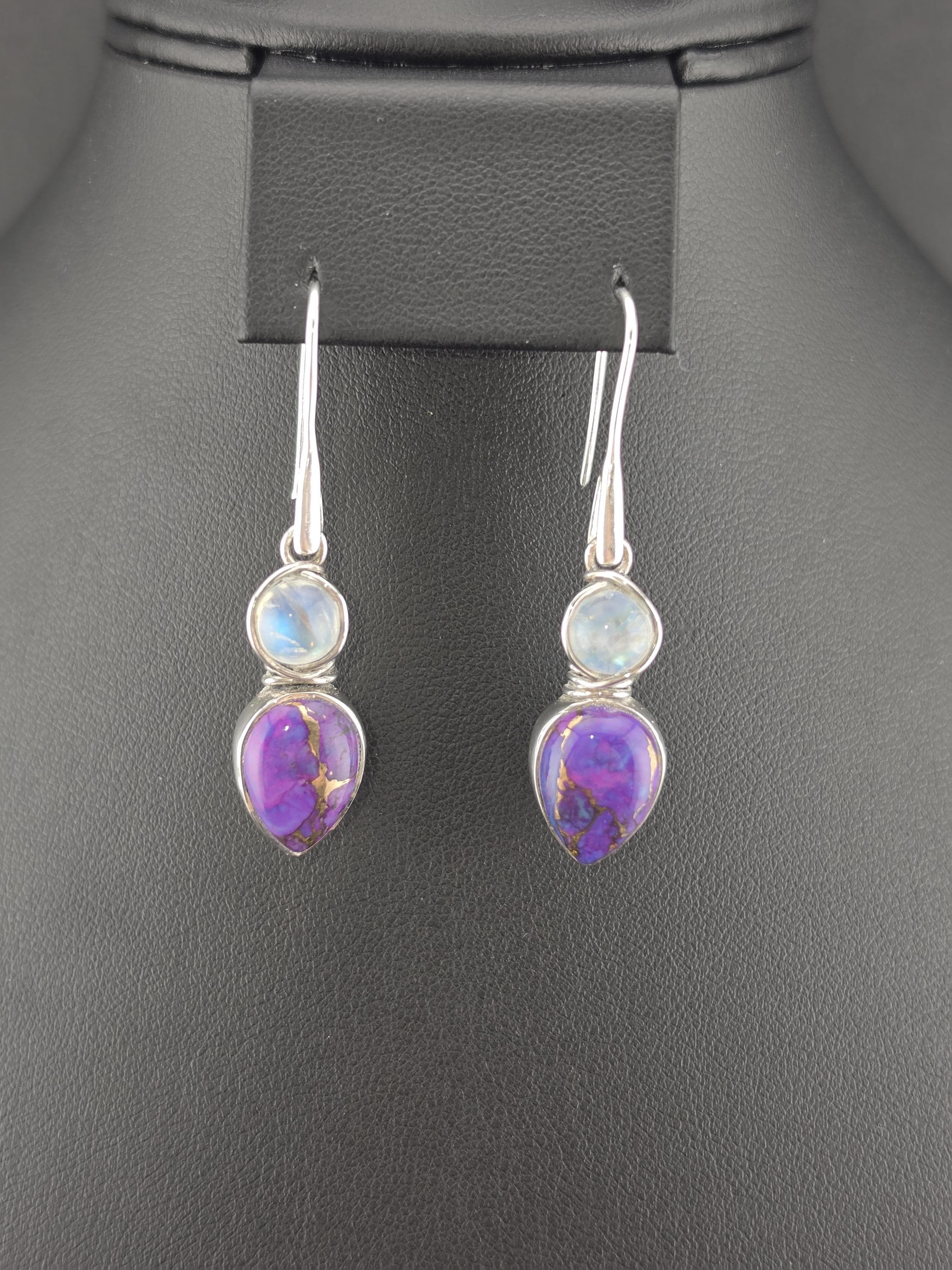 These are made using 925 sterling silver plated brass ear wire hook earrings. Hanging from each is a unique handcrafted wire wrapped round moonstone with a teardrop purple copper turquoise stone set in 925 sterling silver. * Your purchase will arrive in pretty packaging