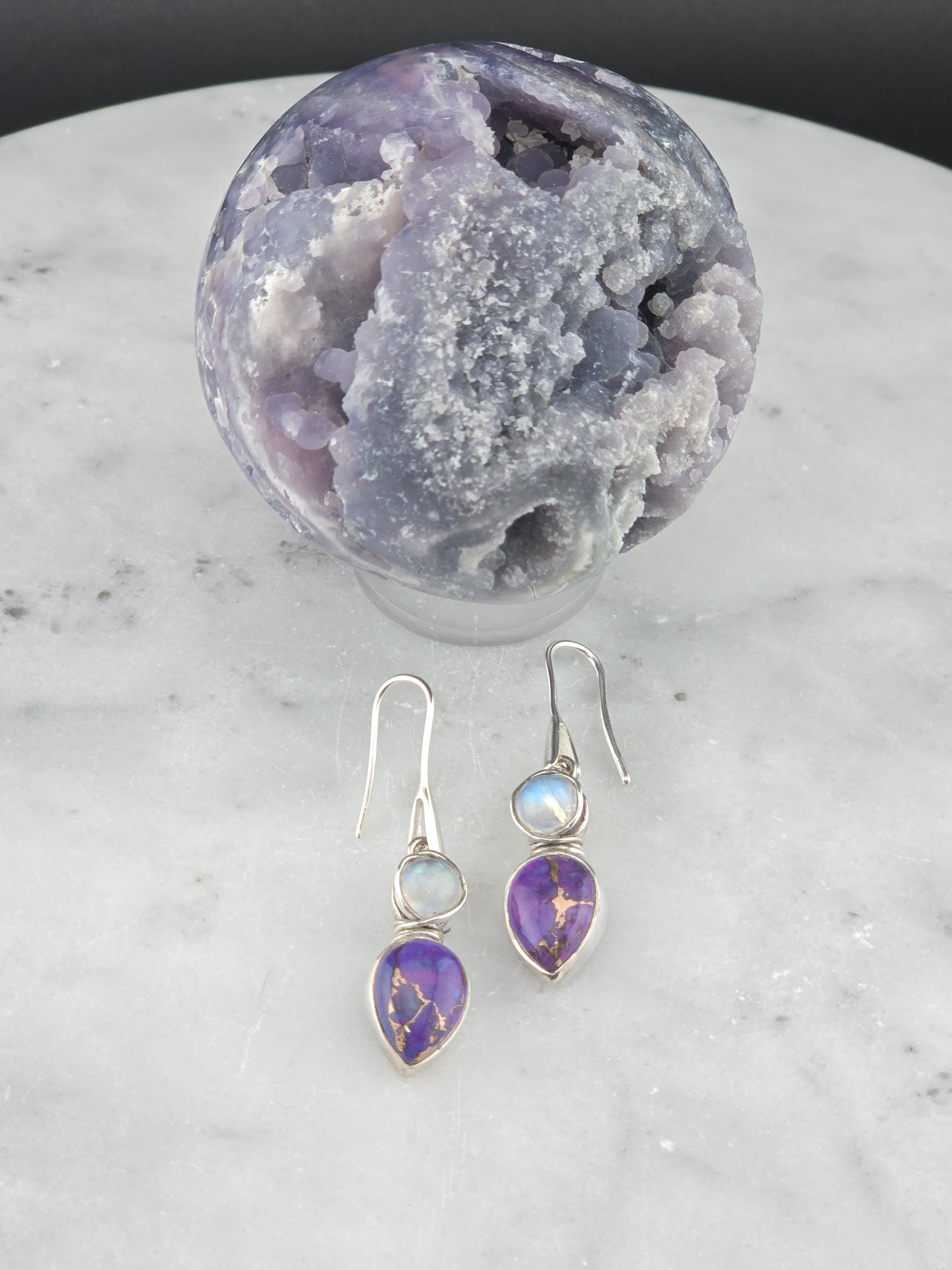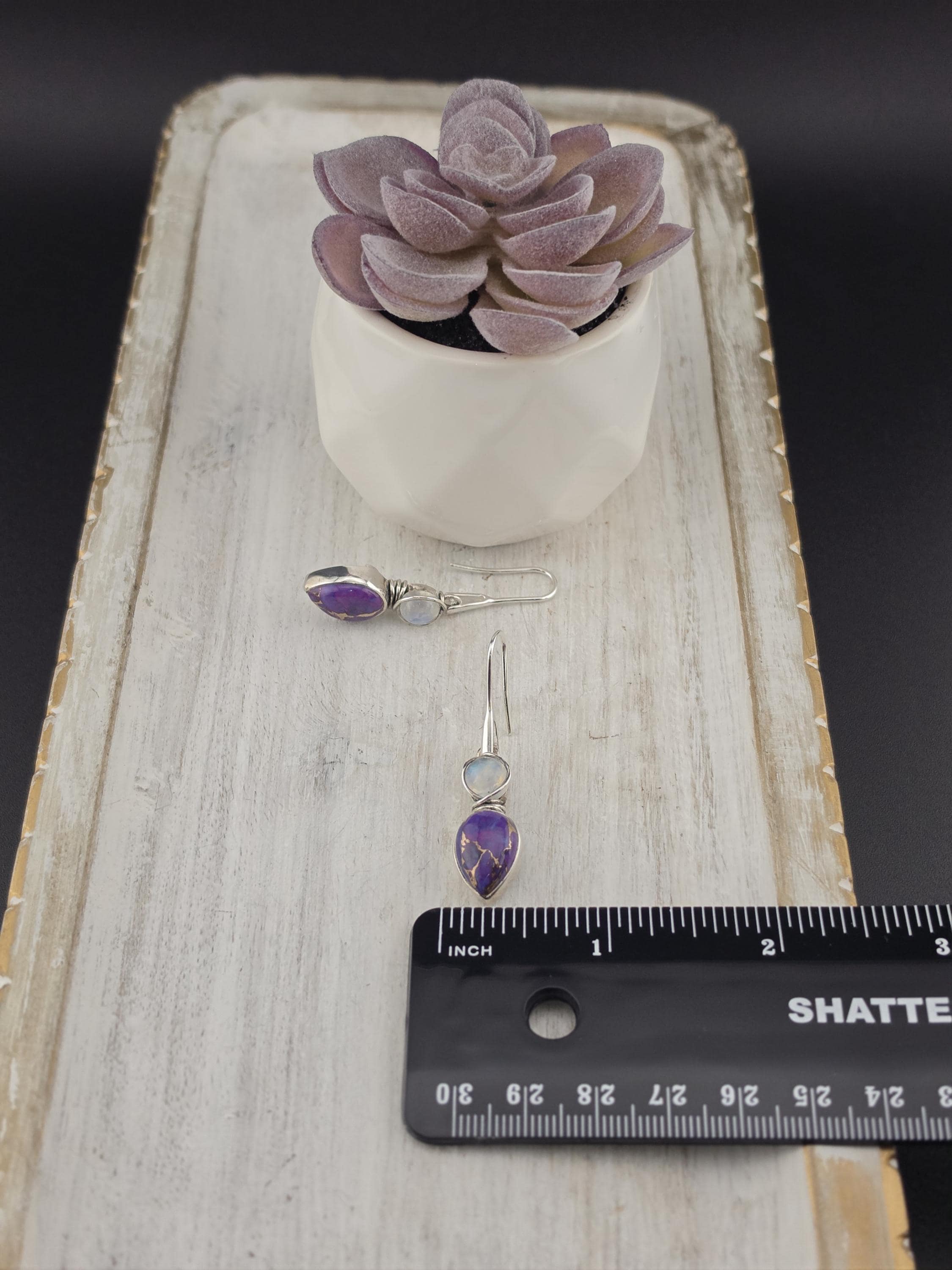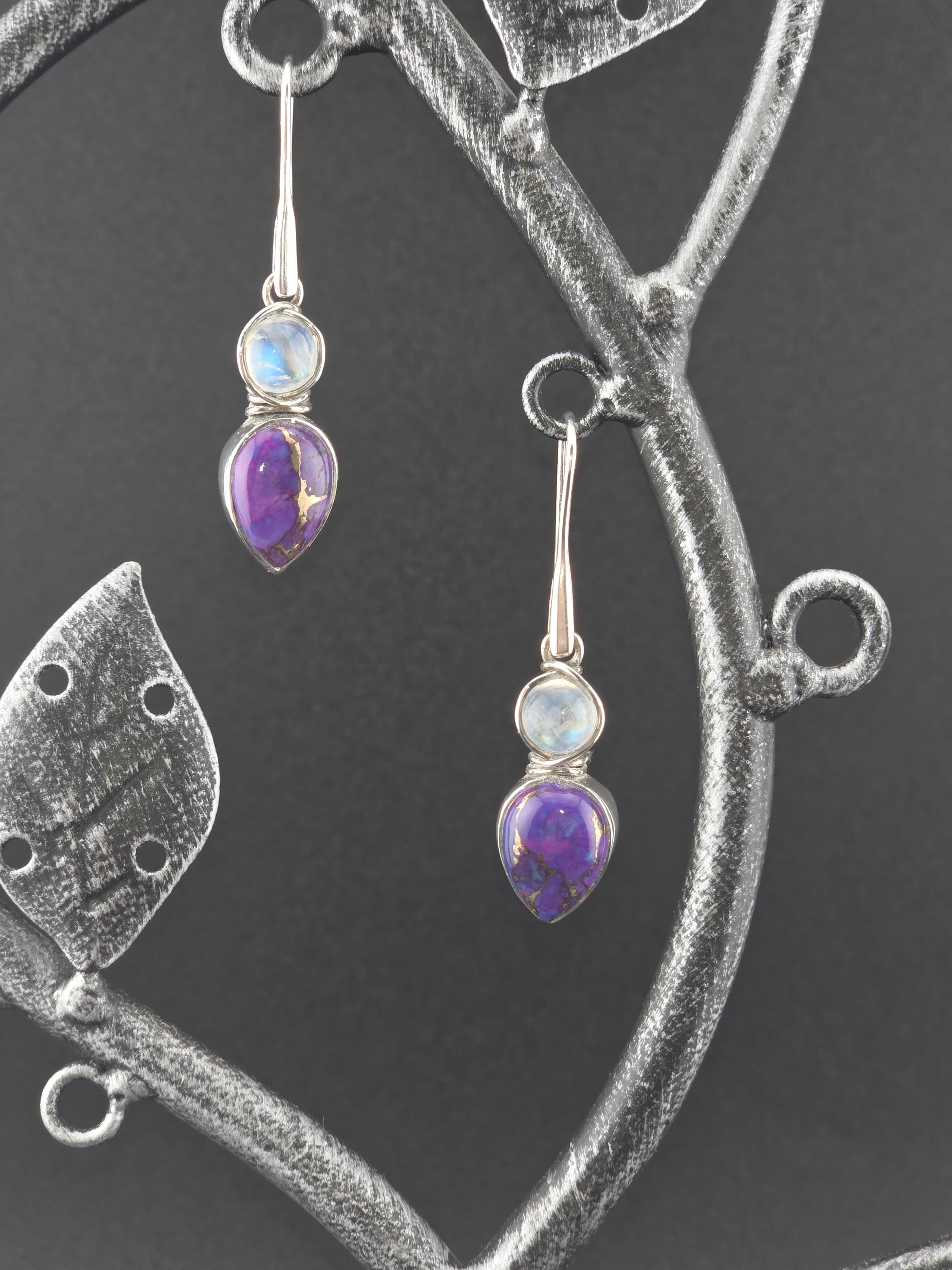 These are made using 925 sterling silver plated brass ear wire hook earrings. Hanging from each is a unique handcrafted wire wrapped round moonstone with a teardrop purple copper turquoise stone set in 925 sterling silver. * Your purchase will arrive in pretty packaging