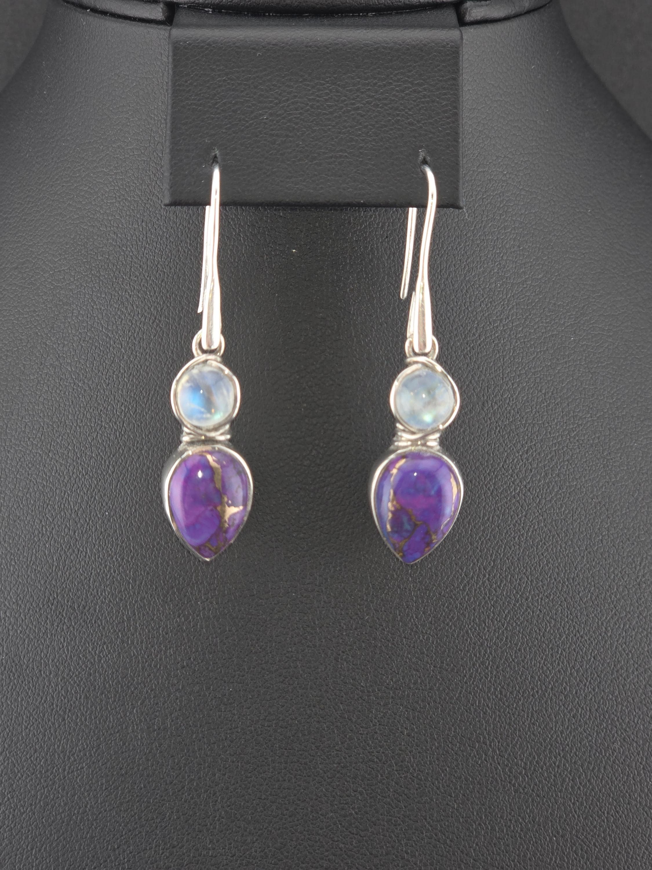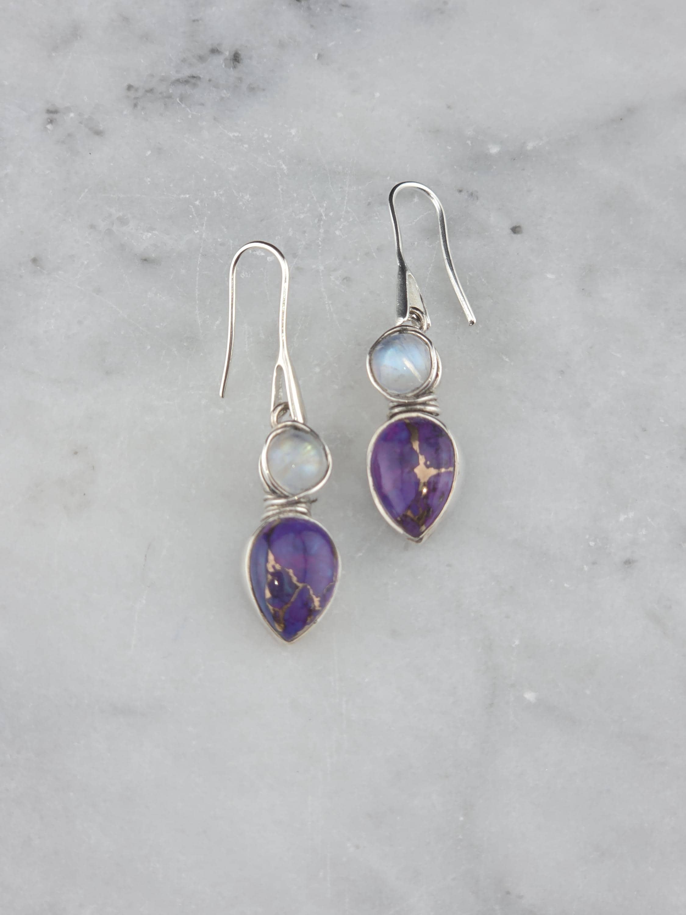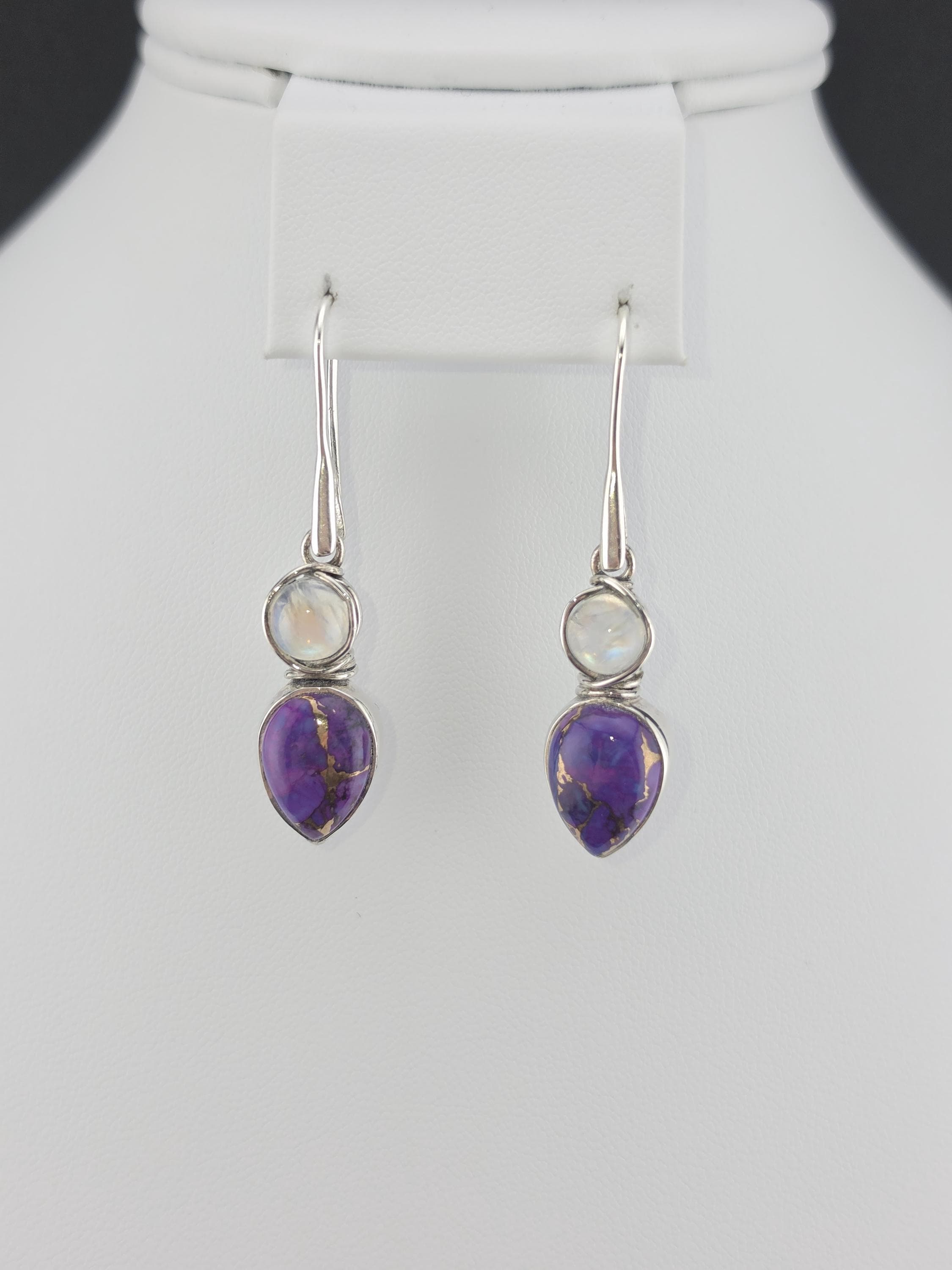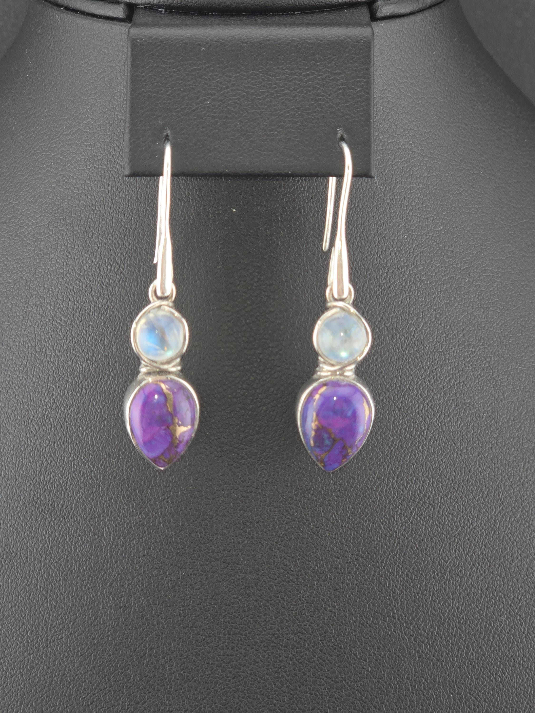 These are made using 925 sterling silver plated brass ear wire hook earrings. Hanging from each is a unique handcrafted wire wrapped round moonstone with a teardrop purple copper turquoise stone set in 925 sterling silver. * Your purchase will arrive in pretty packaging