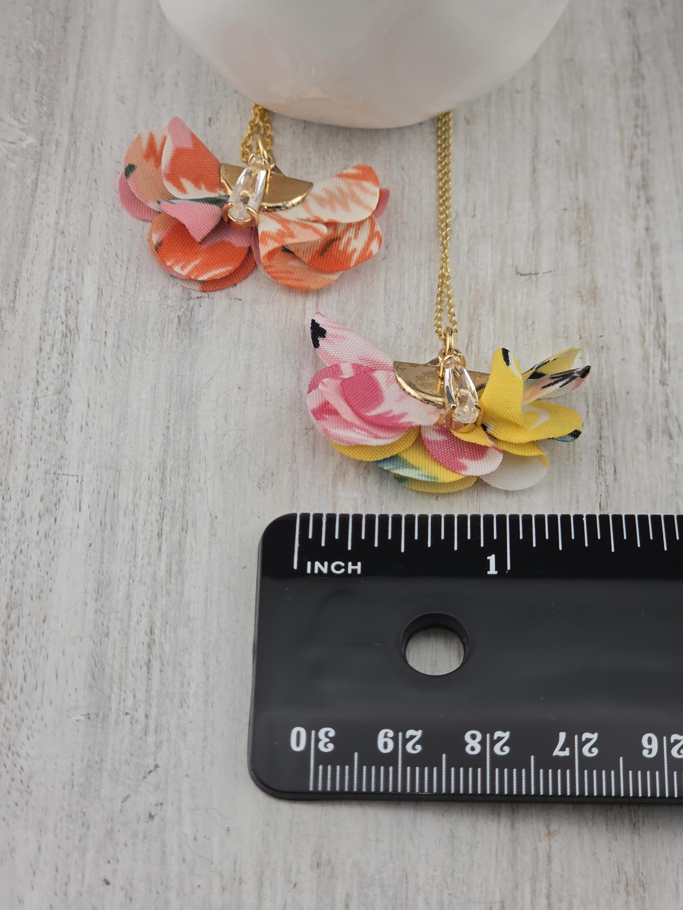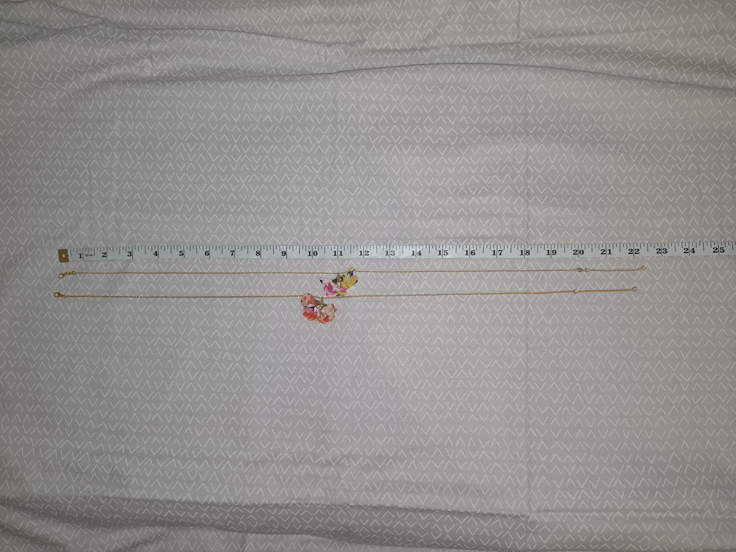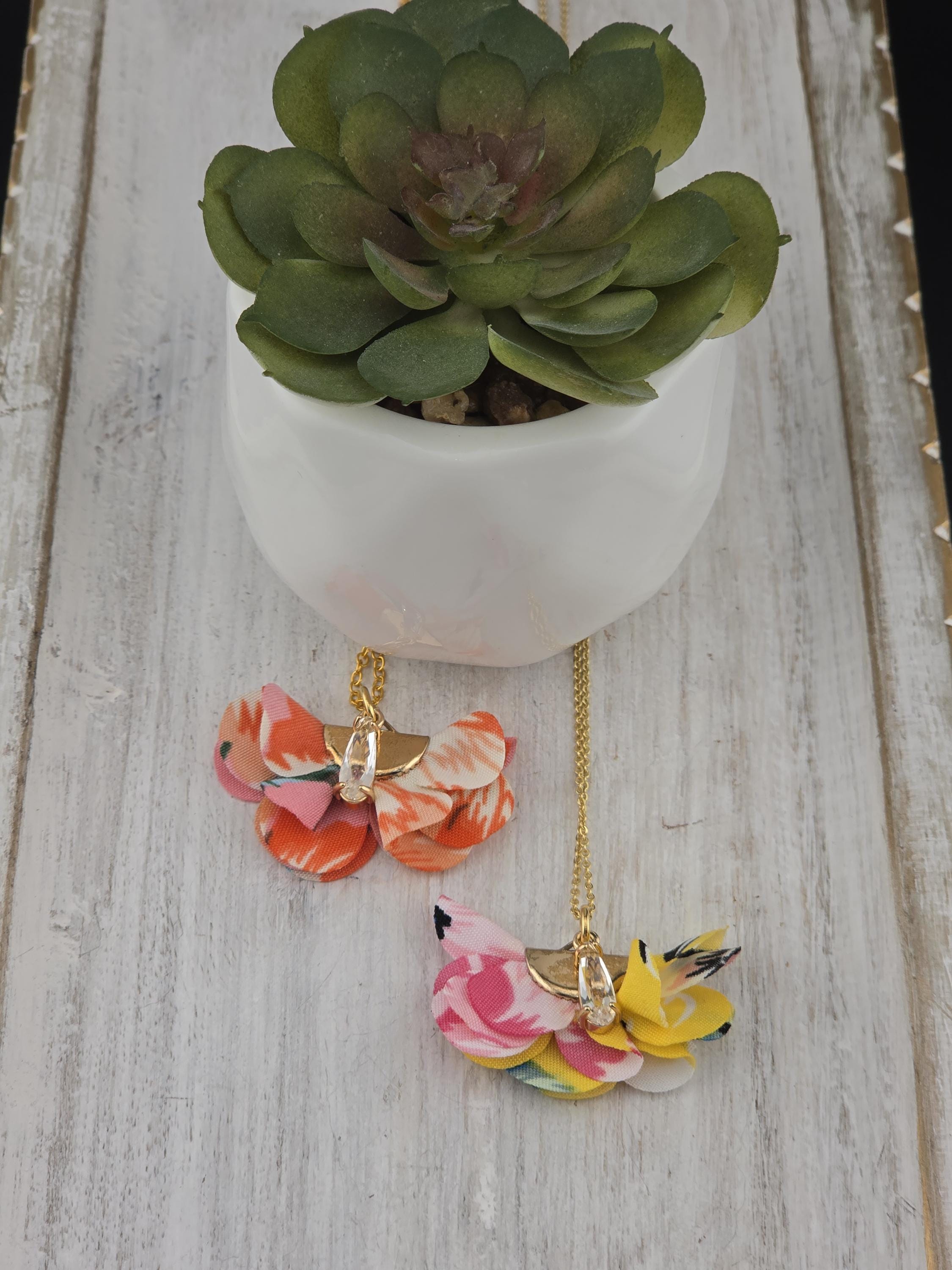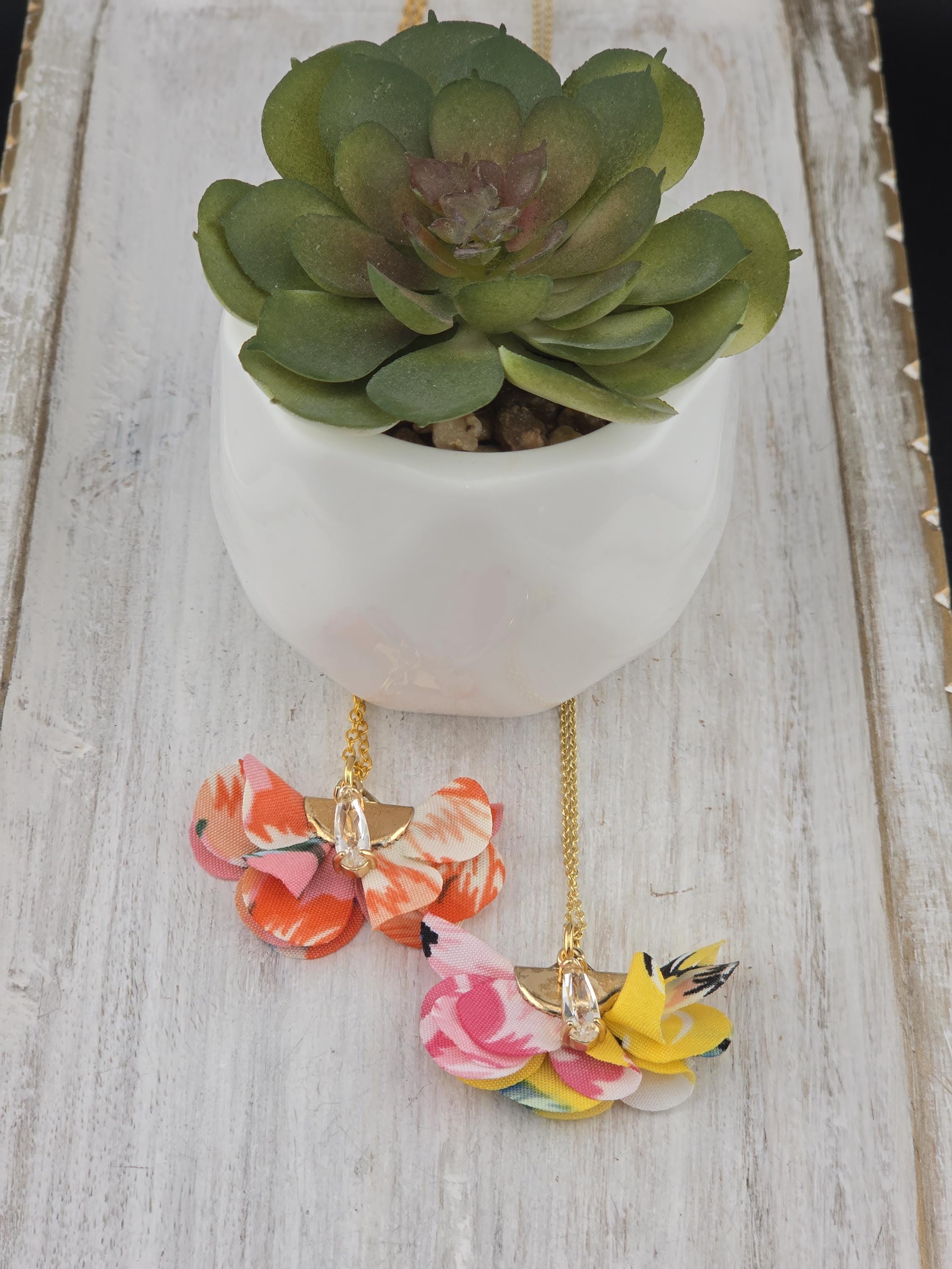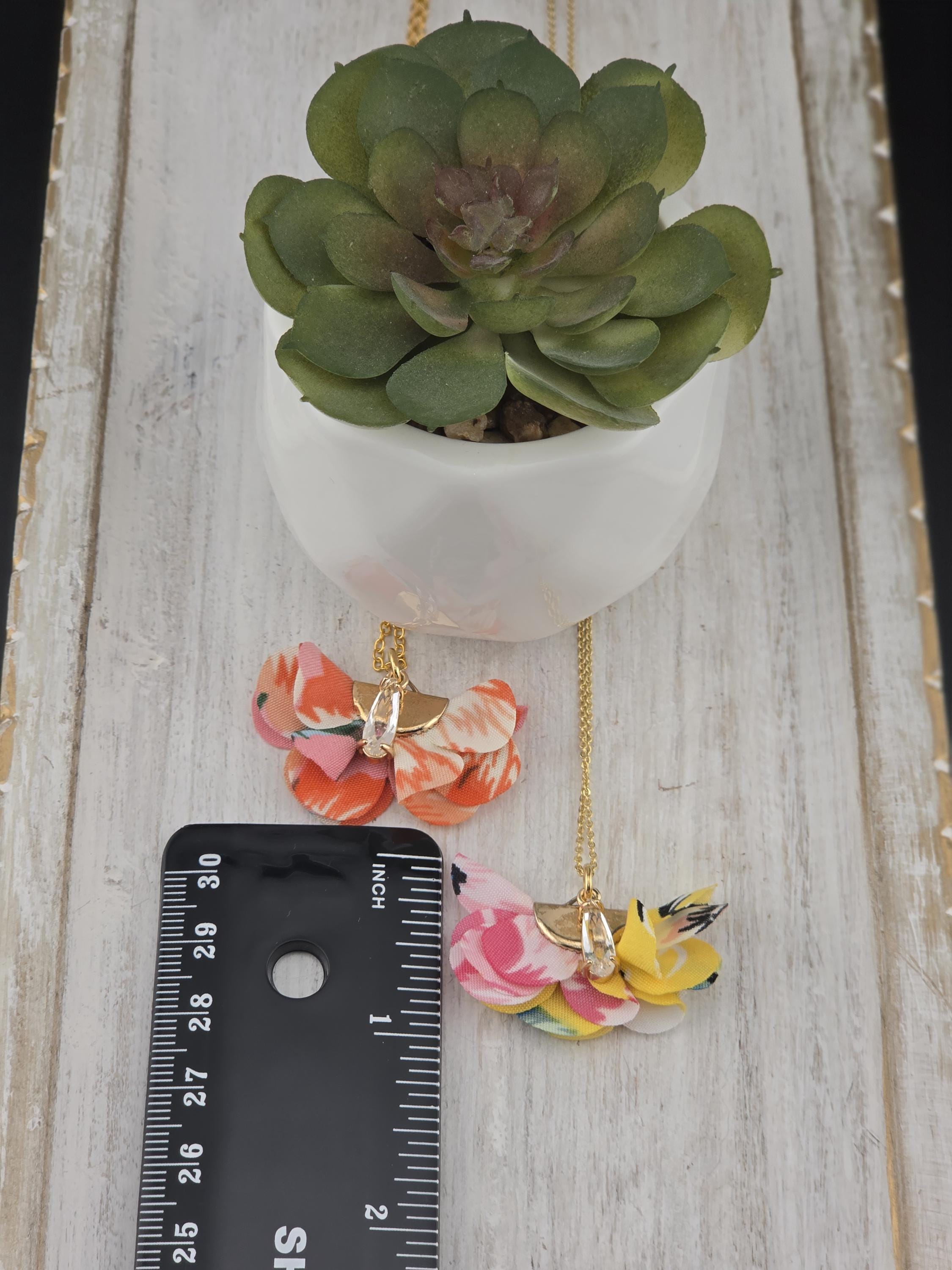 These necklaces were made using gold 925 sterling silver chain that have extenders making them adjustable from 20"-22" in length. The pendants are fabric flowers in yellow and peach. They each have a faceted teardrop crystal charm hanging from them, one clear & the other purple. They have 18k gold plated connecting rings. * Your purchase will arrive in pretty packaging