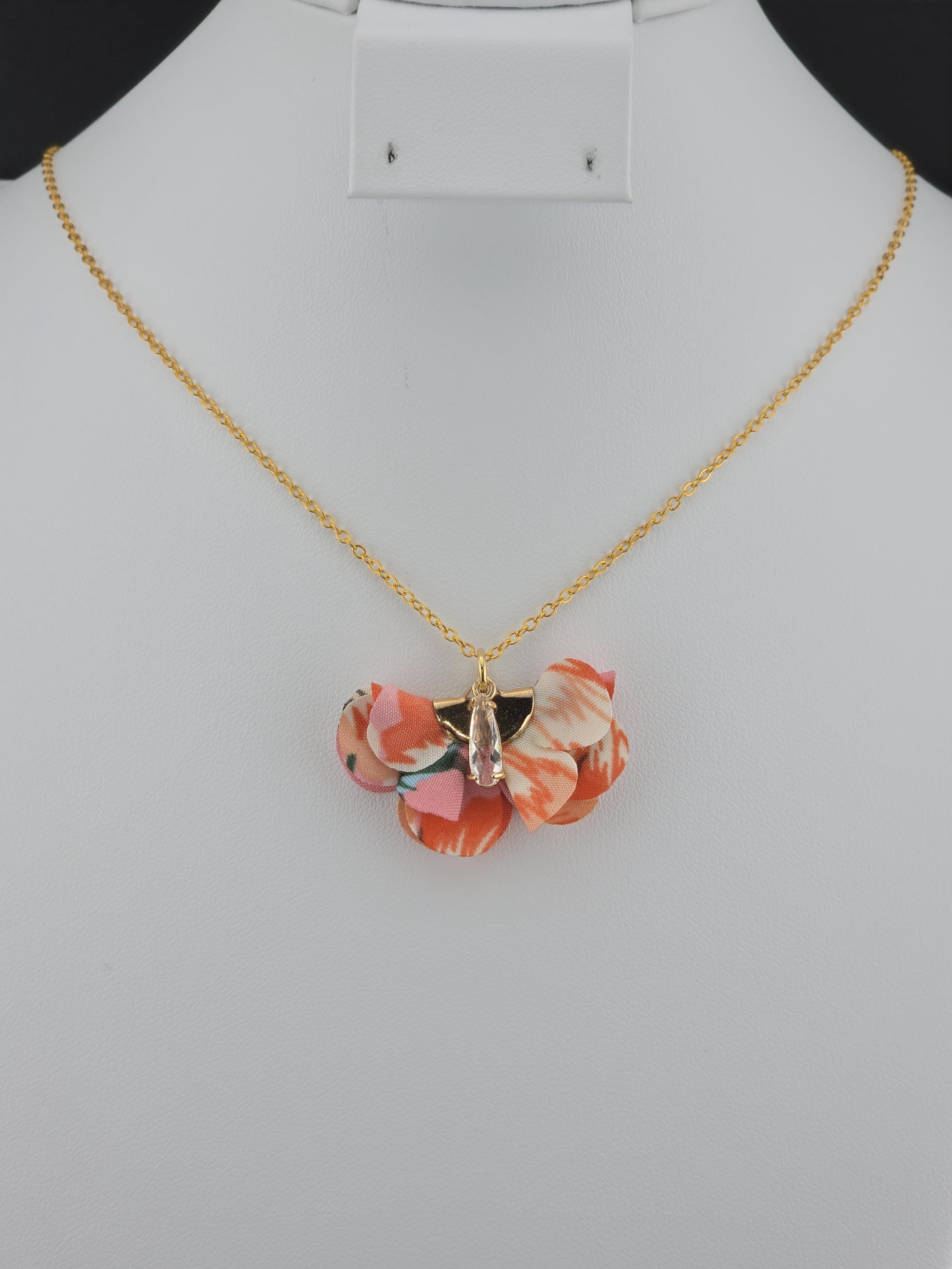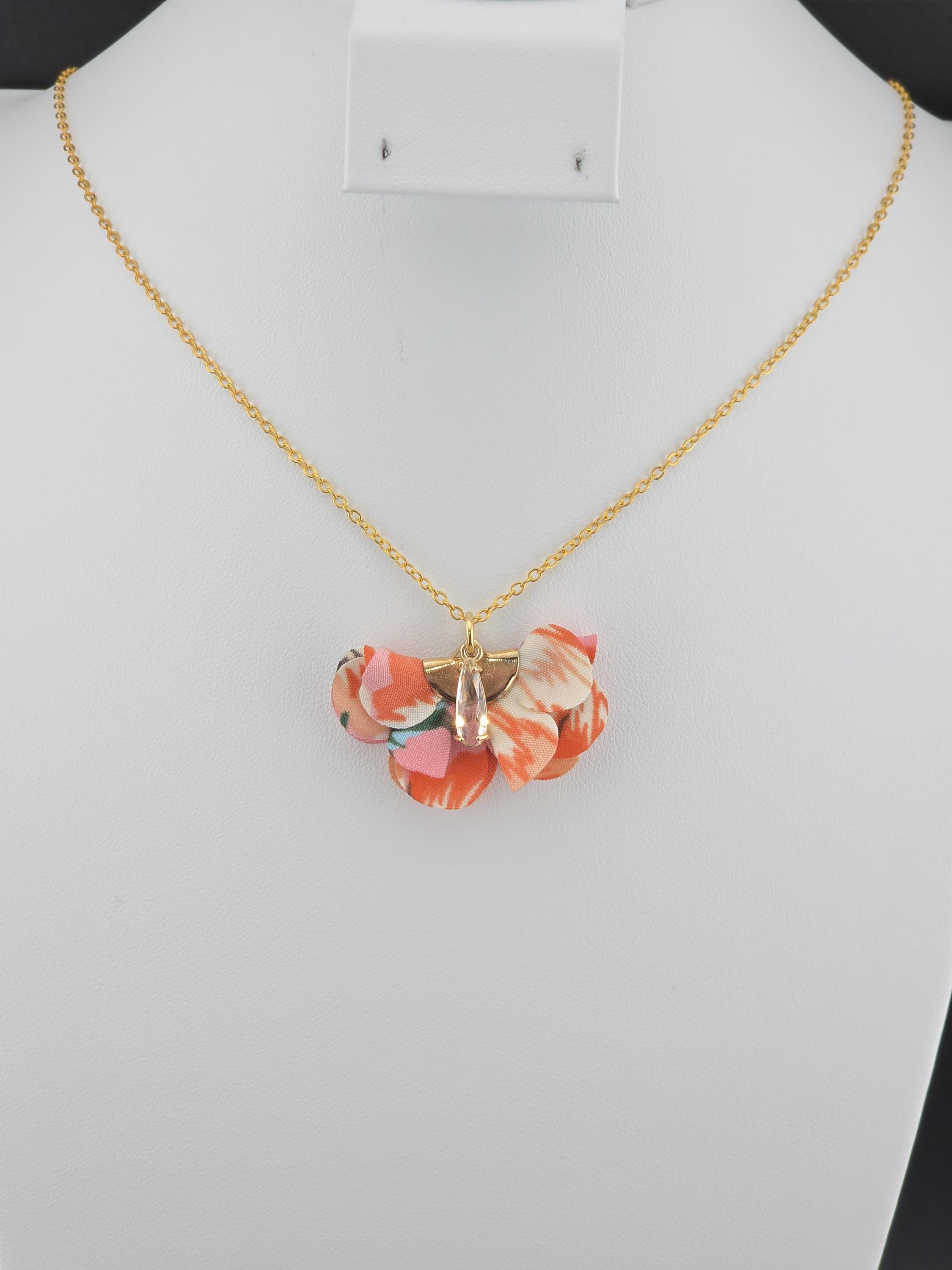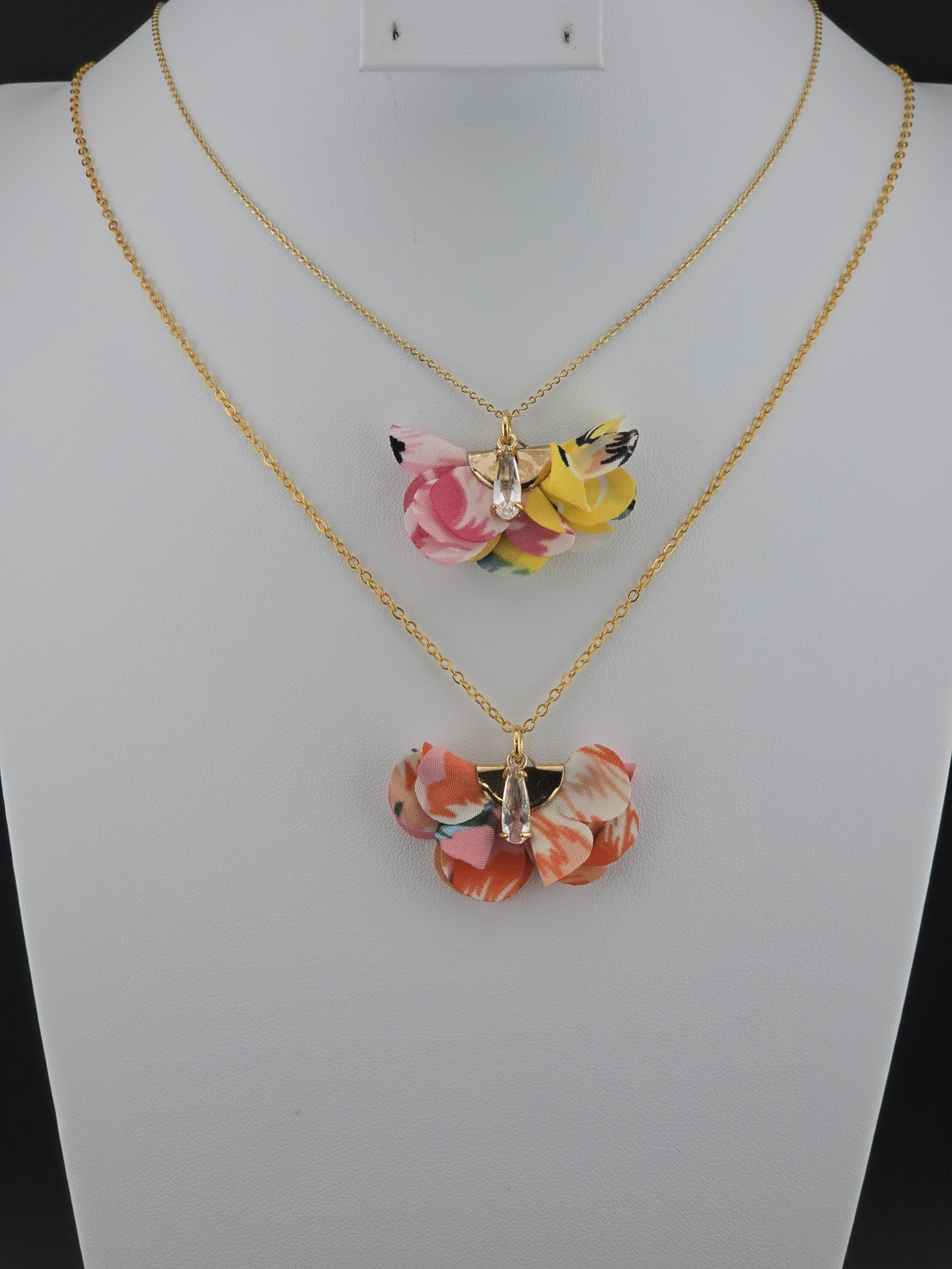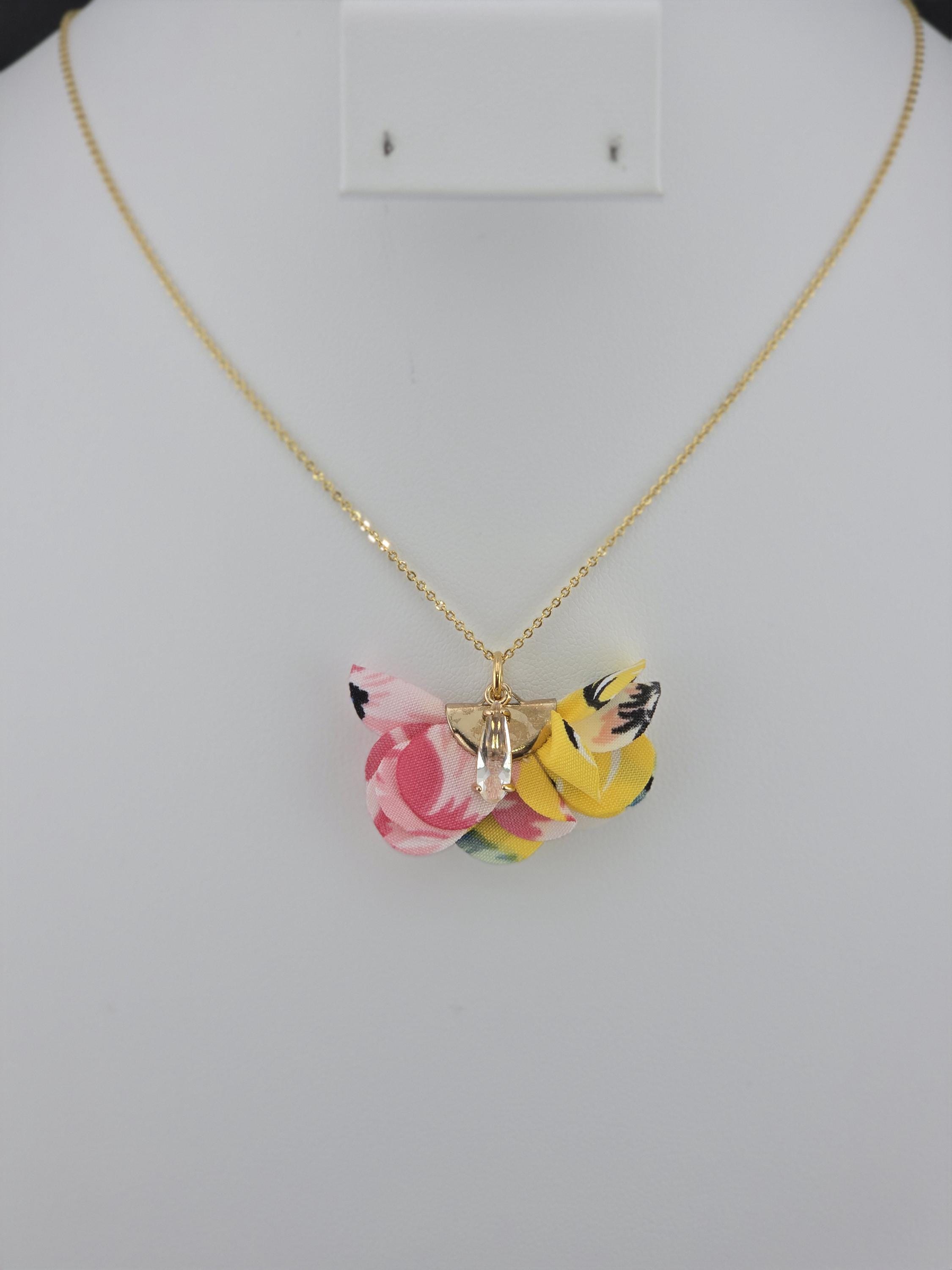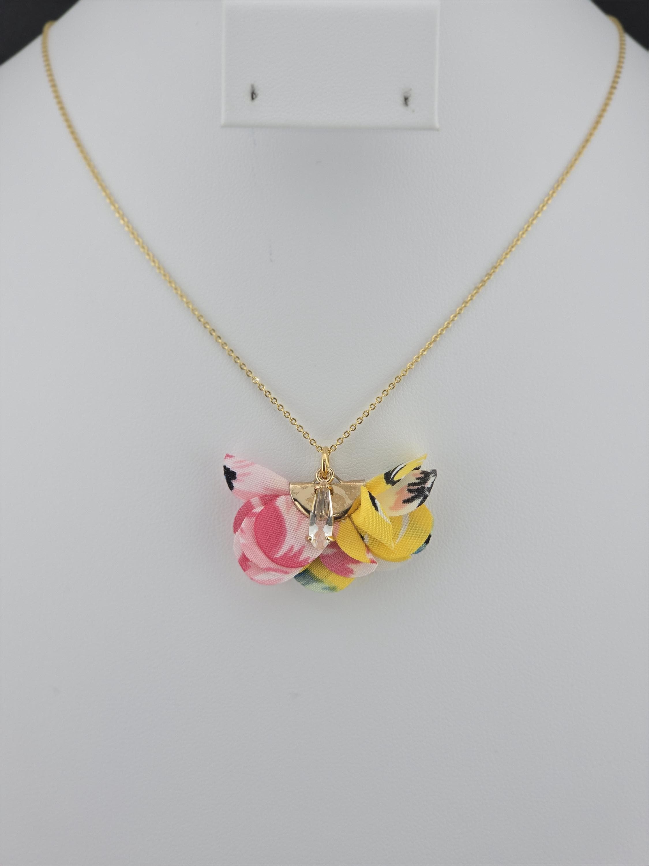 These necklaces were made using gold 925 sterling silver chain that have extenders making them adjustable from 20"-22" in length. The pendants are fabric flowers in yellow and peach. They each have a faceted teardrop crystal charm hanging from them, one clear & the other purple. They have 18k gold plated connecting rings. * Your purchase will arrive in pretty packaging