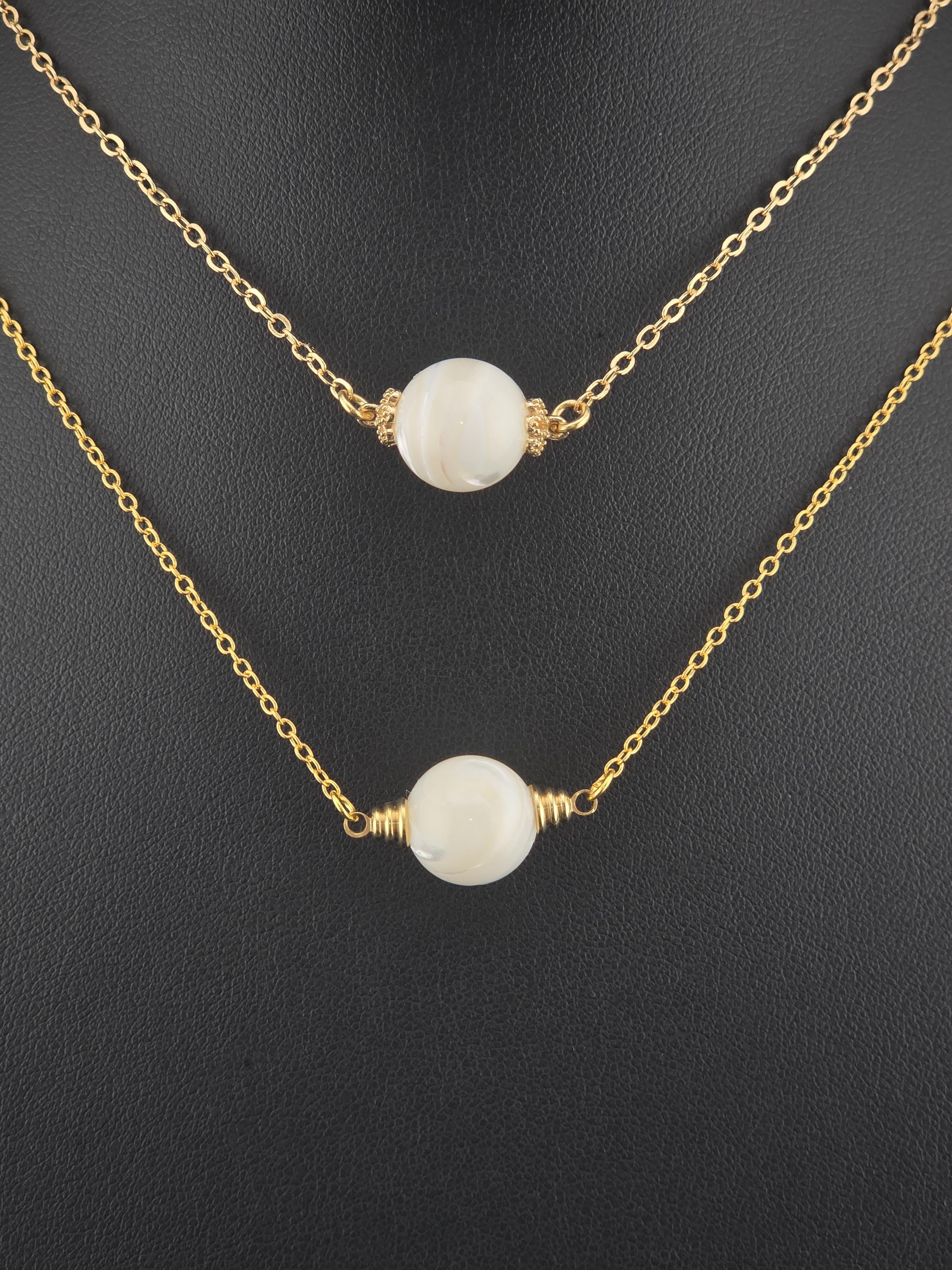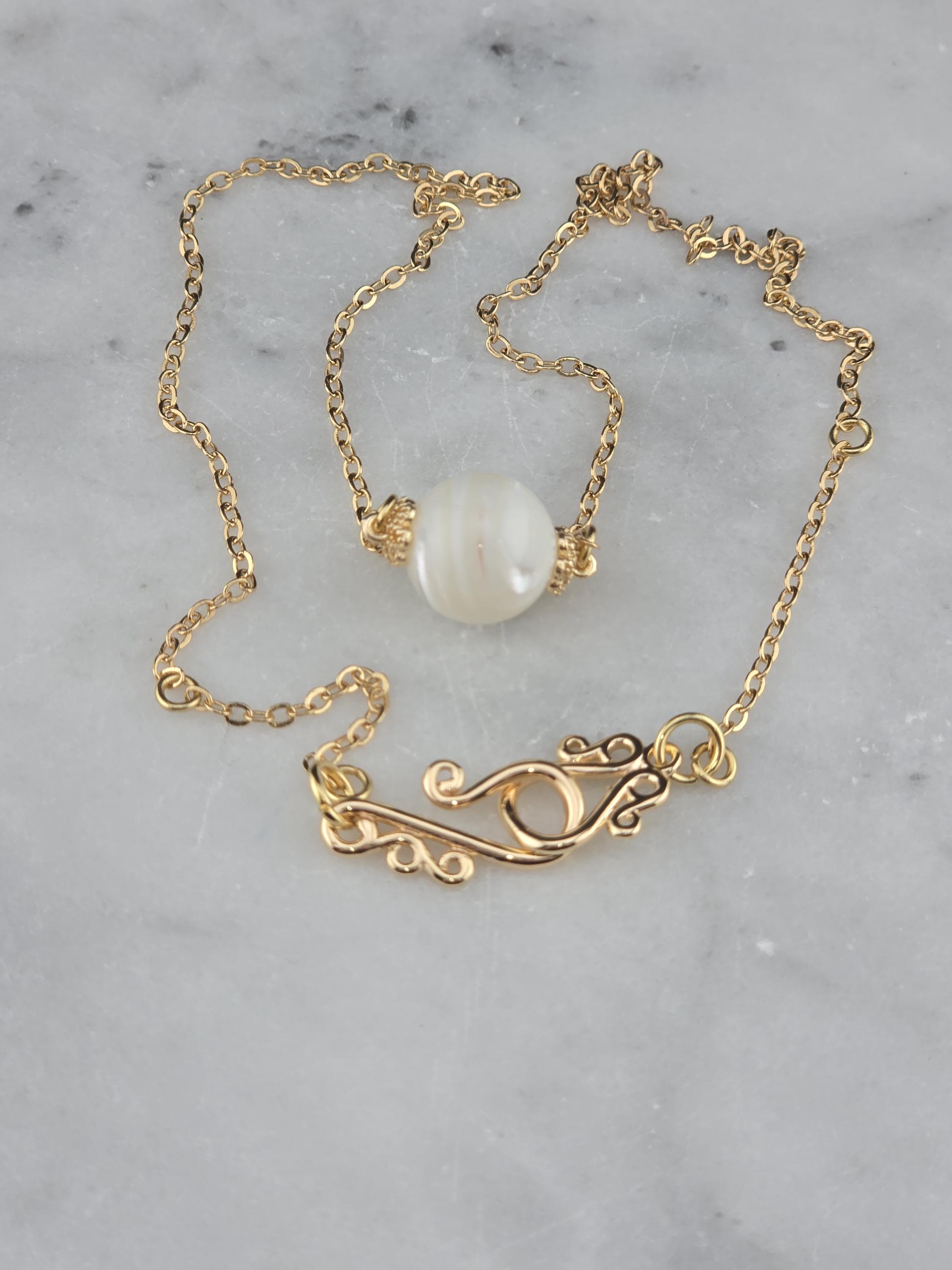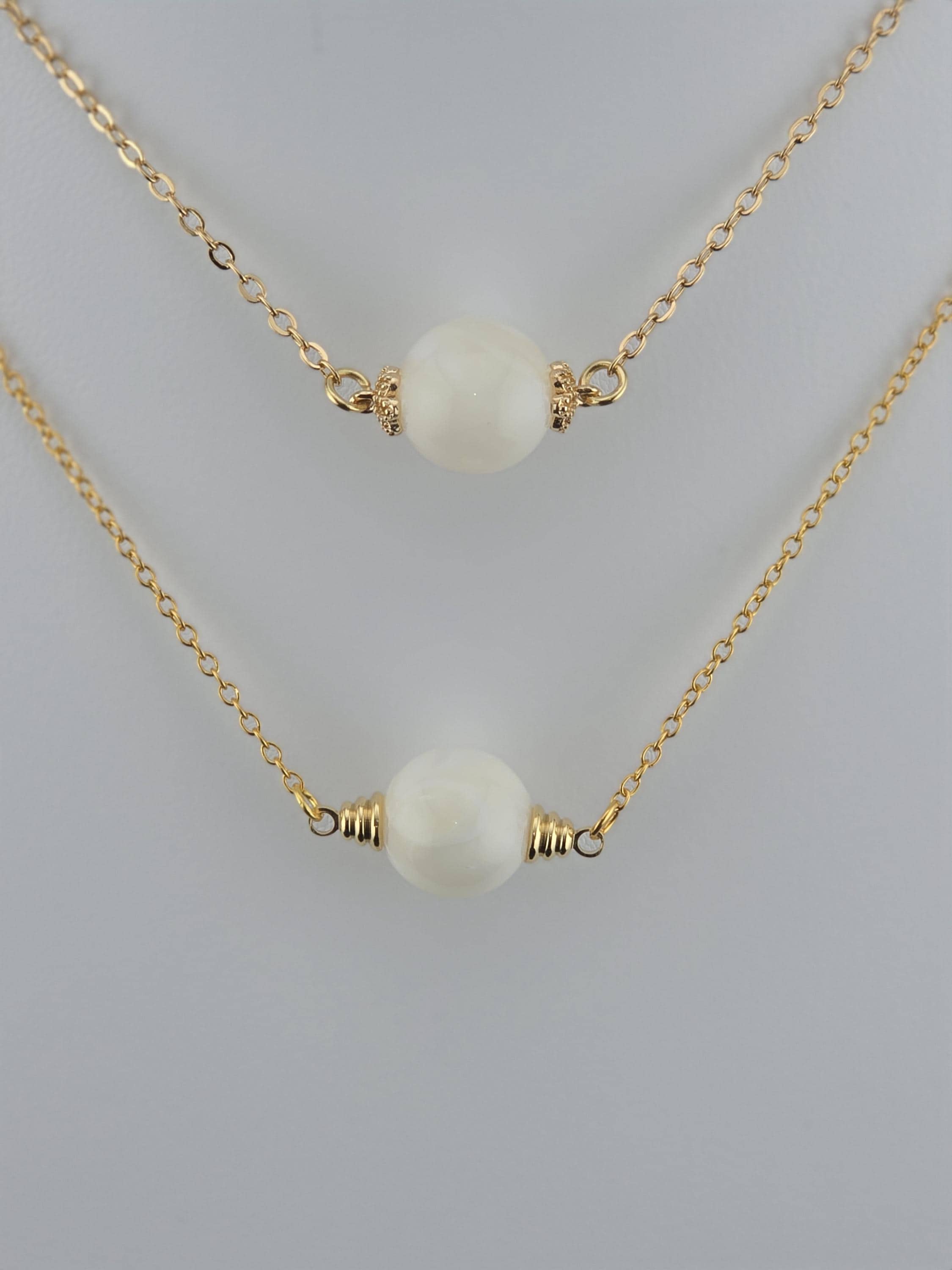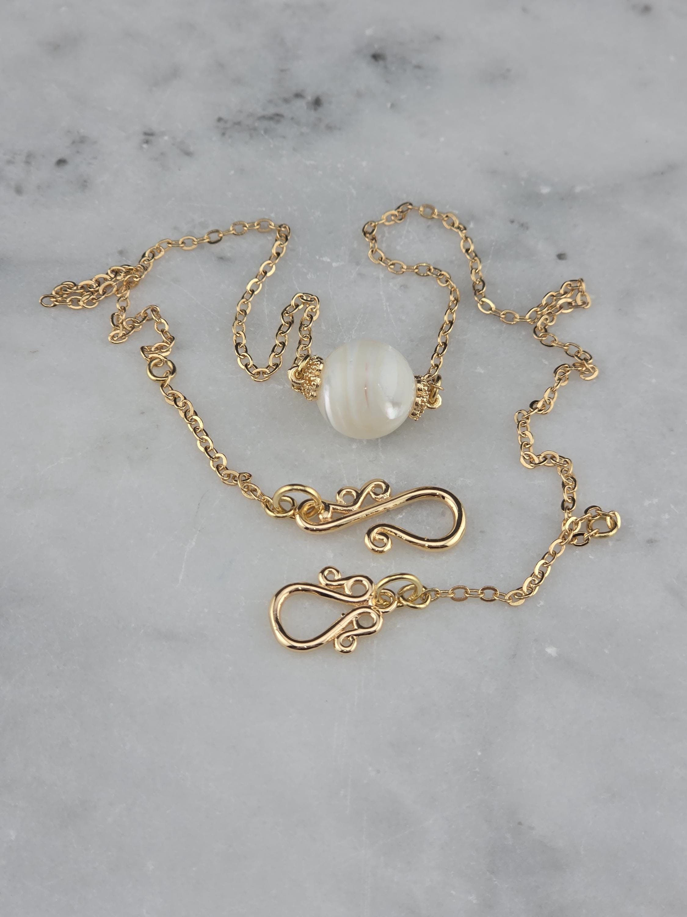 These were made using delicate 18k gold plated brass chain. In the center of each is a 12mm iridescent white Mother of Pearl connected by 16k gold plated caps. The clasps at the closure of the necklaces are ornate hooks. All connecting rings are 18k gold plated. * Your purchase will arrive in pretty packaging