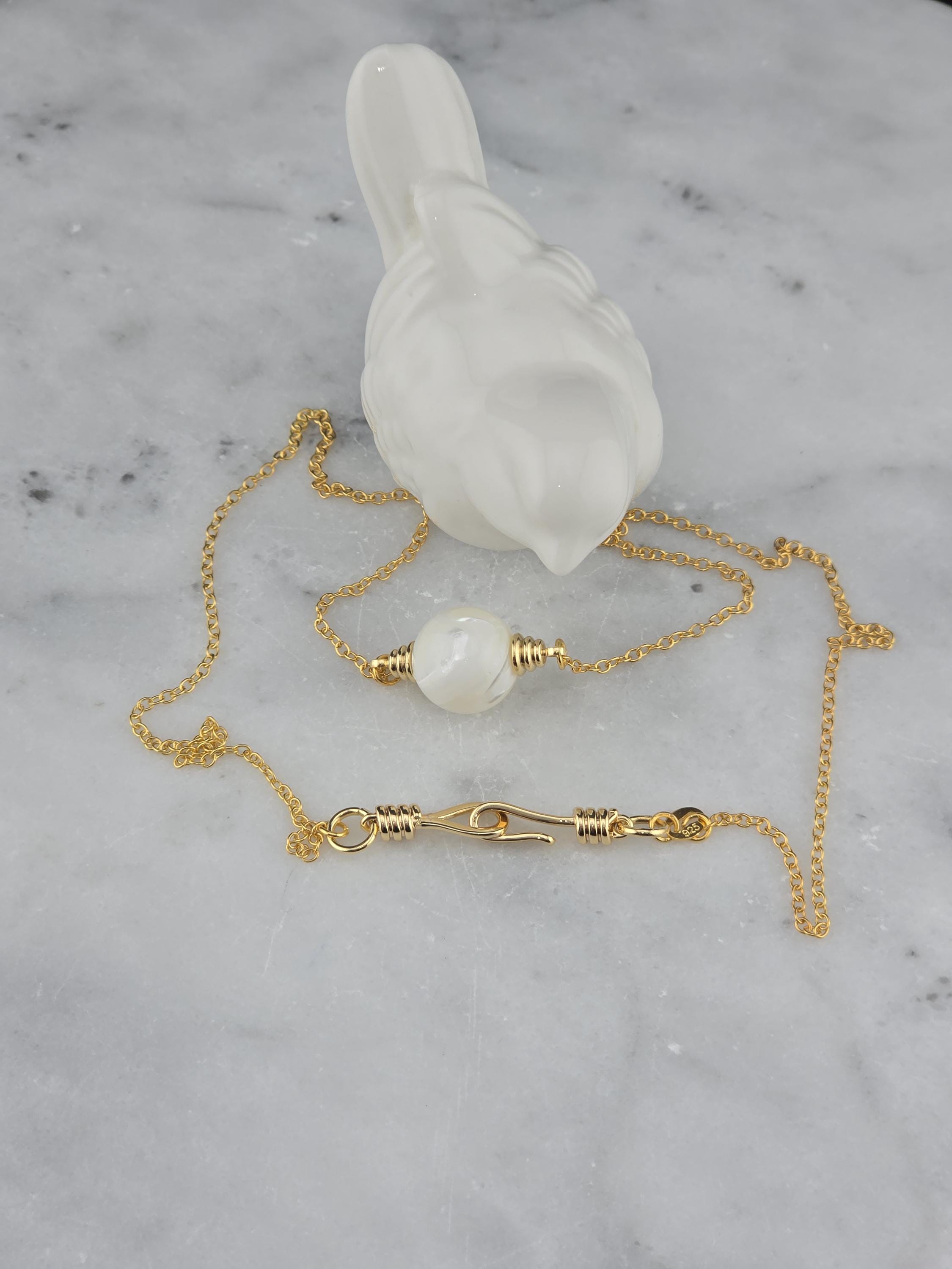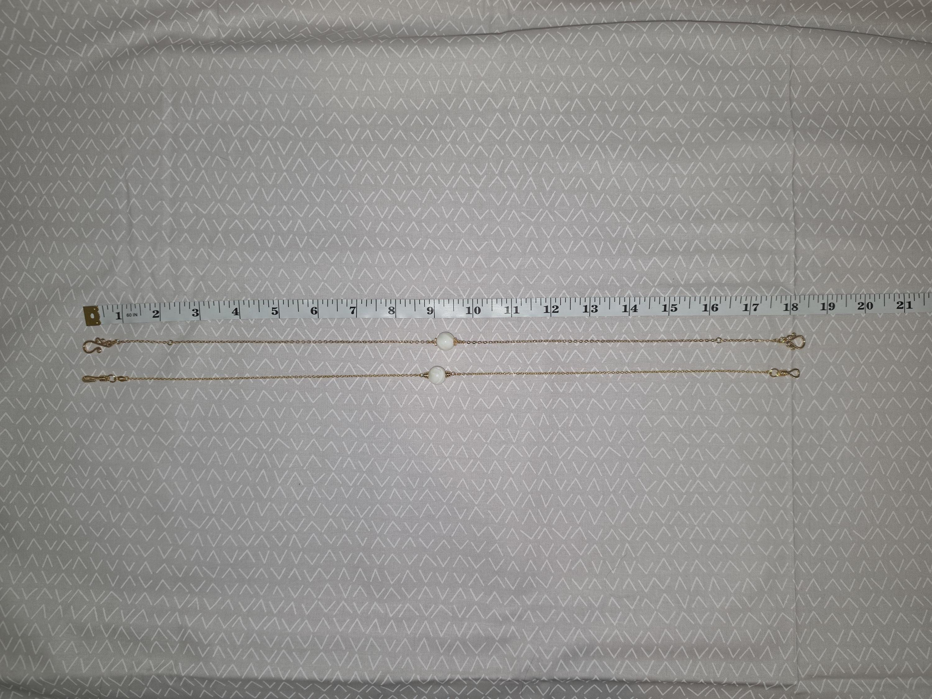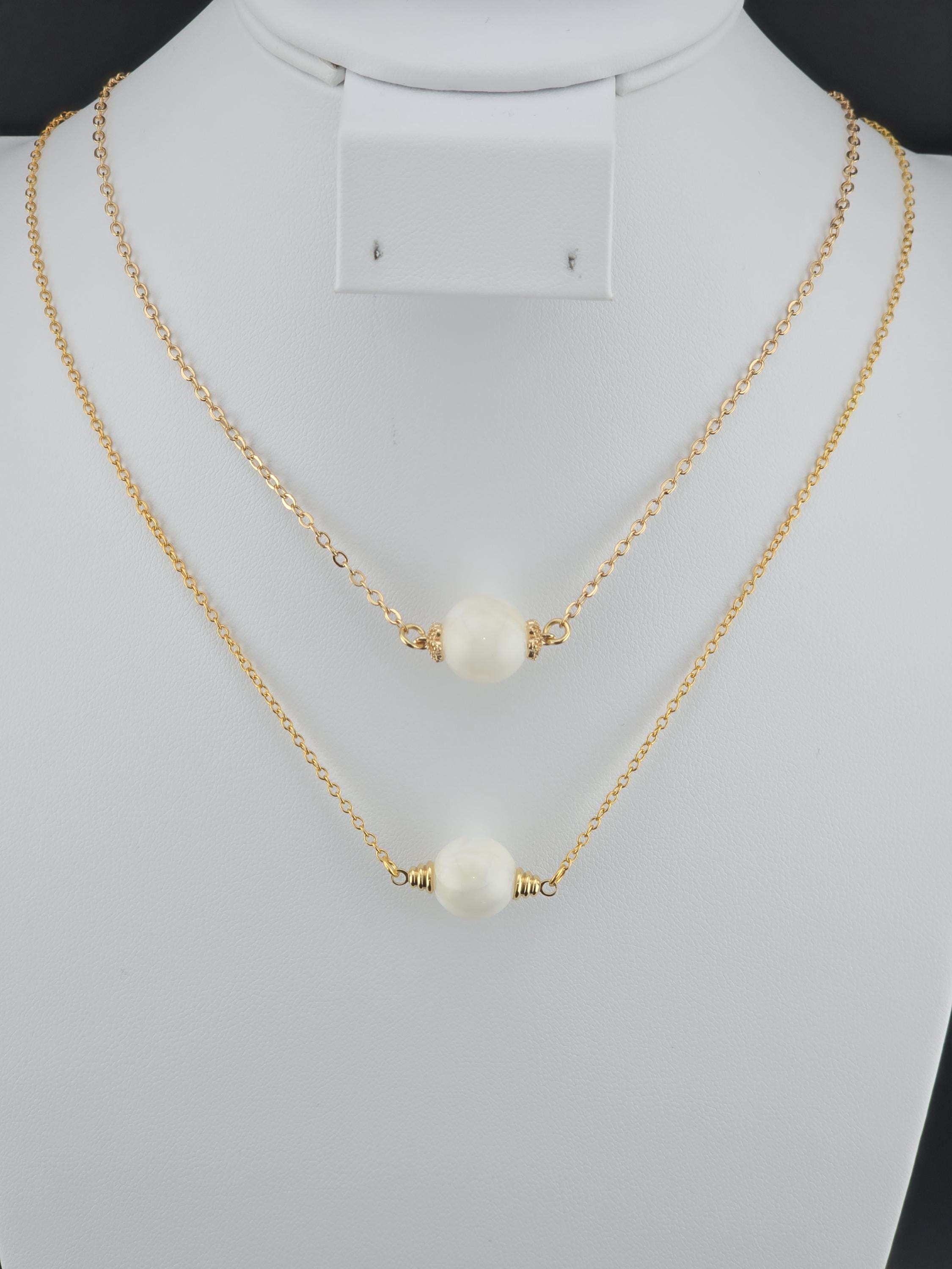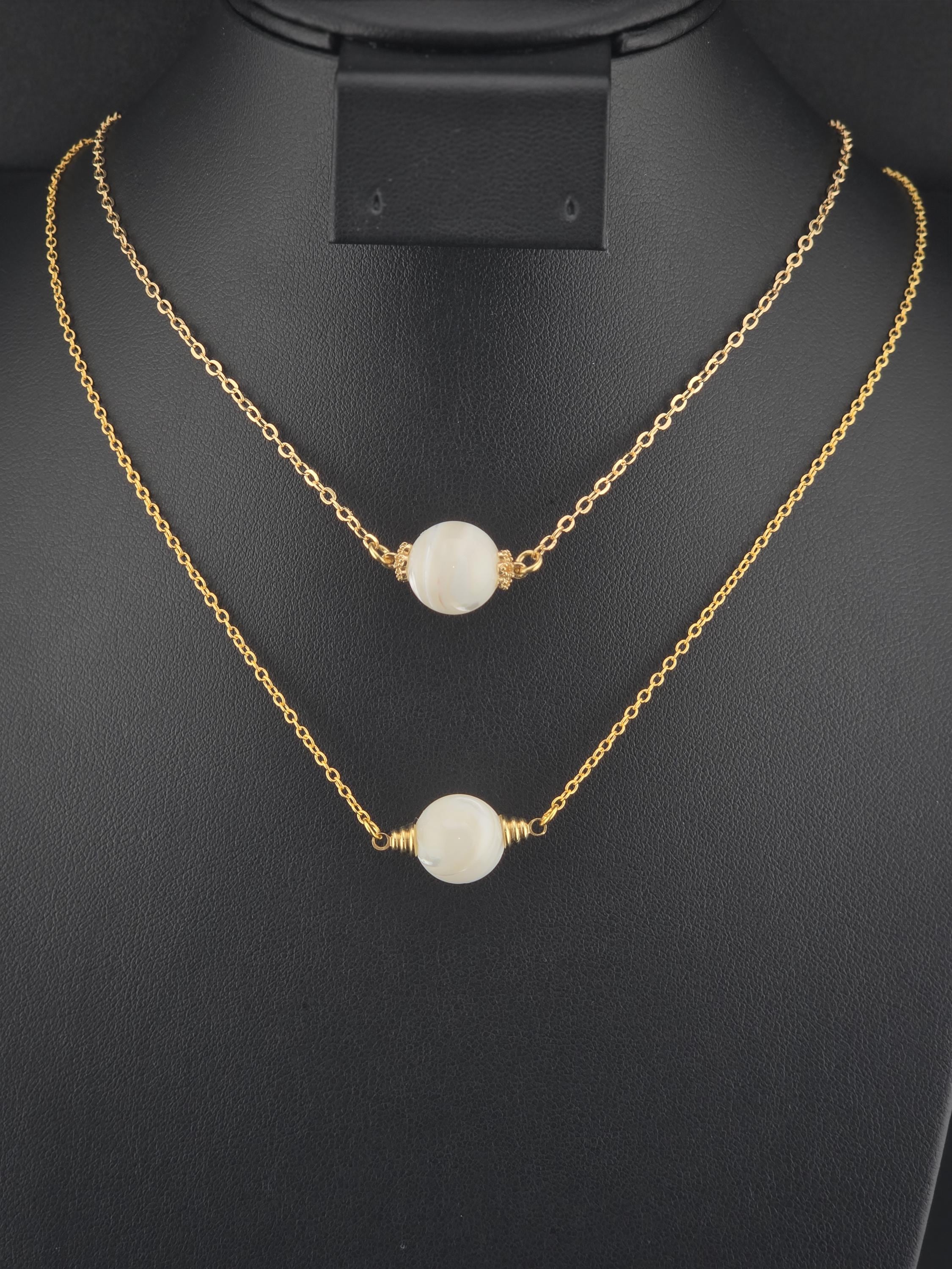 These were made using delicate 18k gold plated brass chain. In the center of each is a 12mm iridescent white Mother of Pearl connected by 16k gold plated caps. The clasps at the closure of the necklaces are ornate hooks. All connecting rings are 18k gold plated. * Your purchase will arrive in pretty packaging