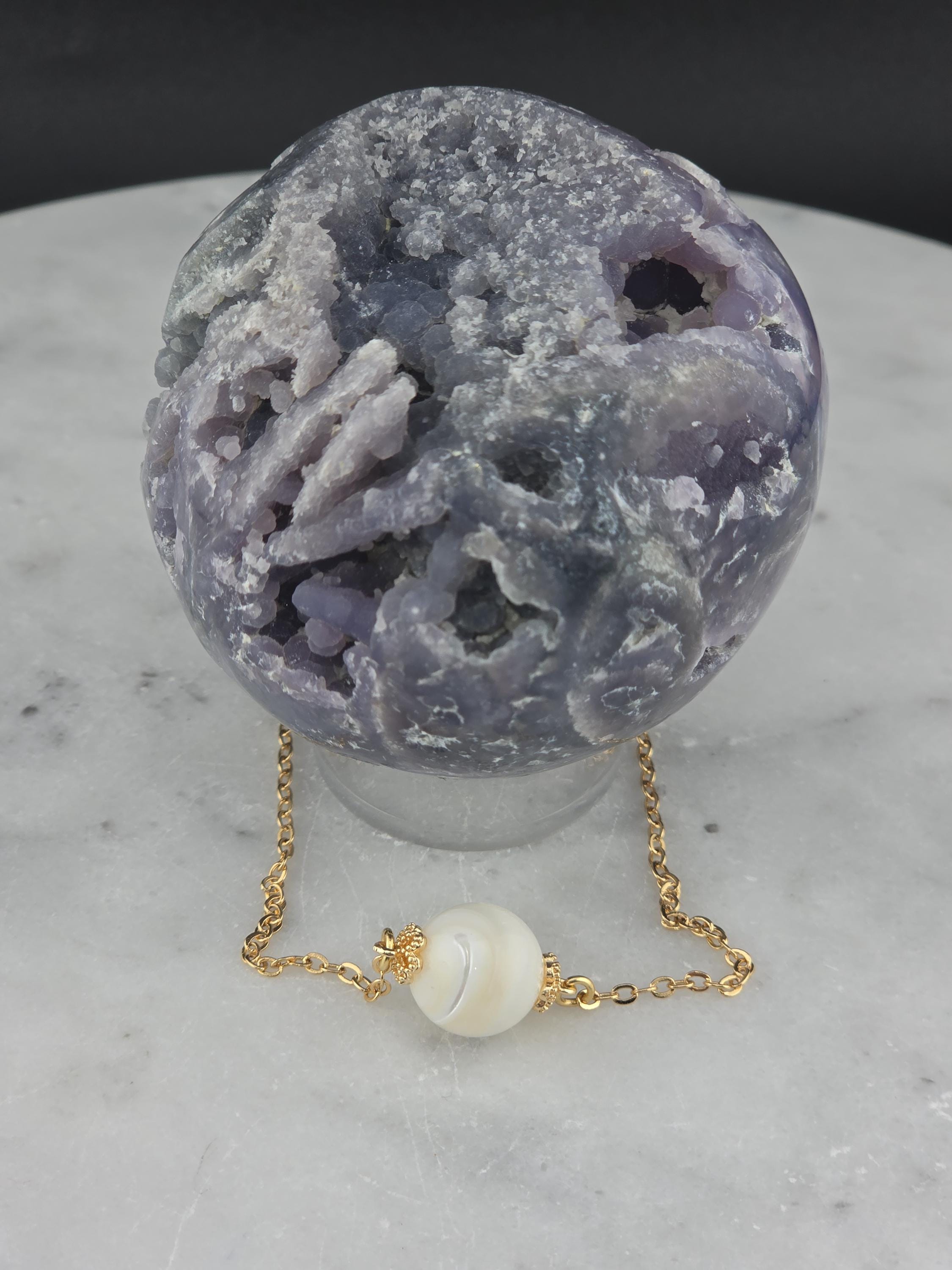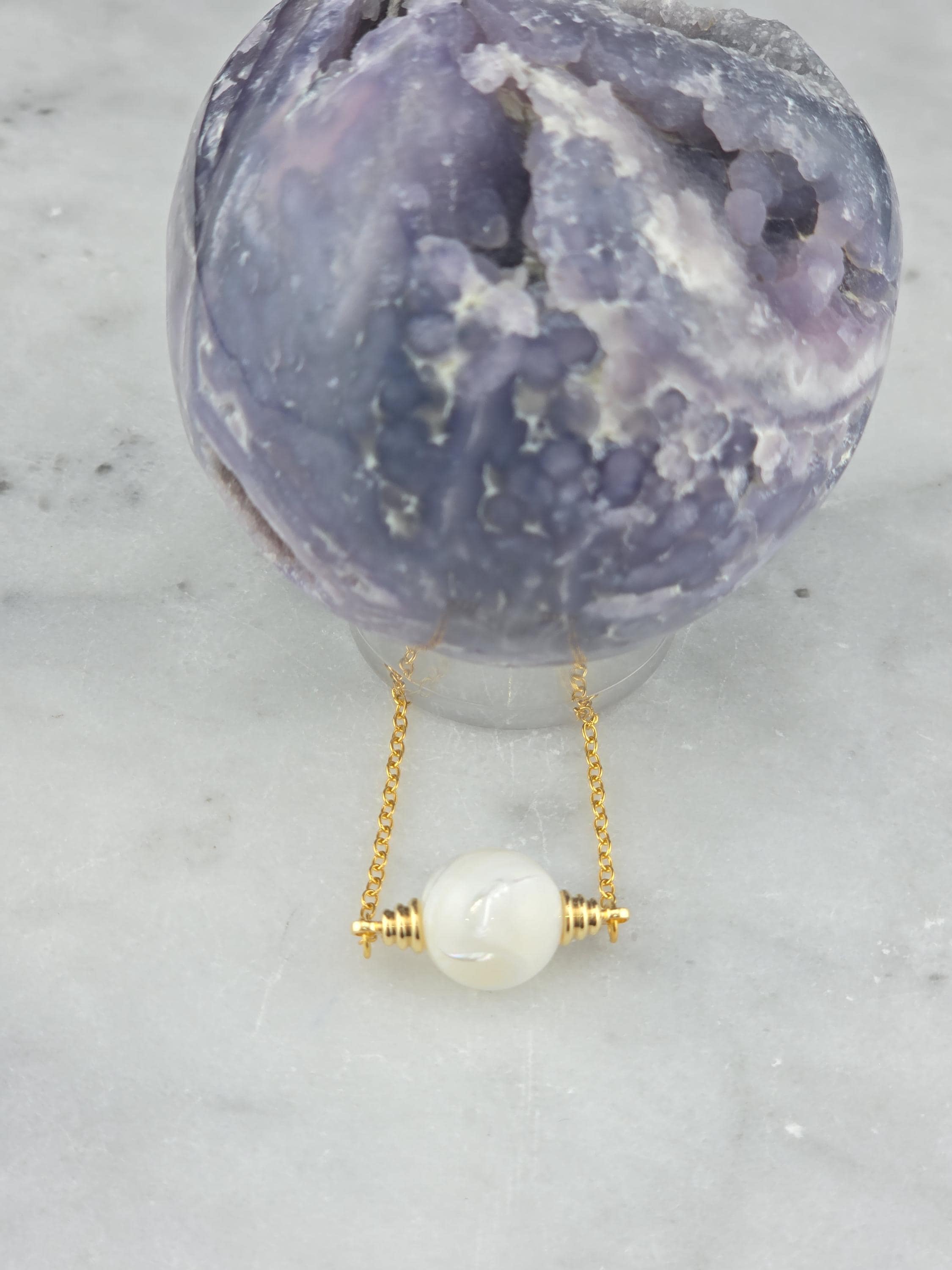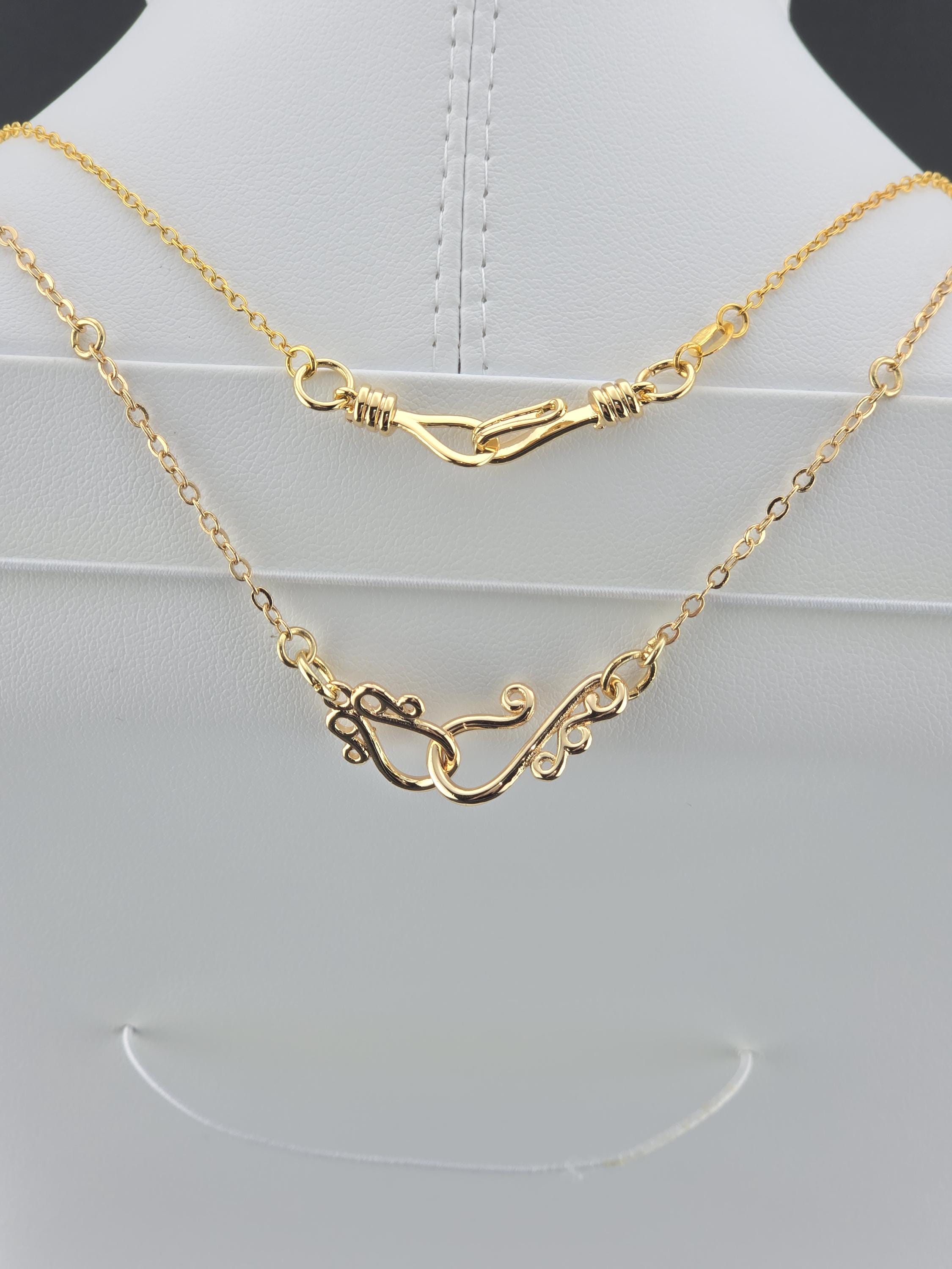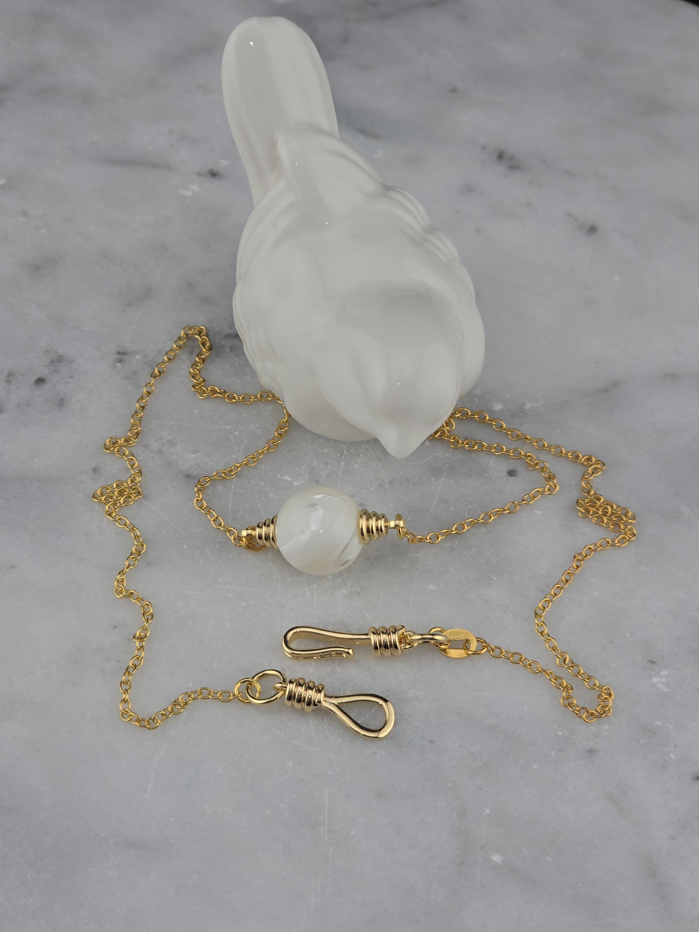 These were made using delicate 18k gold plated brass chain. In the center of each is a 12mm iridescent white Mother of Pearl connected by 16k gold plated caps. The clasps at the closure of the necklaces are ornate hooks. All connecting rings are 18k gold plated. * Your purchase will arrive in pretty packaging