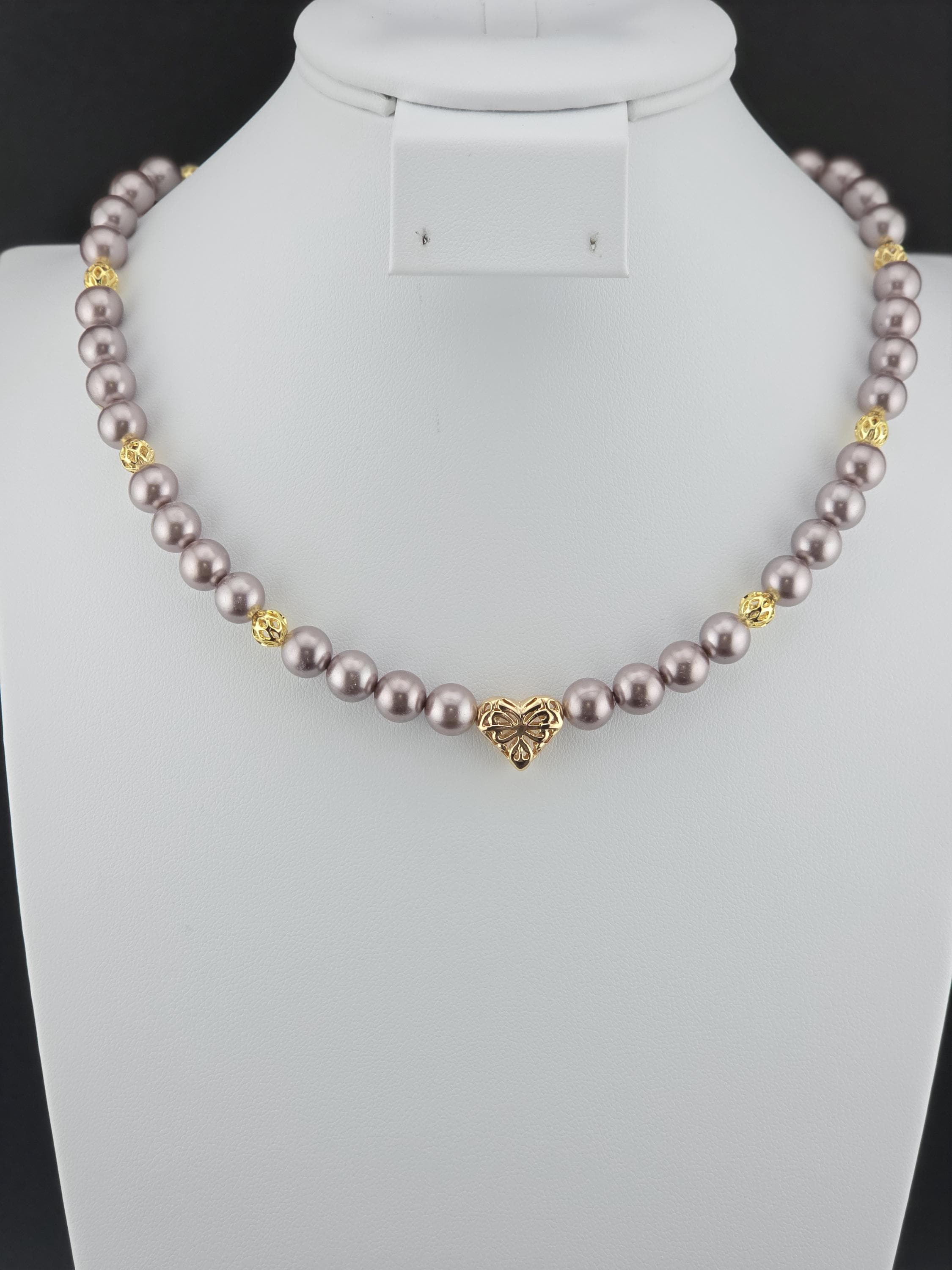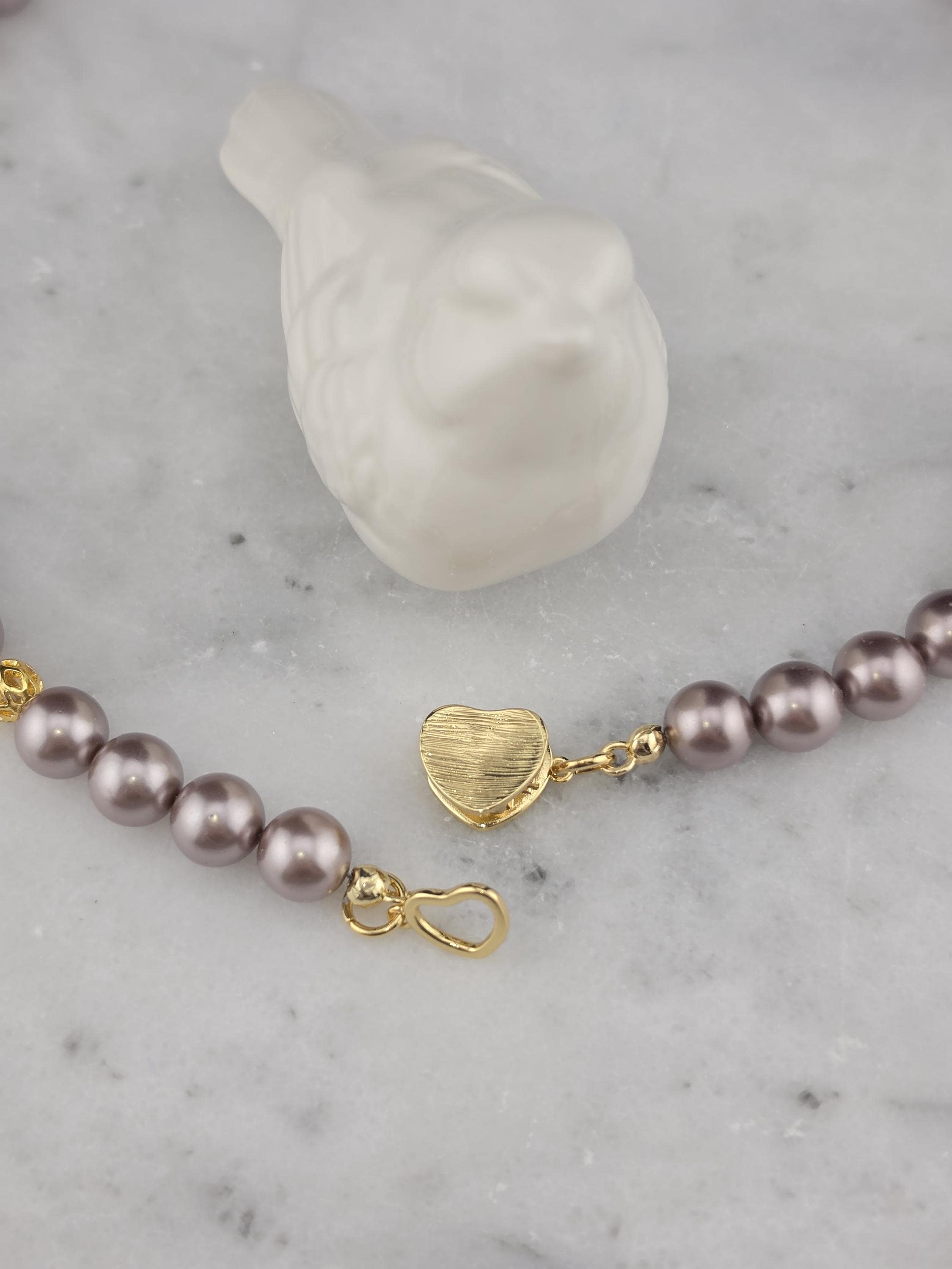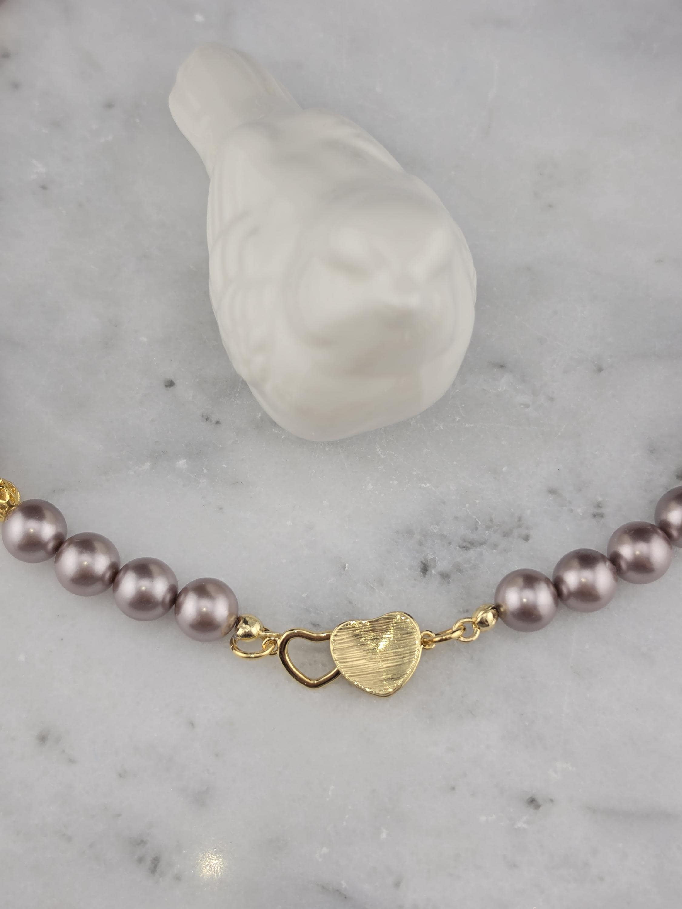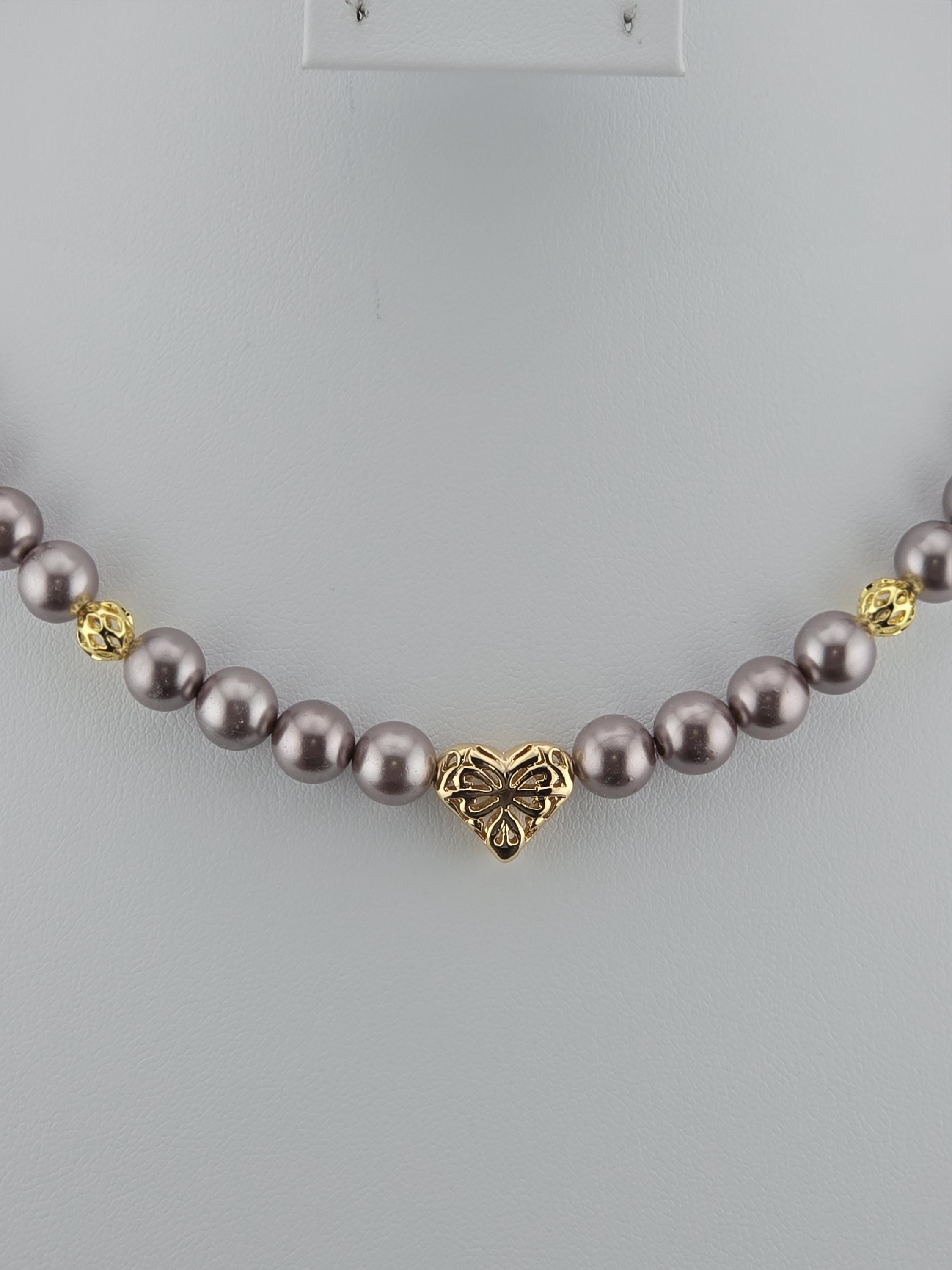 I made this necklace by stringing together 8mm AAA grade purple pearls. In the center of the necklace is an 18k gold plated brass filigree heart. It has a brushed 18k gold plated brass heart clasp and 18k gold plated connecting rings. It really is impressive. * Your purchase will arrive in pretty packaging
