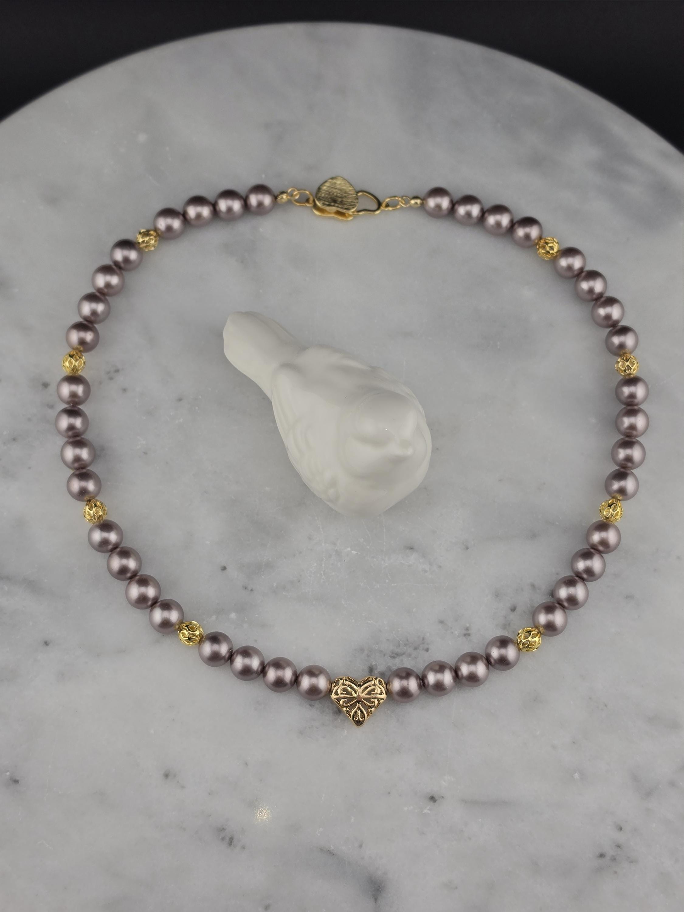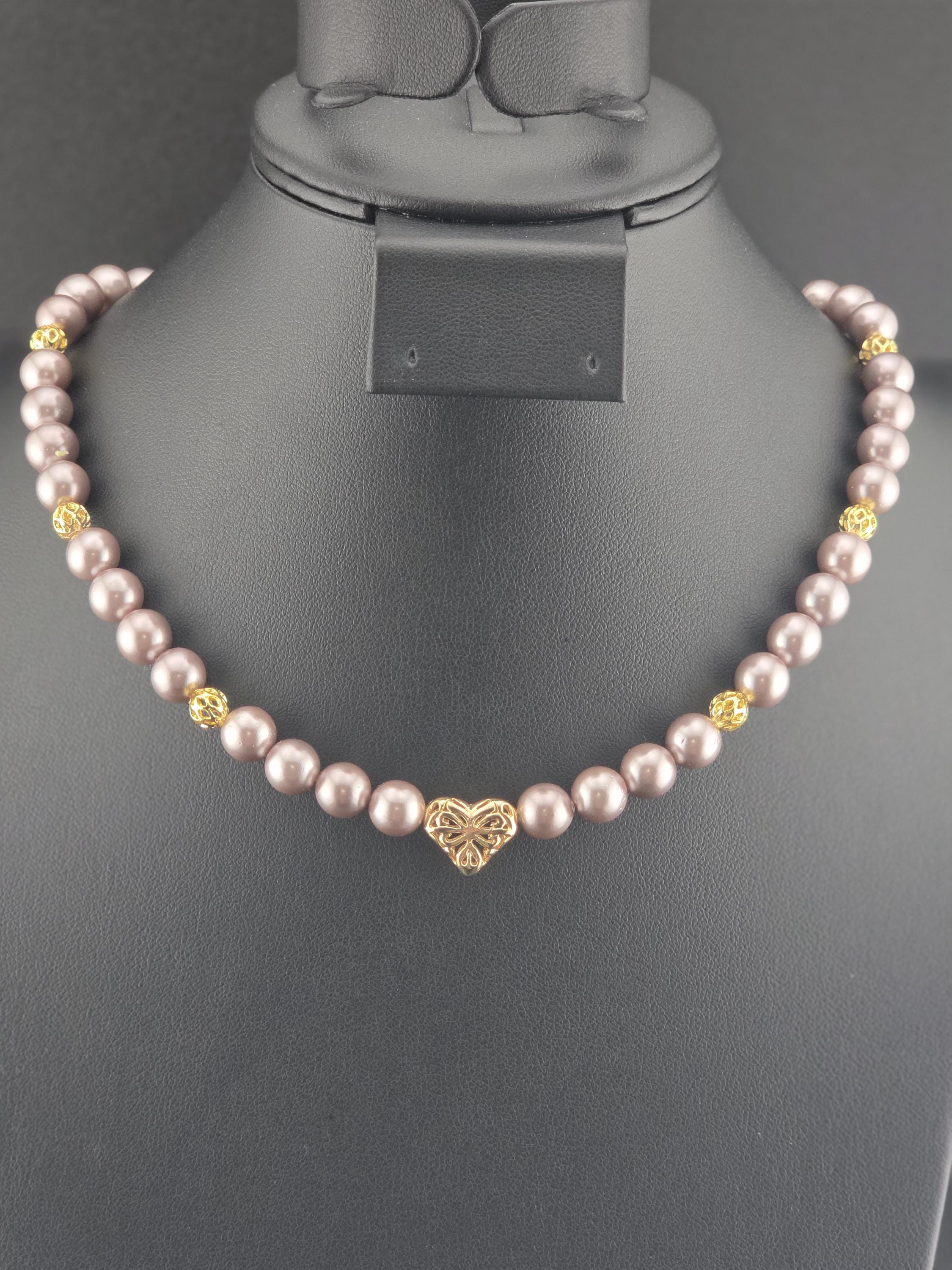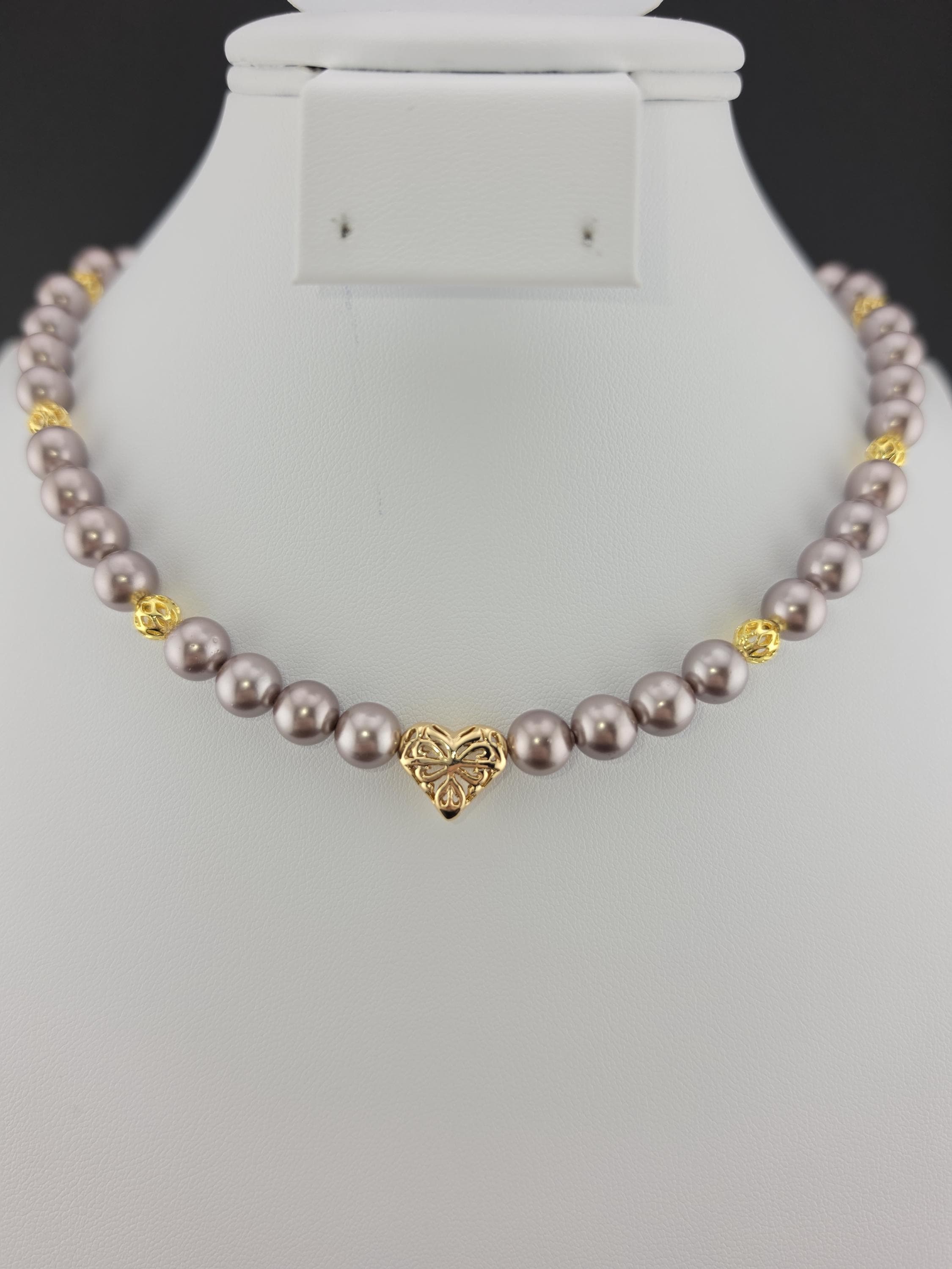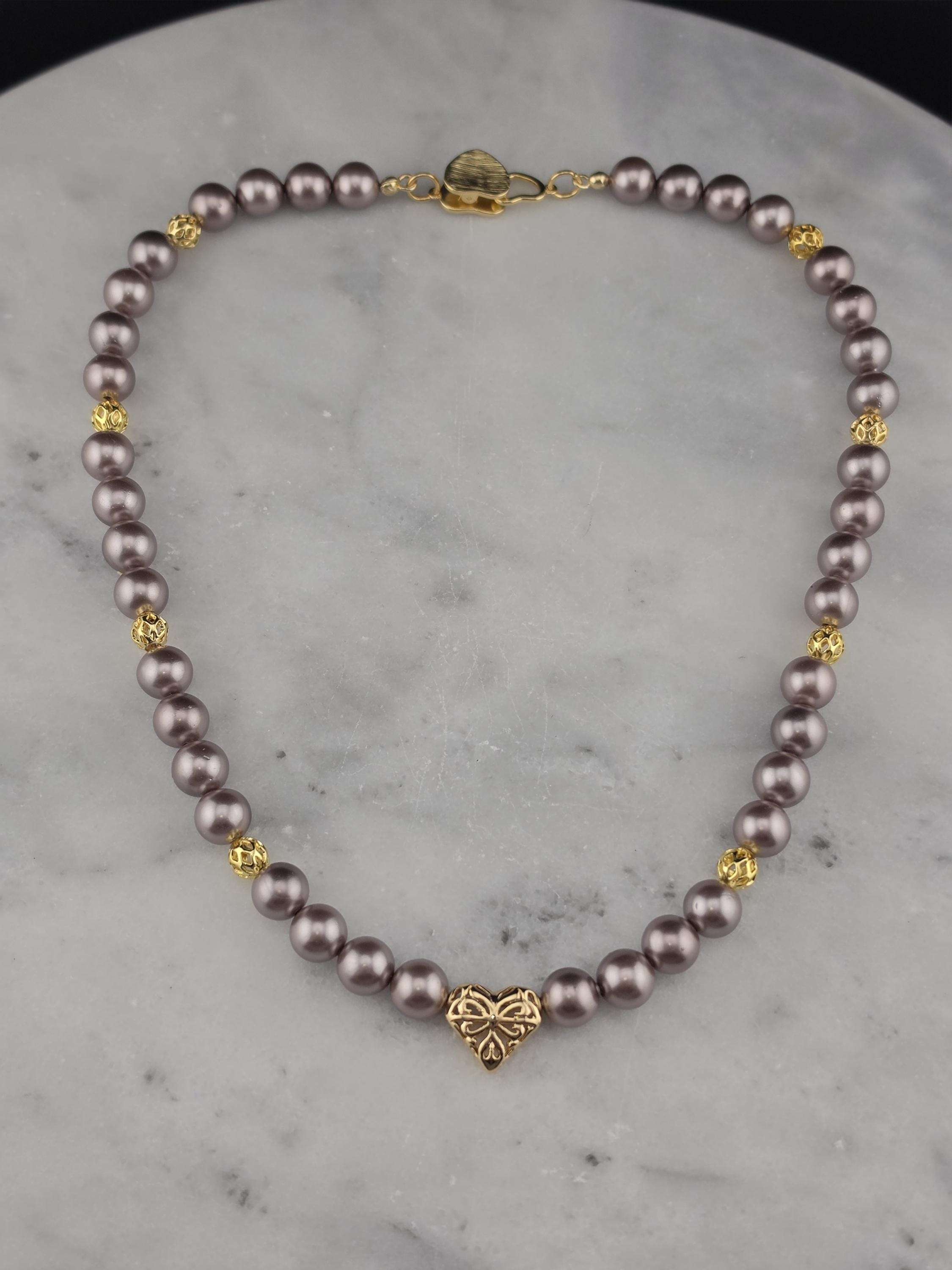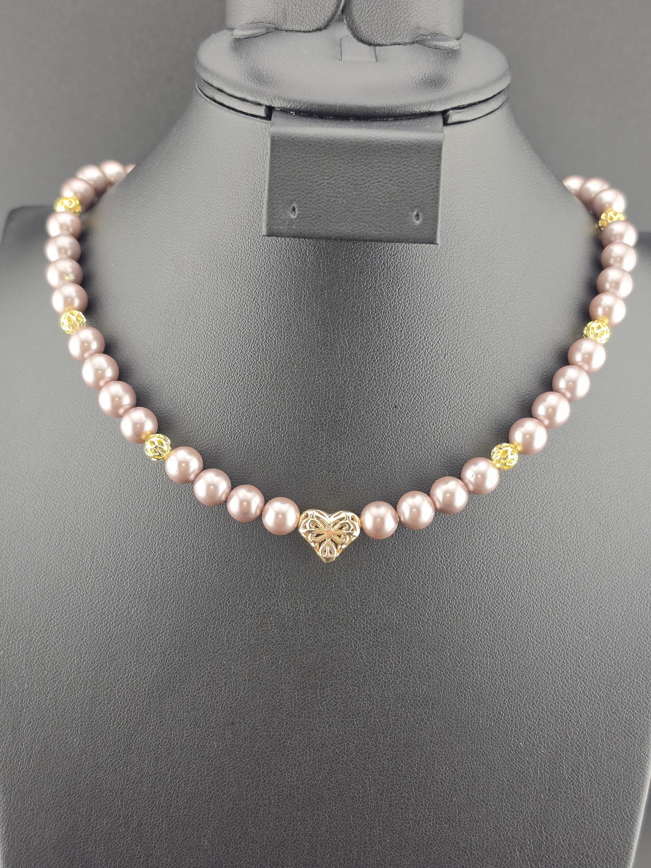 I made this necklace by stringing together 8mm AAA grade purple pearls. In the center of the necklace is an 18k gold plated brass filigree heart. It has a brushed 18k gold plated brass heart clasp and 18k gold plated connecting rings. It really is impressive. * Your purchase will arrive in pretty packaging