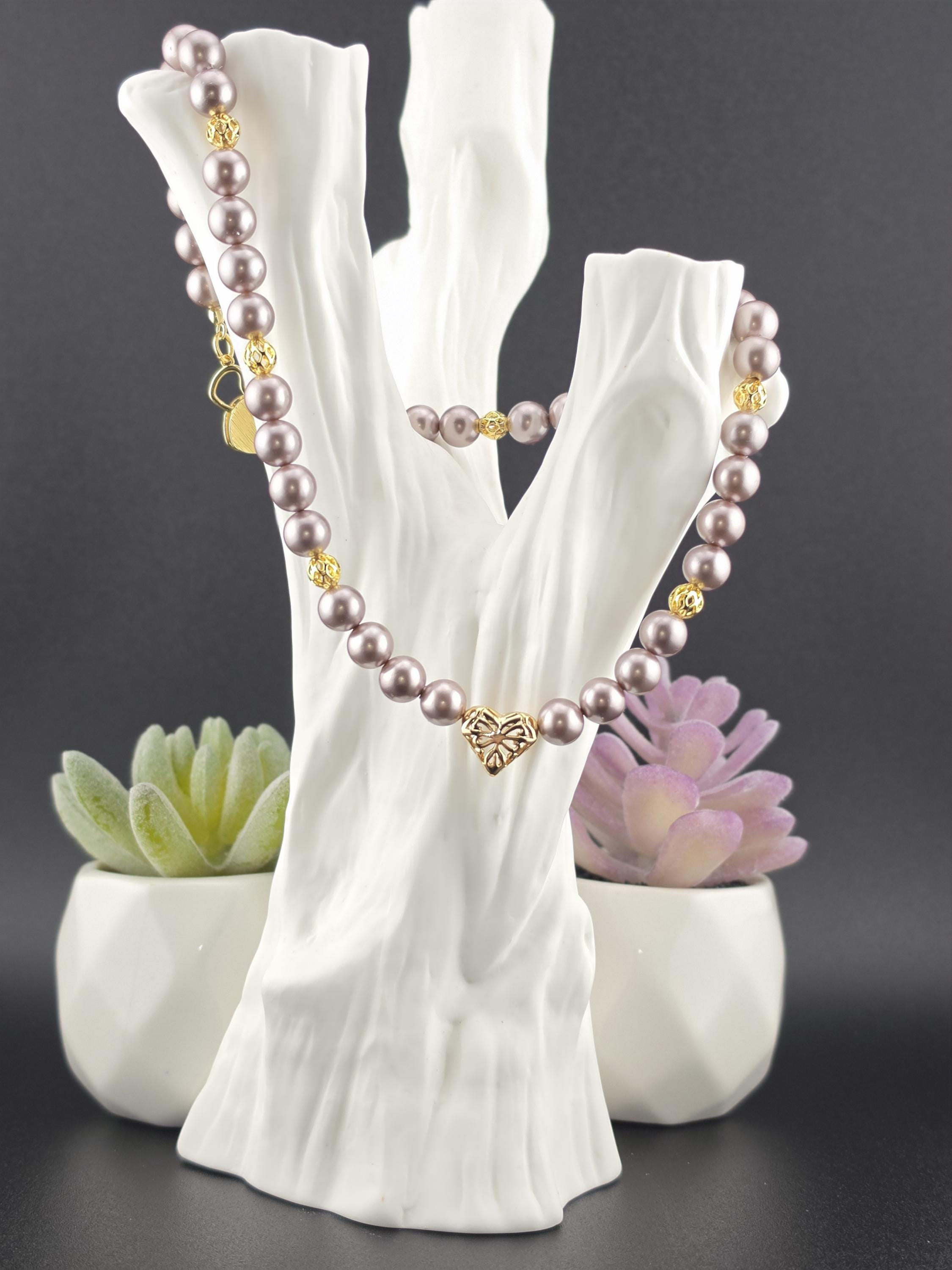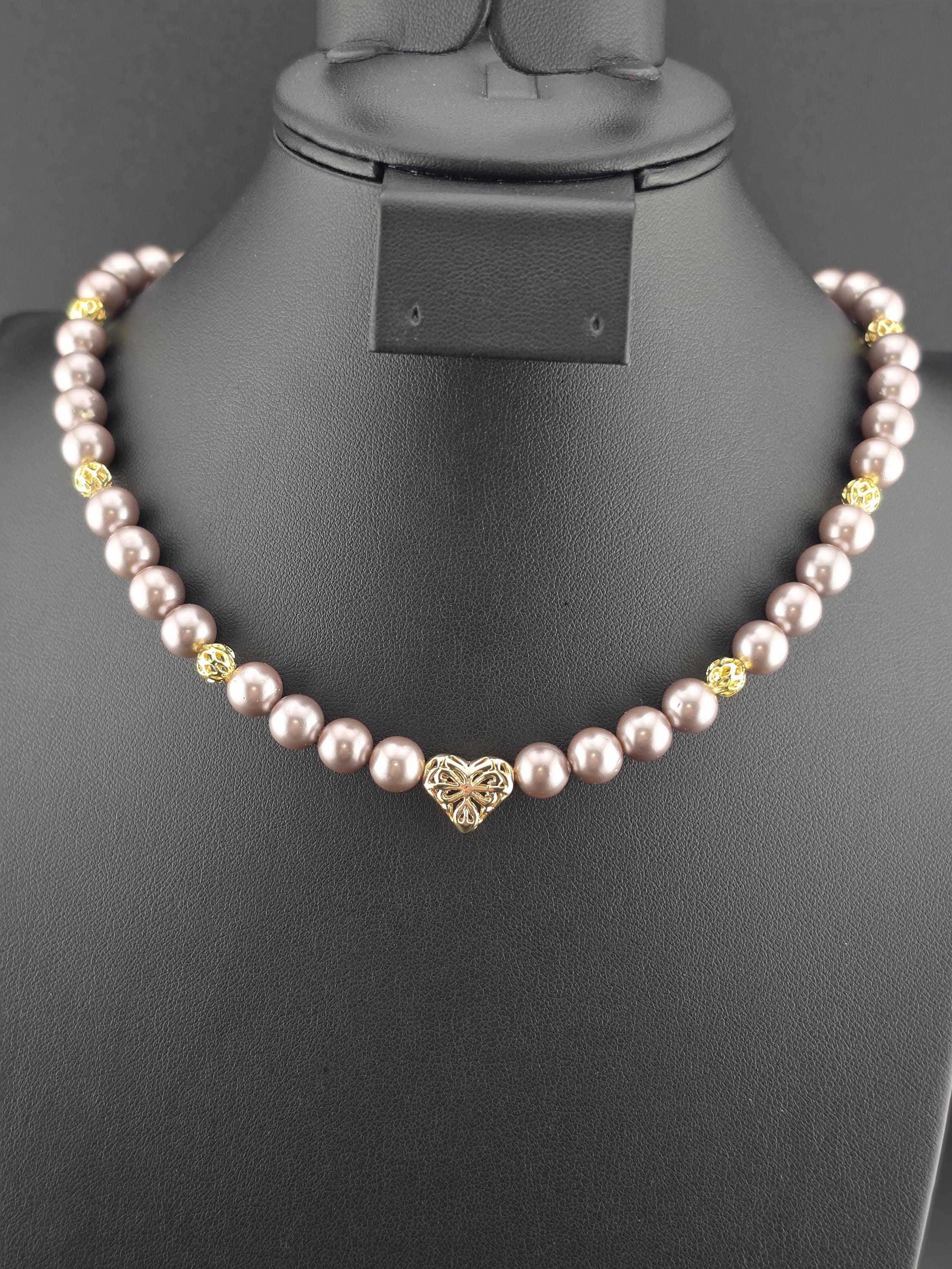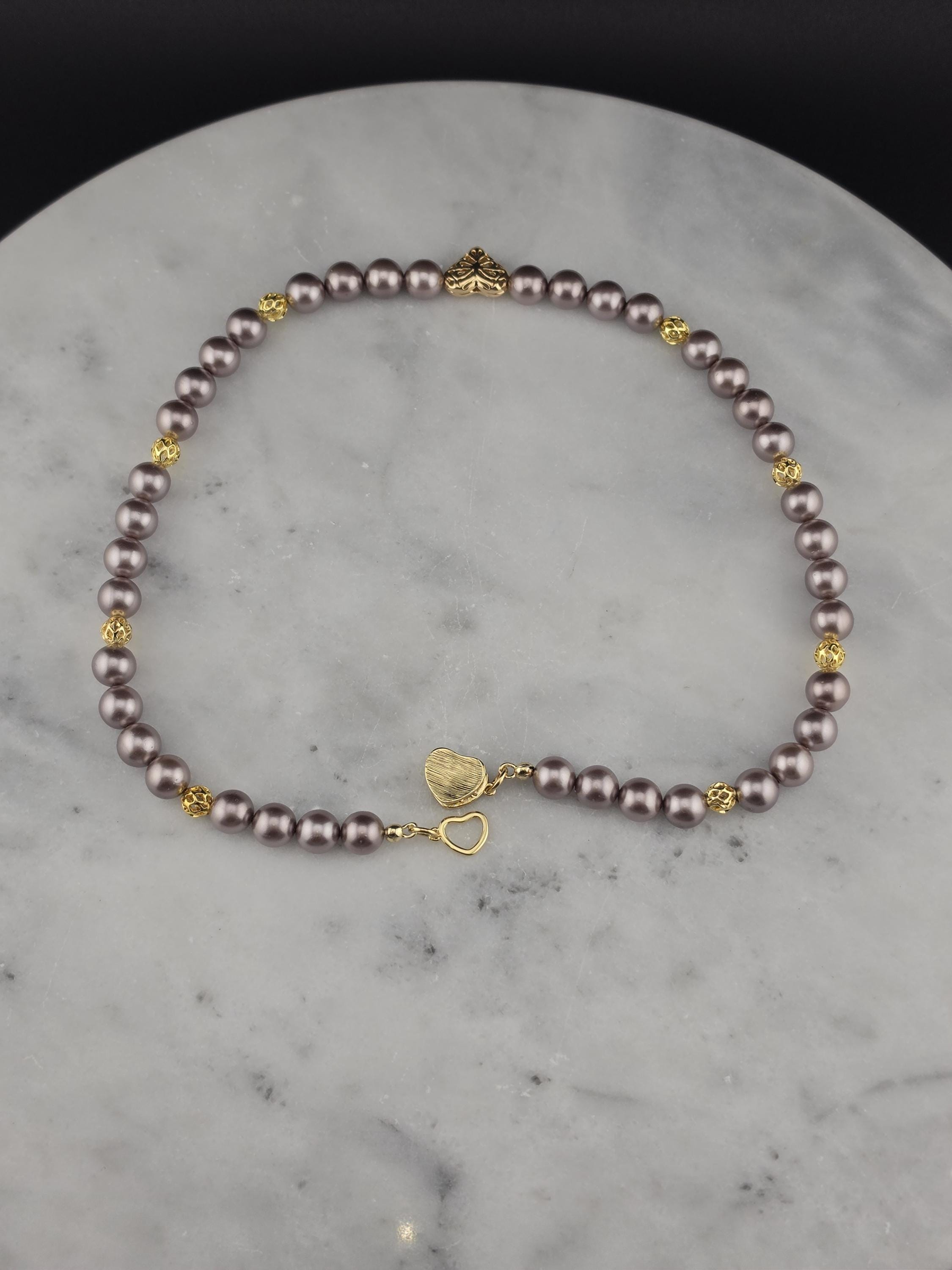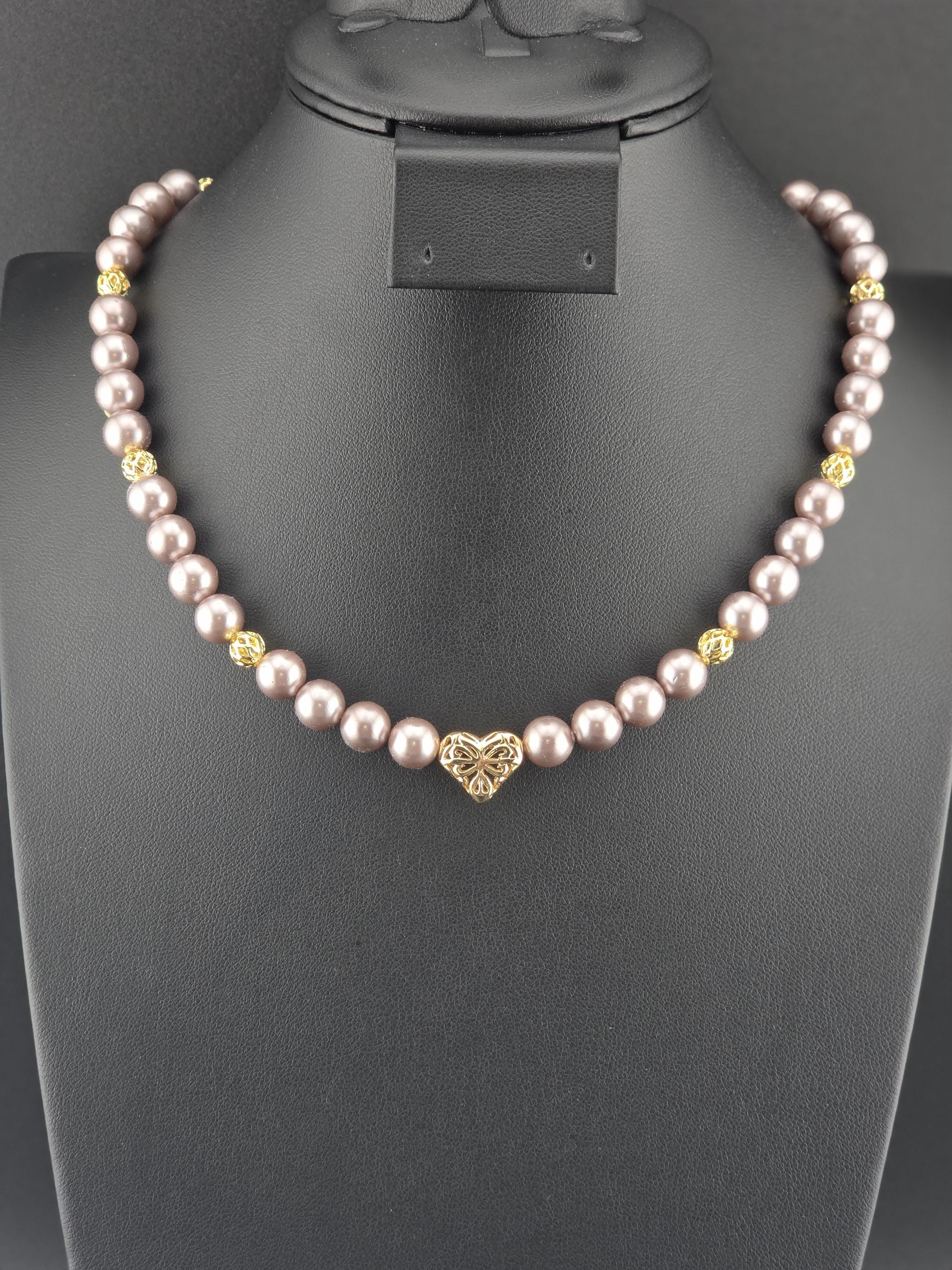 I made this necklace by stringing together 8mm AAA grade purple pearls. In the center of the necklace is an 18k gold plated brass filigree heart. It has a brushed 18k gold plated brass heart clasp and 18k gold plated connecting rings. It really is impressive. * Your purchase will arrive in pretty packaging