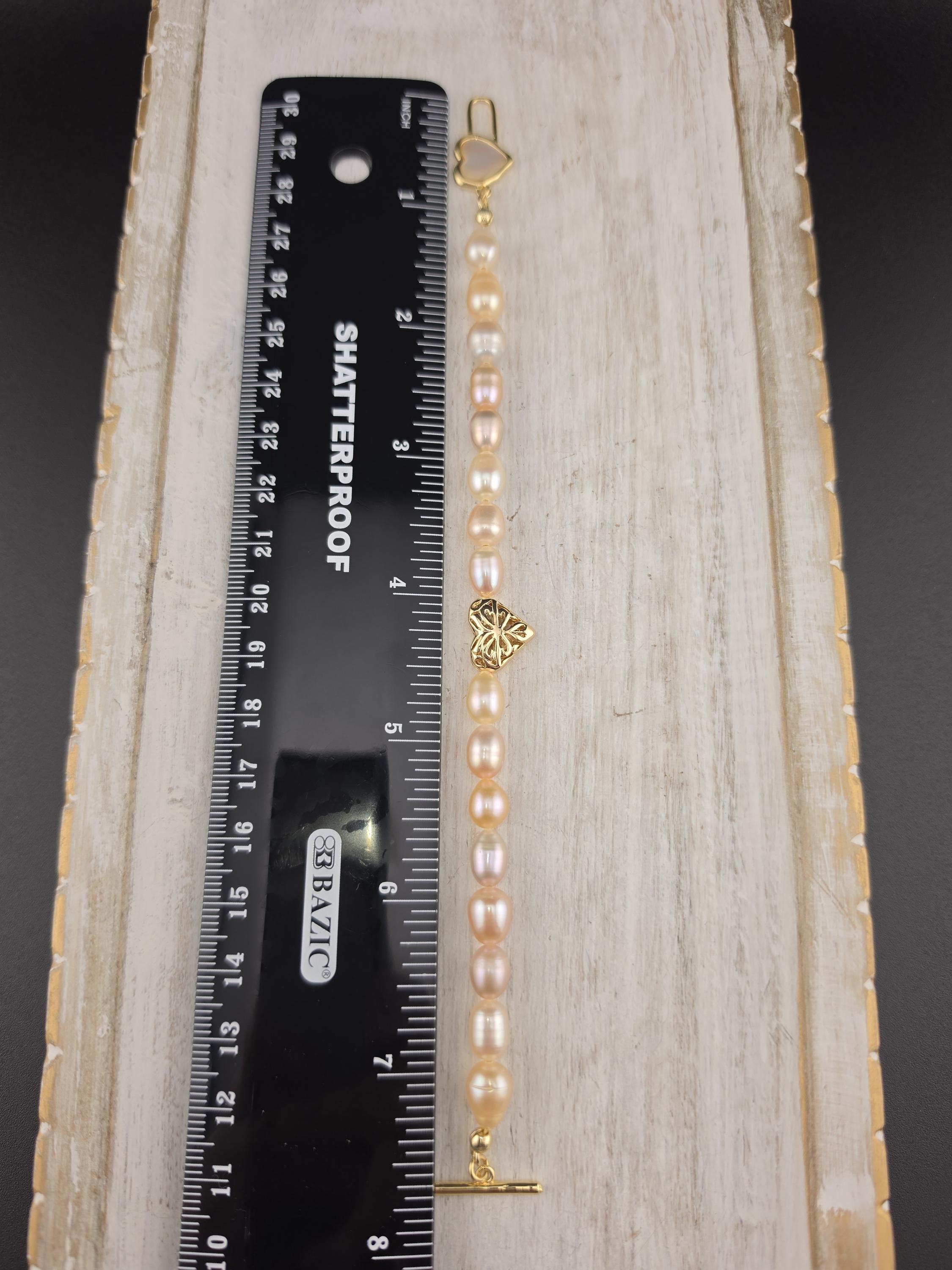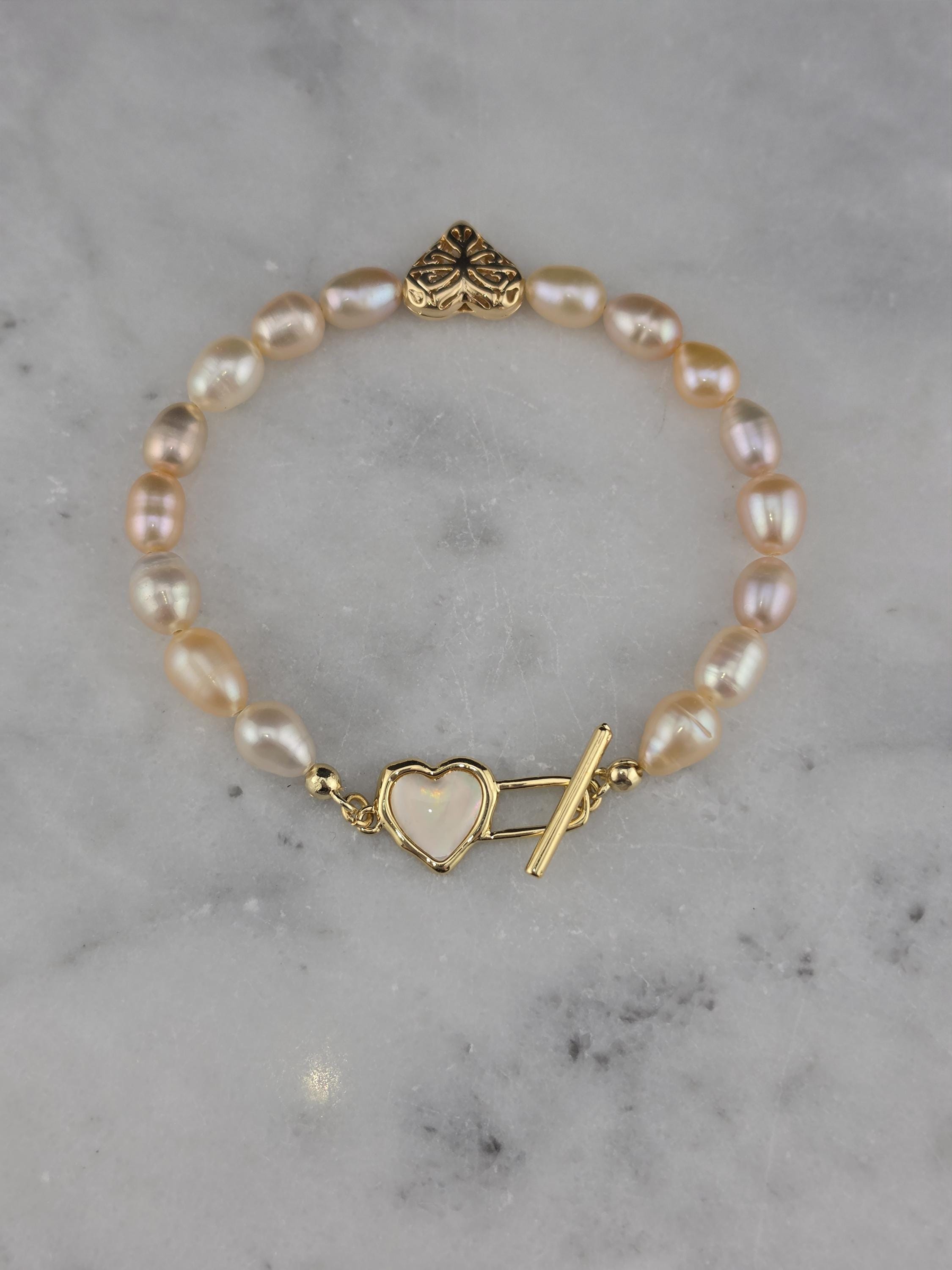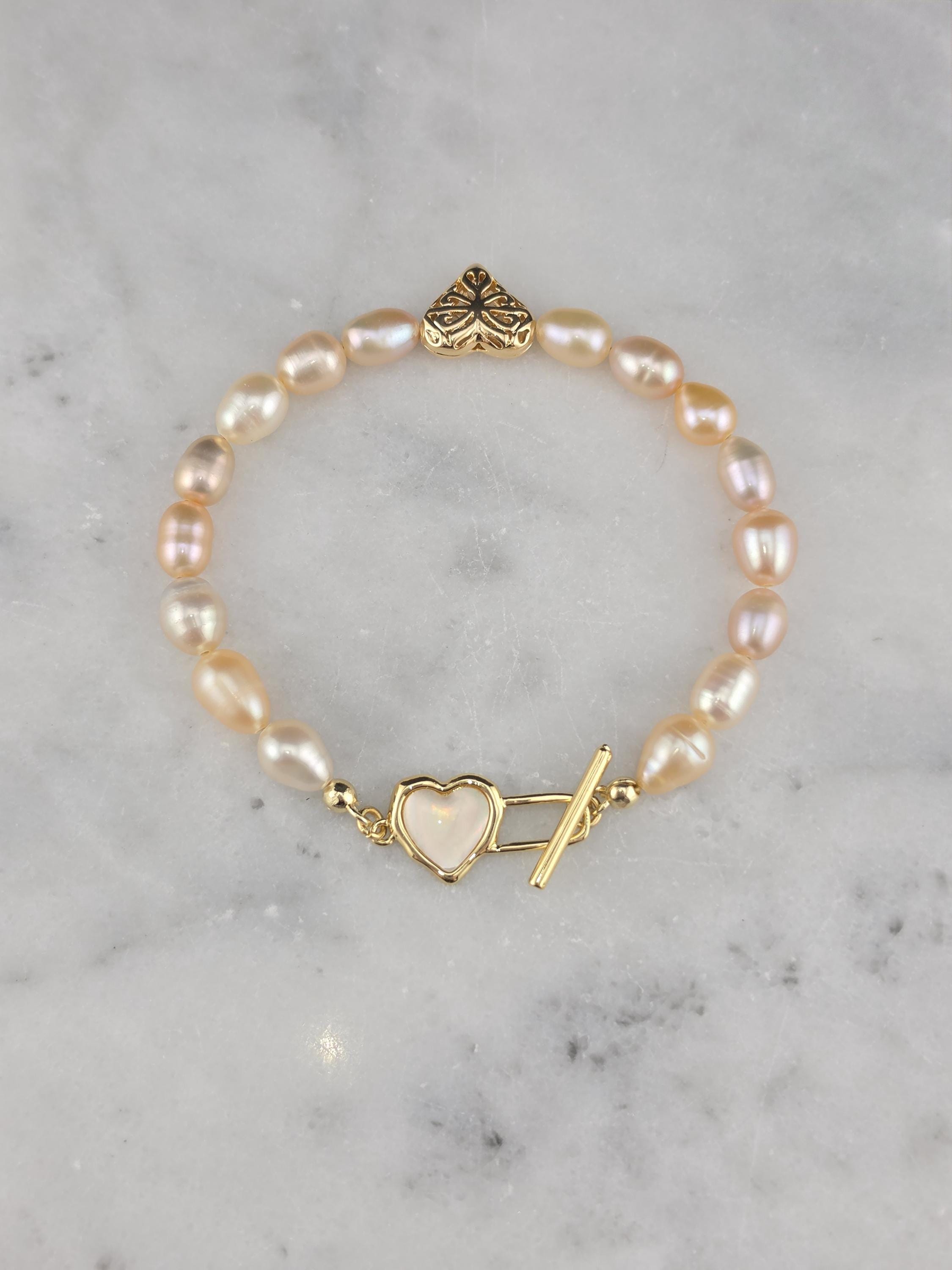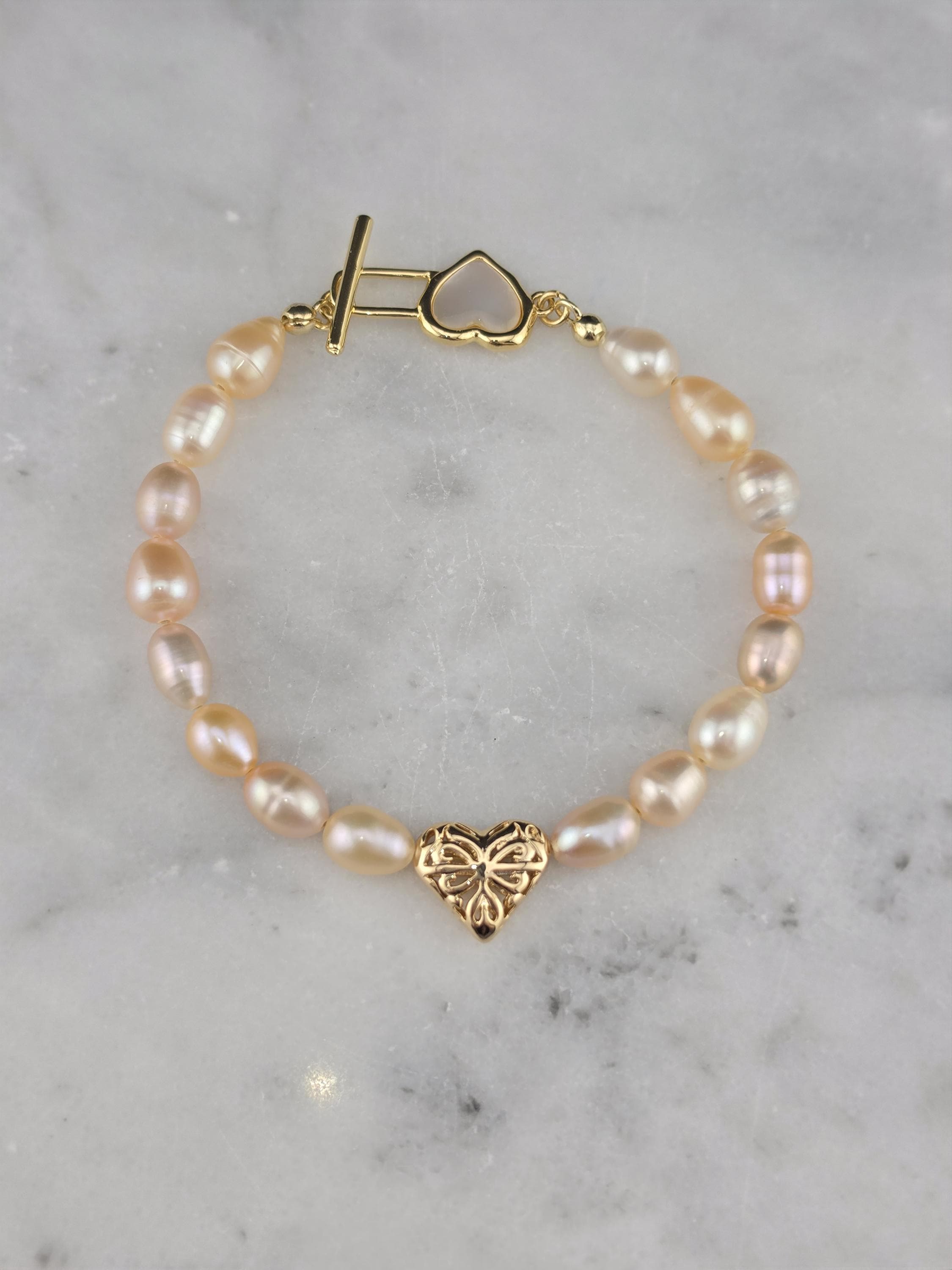 I made this bracelet by stringing peach, pink & white freshwater potato pearls. In the center is an 18k gold plated brass filigree heart. It has an 18k gold plated brass pink shell resin heart toggle clasp and 18k gold plated connecting rings. * Your purchase will arrive in pretty packaging