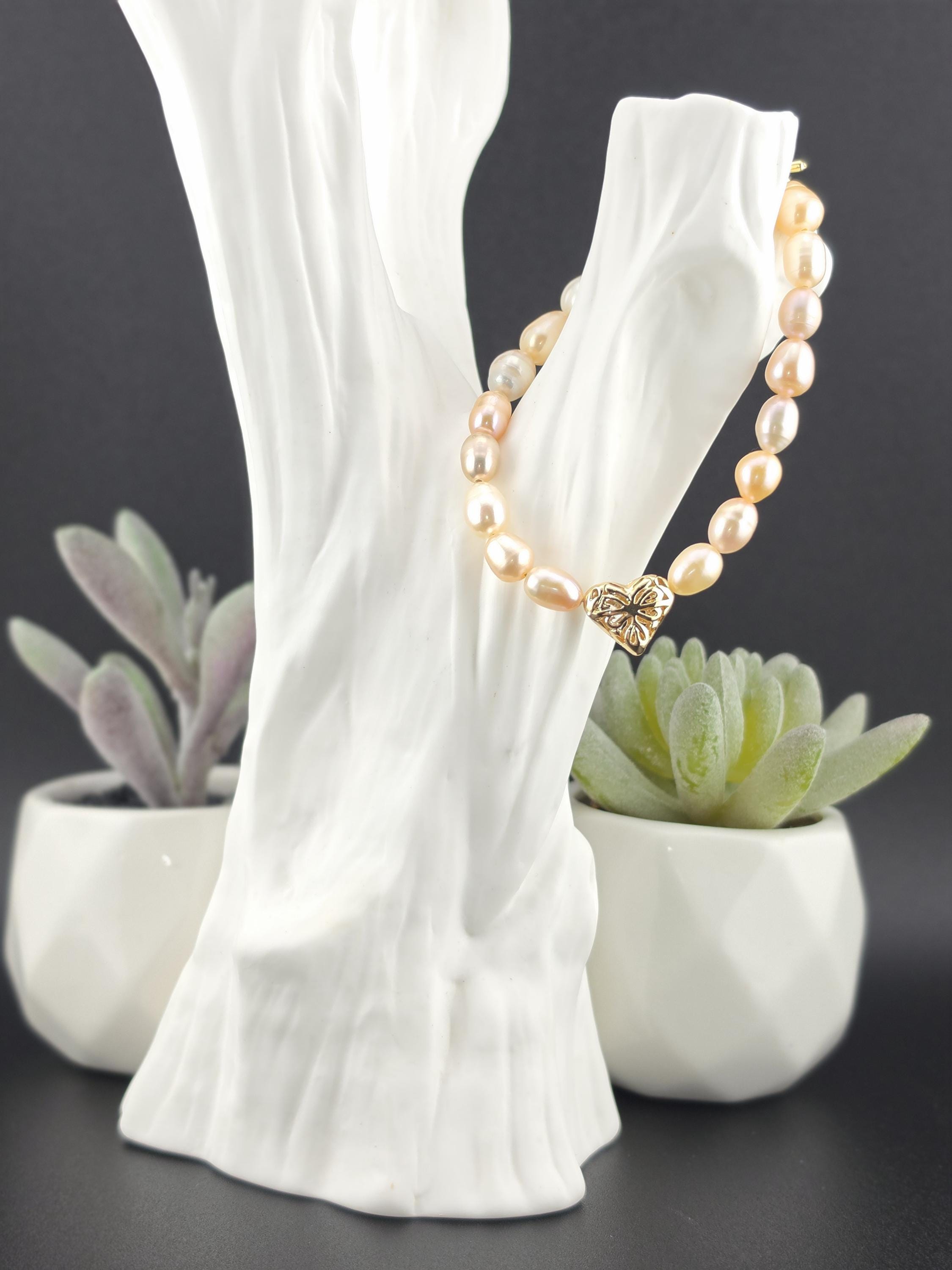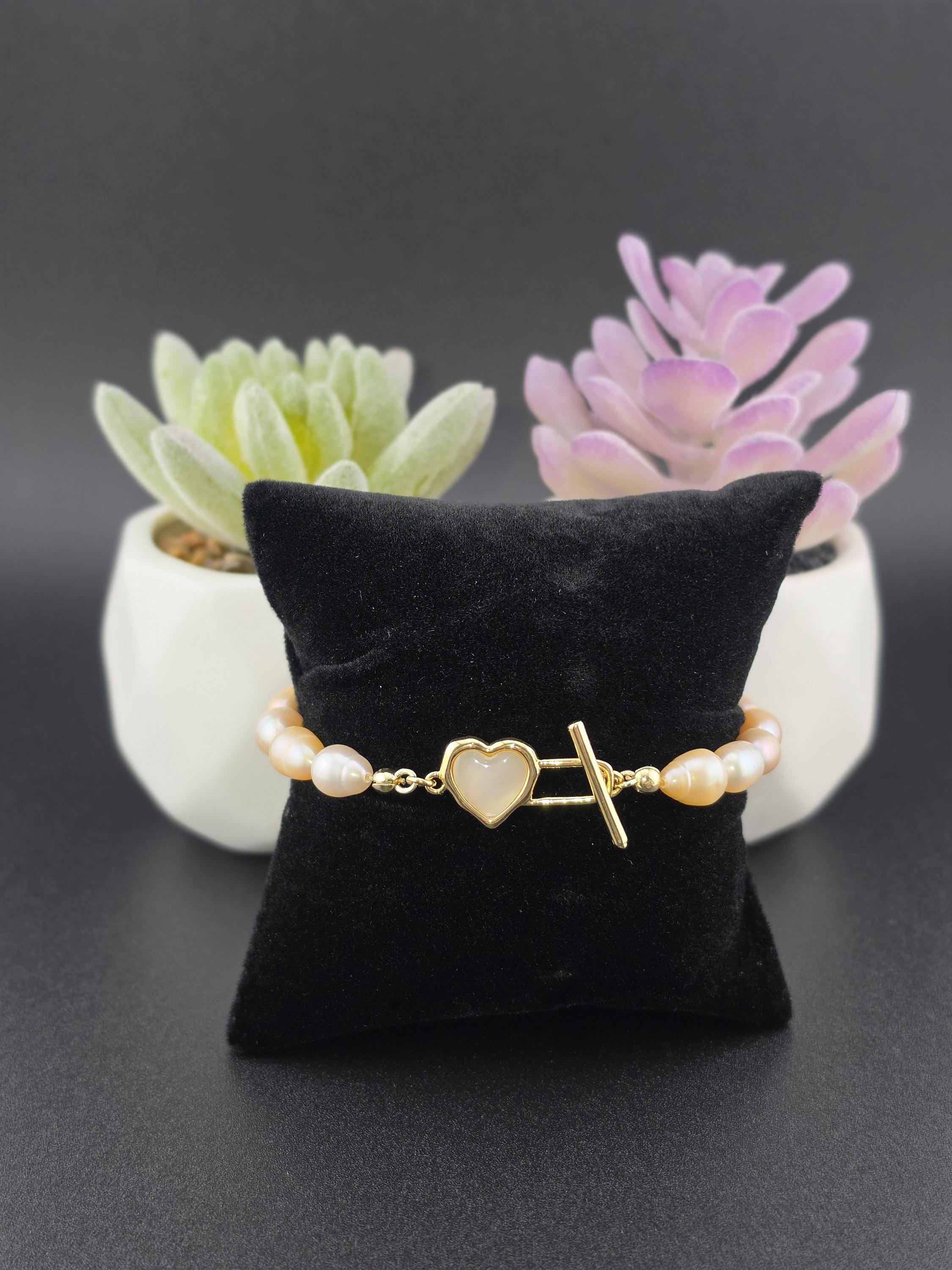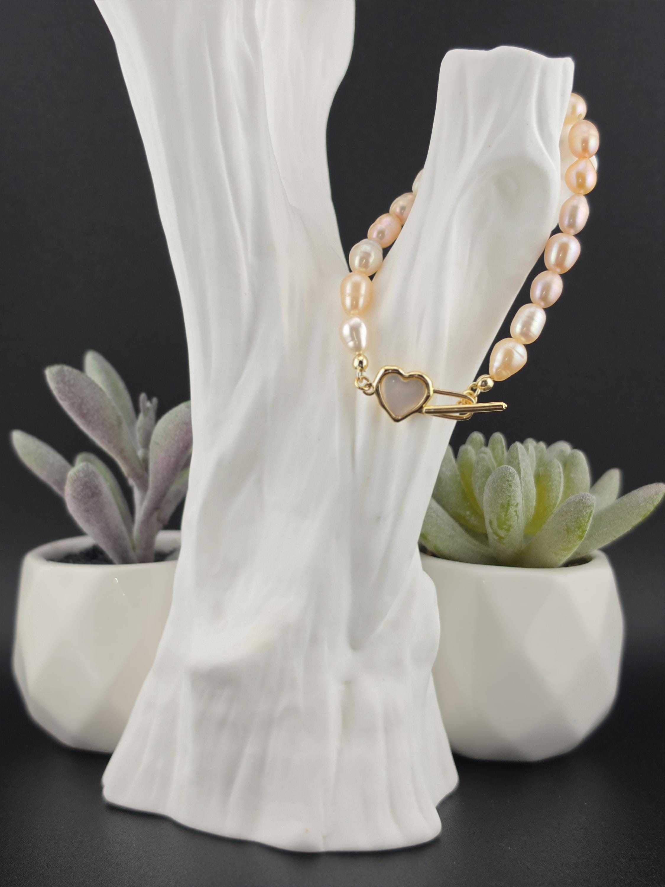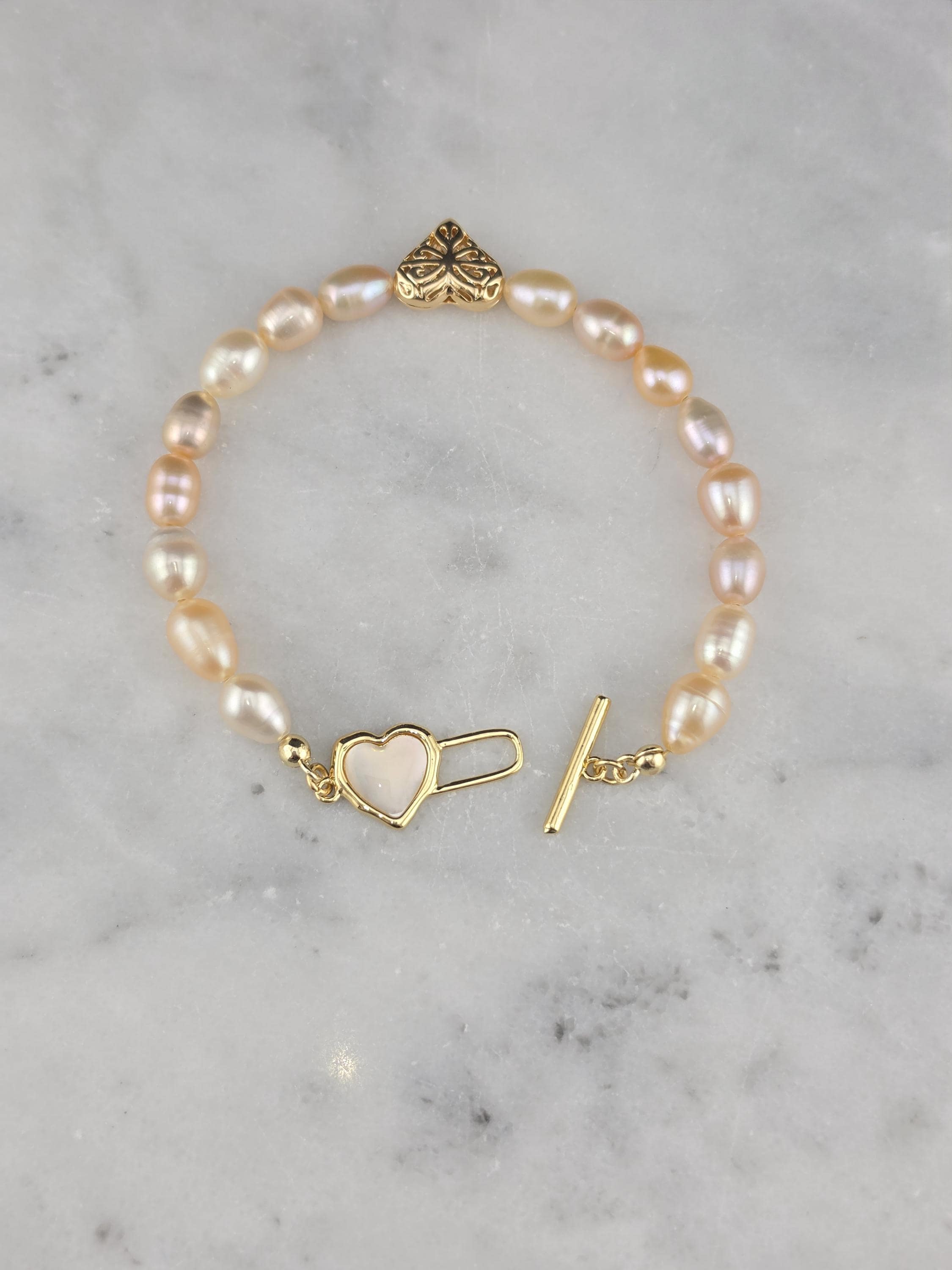 I made this bracelet by stringing peach, pink & white freshwater potato pearls. In the center is an 18k gold plated brass filigree heart. It has an 18k gold plated brass pink shell resin heart toggle clasp and 18k gold plated connecting rings. * Your purchase will arrive in pretty packaging