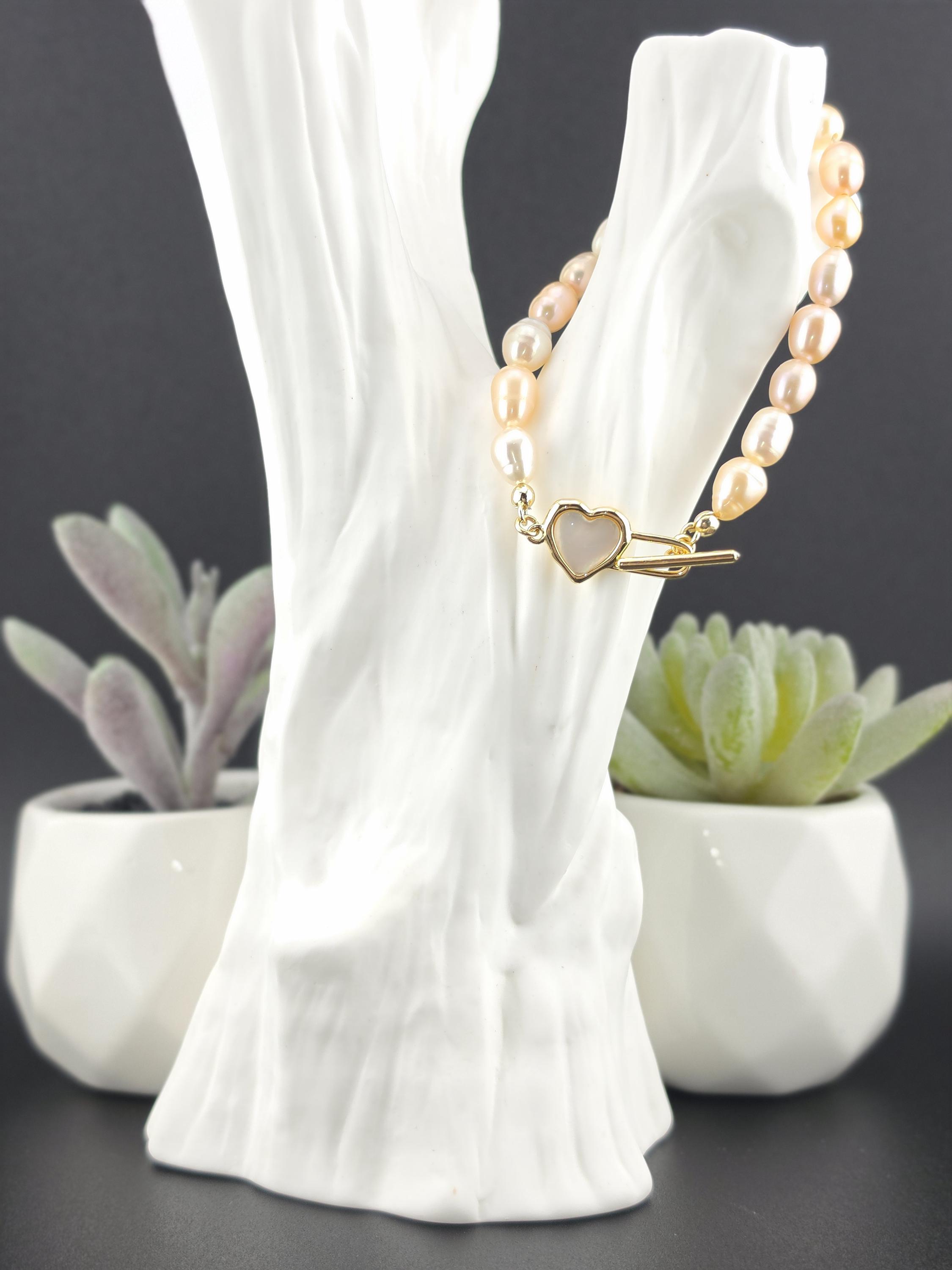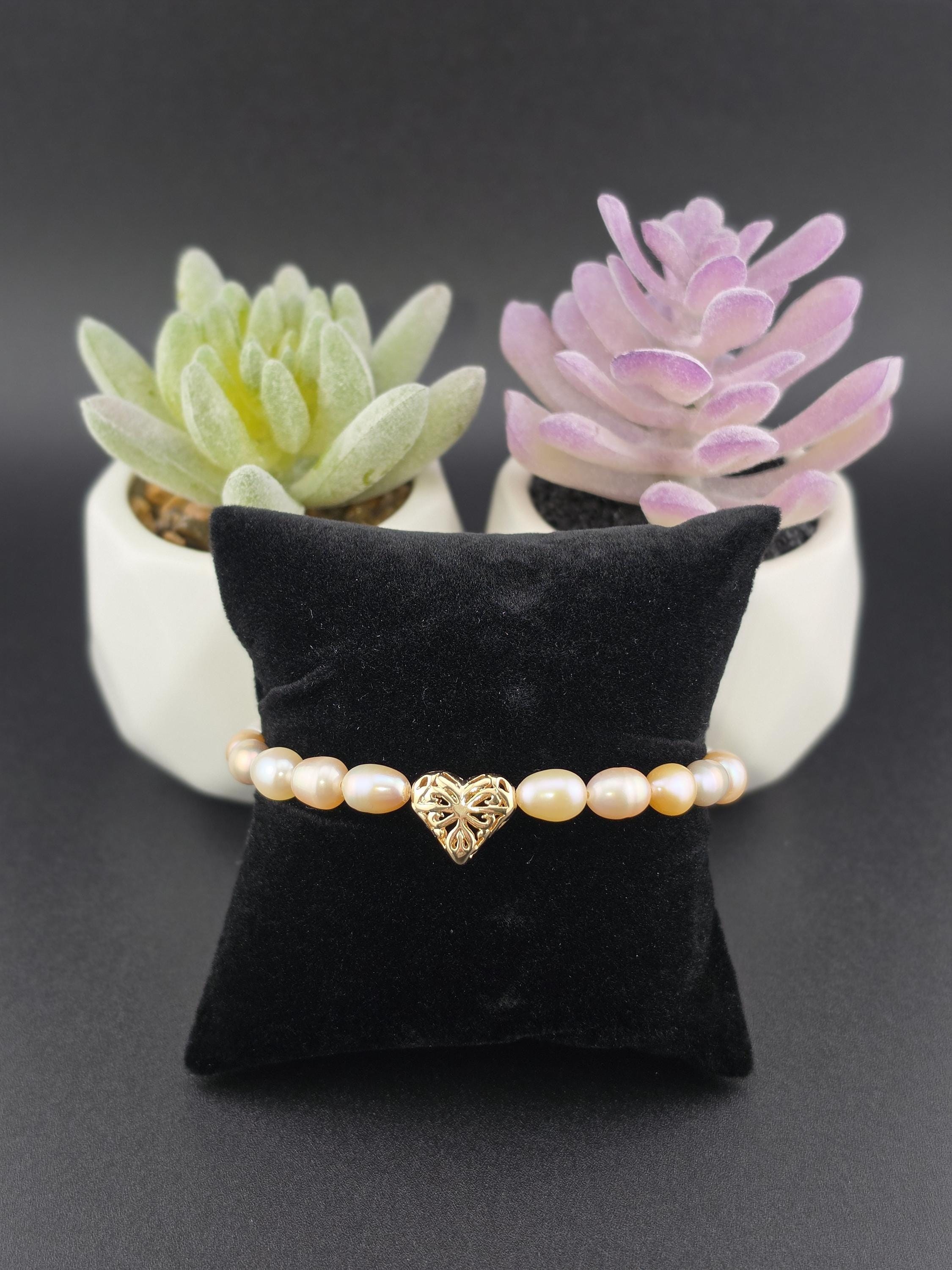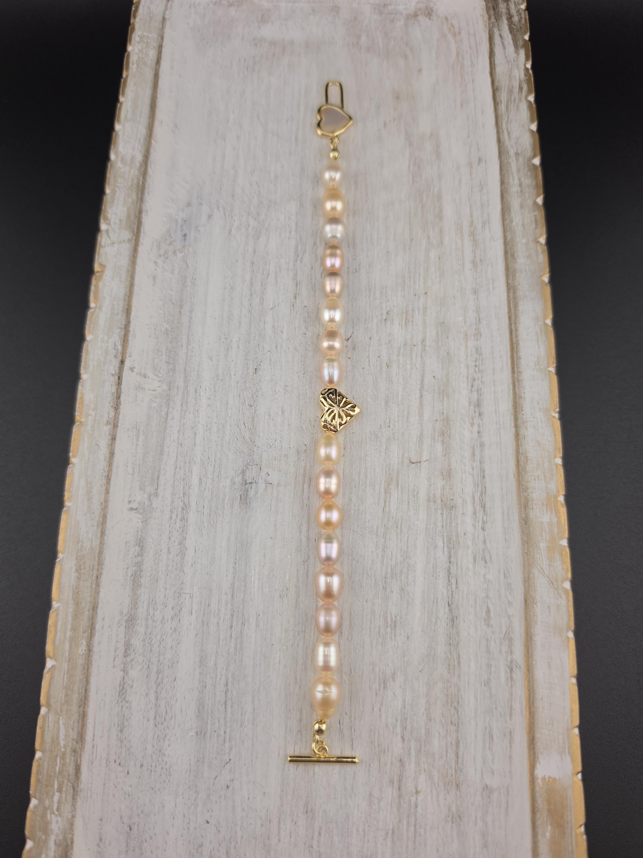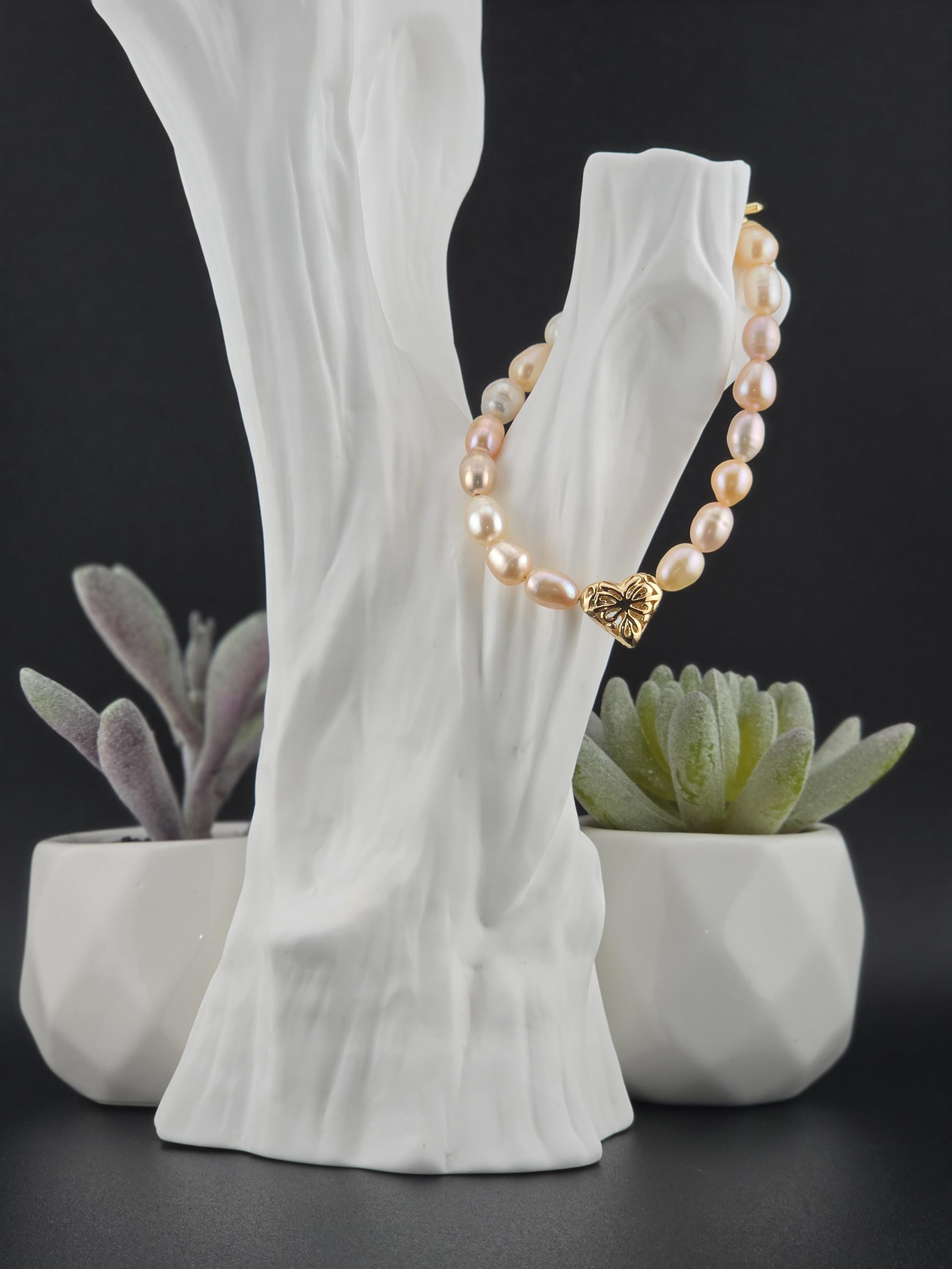 I made this bracelet by stringing peach, pink & white freshwater potato pearls. In the center is an 18k gold plated brass filigree heart. It has an 18k gold plated brass pink shell resin heart toggle clasp and 18k gold plated connecting rings. * Your purchase will arrive in pretty packaging
