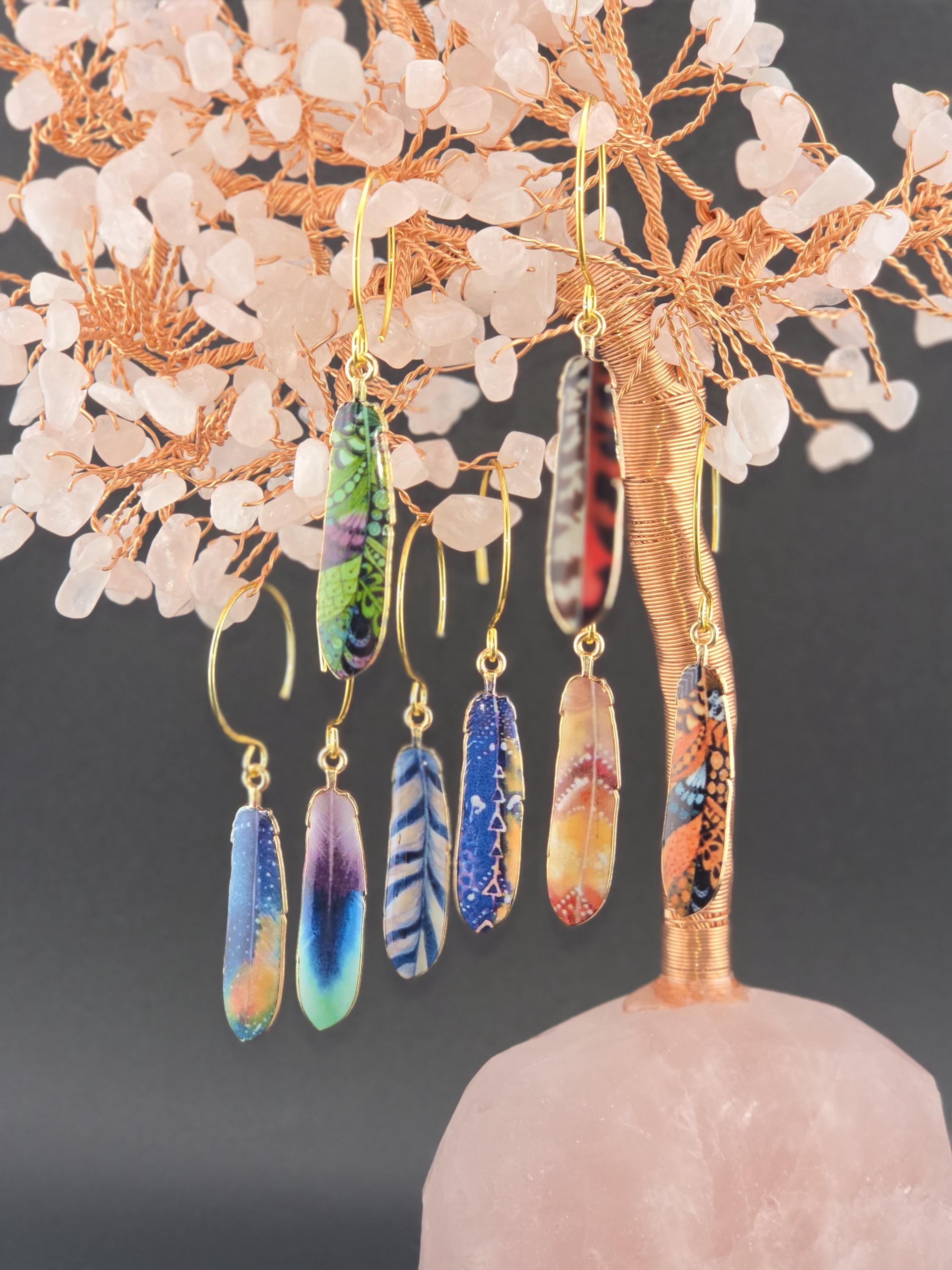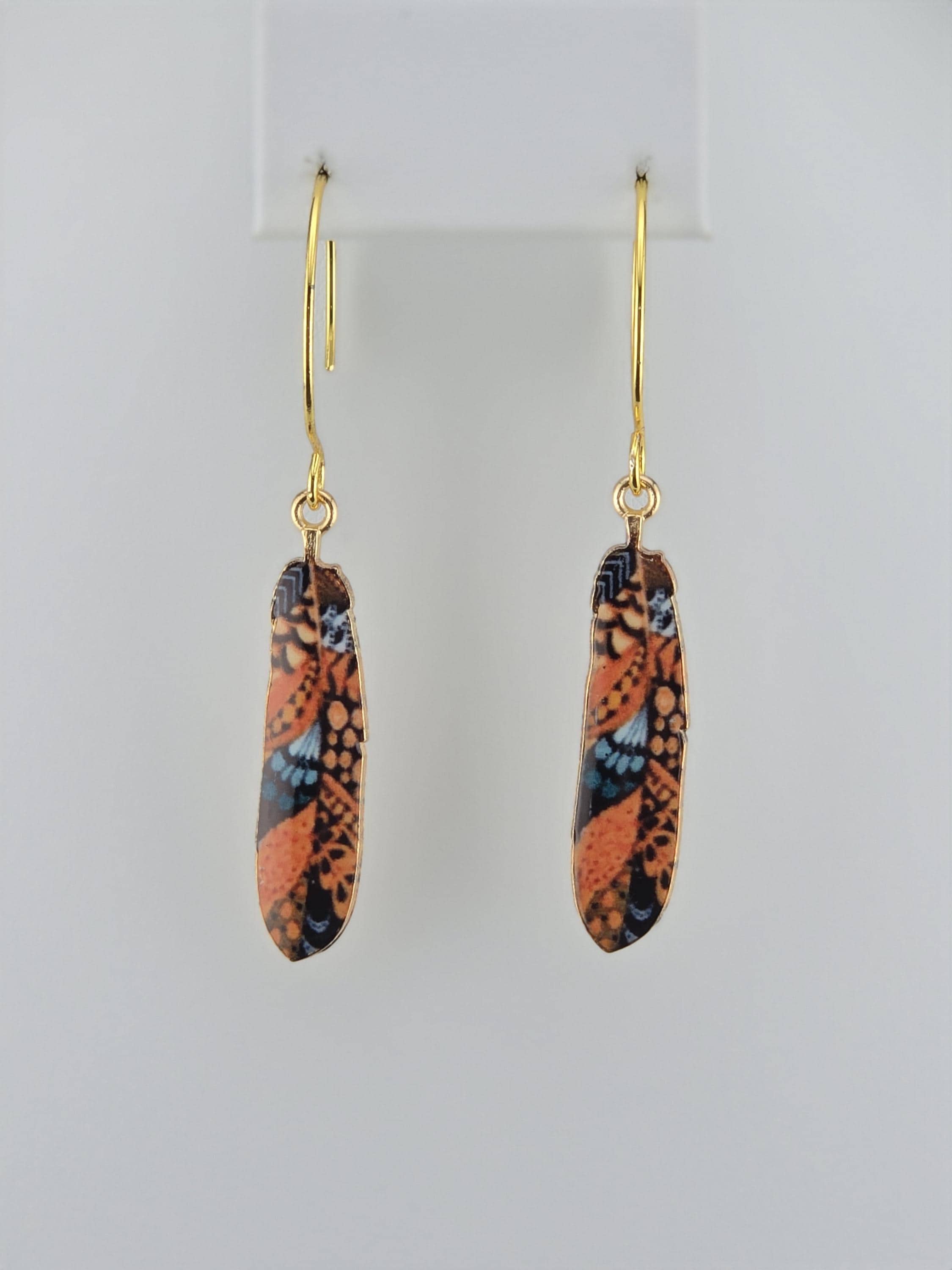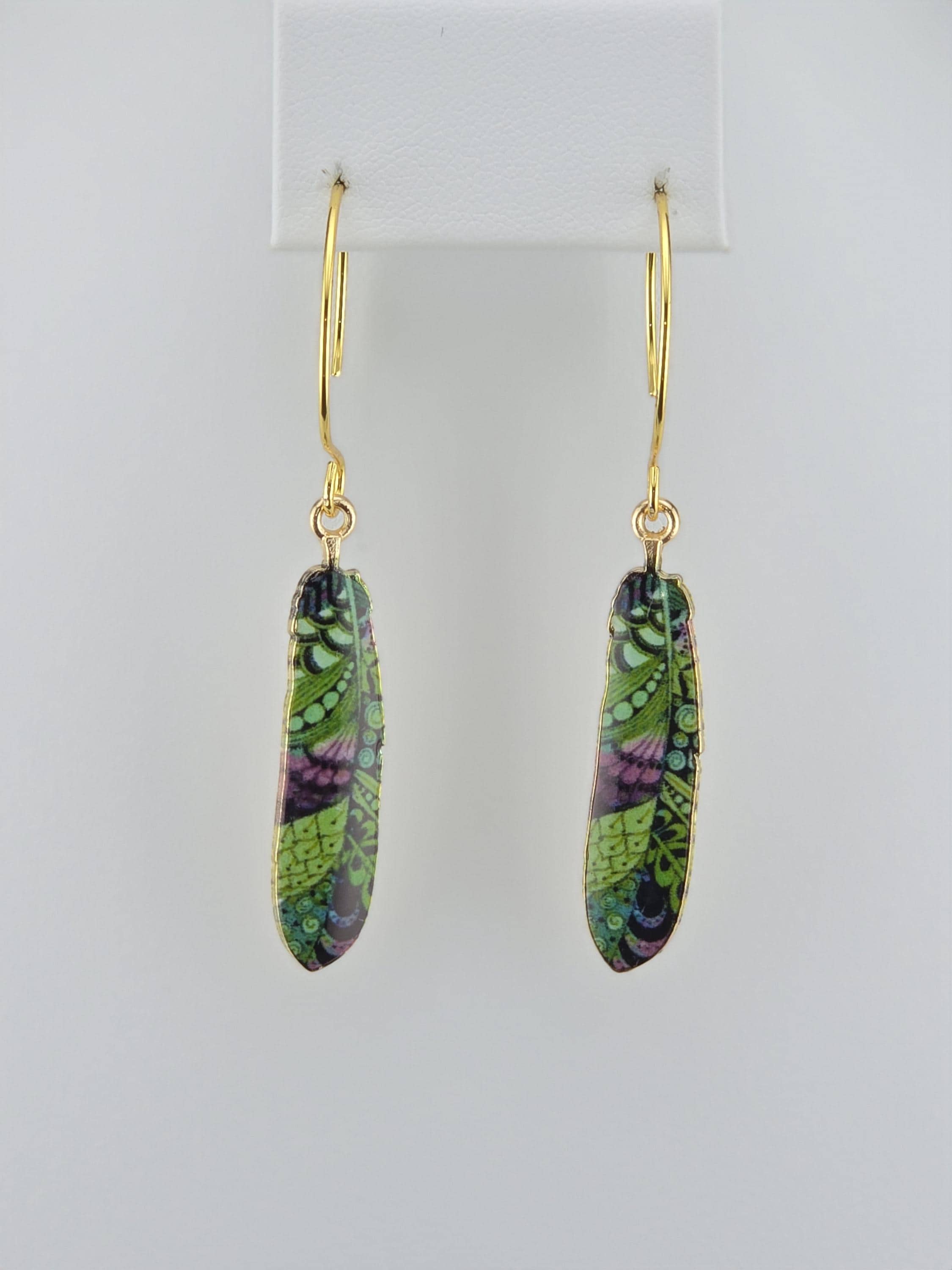 I made these using 18k gold plated circle hook style earrings. From each earring hangs a colorful pattern enamel feather. There are 8 to choose from. Such a cute boho look.