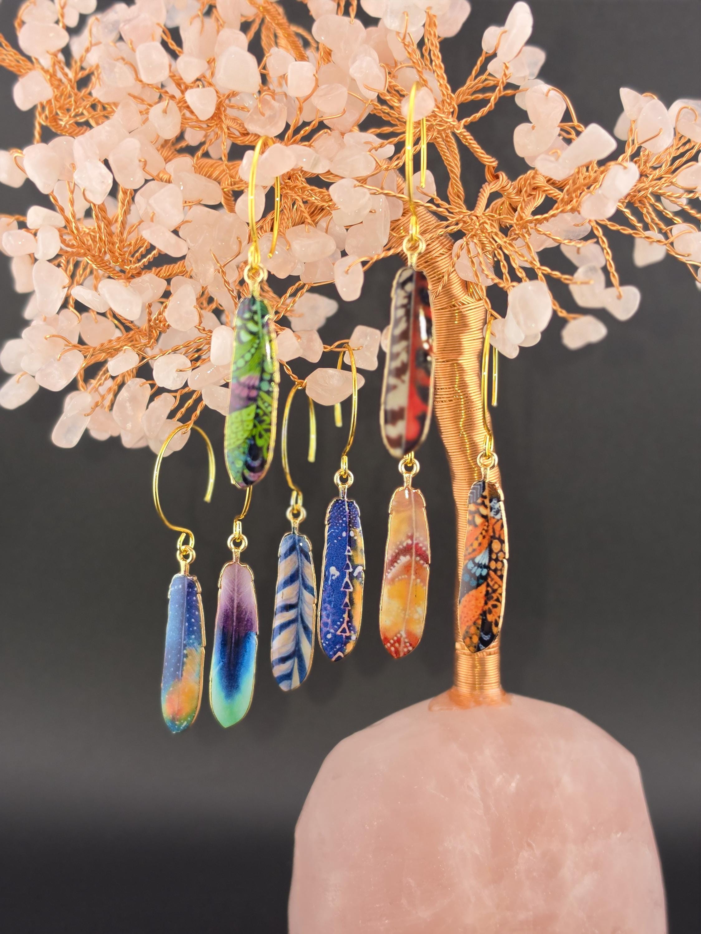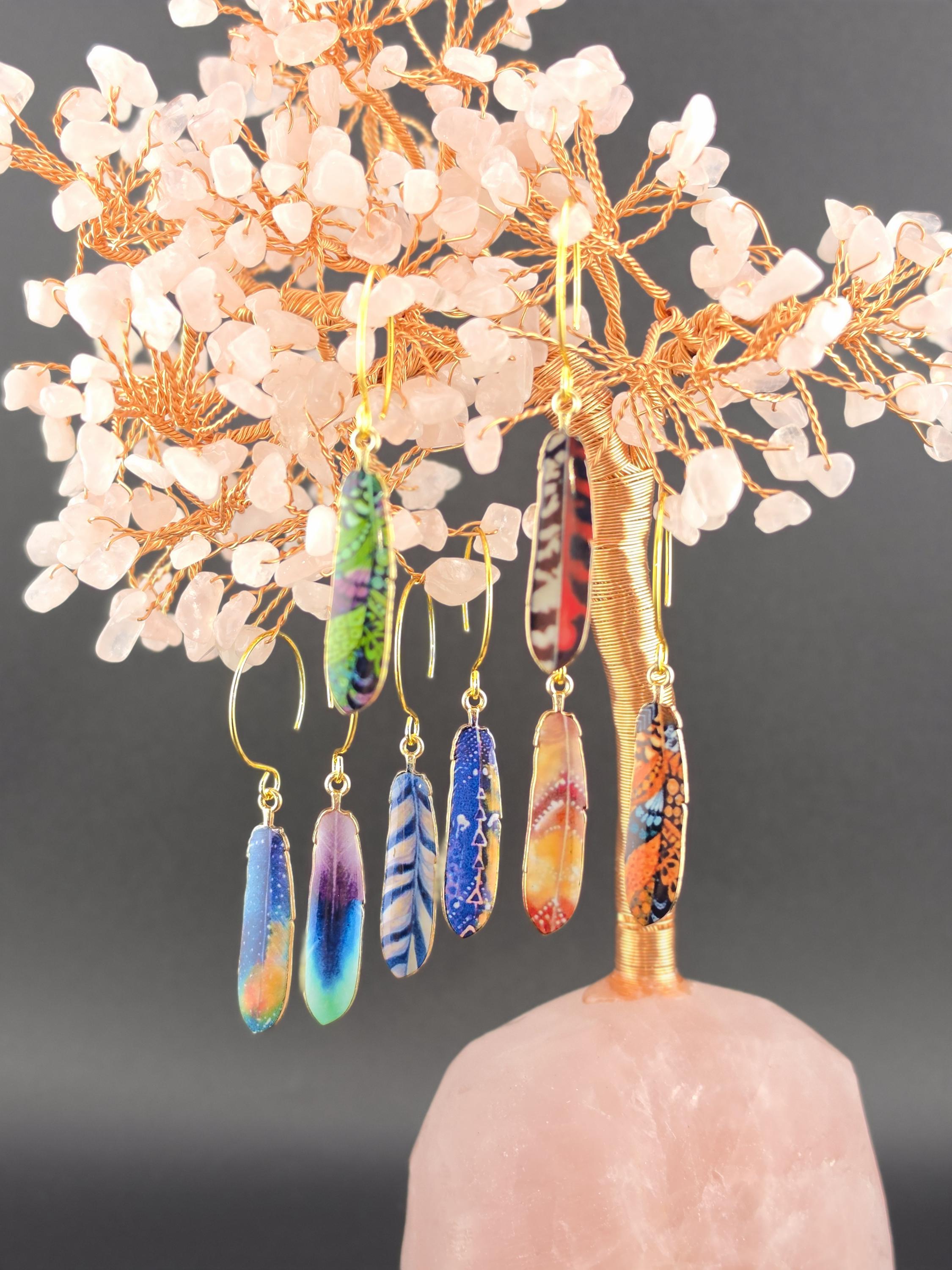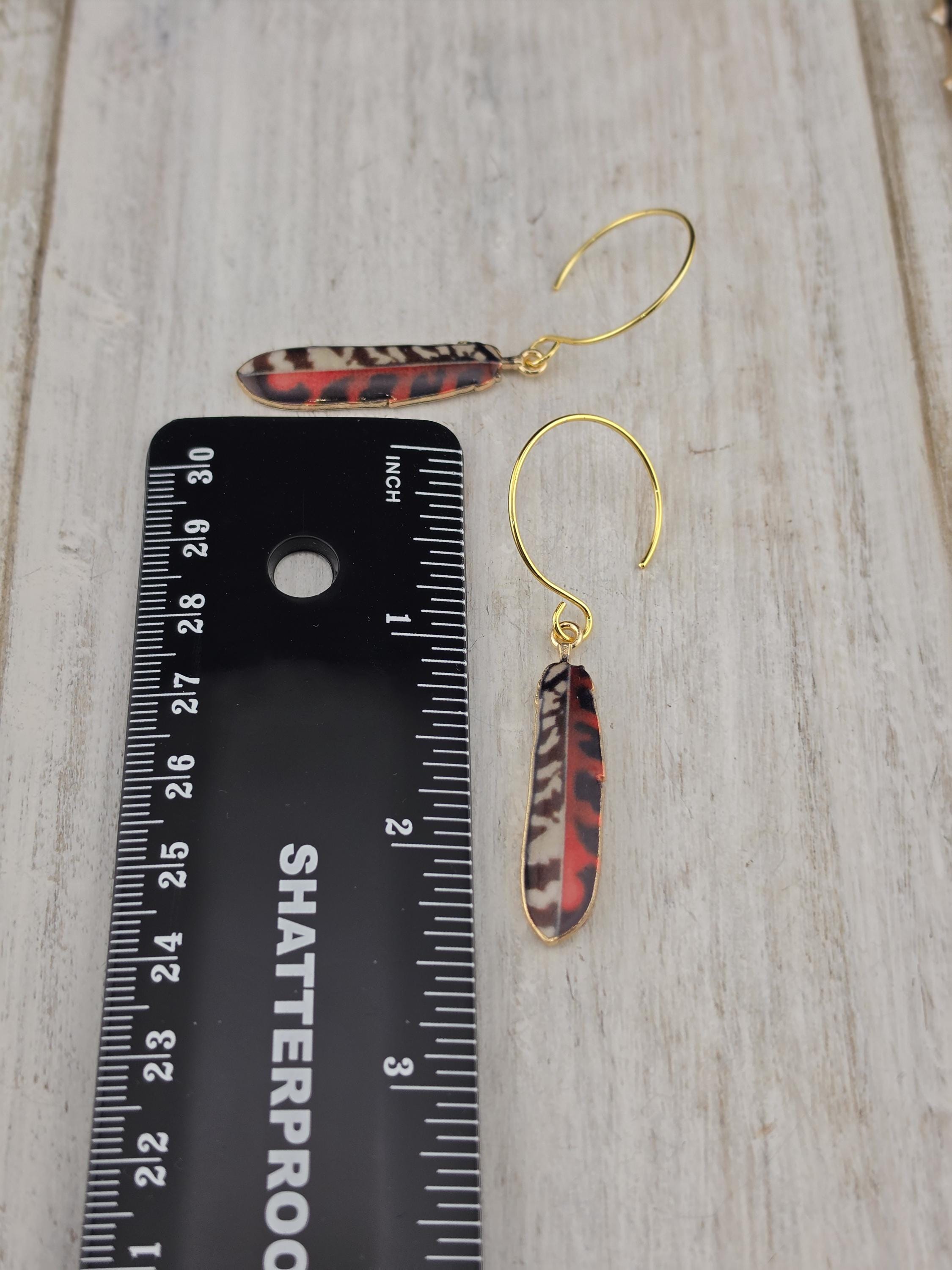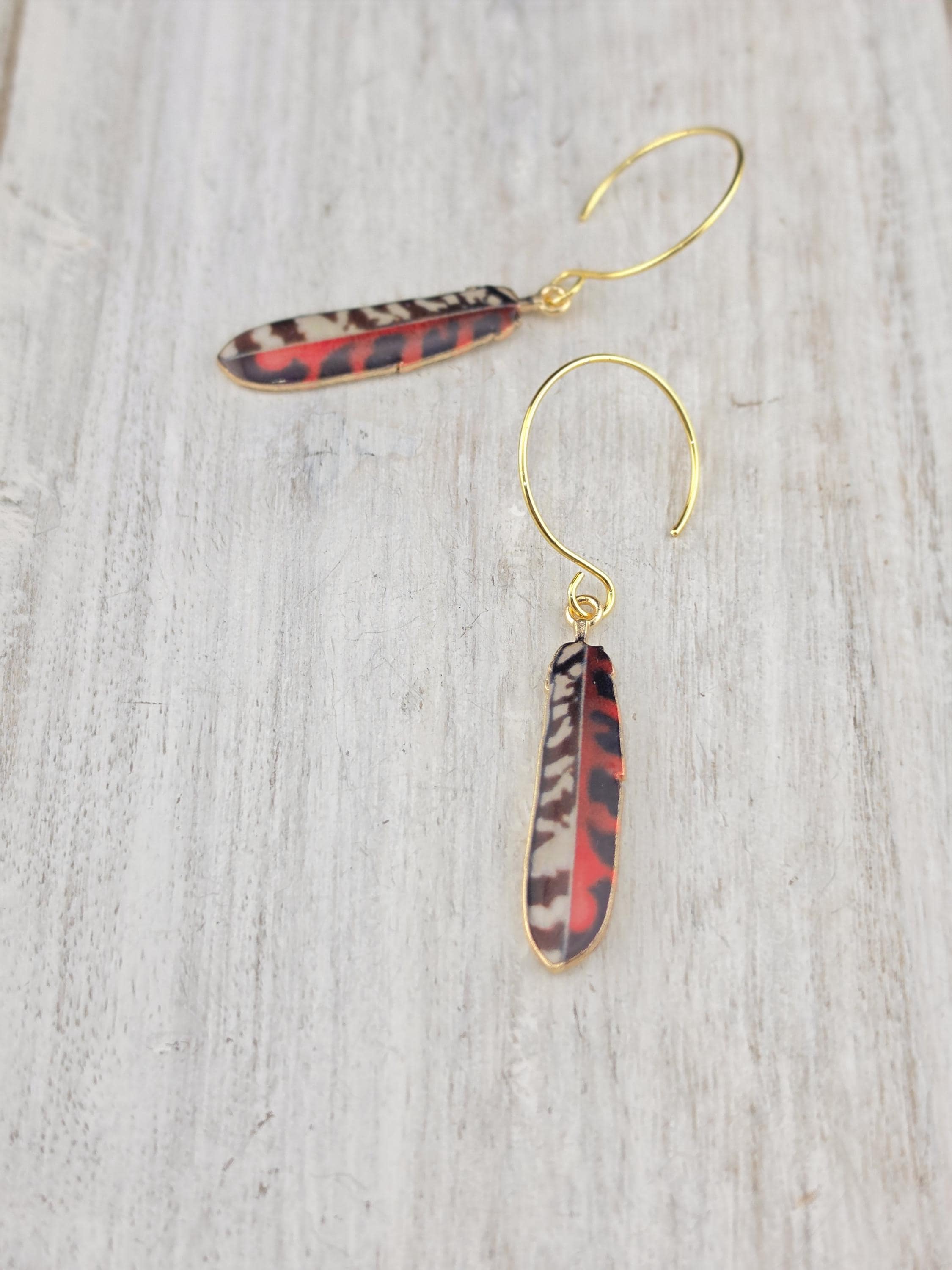 I made these using 18k gold plated circle hook style earrings. From each earring hangs a colorful pattern enamel feather. There are 8 to choose from. Such a cute boho look.