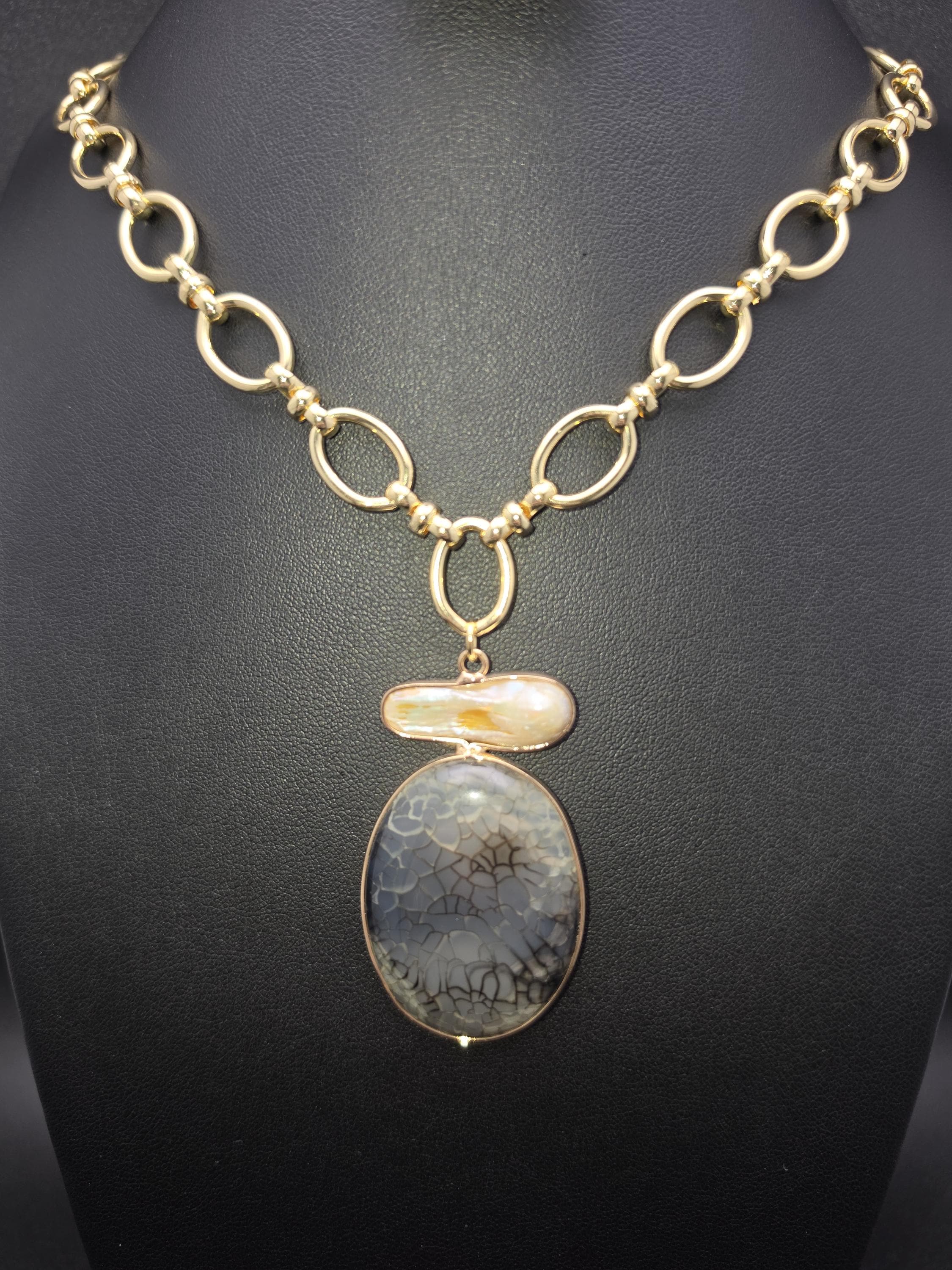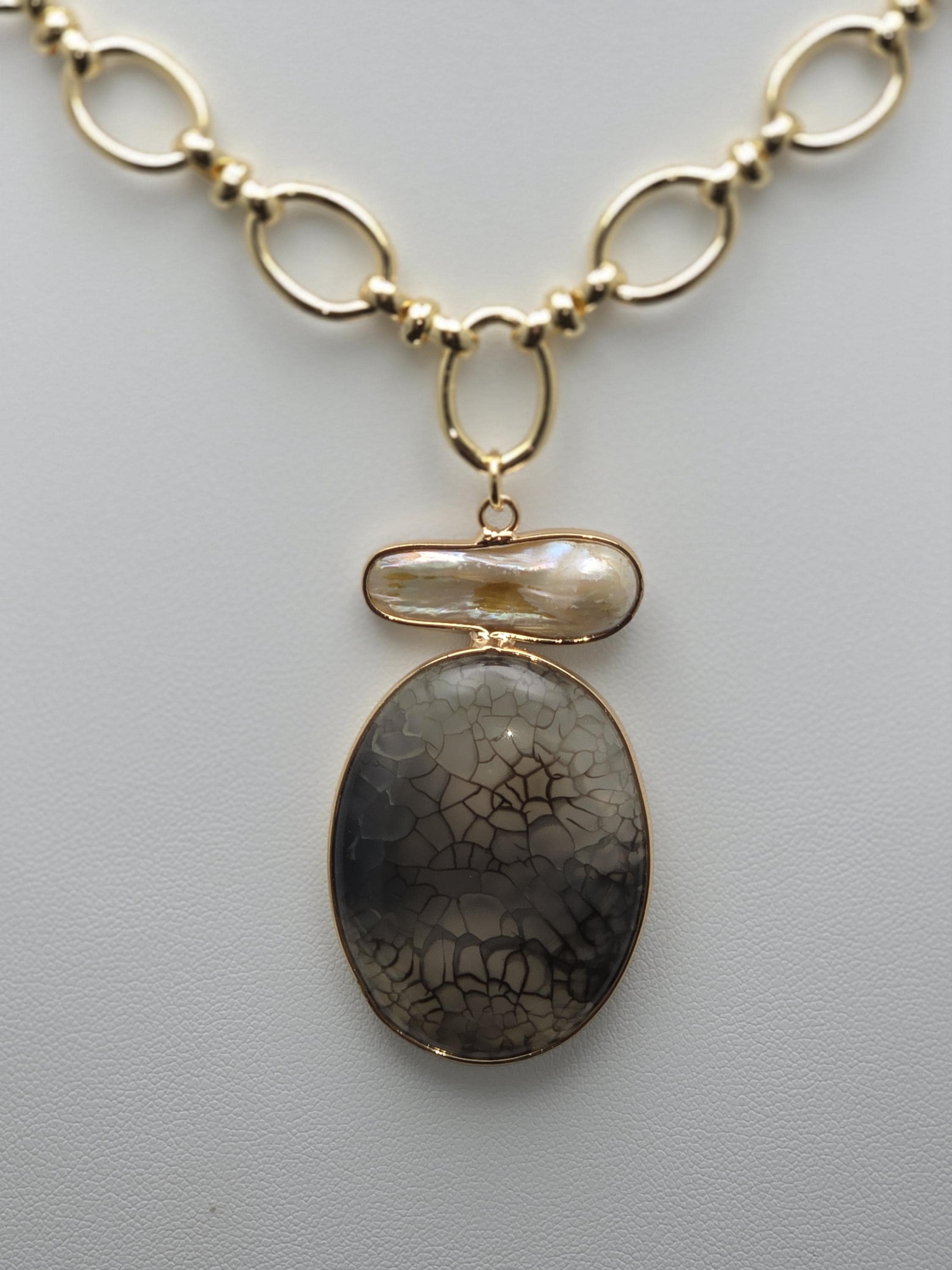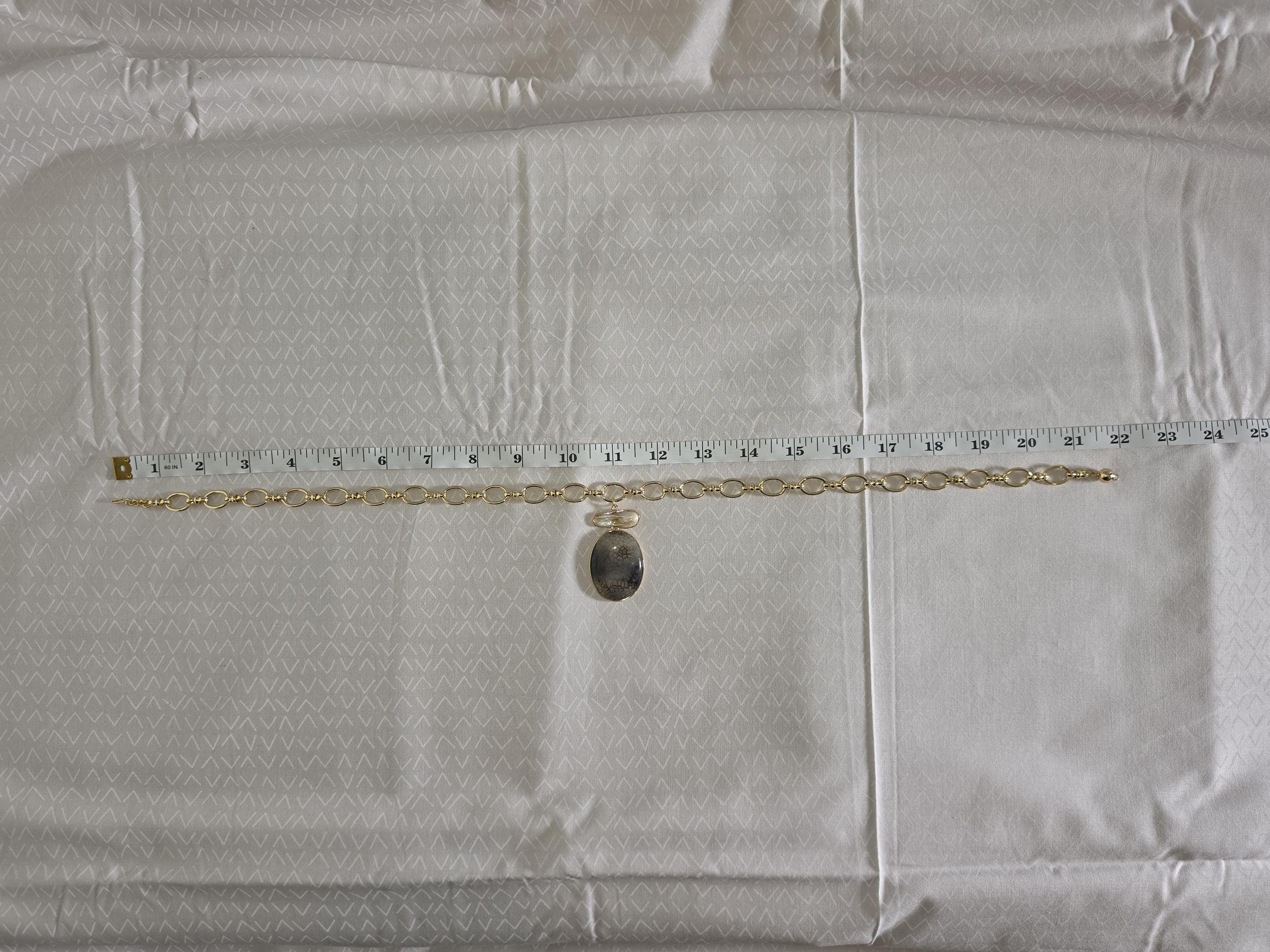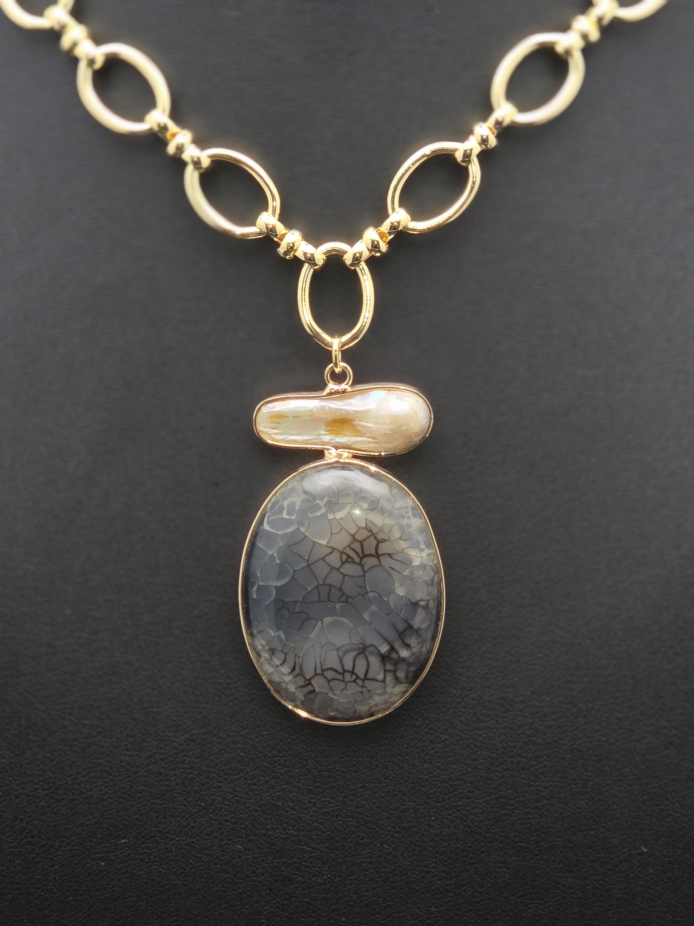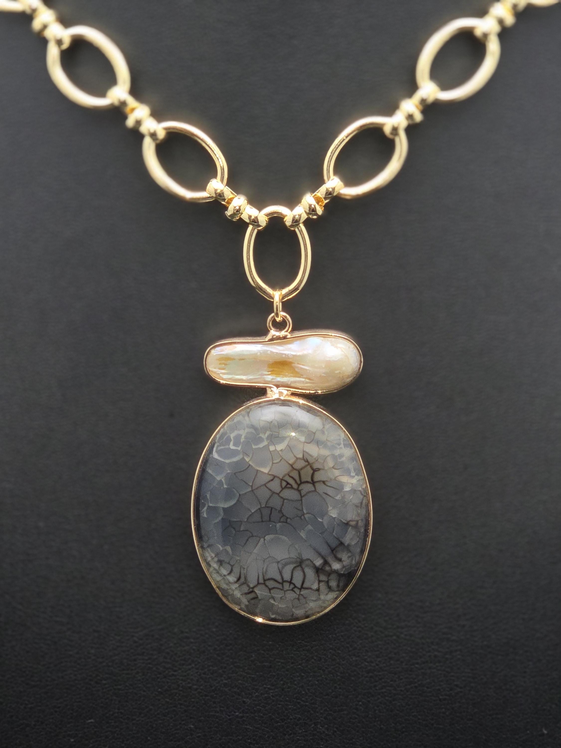 I made this necklace using tarnish resistant 18k gold plated oval rolo chain that has an 18k gold plated sphere locking clasp and 18k gold plated connecting rings. There is a large oval shaped pendant that features an irregular shaped light peach pearl atop a polished clear natural agate stone with black dragon scale like lines in the stone. The necklace is 21.5" long. Your purchase will arrive in pretty packaging