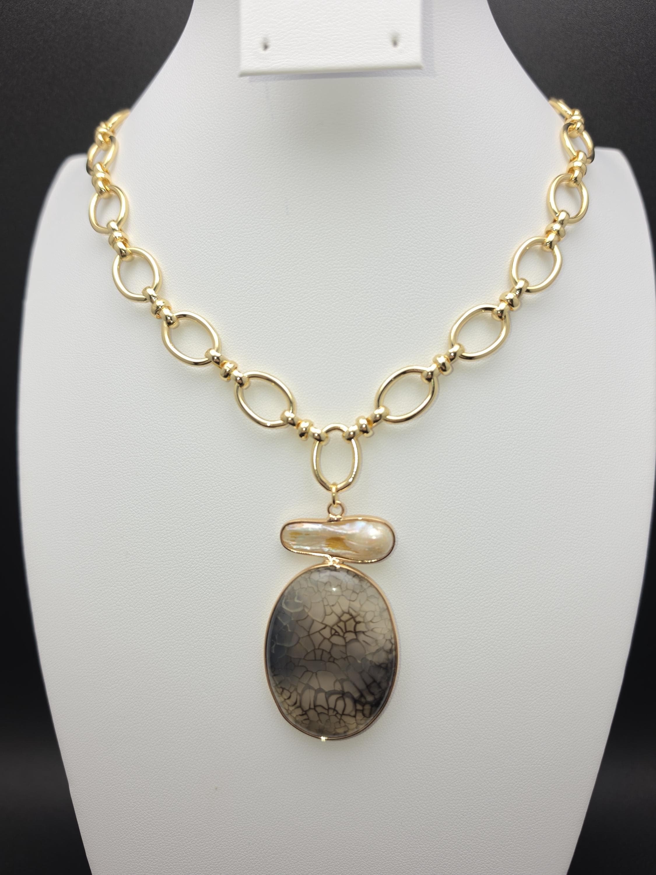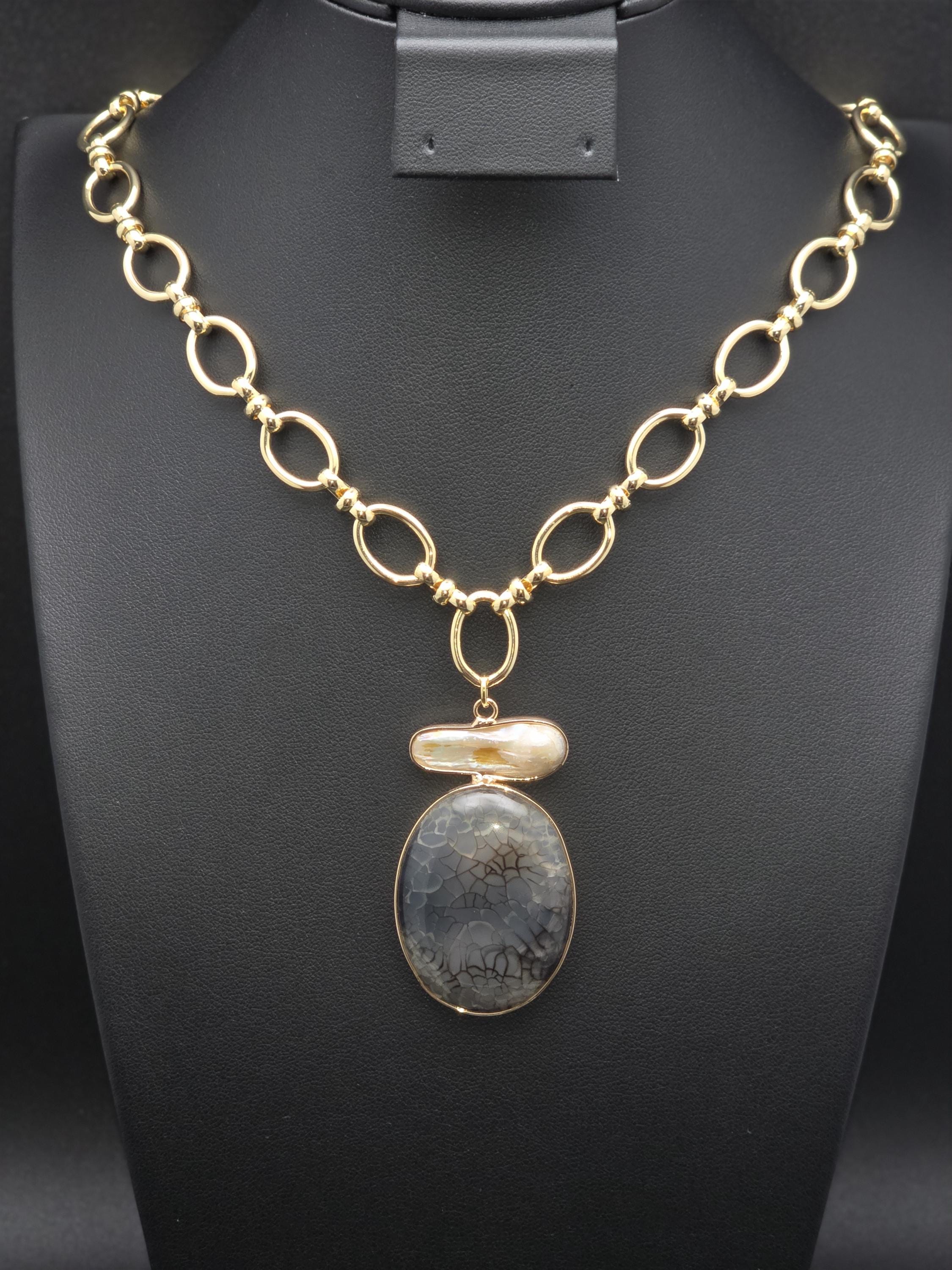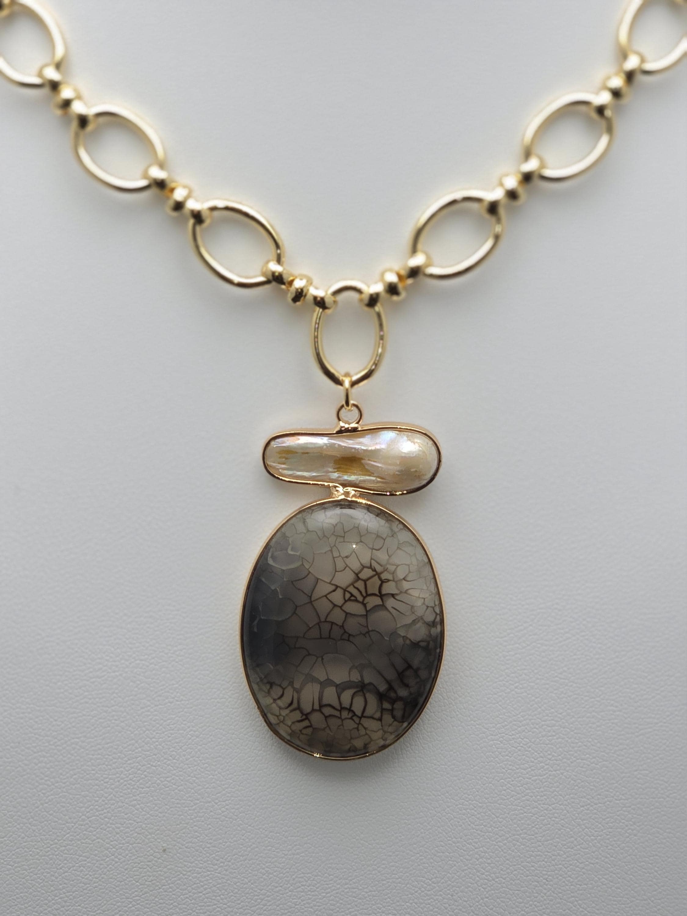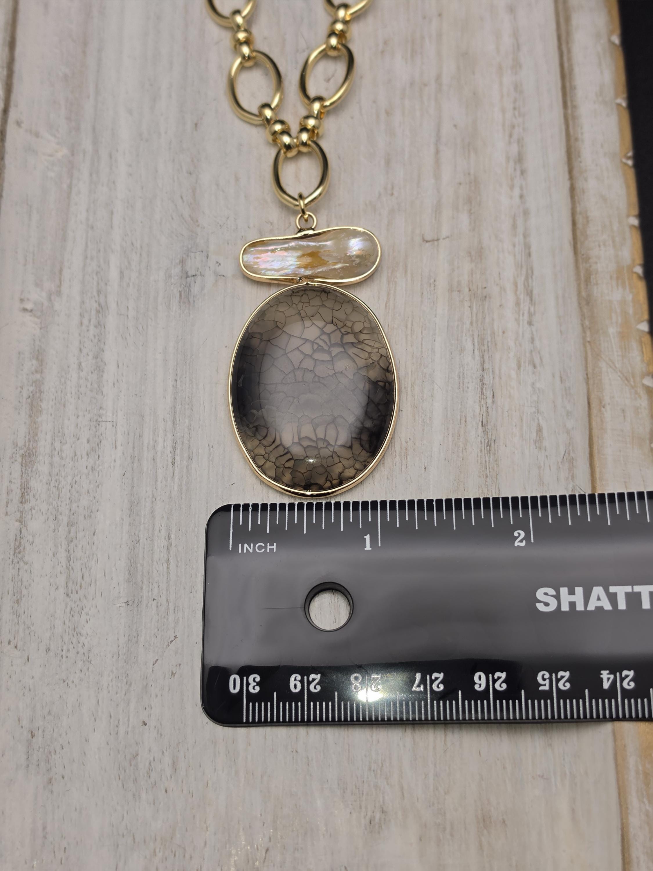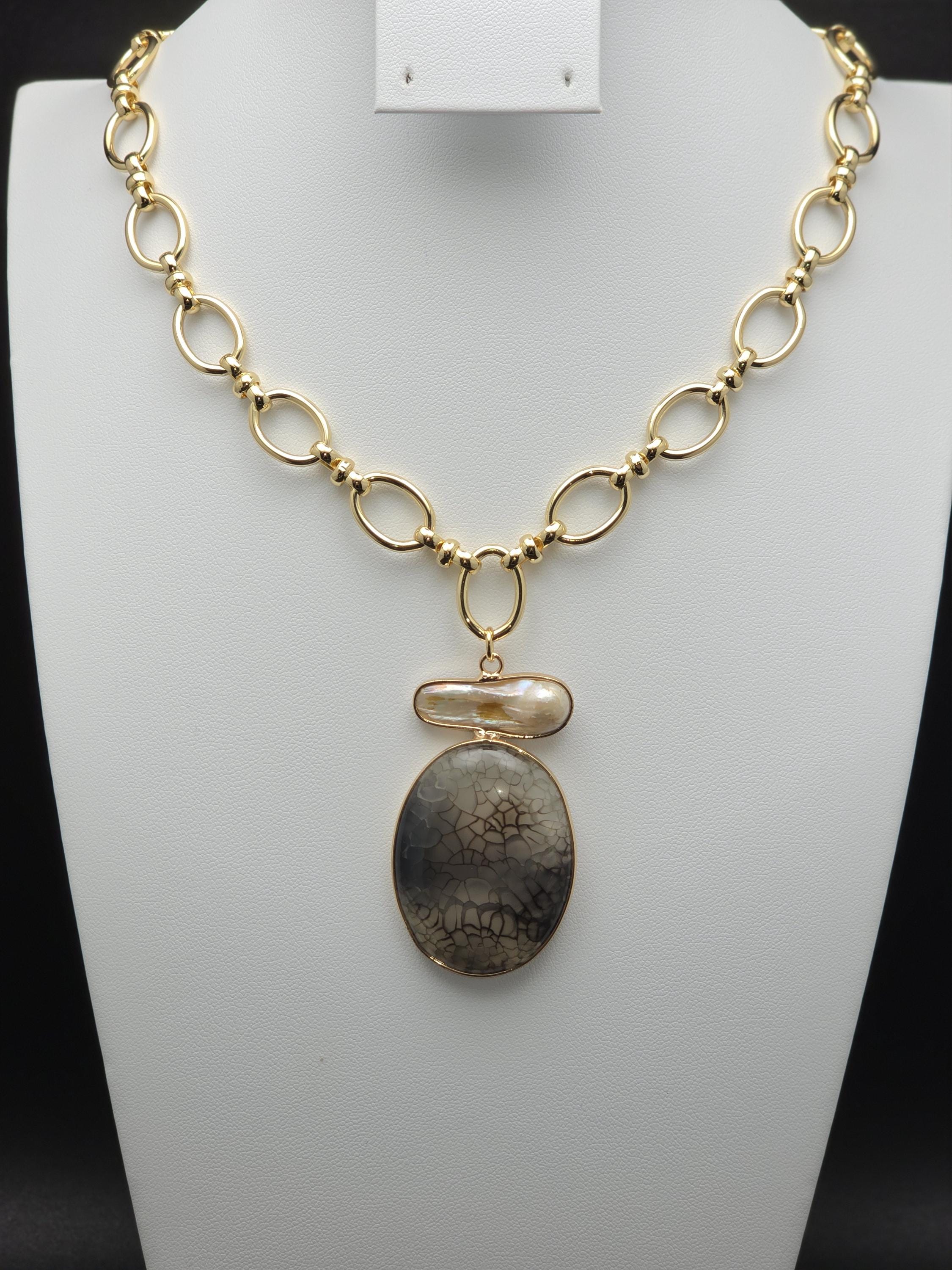 I made this necklace using tarnish resistant 18k gold plated oval rolo chain that has an 18k gold plated sphere locking clasp and 18k gold plated connecting rings. There is a large oval shaped pendant that features an irregular shaped light peach pearl atop a polished clear natural agate stone with black dragon scale like lines in the stone. The necklace is 21.5" long. Your purchase will arrive in pretty packaging