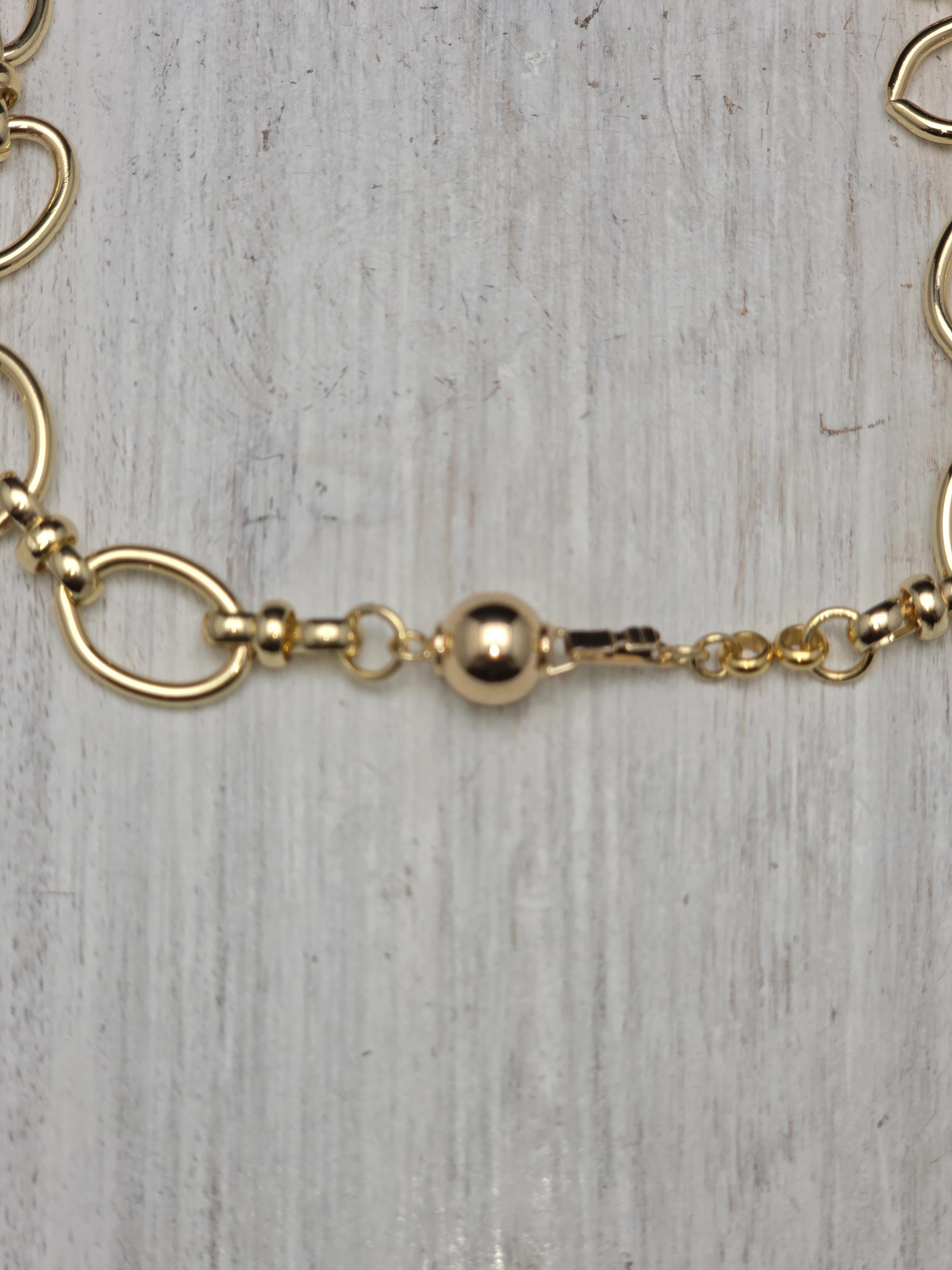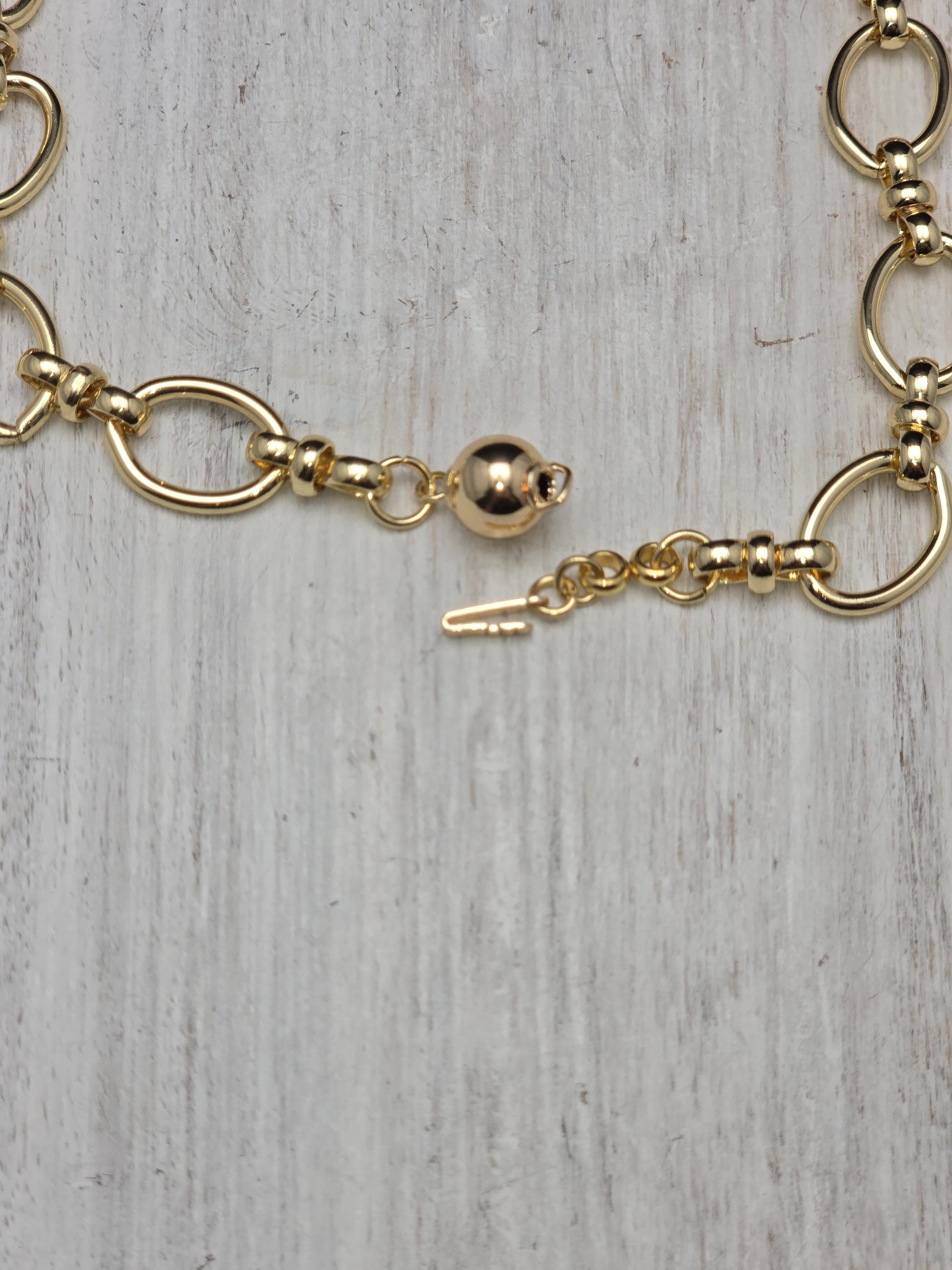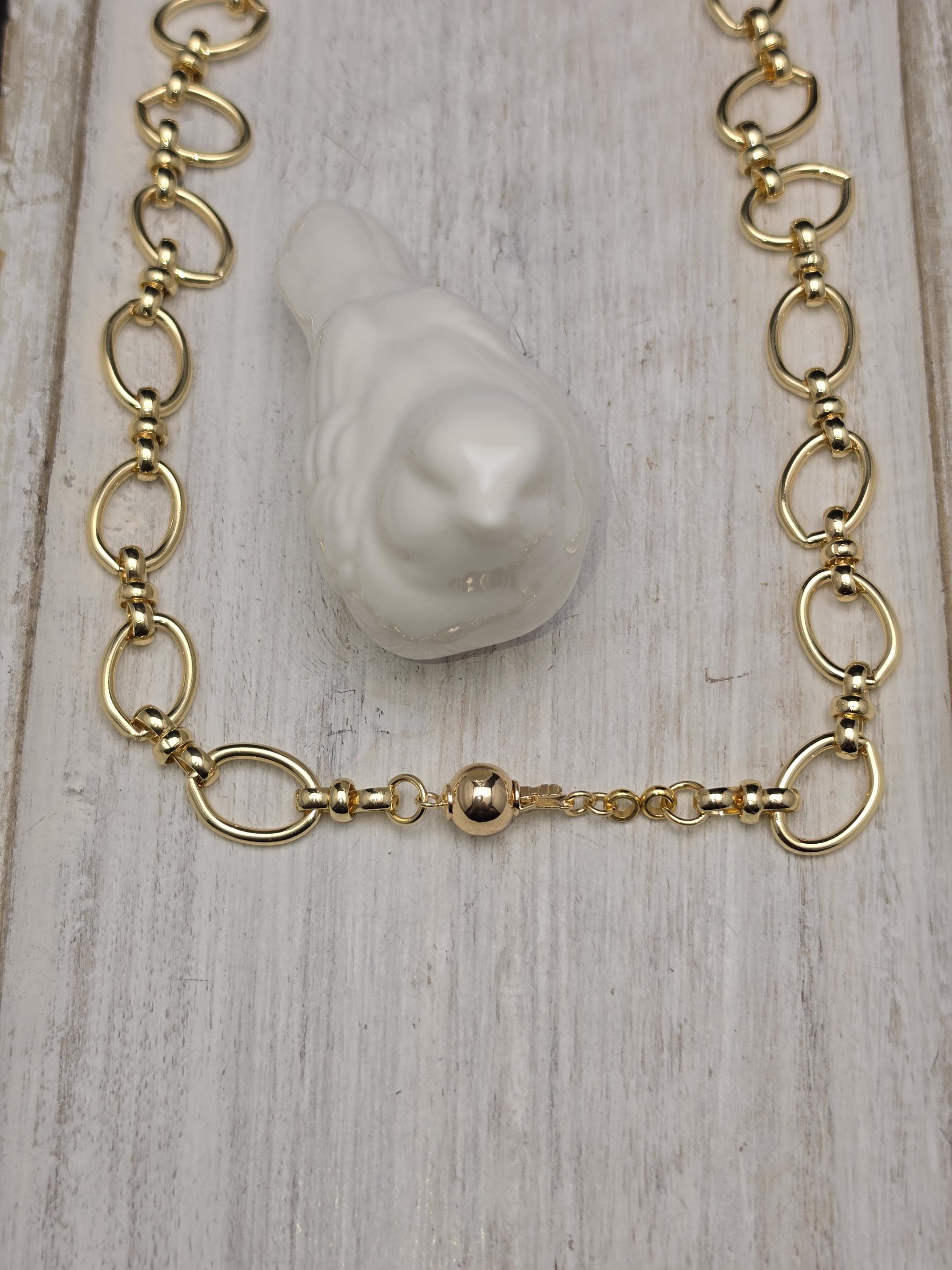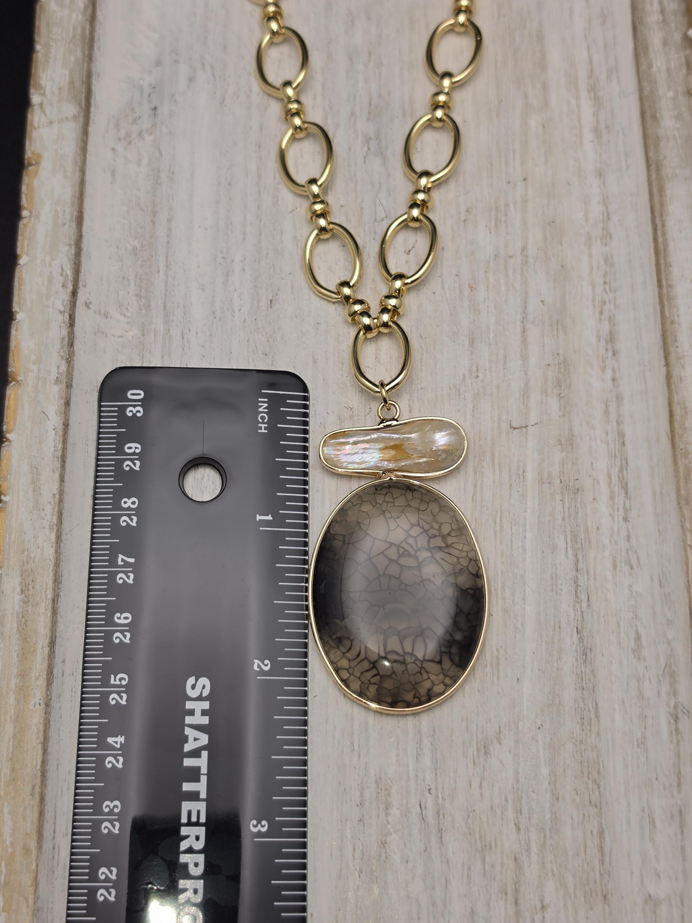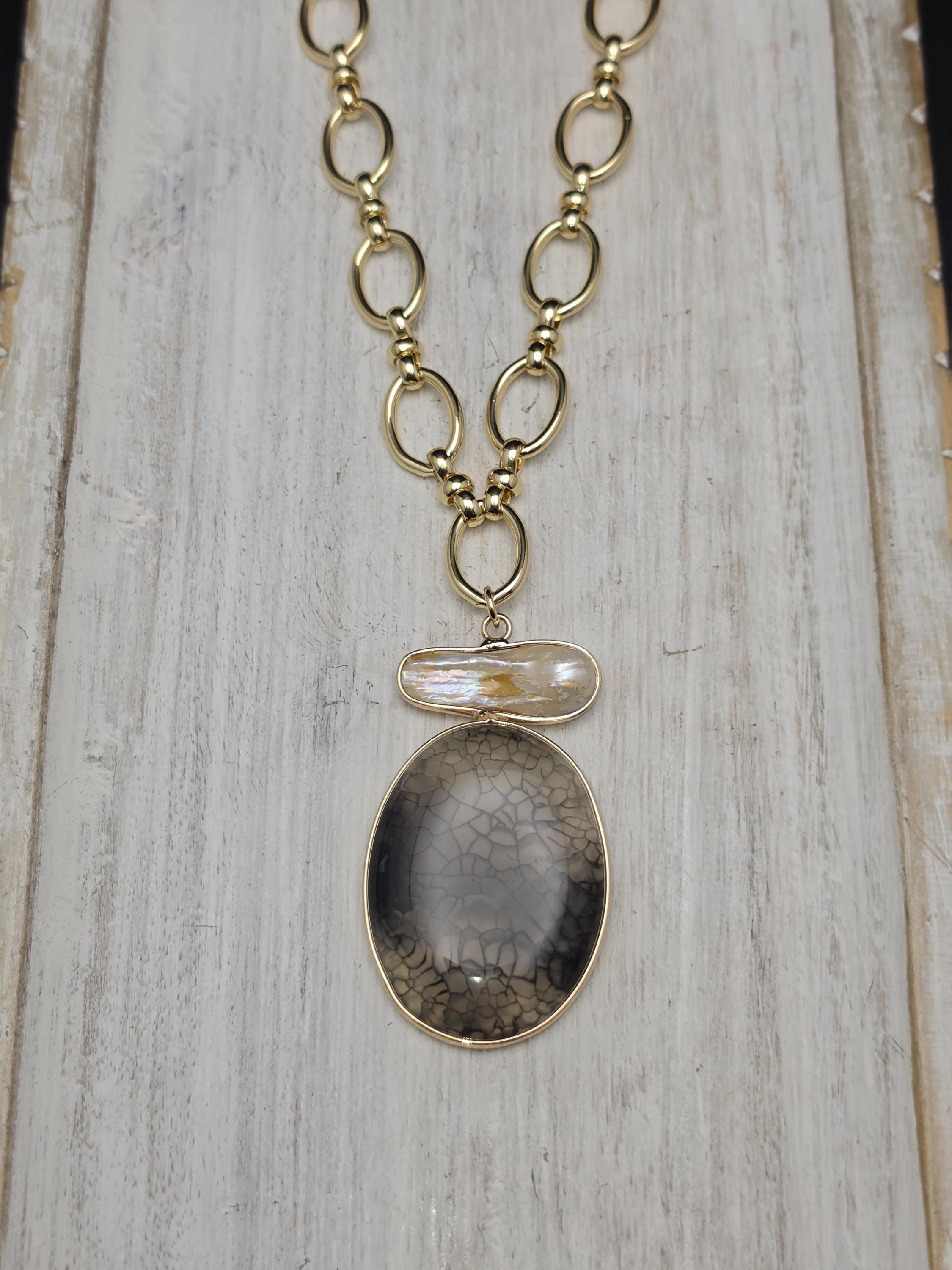 I made this necklace using tarnish resistant 18k gold plated oval rolo chain that has an 18k gold plated sphere locking clasp and 18k gold plated connecting rings. There is a large oval shaped pendant that features an irregular shaped light peach pearl atop a polished clear natural agate stone with black dragon scale like lines in the stone. The necklace is 21.5" long. Your purchase will arrive in pretty packaging