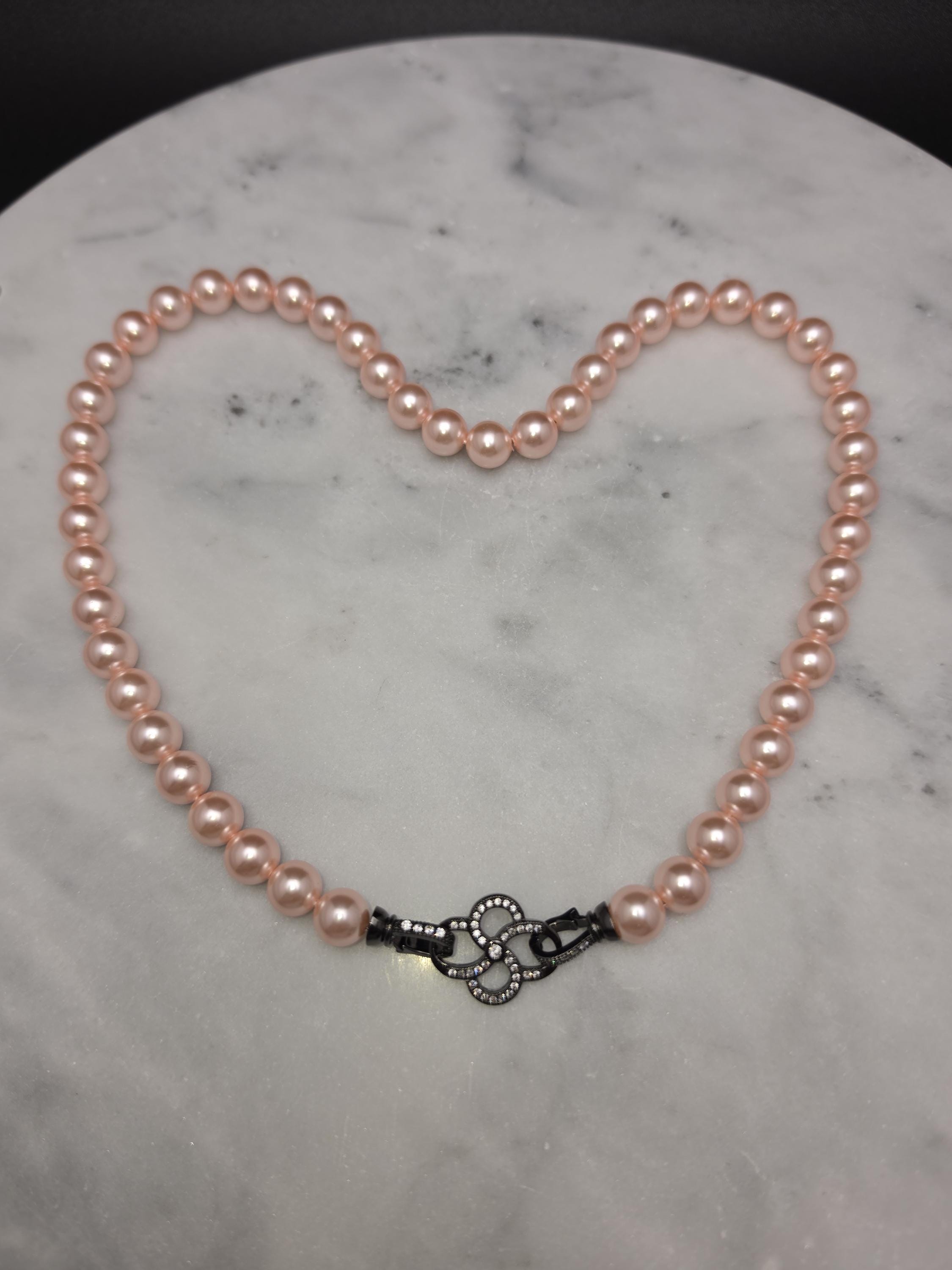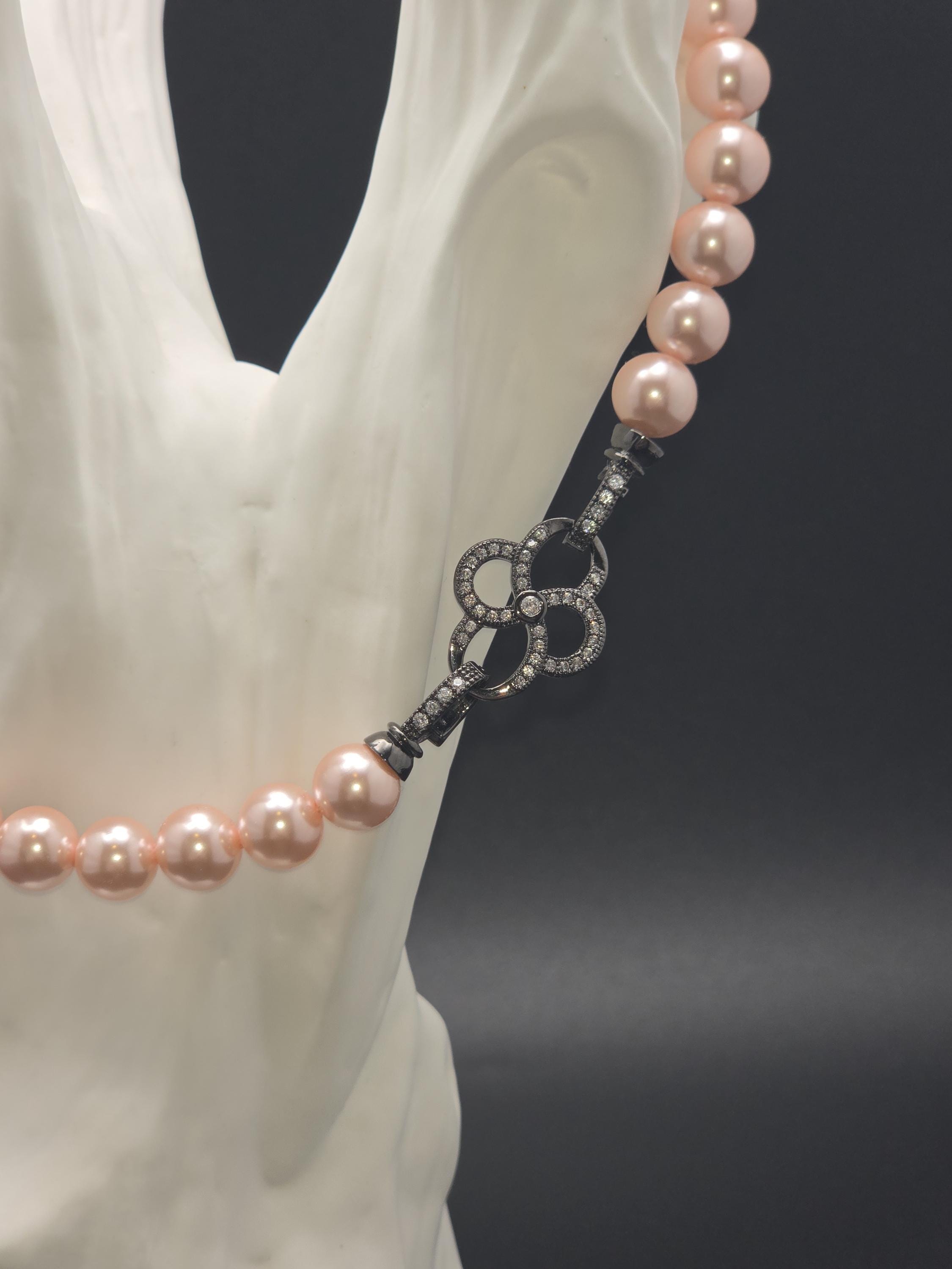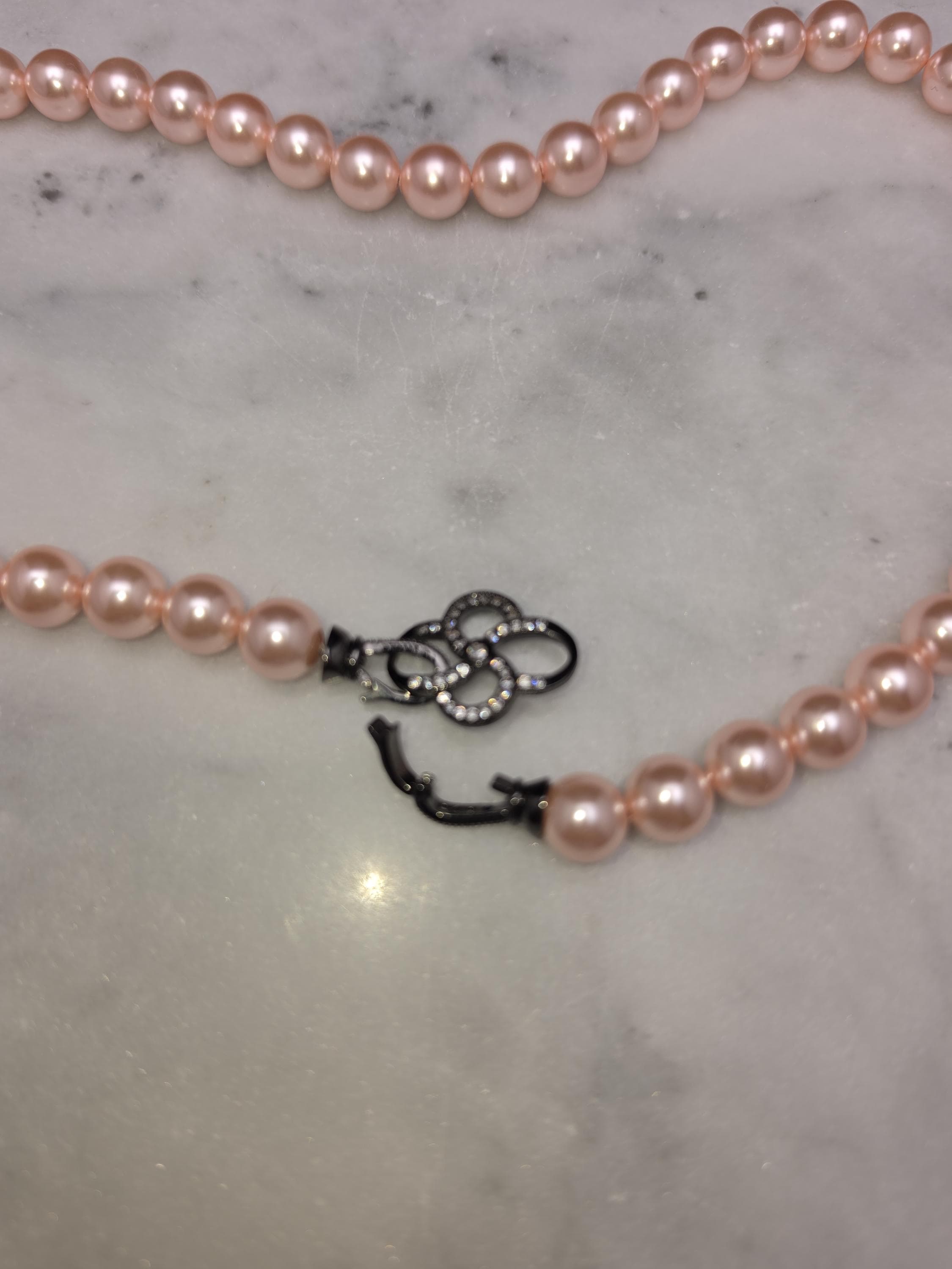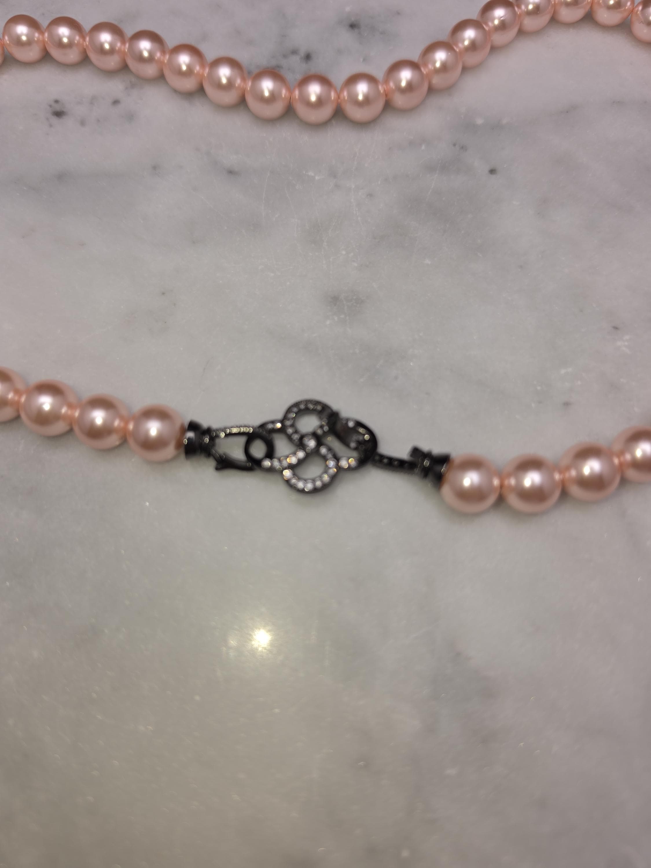 I hand strung AAA grade freshwater 8mm pink pearls to make this 17.25" necklace and gave it an ornate pave' black 925 sterling silver buckle style clasp. Absolutely gorgeous! * Your purchase will arrive in pretty packaging CARING FOR PEARLS: - Caring for pearls requires a gentle touch because they are organic gemstones—primarily calcium carbonate—that are more sensitive to chemicals and physical damage than harder stones like diamonds. - Last On: Put your pearls on only after you have finished applying makeup, hairspray, lotion, and perfume. The acids and alcohol in these products can erode the delicate nacre (outer layer) and cause permanent dullness. - First Off: Remove your pearls as soon as you get home. This prevents them from coming into contact with household cleaners or being subjected to unnecessary physical strain. DAILY MAINTENANCE - Wipe After Each Use: Gently wipe your pearls with a soft, clean cloth (like microfiber or chamois) after every wear to remove body oils and perspiration. - Deep Cleaning: If pearls become visibly dirty, use lukewarm water and a drop of extremely mild, non-detergent soap (like baby shampoo). - Do not soak: Use a damp cloth to wipe them individually. - Air dry flat: Lay the strand on a soft towel and let it dry completely before storing. - Avoid Machines: Never use ultrasonic or steam cleaners, as the vibrations and heat can crack the pearls. PROPER STORAGE - Lay Flat: Store necklaces and bracelets flat to prevent the string from stretching over time. - Store Separately: Keep pearls in a soft fabric pouch or a lined jewelry box away from harder gemstones and metals that could scratch them. - Let Them Breathe: Do not store pearls in airtight containers or plastic bags. They need the natural moisture from the air to prevent them from becoming brittle and yellowing. LONG-TERM CARE - Wear Them Often: Pearls actually benefit from frequent wear; they absorb the natural oils from your skin, which helps maintain their luster and hydration.