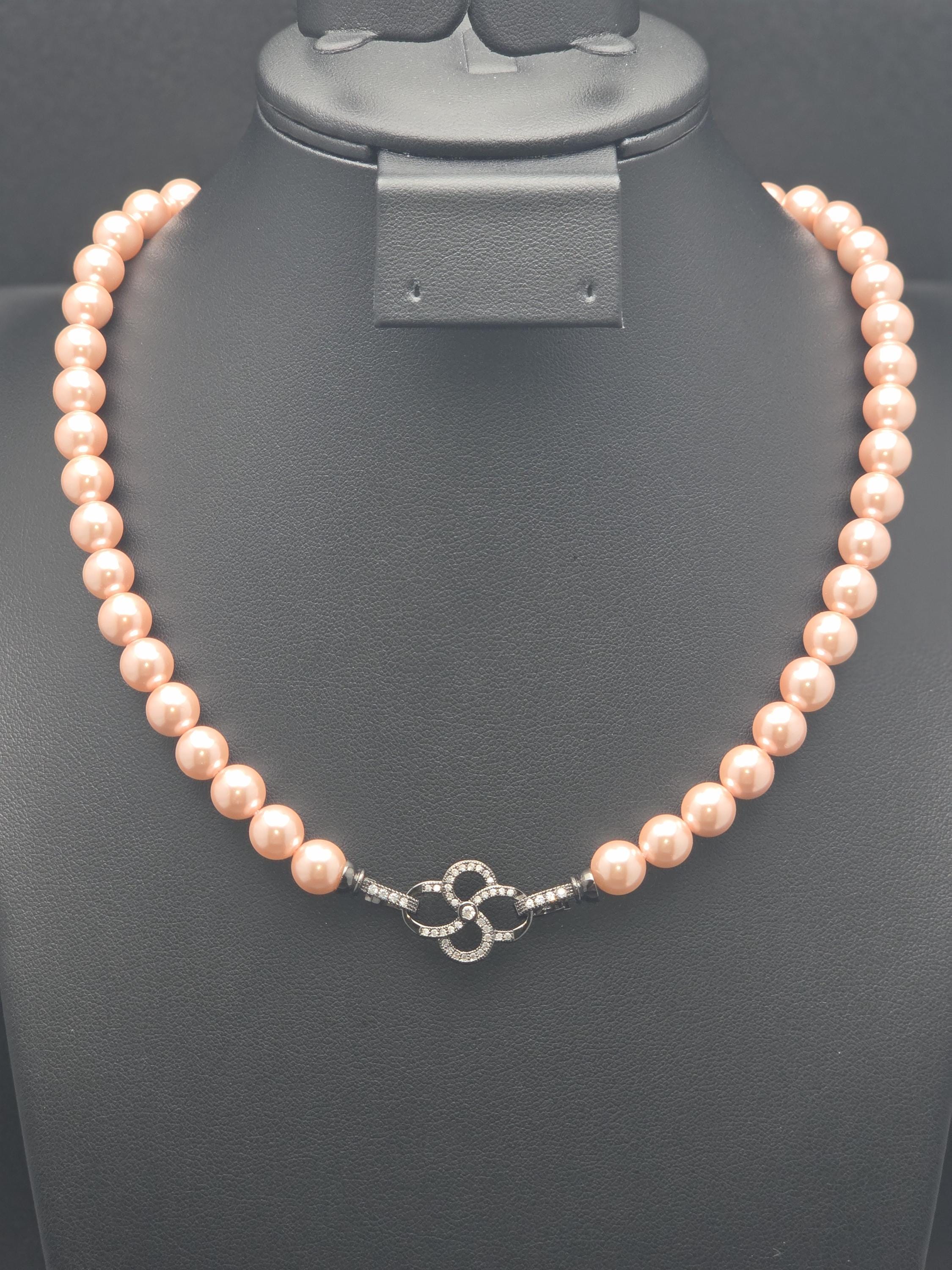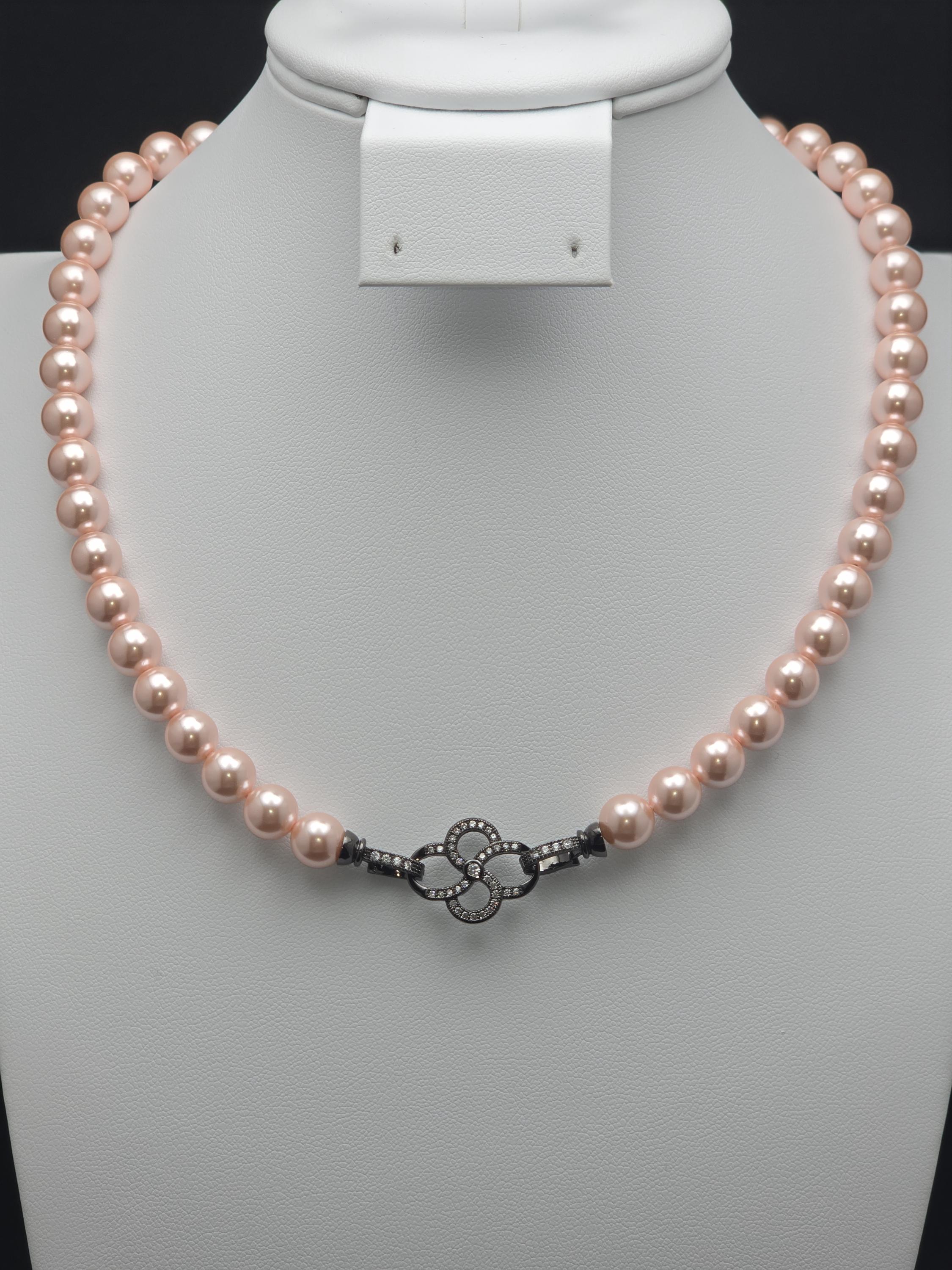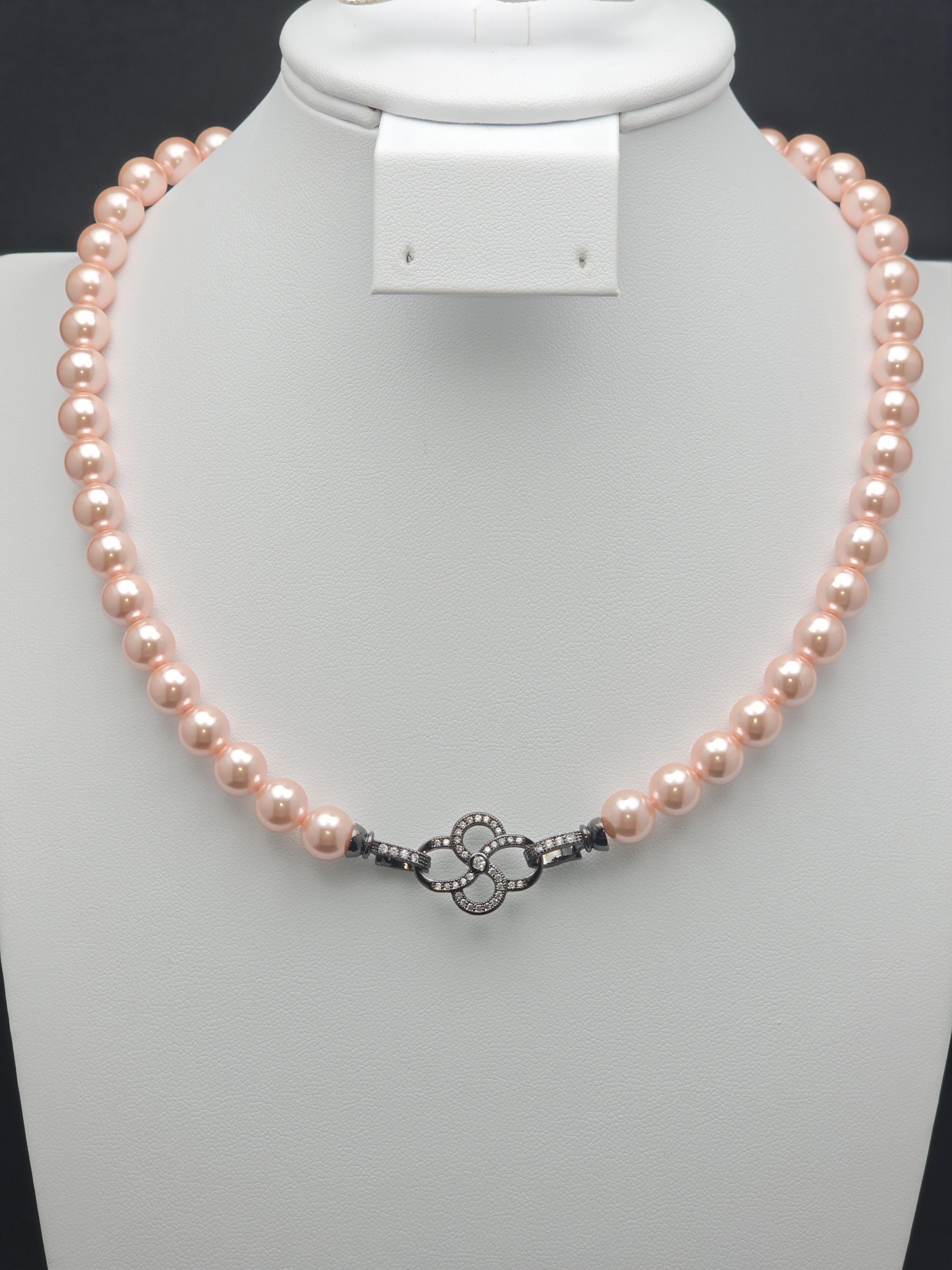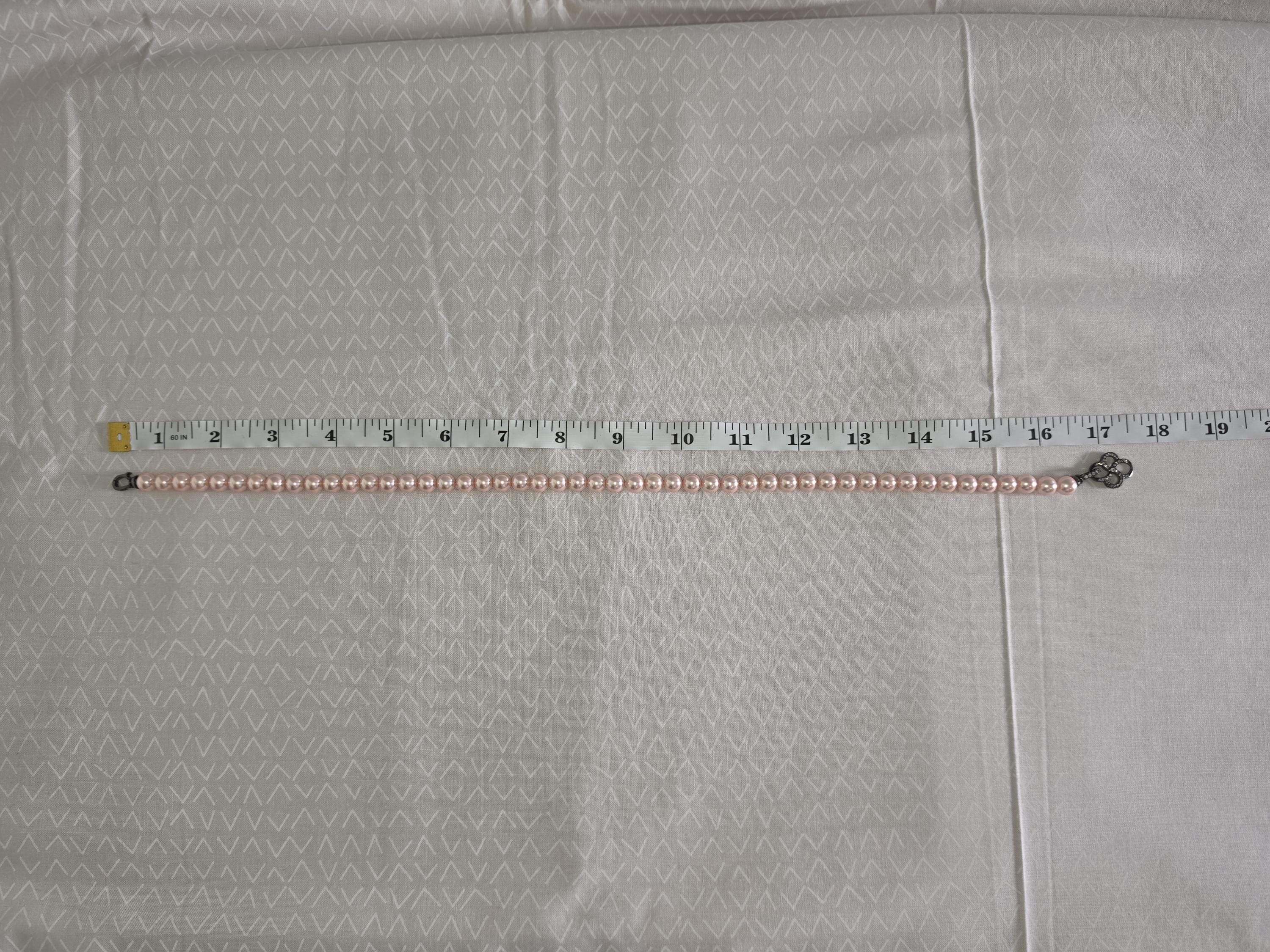 I hand strung AAA grade freshwater 8mm pink pearls to make this 17.25" necklace and gave it an ornate pave' black 925 sterling silver buckle style clasp. Absolutely gorgeous! * Your purchase will arrive in pretty packaging CARING FOR PEARLS: - Caring for pearls requires a gentle touch because they are organic gemstones—primarily calcium carbonate—that are more sensitive to chemicals and physical damage than harder stones like diamonds. - Last On: Put your pearls on only after you have finished applying makeup, hairspray, lotion, and perfume. The acids and alcohol in these products can erode the delicate nacre (outer layer) and cause permanent dullness. - First Off: Remove your pearls as soon as you get home. This prevents them from coming into contact with household cleaners or being subjected to unnecessary physical strain. DAILY MAINTENANCE - Wipe After Each Use: Gently wipe your pearls with a soft, clean cloth (like microfiber or chamois) after every wear to remove body oils and perspiration. - Deep Cleaning: If pearls become visibly dirty, use lukewarm water and a drop of extremely mild, non-detergent soap (like baby shampoo). - Do not soak: Use a damp cloth to wipe them individually. - Air dry flat: Lay the strand on a soft towel and let it dry completely before storing. - Avoid Machines: Never use ultrasonic or steam cleaners, as the vibrations and heat can crack the pearls. PROPER STORAGE - Lay Flat: Store necklaces and bracelets flat to prevent the string from stretching over time. - Store Separately: Keep pearls in a soft fabric pouch or a lined jewelry box away from harder gemstones and metals that could scratch them. - Let Them Breathe: Do not store pearls in airtight containers or plastic bags. They need the natural moisture from the air to prevent them from becoming brittle and yellowing. LONG-TERM CARE - Wear Them Often: Pearls actually benefit from frequent wear; they absorb the natural oils from your skin, which helps maintain their luster and hydration.