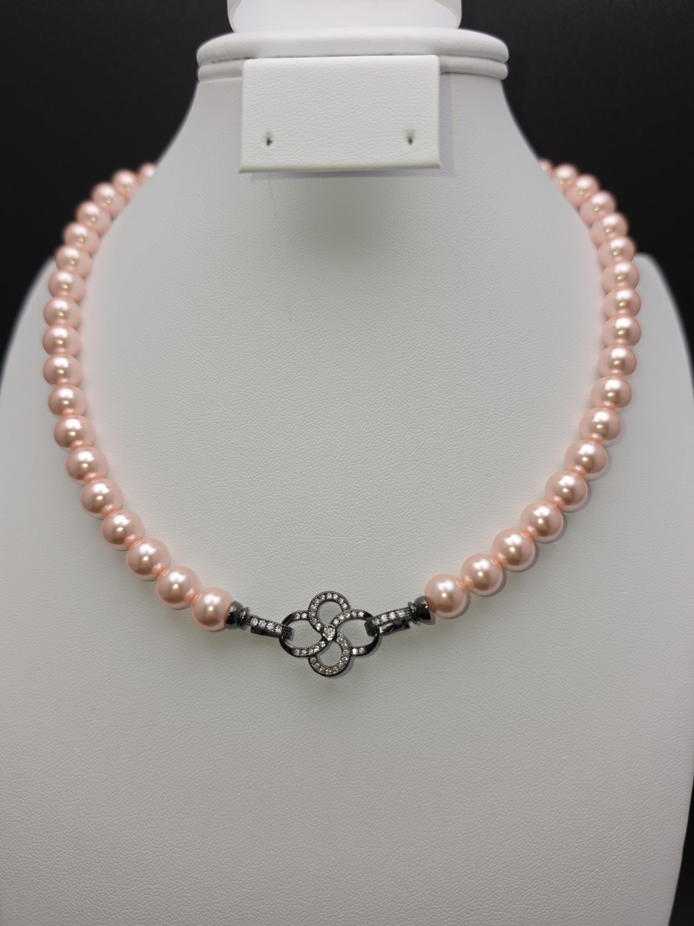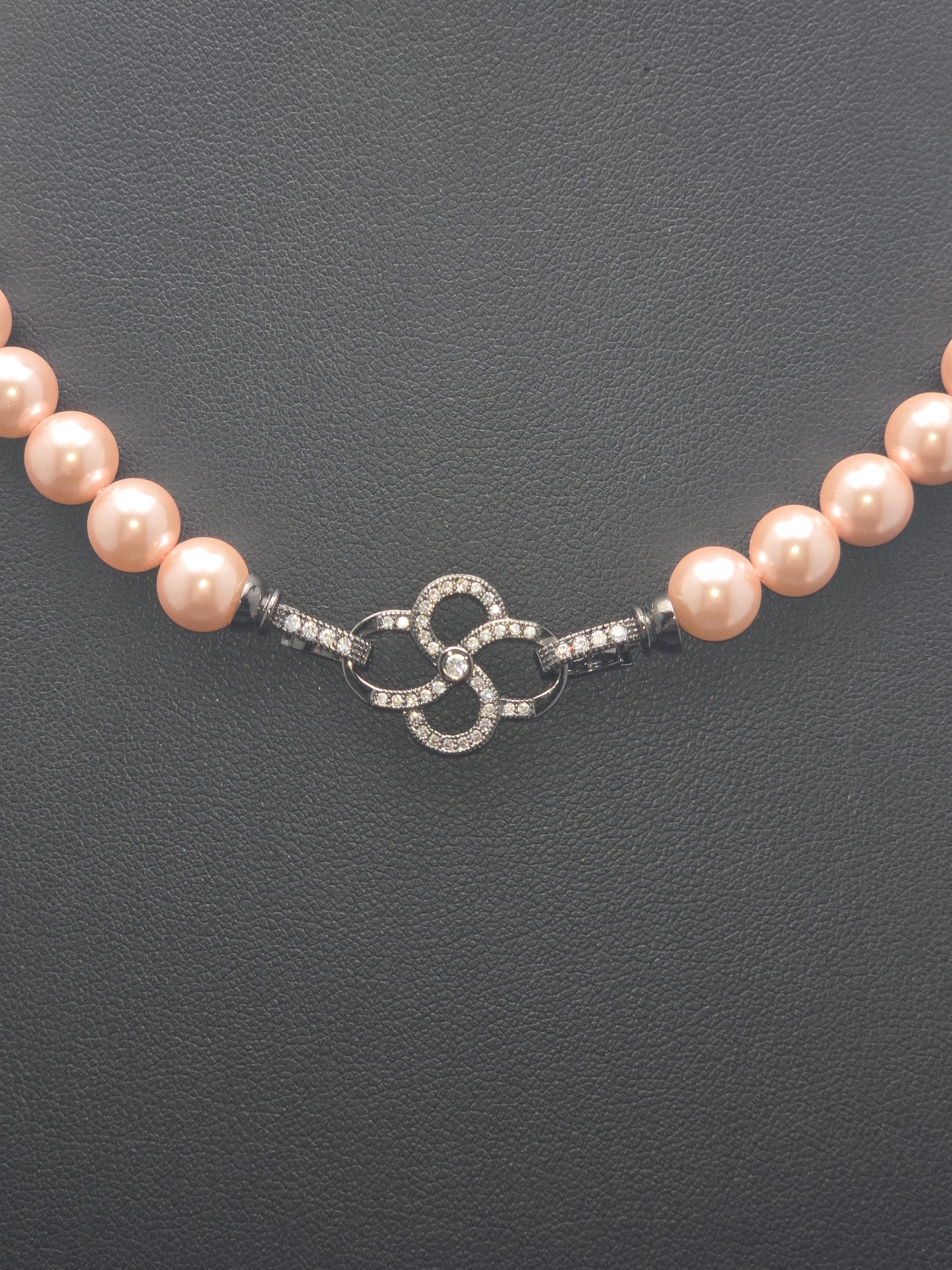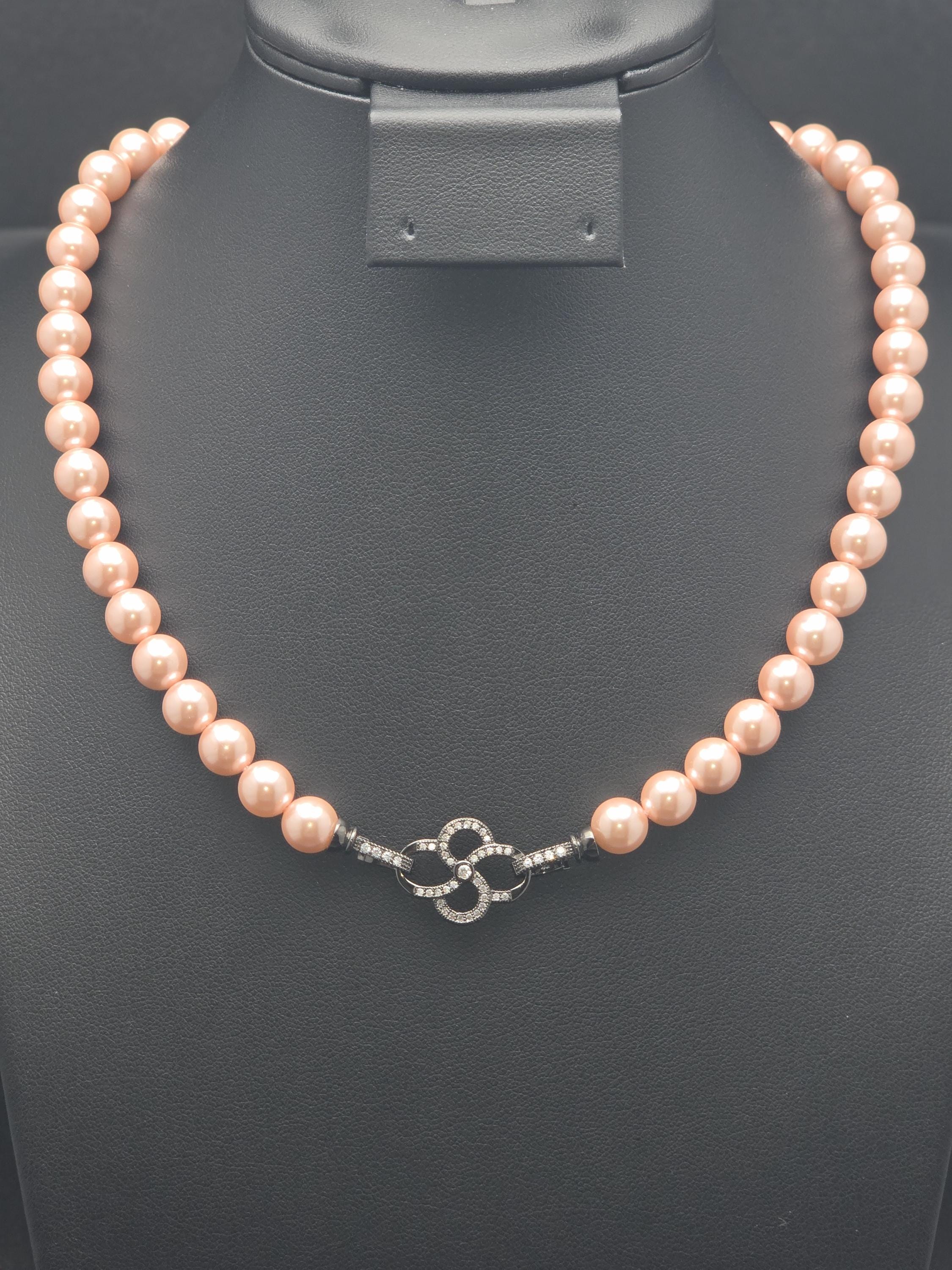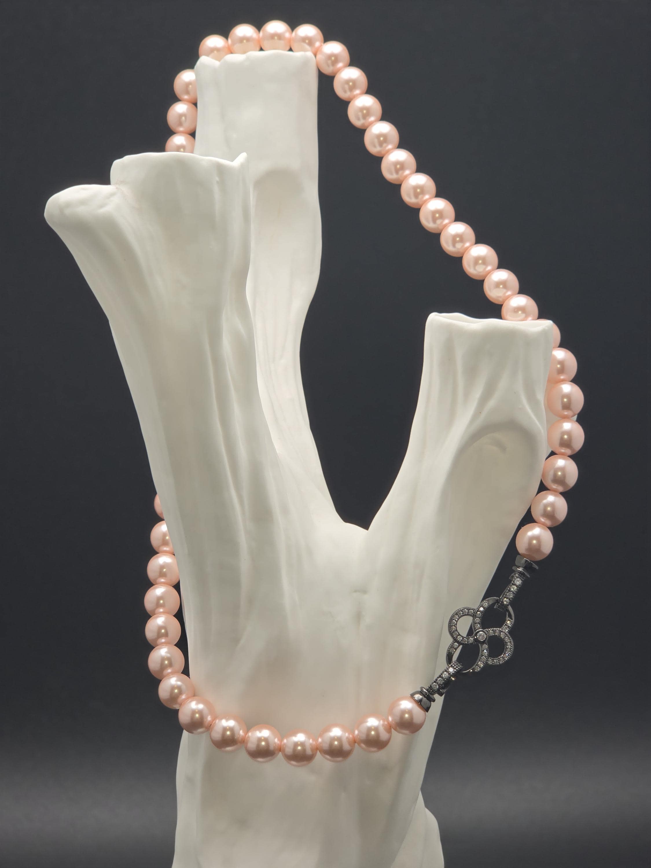 I hand strung AAA grade freshwater 8mm pink pearls to make this 17.25" necklace and gave it an ornate pave' black 925 sterling silver buckle style clasp. Absolutely gorgeous! * Your purchase will arrive in pretty packaging CARING FOR PEARLS: - Caring for pearls requires a gentle touch because they are organic gemstones—primarily calcium carbonate—that are more sensitive to chemicals and physical damage than harder stones like diamonds. - Last On: Put your pearls on only after you have finished applying makeup, hairspray, lotion, and perfume. The acids and alcohol in these products can erode the delicate nacre (outer layer) and cause permanent dullness. - First Off: Remove your pearls as soon as you get home. This prevents them from coming into contact with household cleaners or being subjected to unnecessary physical strain. DAILY MAINTENANCE - Wipe After Each Use: Gently wipe your pearls with a soft, clean cloth (like microfiber or chamois) after every wear to remove body oils and perspiration. - Deep Cleaning: If pearls become visibly dirty, use lukewarm water and a drop of extremely mild, non-detergent soap (like baby shampoo). - Do not soak: Use a damp cloth to wipe them individually. - Air dry flat: Lay the strand on a soft towel and let it dry completely before storing. - Avoid Machines: Never use ultrasonic or steam cleaners, as the vibrations and heat can crack the pearls. PROPER STORAGE - Lay Flat: Store necklaces and bracelets flat to prevent the string from stretching over time. - Store Separately: Keep pearls in a soft fabric pouch or a lined jewelry box away from harder gemstones and metals that could scratch them. - Let Them Breathe: Do not store pearls in airtight containers or plastic bags. They need the natural moisture from the air to prevent them from becoming brittle and yellowing. LONG-TERM CARE - Wear Them Often: Pearls actually benefit from frequent wear; they absorb the natural oils from your skin, which helps maintain their luster and hydration.