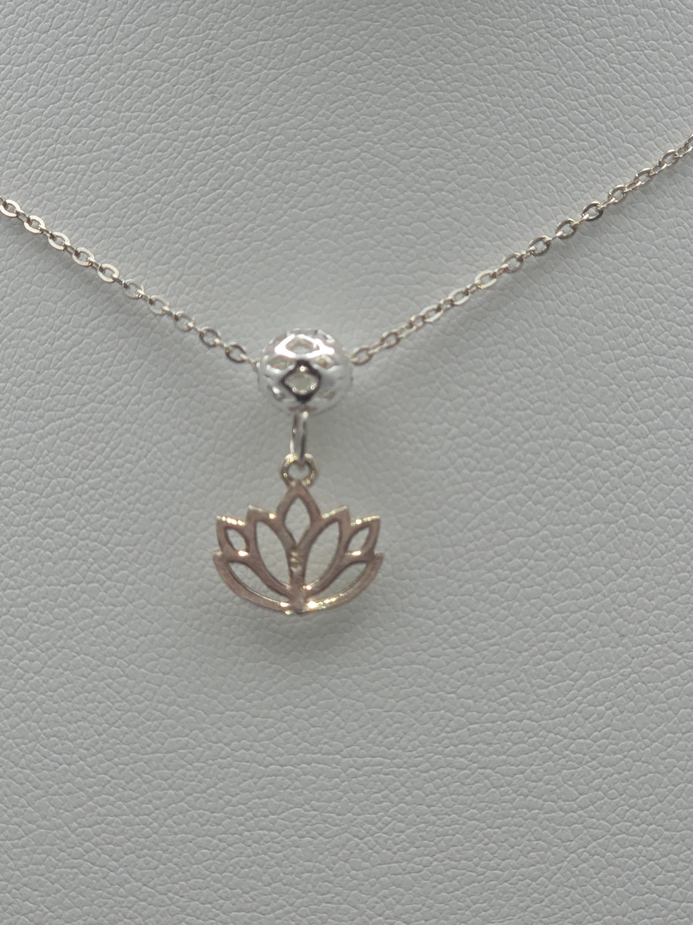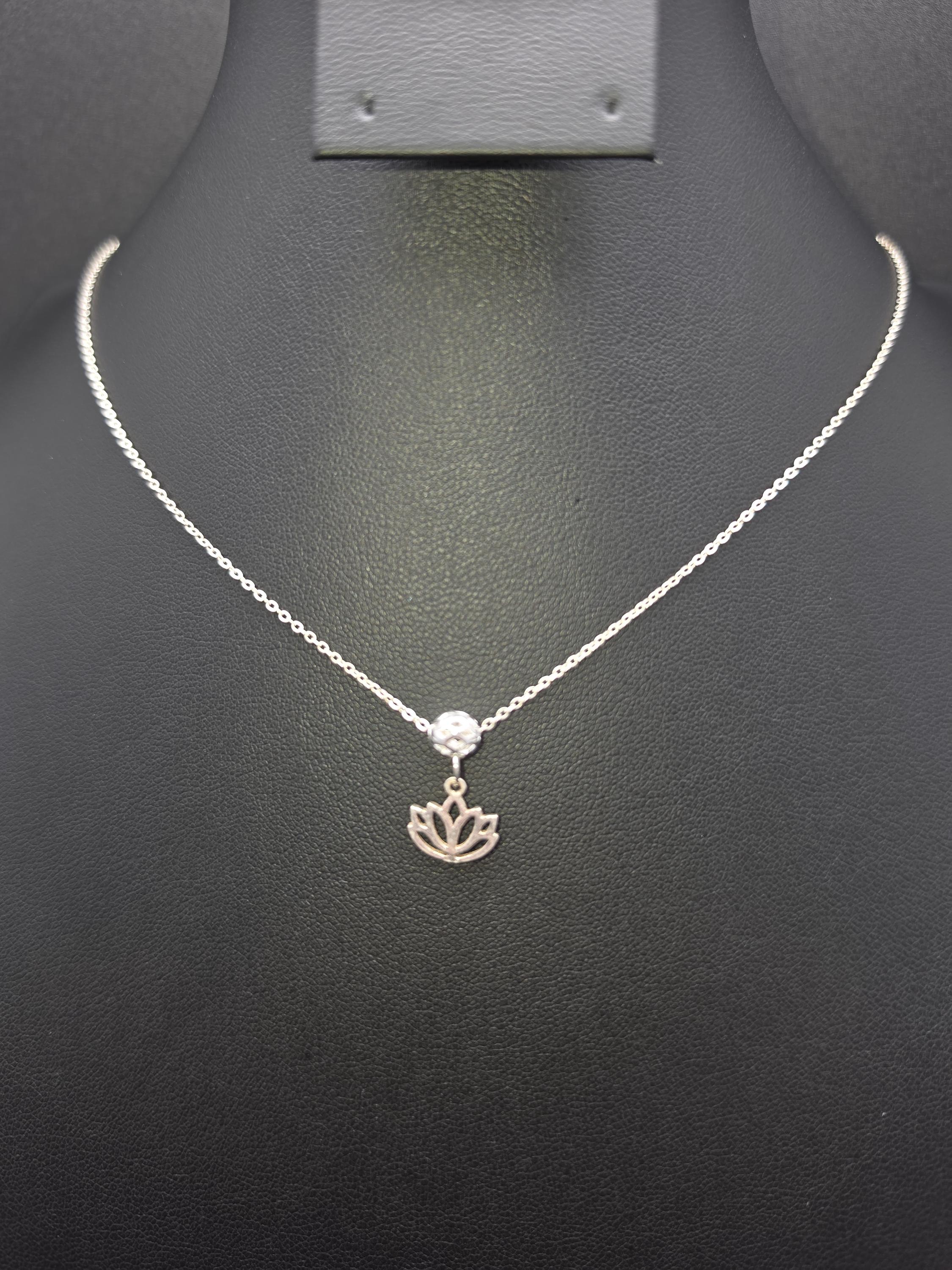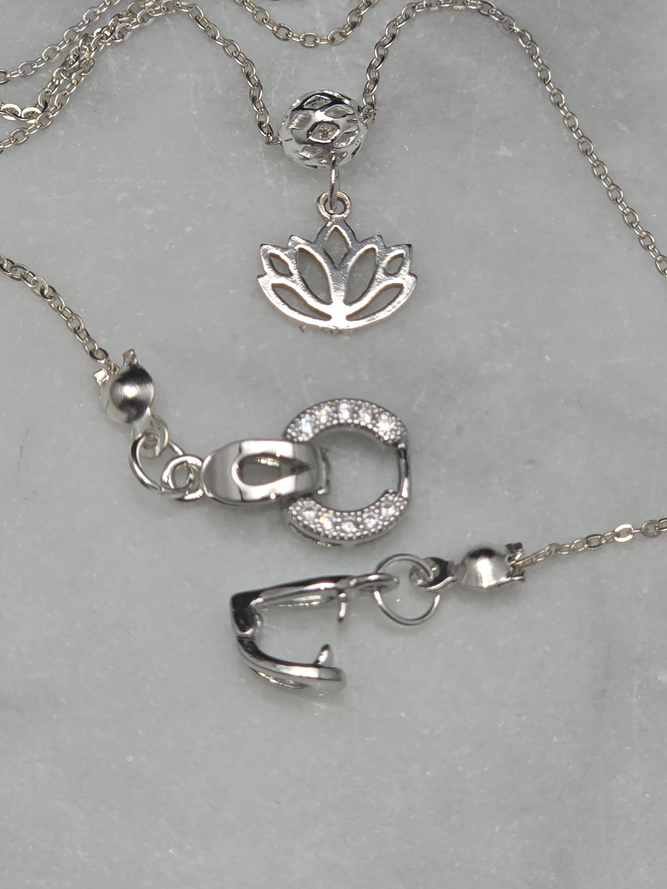 I made this necklace using delicate 925 sterling silver chain and gave it a beautiful pave' circle double hinge clasp. It is 19.5" long and is not adjustable. I added a small 925 sterling silver lotus flower pendant that has a 925 sterling silver hollow filigree bead embellishment. It is elegantly zen. * Your purchase will arrive in pretty packaging